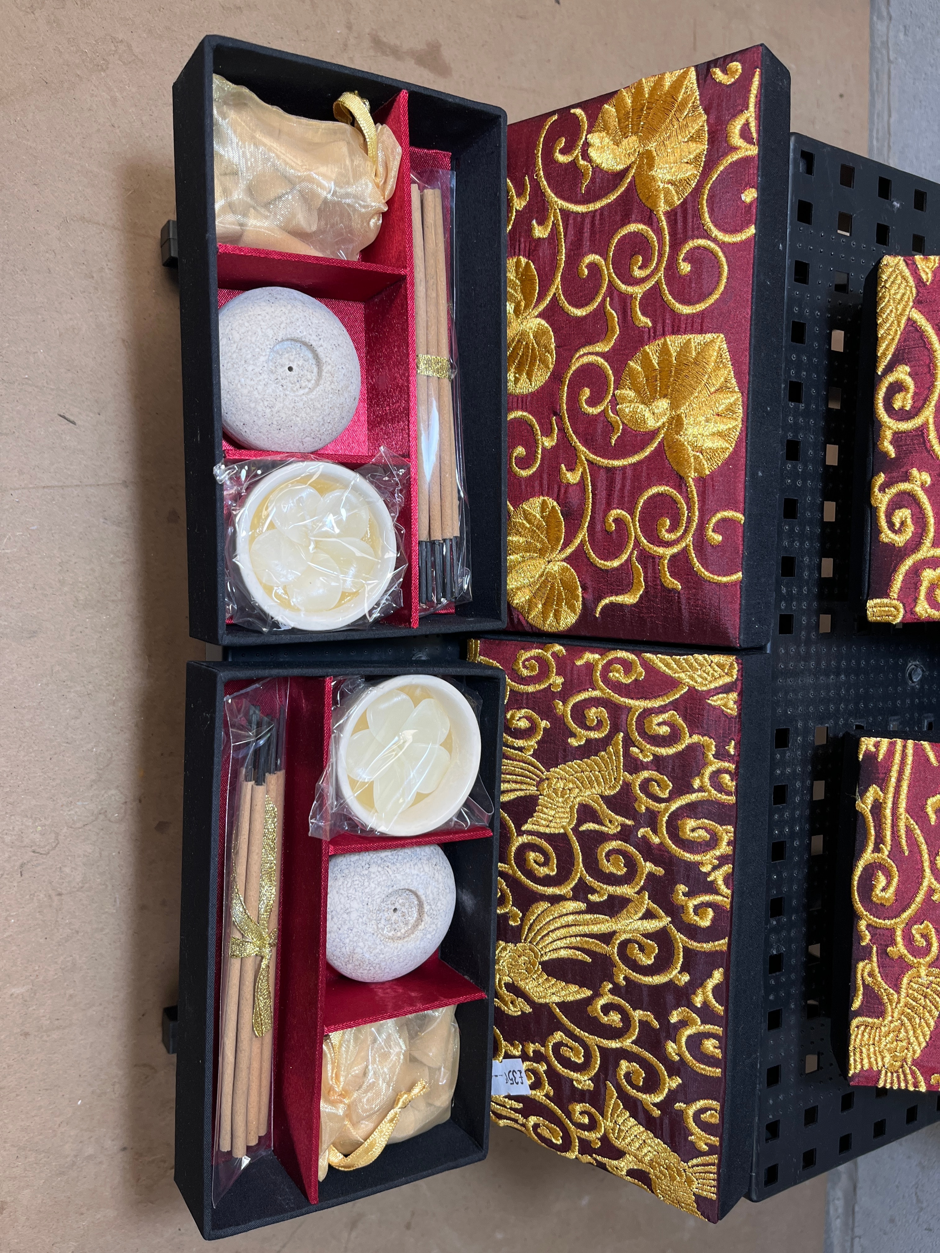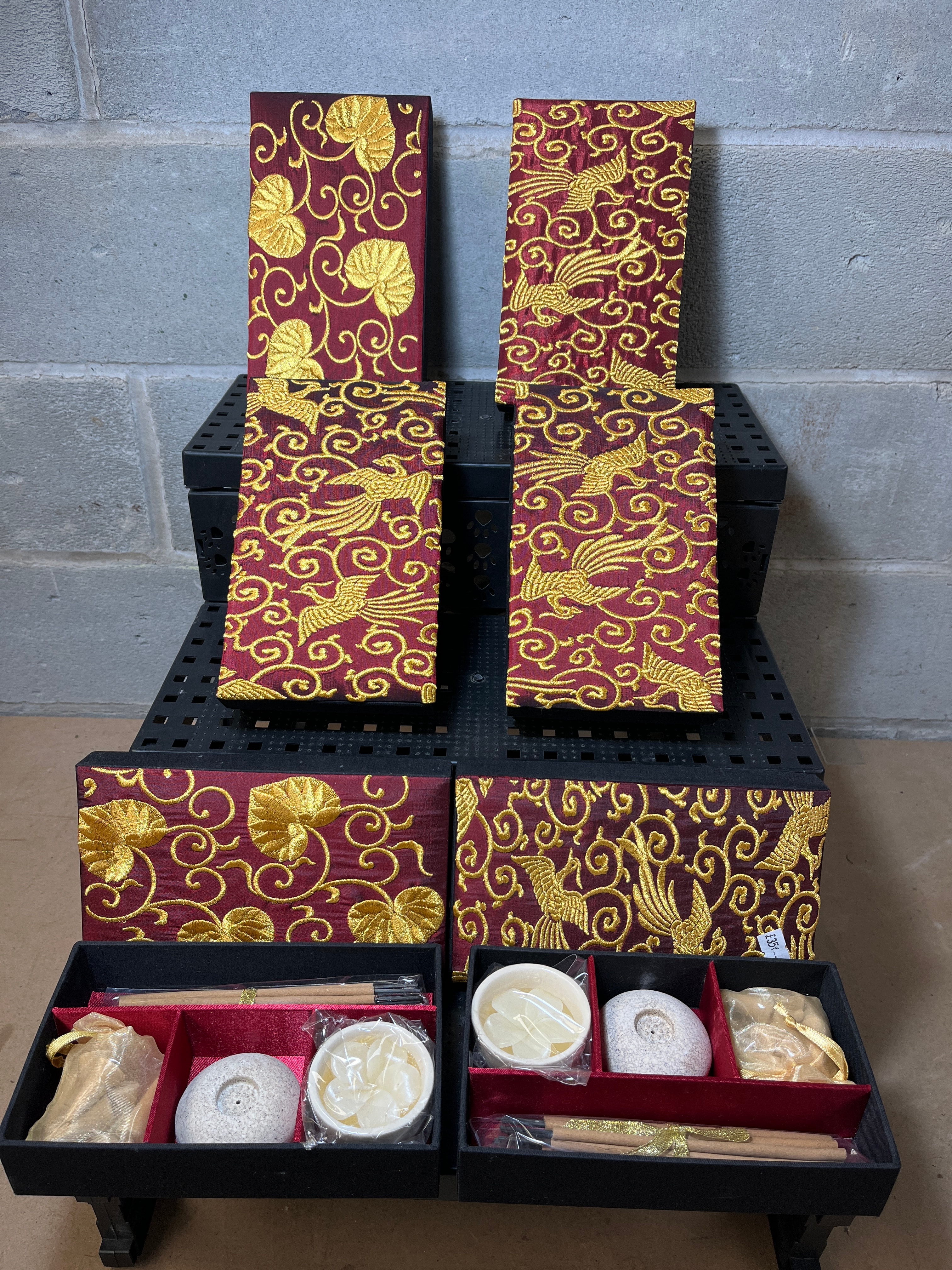 A set of six rectangular presentation boxes, each featuring a deep red fabric cover extensively embroidered with metallic gold thread. Two distinct patterns are present across the set: a stylized phoenix or mythical bird, and an intricate scrolling floral motif. Two of the boxes are open, revealing black presentation boxes with red fabric-lined interiors. Each open box contains bundled incense sticks, a dome-shaped stone or ceramic incense holder, small white cups or dishes (appearing to be ceramic or resin), and a small gold organza pouch. A small white sticker with the partially visible alphanumeric text “YGCY” is affixed to the side of one of the closed boxes.