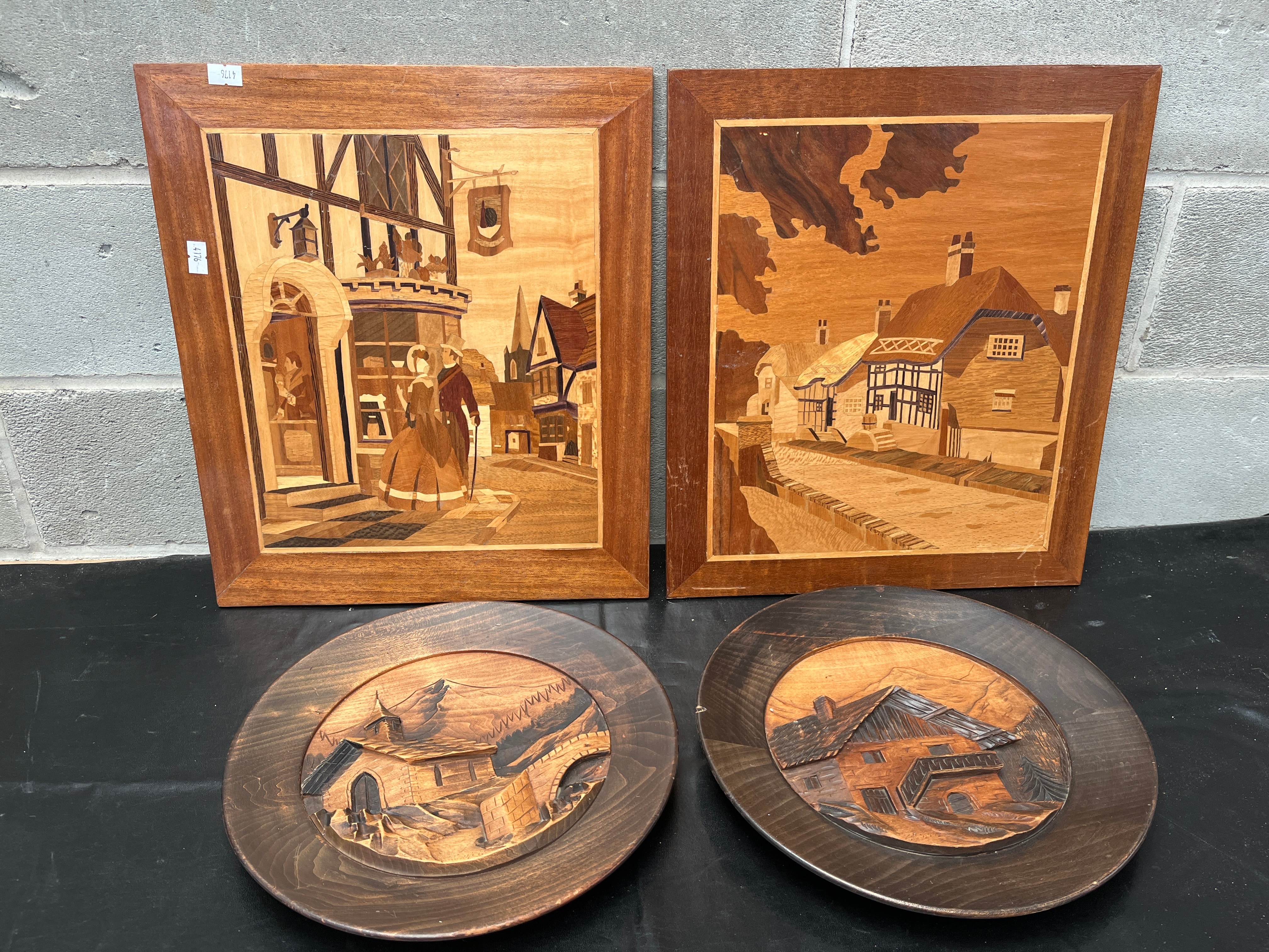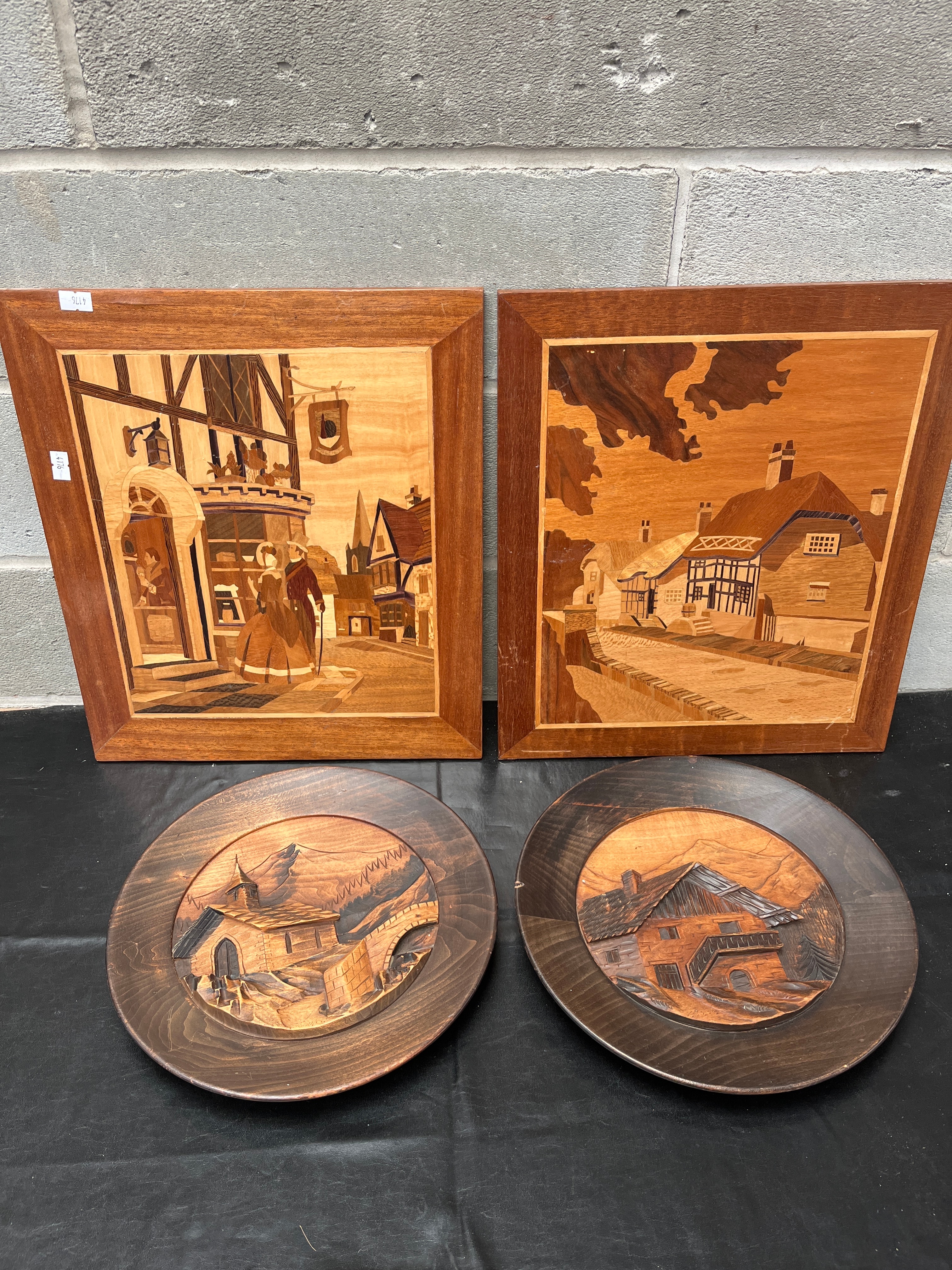 This lot comprises a group of four vintage decorative wall art plaques. Two rectangular panels are executed in marquetry or intarsia, depicting detailed scenic compositions: one an active street scene with figures and period buildings, and the other a village landscape with traditional houses. Both utilize various wood veneers for contrasting tones within simple wooden frames. A small, illegible white label is affixed to the upper left corner of one framed marquetry panel. Accompanying these are two circular carved wood decorative plates, each featuring a deep relief carving of a rural landscape with architectural elements such as a chalet-style house, a bridge, and mountains, all presented in a dark wood finish.