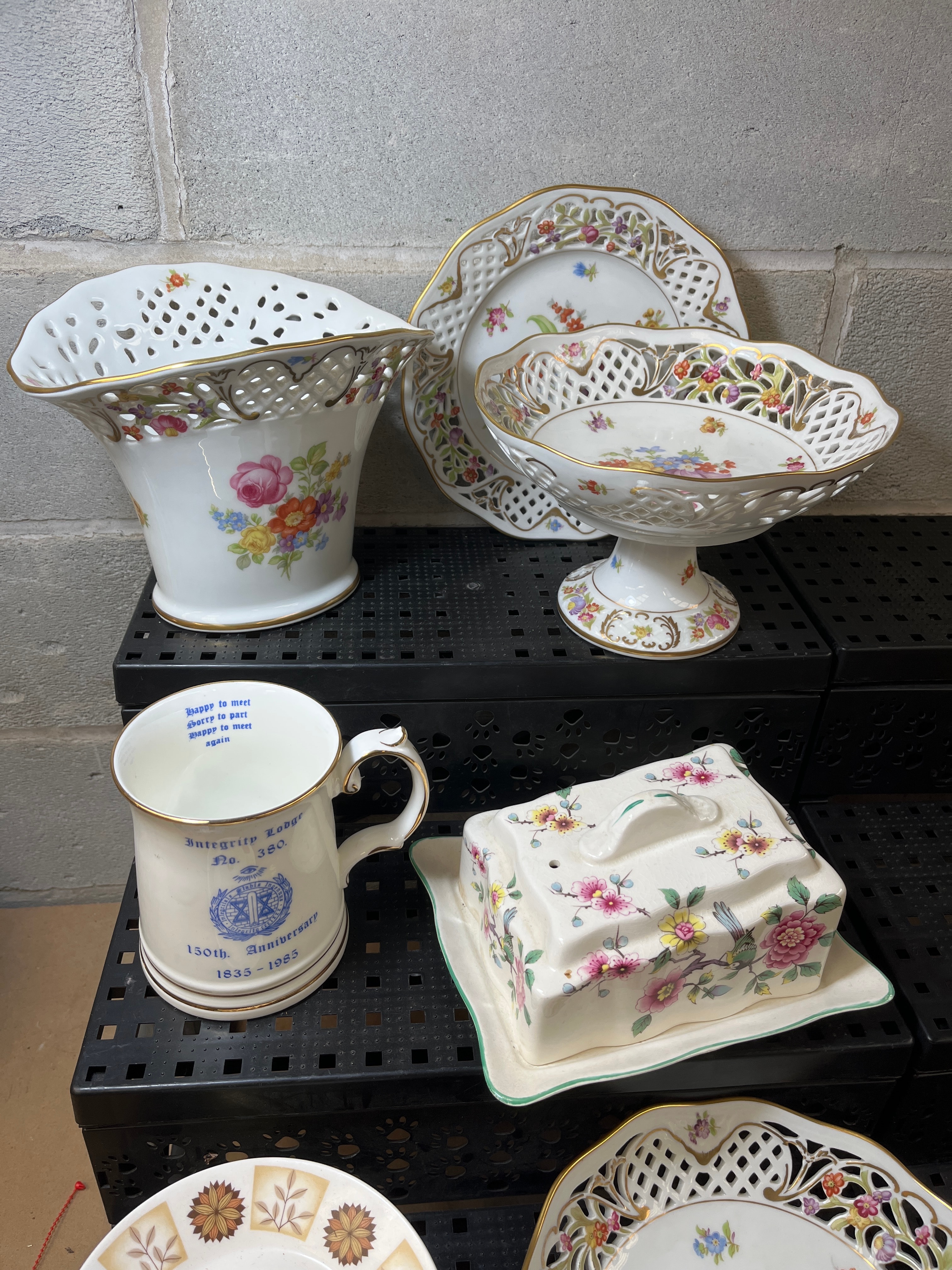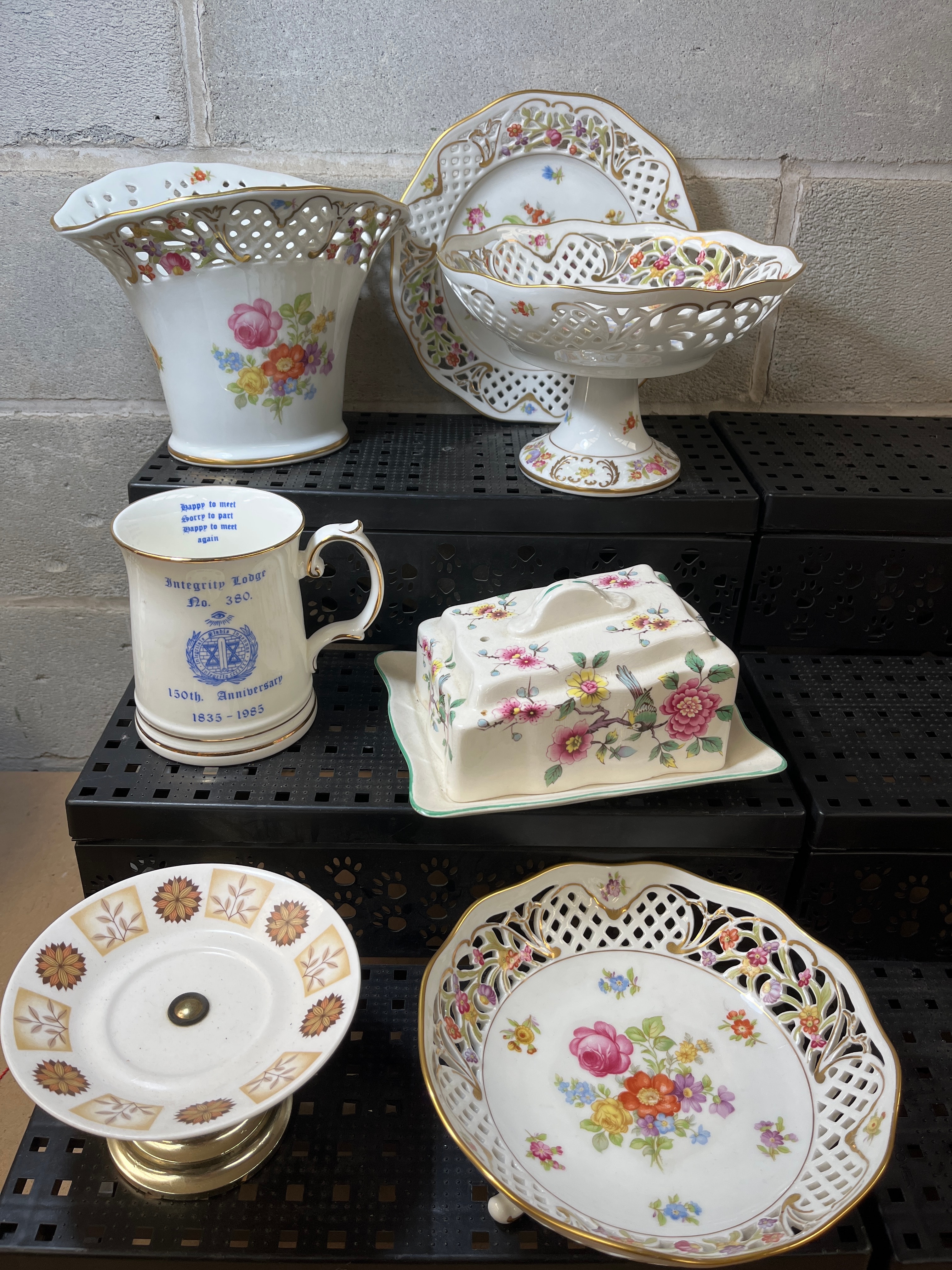 A group of porcelain and fine ceramic items, predominantly tableware and decorative pieces. The collection includes a large vase/holder, a pedestal bowl, a plate, and an additional bowl, all exhibiting a consistent classical or romantic revival style. These pieces feature intricate floral hand-painted or transfer-printed decoration with roses and mixed bouquets, extensive gilding, and delicate reticulated (pierced) borders, consistent with Schumann Bavaria Dresden Flowers patterns. Also included is a lidded butter dish with an all-over floral design, a small footed dish with a brown and gold floral motif, and a cream-colored commemorative mug. The mug is marked “Integrity Lodge No. 380,” with “150th Anniversary 1833-1983” and a crest, and is additionally inscribed inside the rim with the phrase: “Forget to meet; sorry to part; hope to meet again.”
