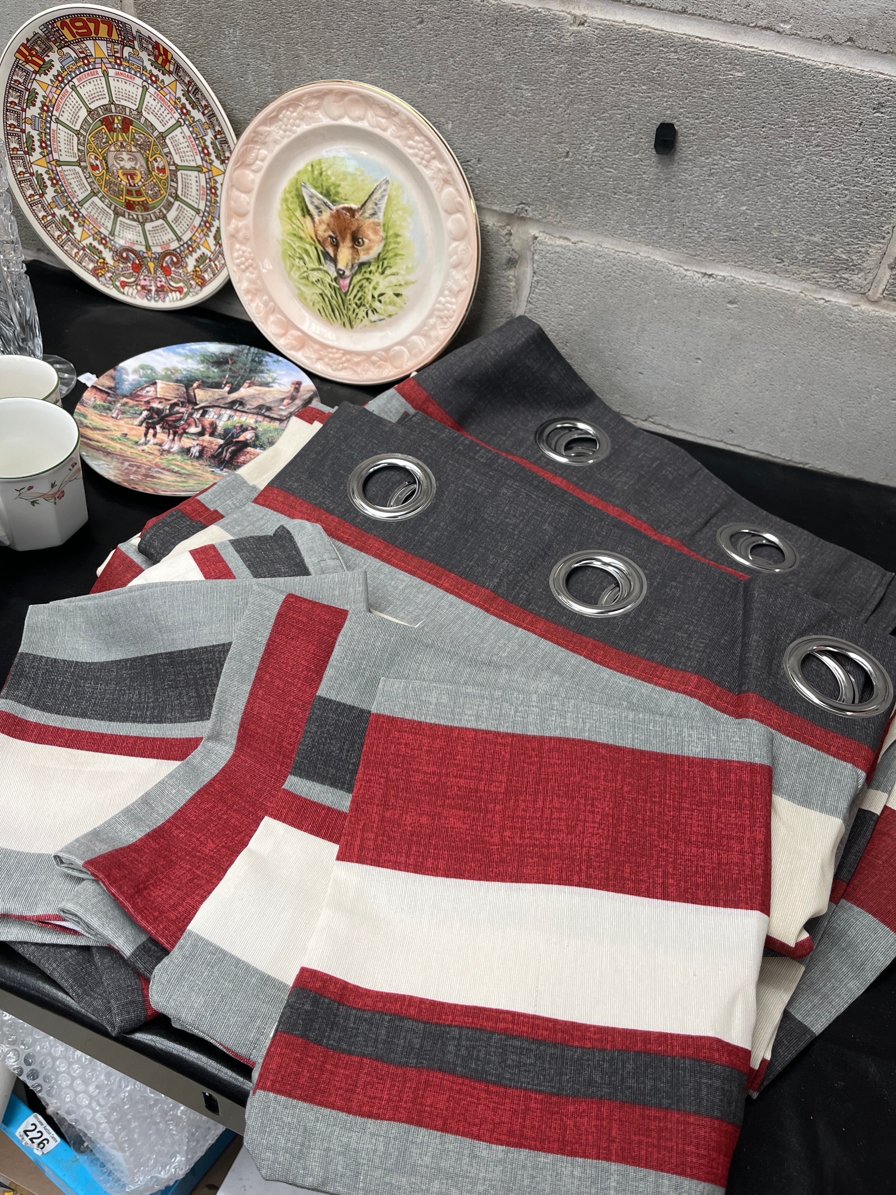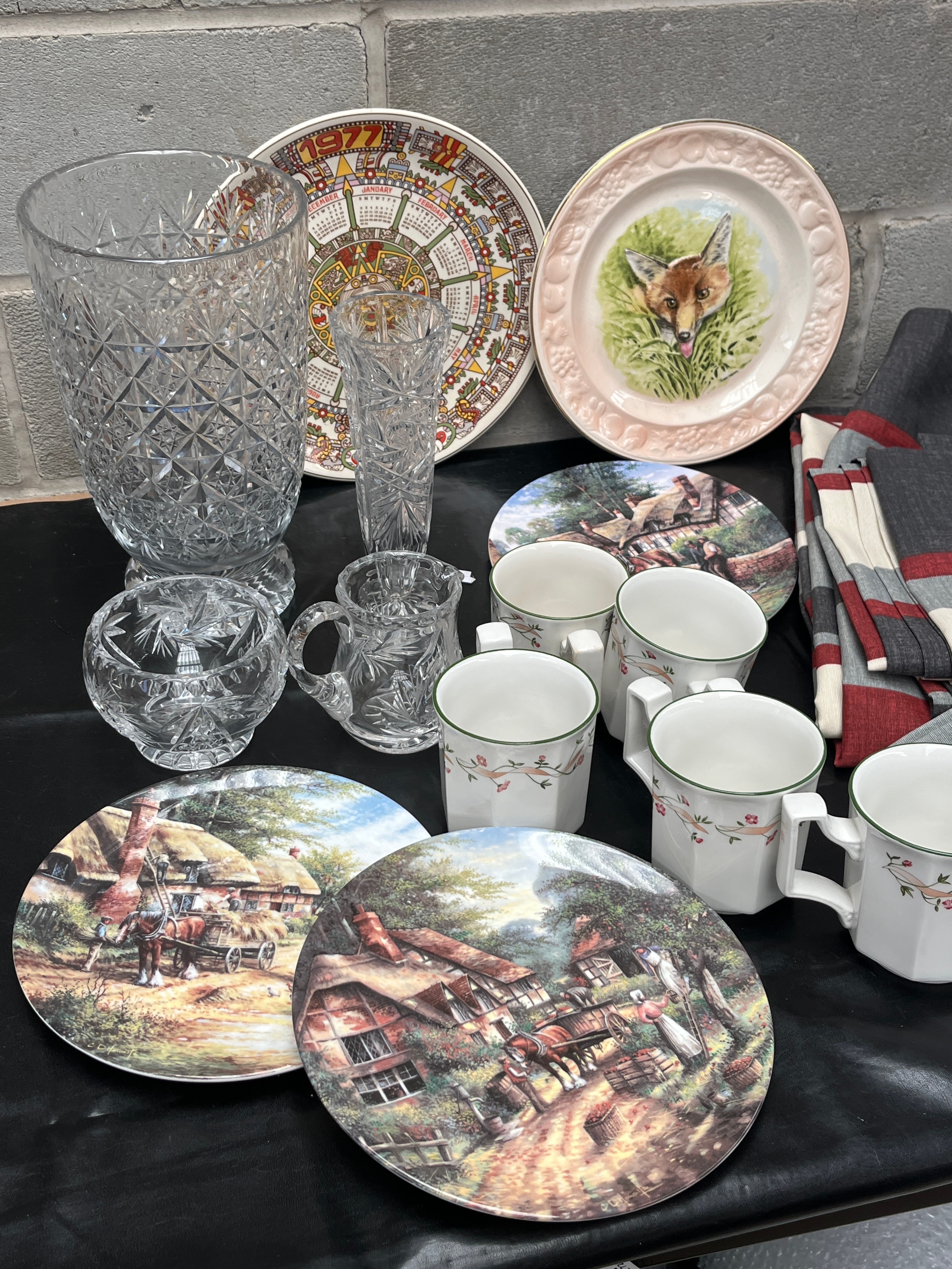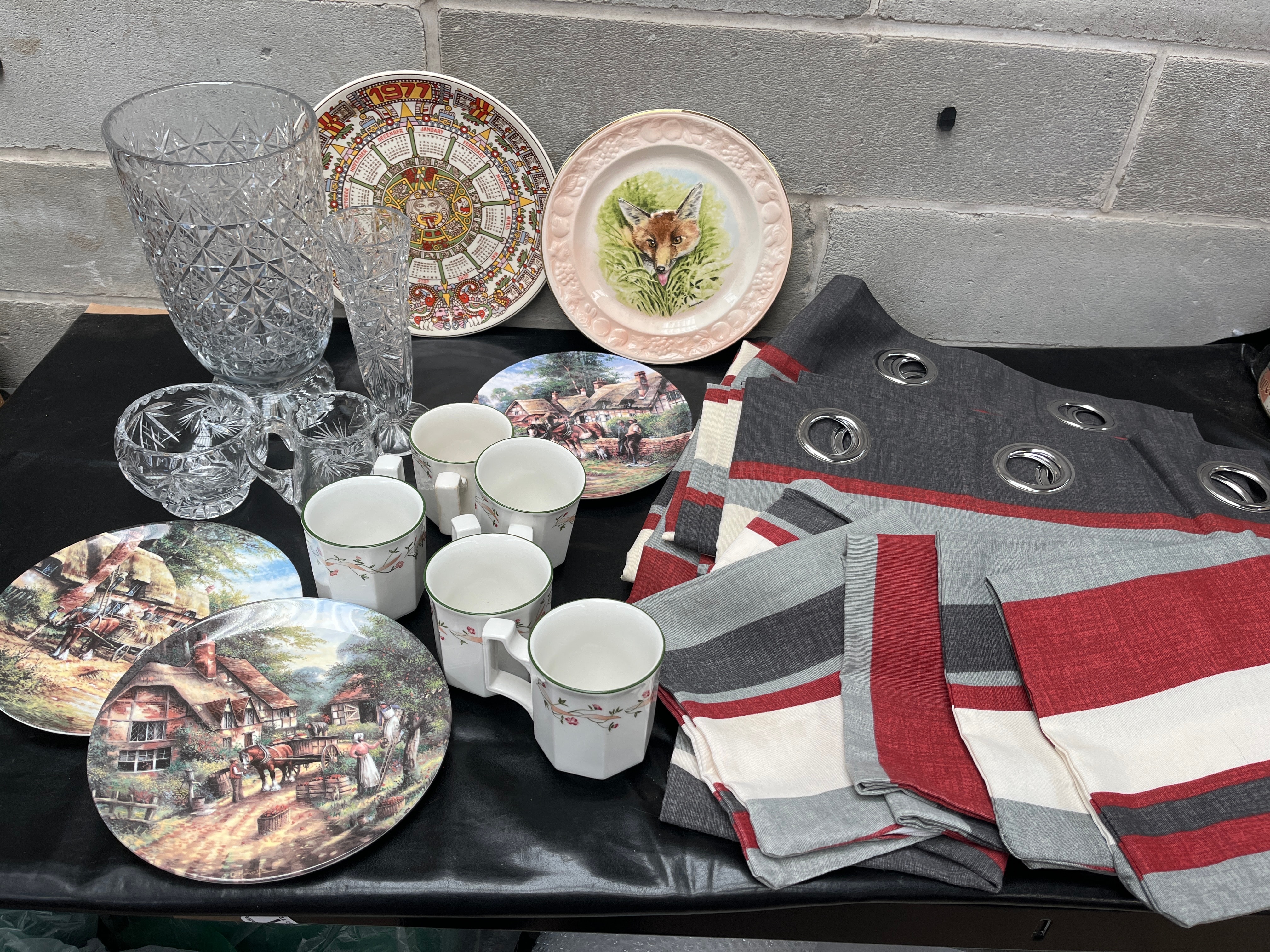 A collection comprising: A set of four decorative plates in ‘The Friendly Village’ pattern by Johnson Bros., England, depicting traditional English countryside scenes including cottages and hunting scenes. A group of five octagonal ceramic mugs with a simple green floral or foliage border, consistent with the ‘Lake Retreat’ pattern by Certified International. A large decorative plate with a complex, Aztec calendar-style motif, and a medium plate depicting a painted fox head on a pale pink ground. A collection of cut-glass pieces, specifically a large vase or pitcher, a smaller bowl, a small vase, and two handled mugs, all featuring intricate geometric patterns. A pair of lined fabric panels, likely curtains, characterized by a striped pattern in dark grey, red, and off-white, with prominent silver-toned metal grommets along one edge. Four cushions.