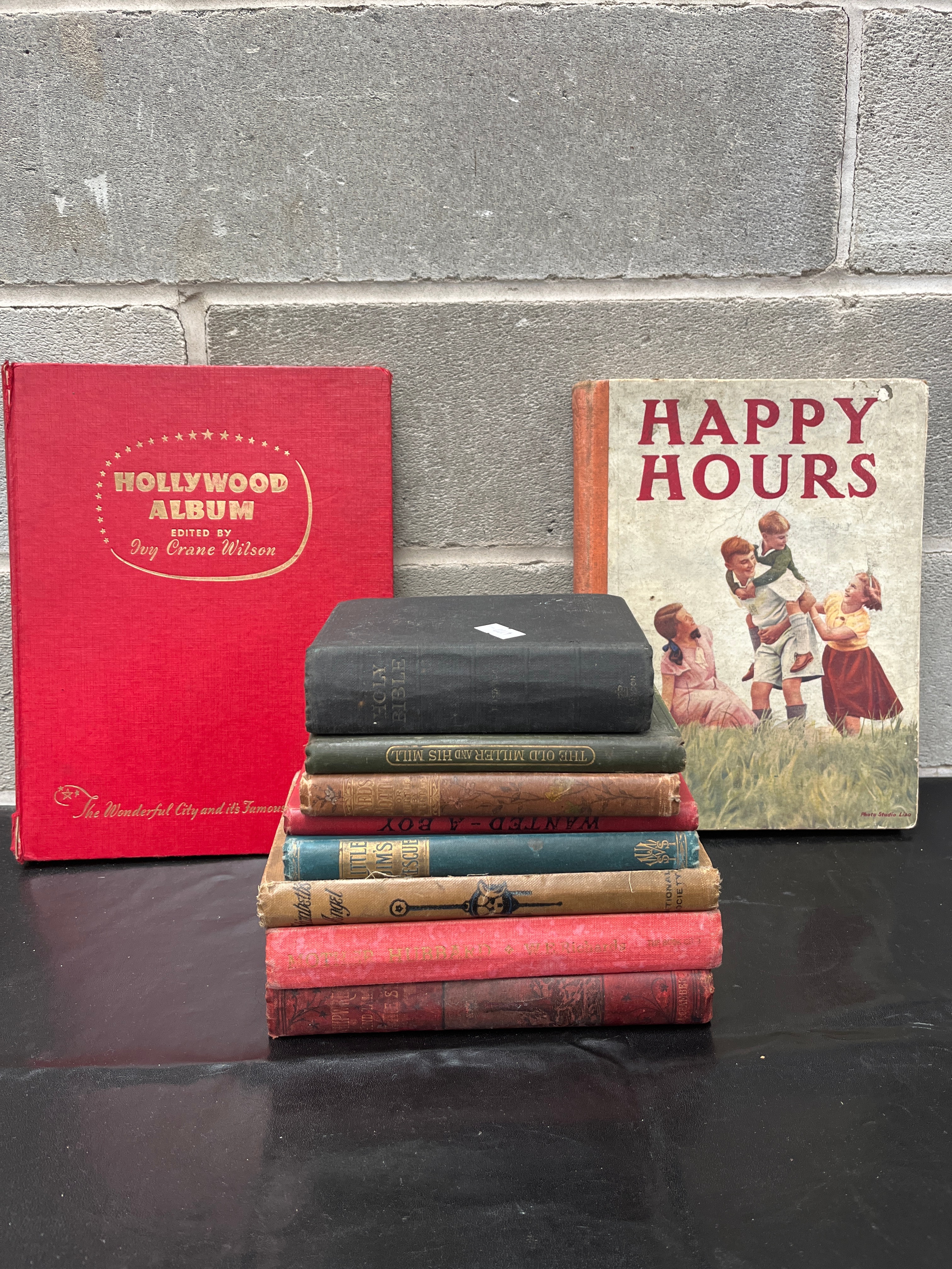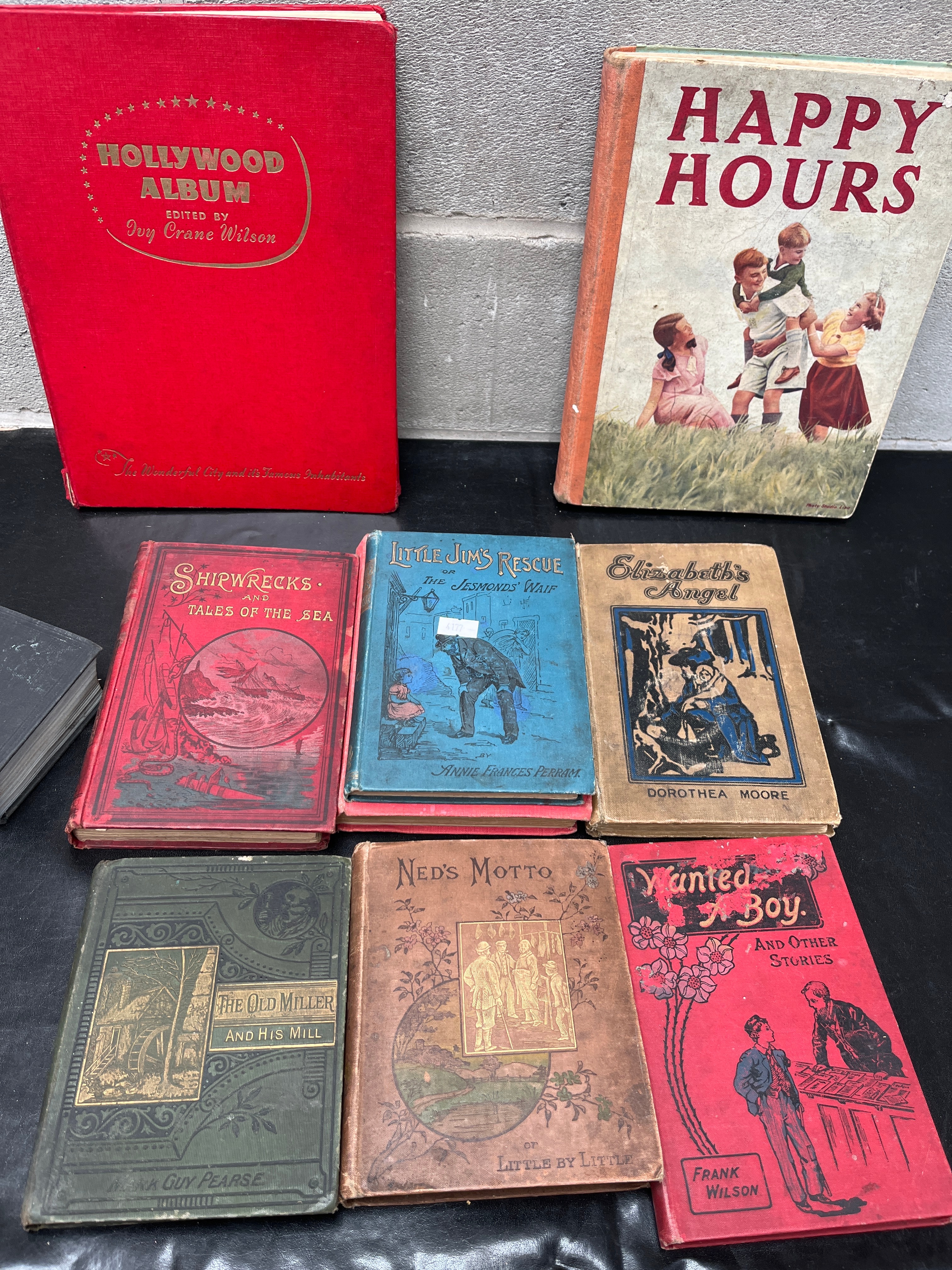 This collection comprises a total of twelve vintage hardcover books and one large red “Hollywood Album.” The books are primarily children’s literature or inspirational texts, likely dating from the early to mid-20th century. They are constructed from cloth and paper over boards, with some featuring illustrated covers and spines. Visible titles and authors include “HAPPY HOURS,” “HOLLYWOOD ALBUM EDITED BY Guy Keane Wilson,” “BIBLE STORIES,” “SHIPWRECKS AND TALES OF THE SEA,” “Little Jim’s Rescue or Jesus’s War by Maud Robinson Meaden,” “Elizabeth’s Angel by DOROTHEA MOORE,” “THE OLD MILLER AND HIS MILL by MARK GUY PEARSE,” “Ned’s Motto OR LITTLE BY LITTLE,” and “WANTED-A BOY. And Other Stories by FRANK WILSON.”