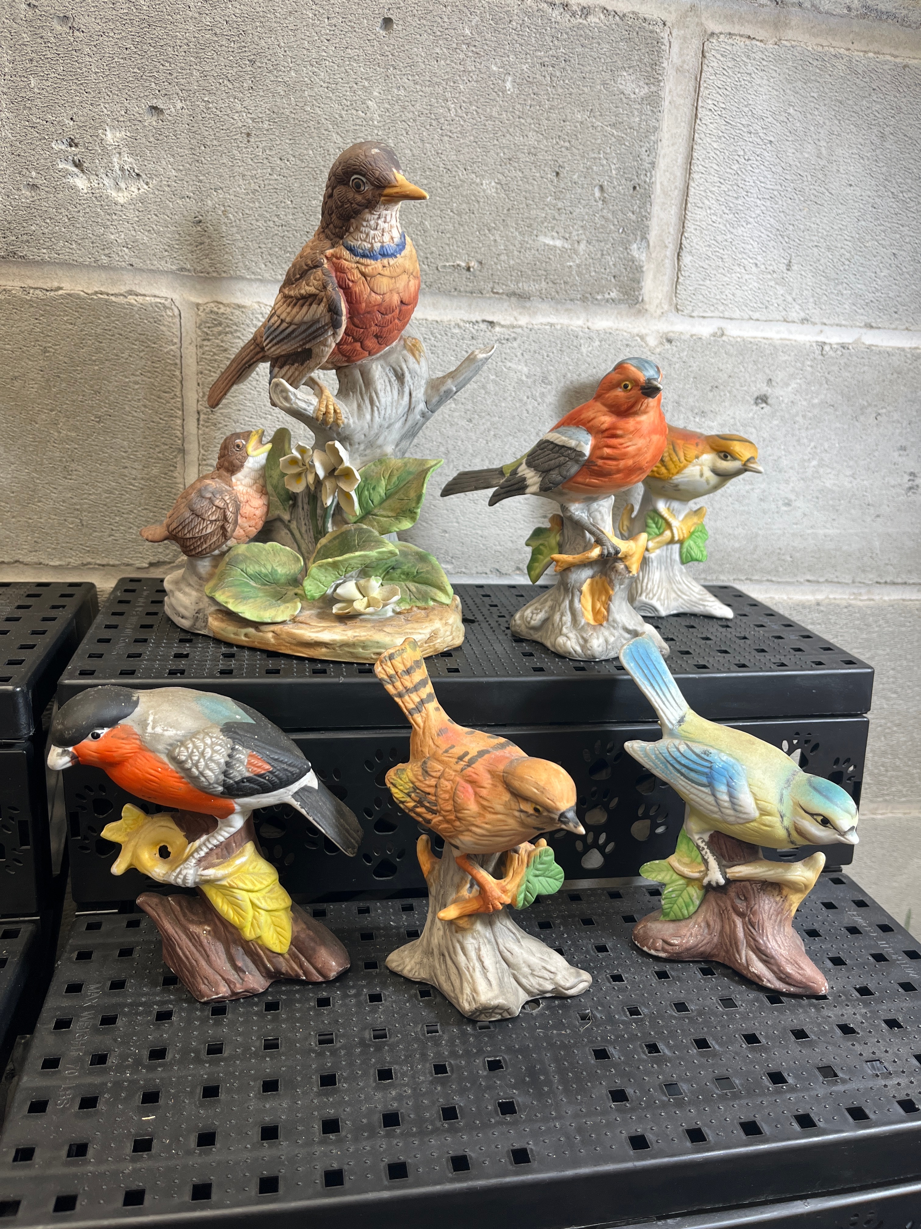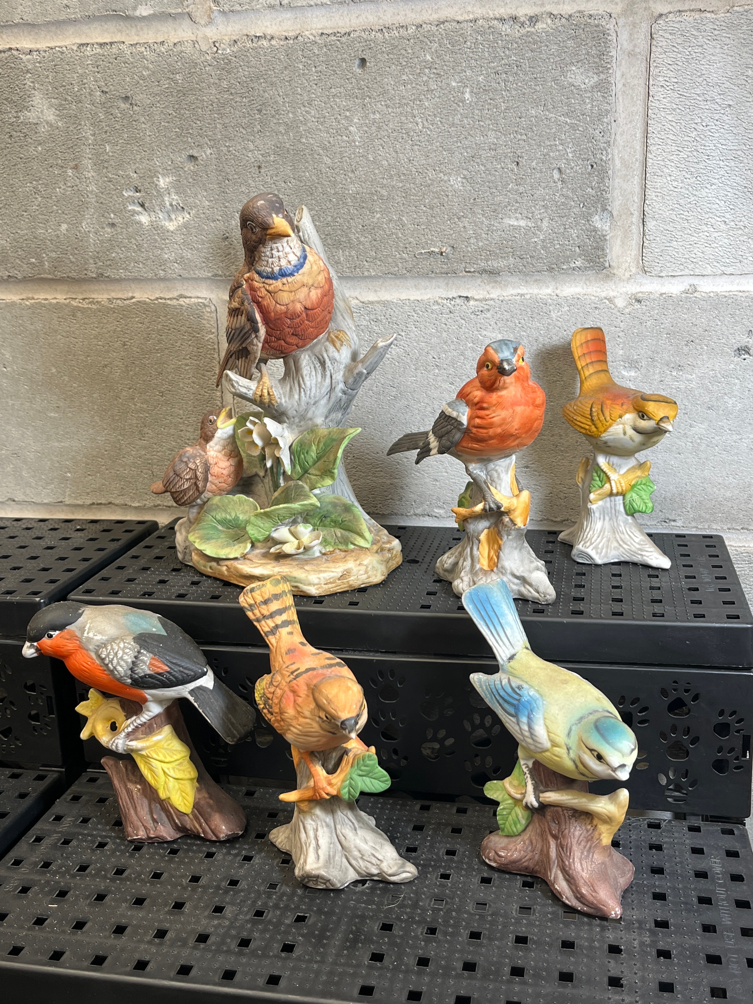 A group of six decorative glazed ceramic bird figurines, presented in a naturalistic style. The lot includes one larger grouping depicting a prominent brown bird with two smaller birds and foliage on an oval base, alongside five individual birds, each perched on a tree stump or branch-like base. The birds are rendered in a varied palette of browns, oranges, reds, blues, yellows, and greys, with green accents for foliage. No discernible manufacturer’s marks or text are visible.