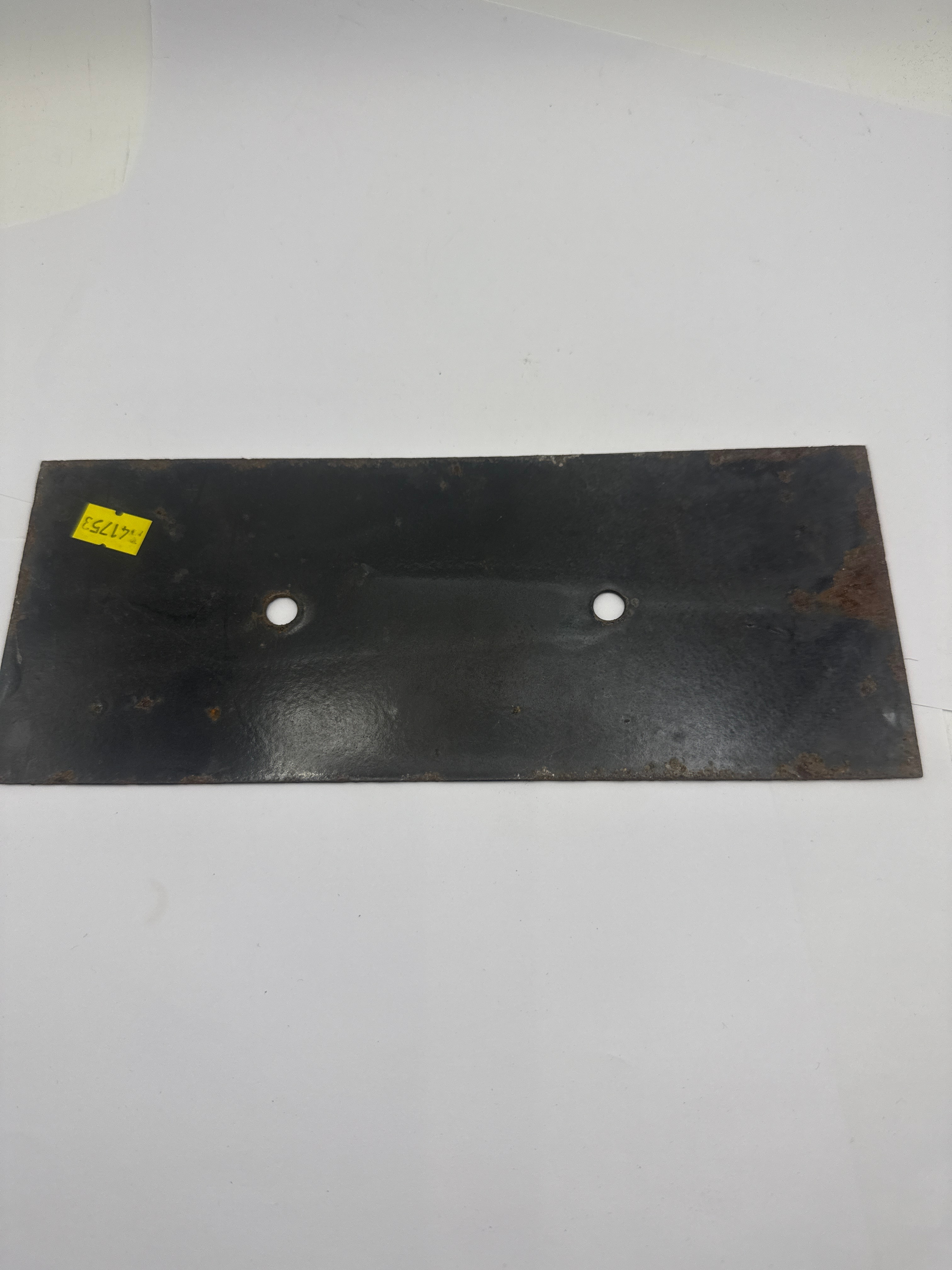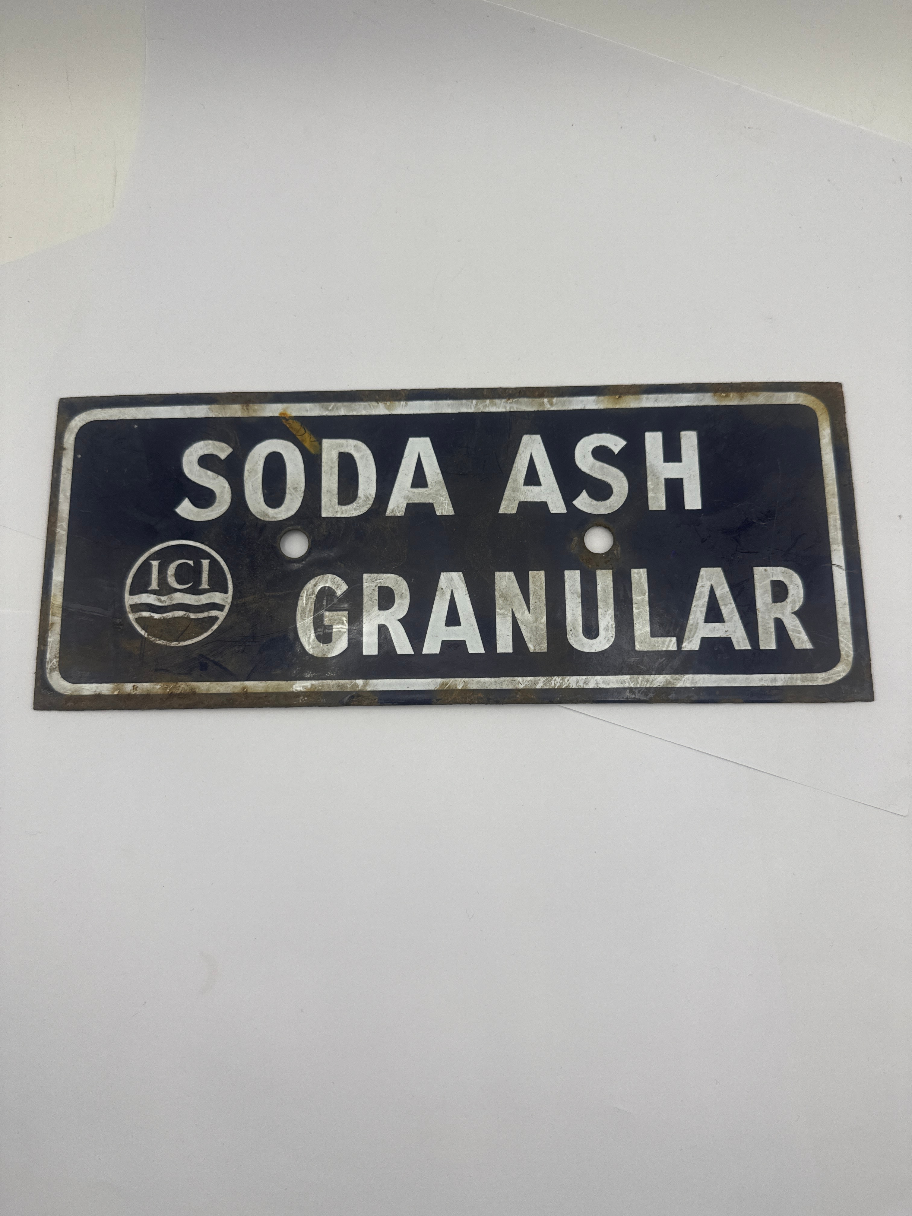 An original industrial sign for Soda Ash Granular, featuring the ICI logo. This rectangular, dark-colored metal sign, likely enameled or painted, displays white text reading ‘SODA ASH’ above ‘GRANULAR’. It is fitted with two centrally located circular mounting holes. The reverse is a dark, heavily rusted metal surface with a yellow sticker marked ‘161731’.
