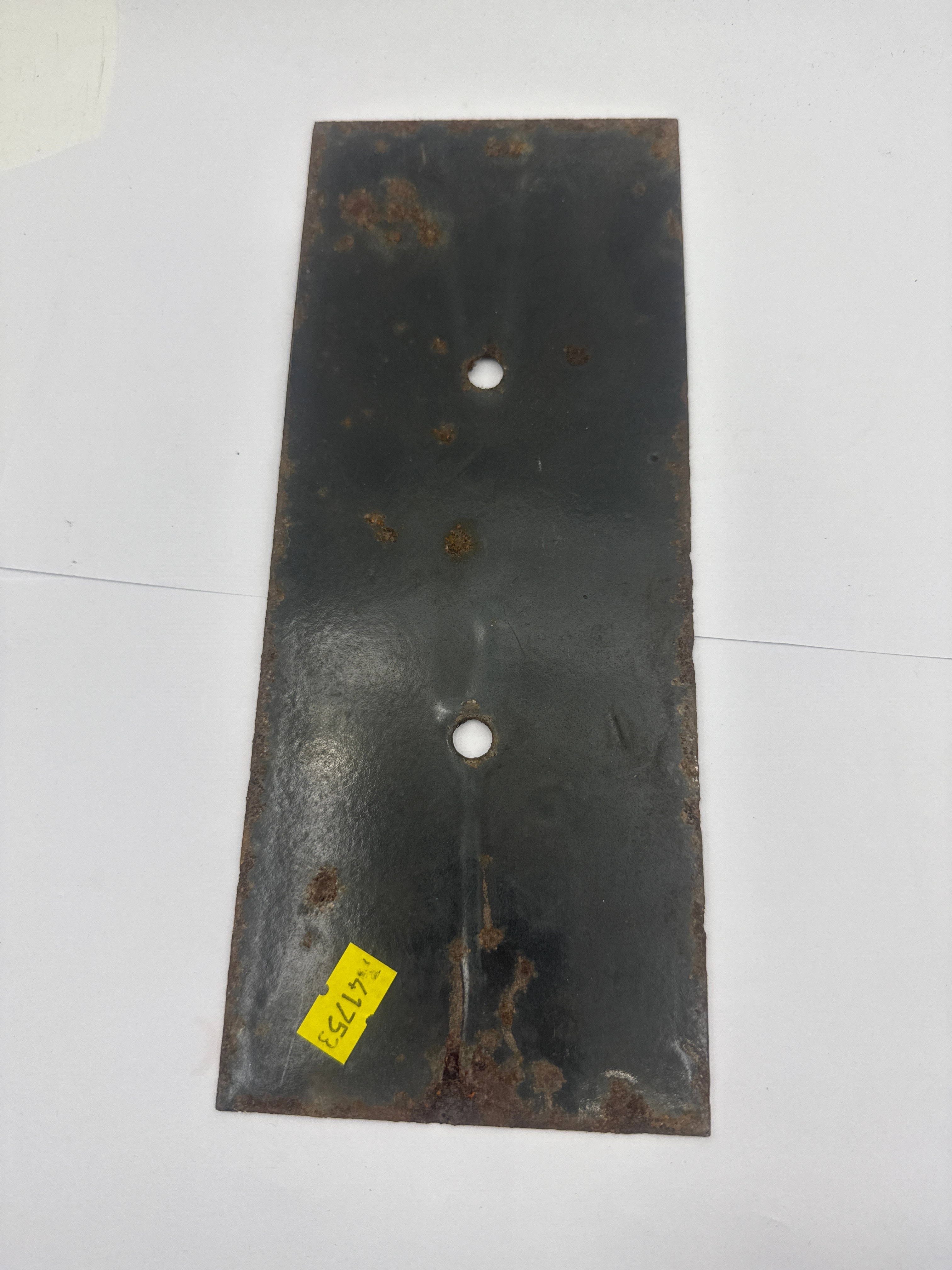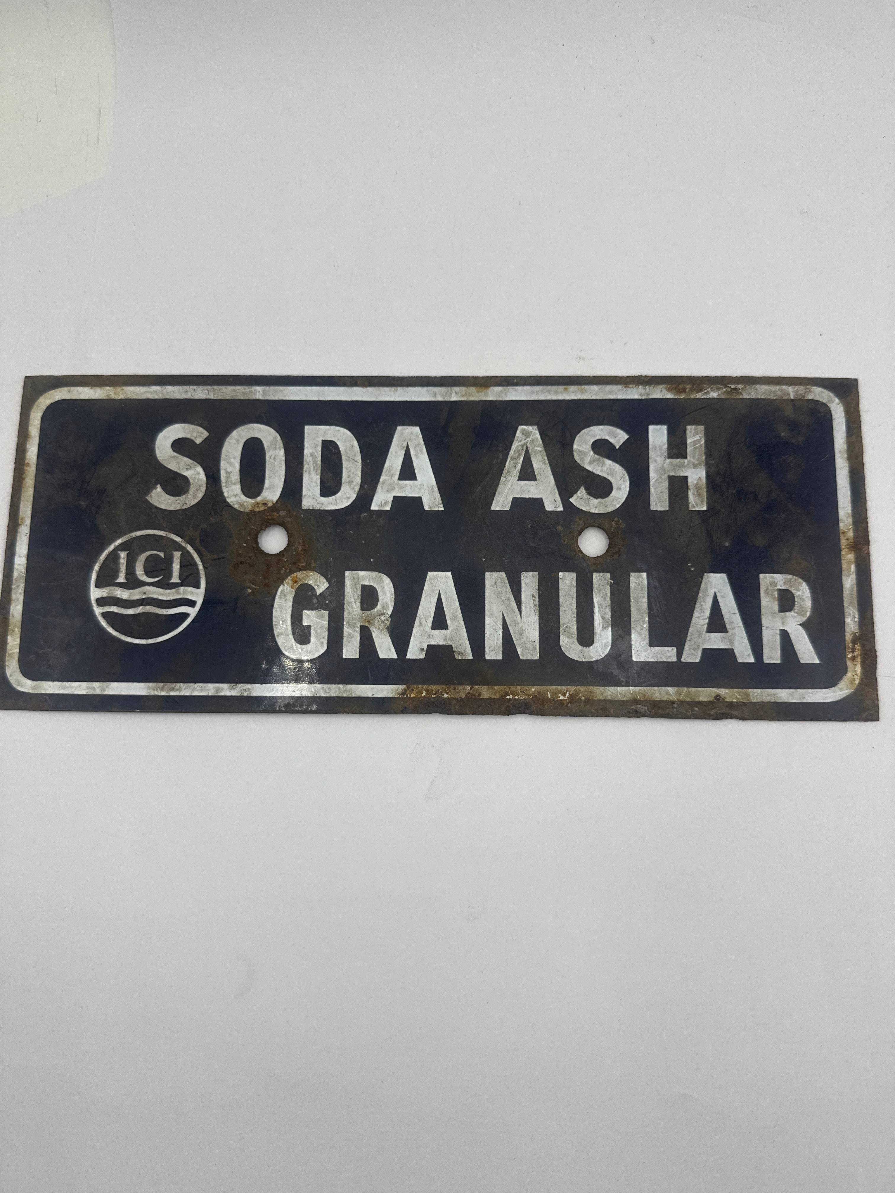 This is an original rectangular industrial metal sign, likely painted or enameled steel, featuring a dark blue or black field with white sans-serif text displaying “SODA ASH” above “GRANULAR.” A circular “ICI” logo with a wave motif is visible in the lower-left. The sign includes two central mounting holes.