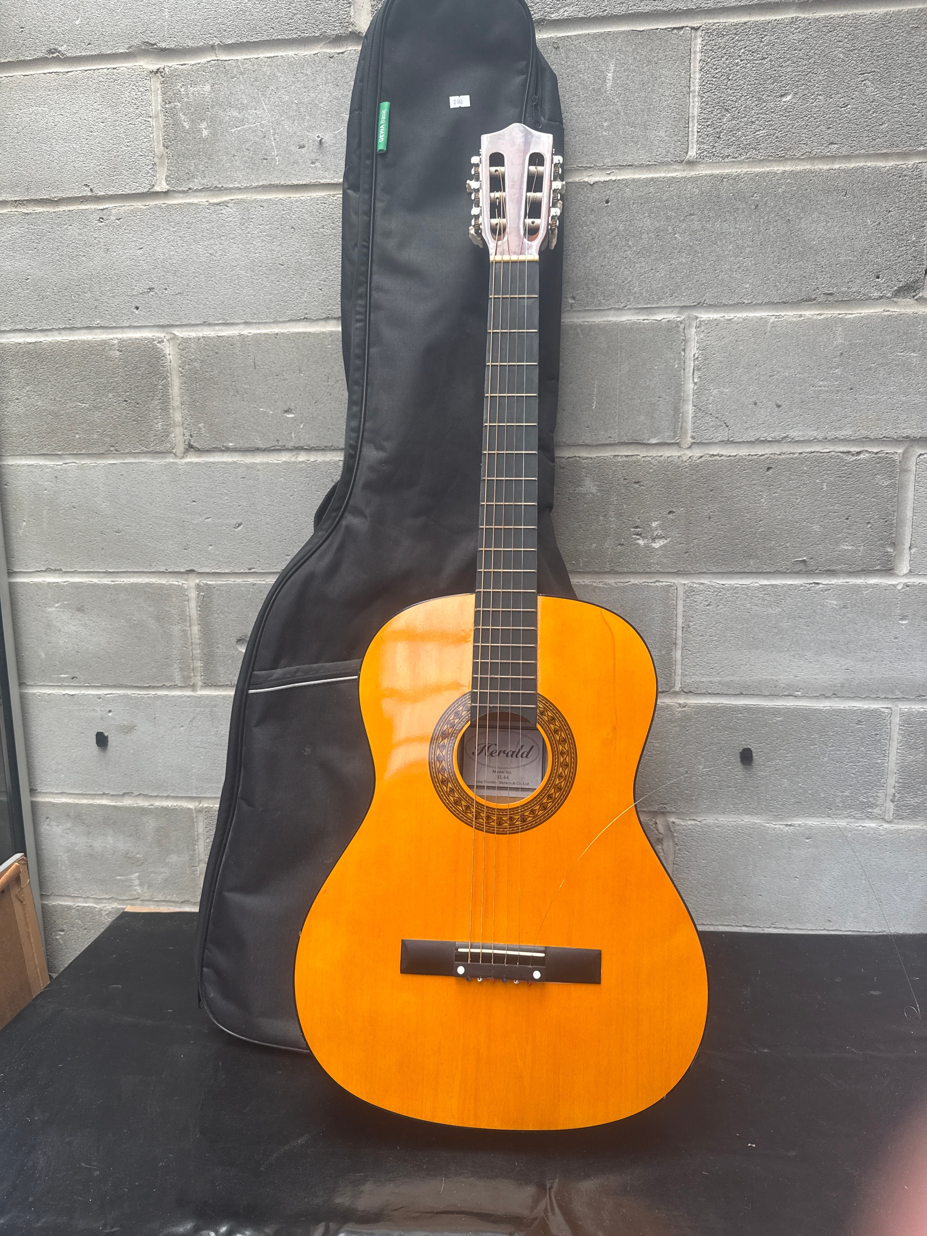 A Herald HL44 nylon-string acoustic guitar, manufactured by John Hornby Skewes Co. Ltd. The instrument features a light-toned wooden body, likely with a spruce top, and a decorative rosette around the soundhole. It has a slotted headstock fitted with chrome-colored tuning pegs. Accompanied by a black soft fabric gig bag.