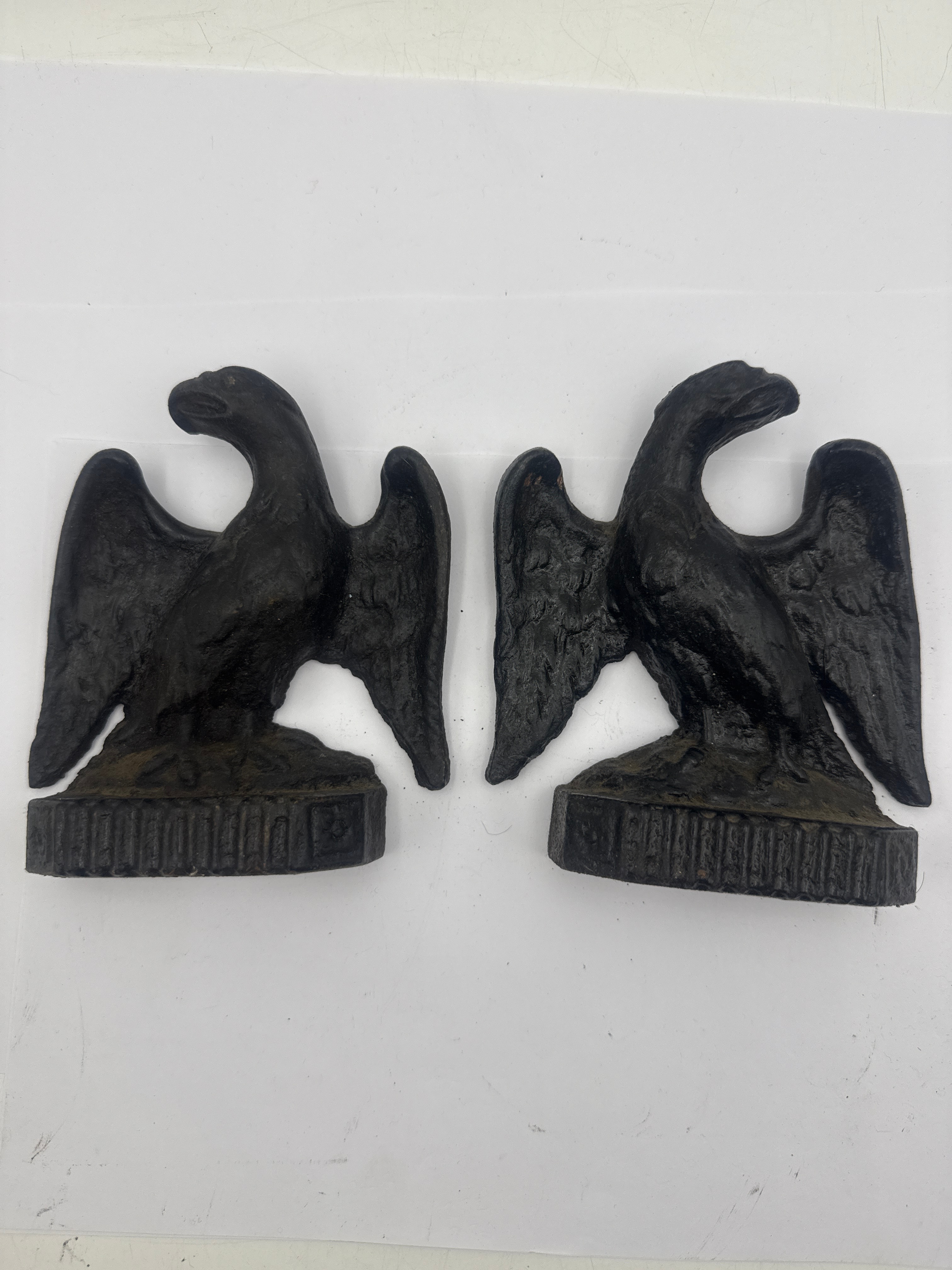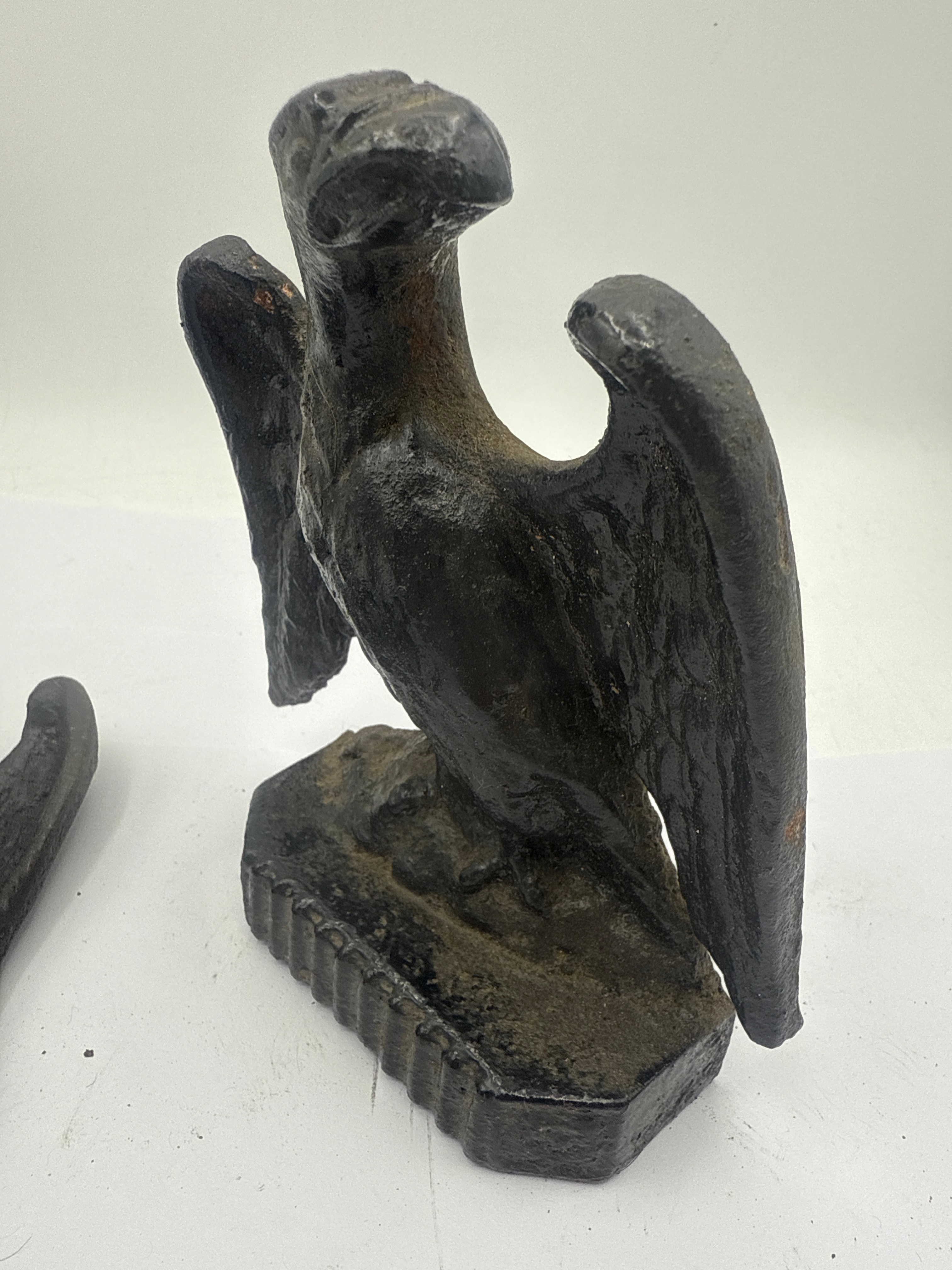 A pair of identically cast decorative objects, identified through web intelligence as Virginia Metalcrafters Spread Eagle Cast Iron Bookends. Each piece features a stylized eagle, depicted with partially spread wings, perched upon a rectangular, fluted plinth. The material is confirmed to be Cast Iron, presenting a textured, matte surface with areas of reddish-brown rust and historic wear. No manufacturer’s marks, text, or specific period indicators are readily discernible on the objects themselves.