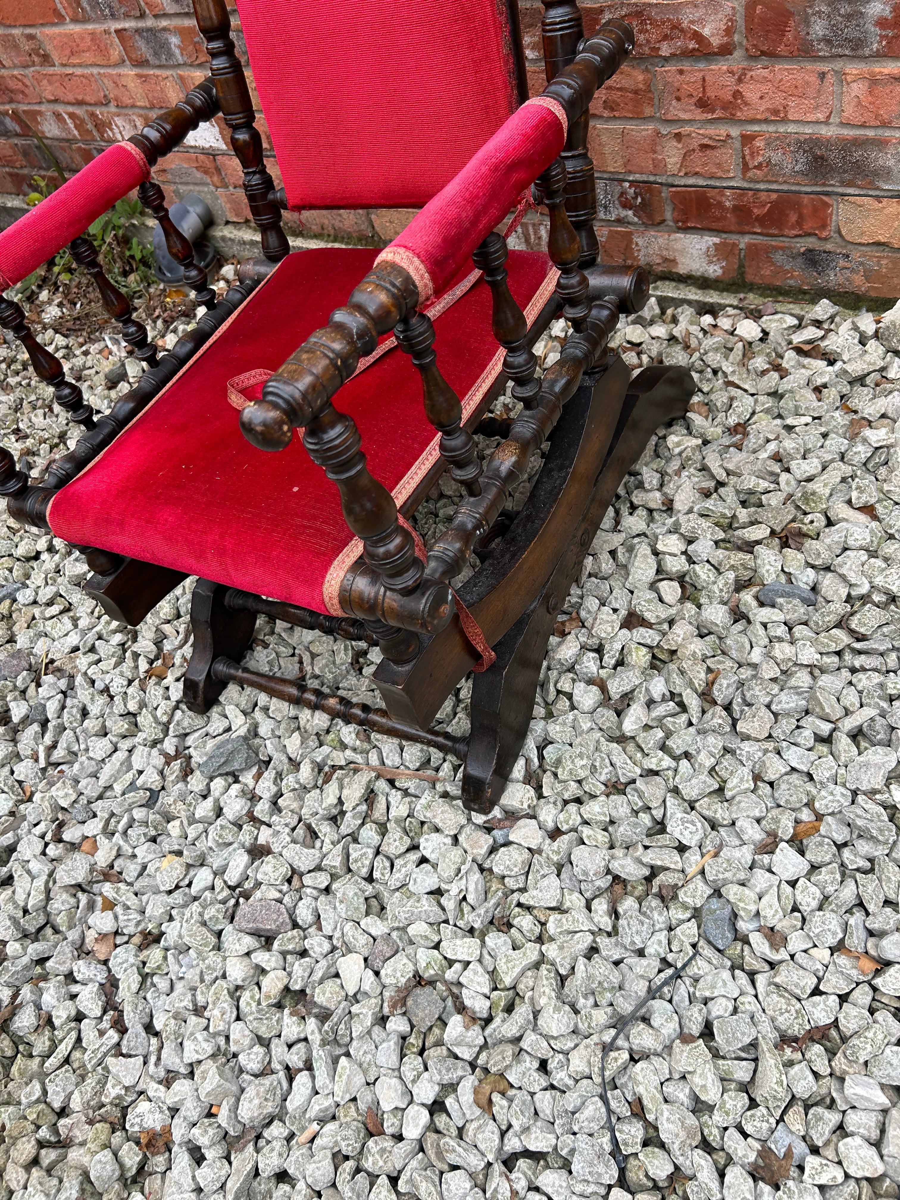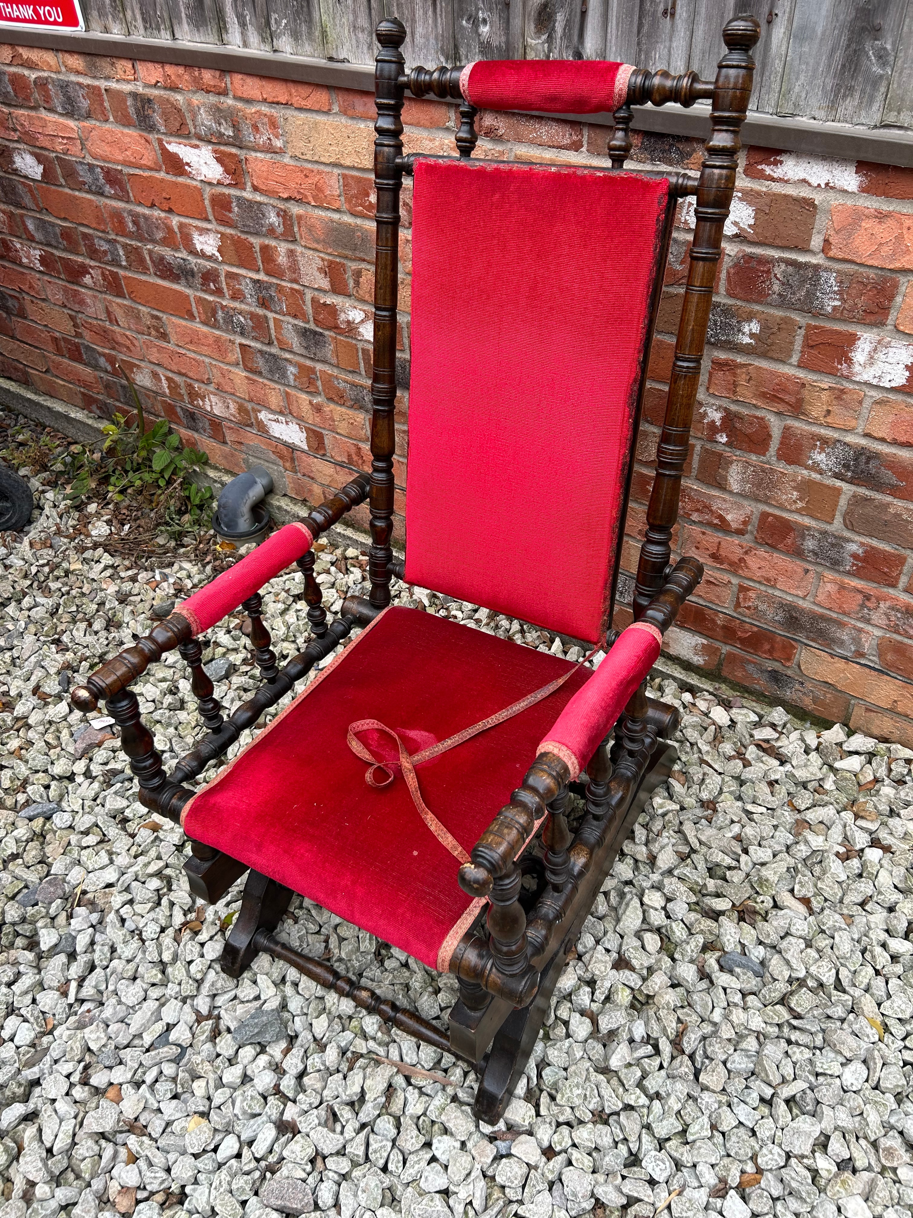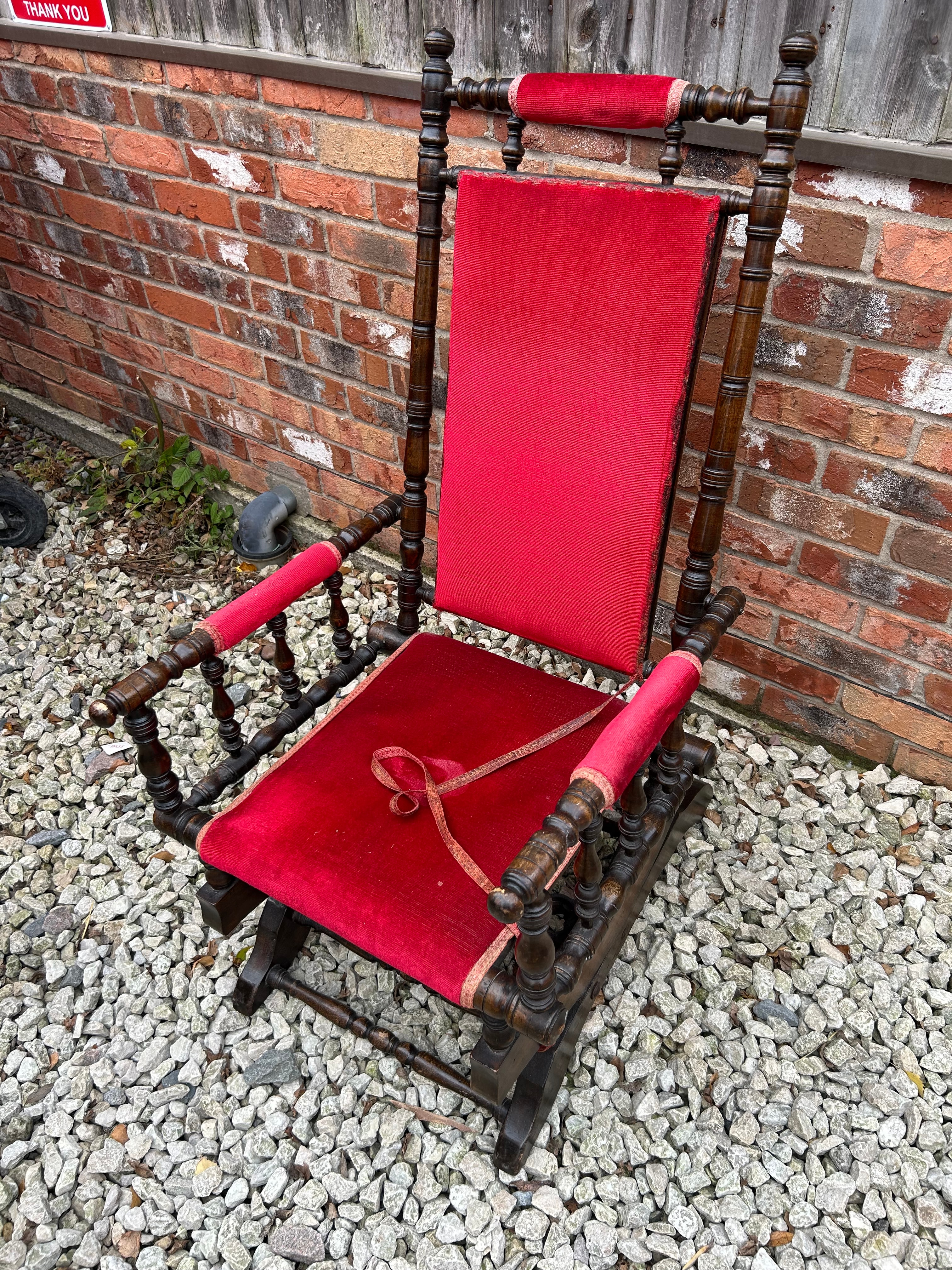 An antique Colonial Style rocking chair, likely dating to the late 19th or early 20th century. The chair features a dark-stained wooden frame with turned spindles and finial adornments, characteristic of the period. It is designed with a tall back, a spacious seat, and padded armrests, all upholstered in a deep red velvet fabric. The upholstery is accented with a decorative gold-toned trim.
