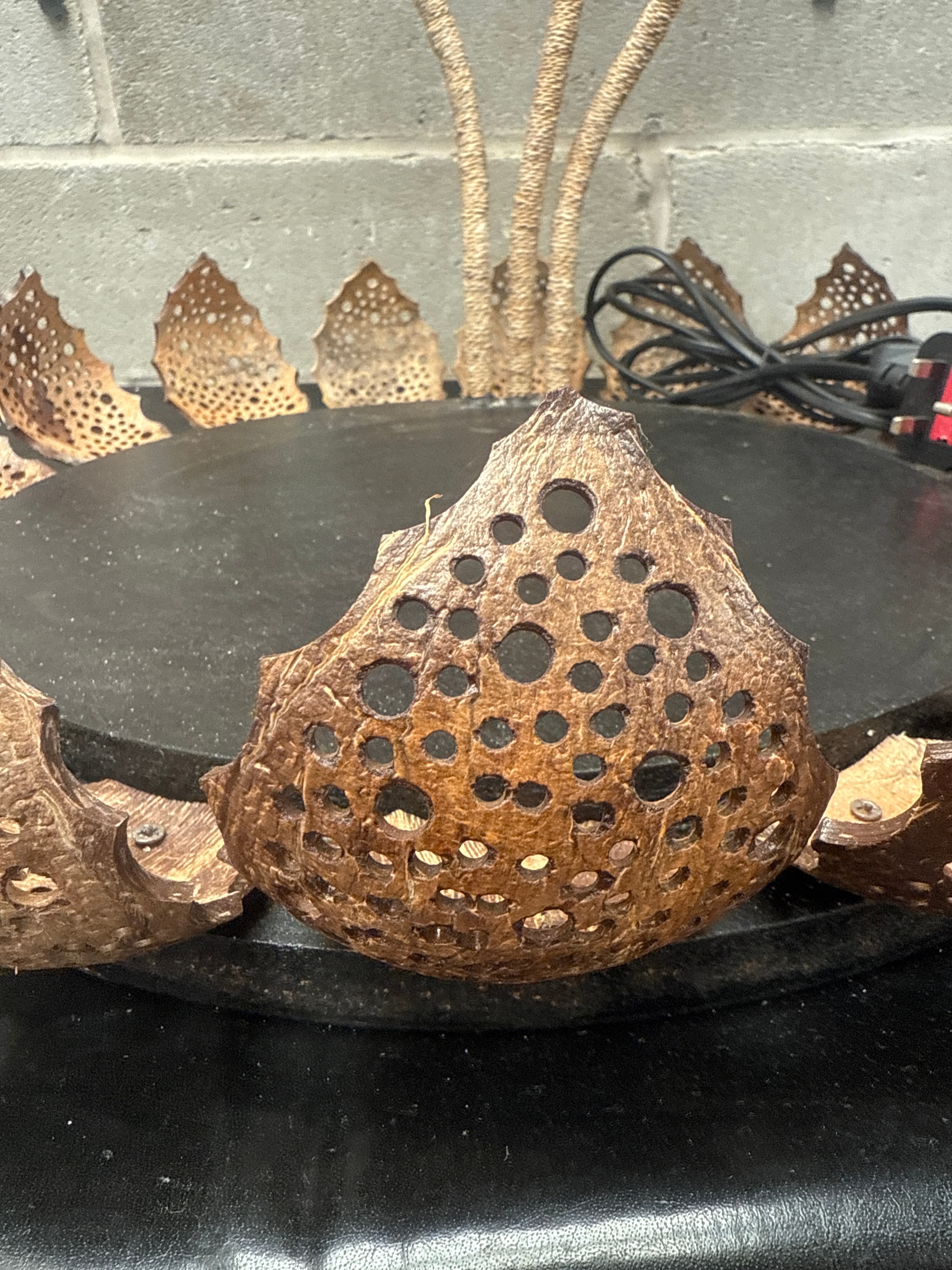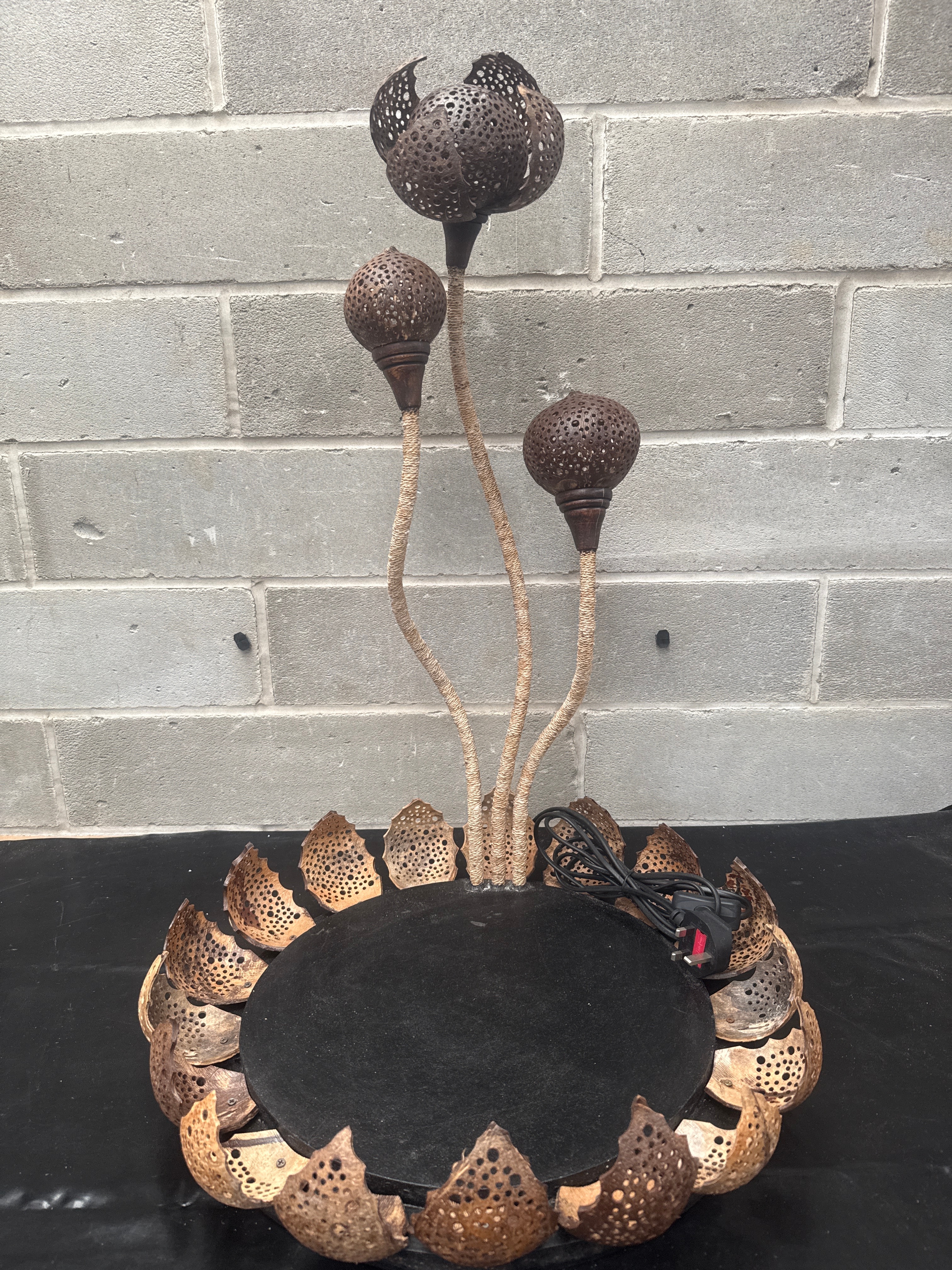 An organic-style table lamp or decorative light fixture, primarily constructed from dried and intricately perforated coconut shells. The piece features a circular black base, likely wood or composite, encircled by a continuous ring of individual, open-top coconut shell segments, each perforated with small holes. From the base’s center, multiple stems wrapped in natural fibers, resembling rope or twine, ascend to support three light shades. The largest shade at the top resembles a four-petaled bloom, while the two smaller shades are spherical, all crafted from perforated coconut shell. A black electrical cord with a standard plug is visible on the base. The lamp presents a naturalistic and rustic aesthetic.