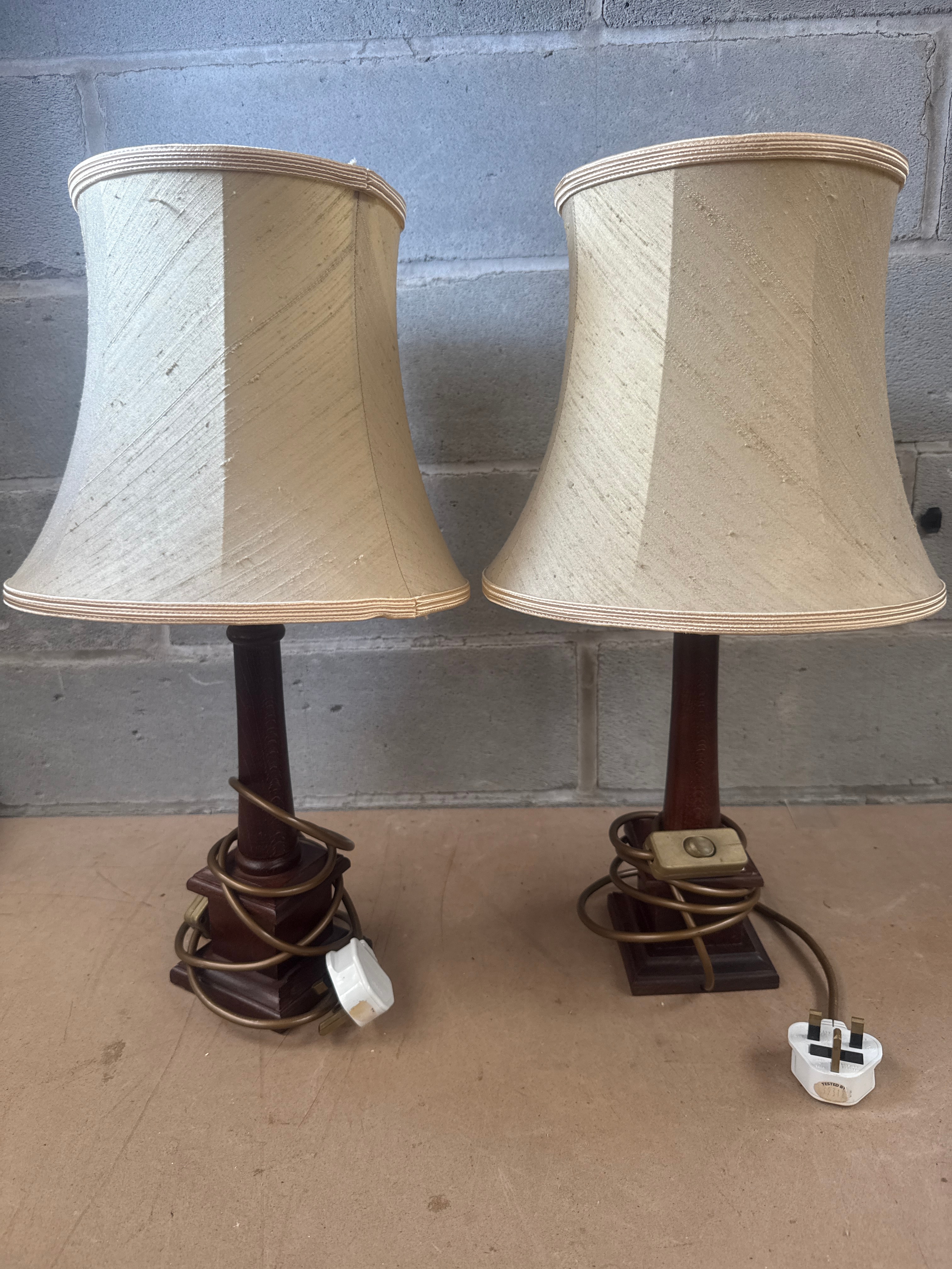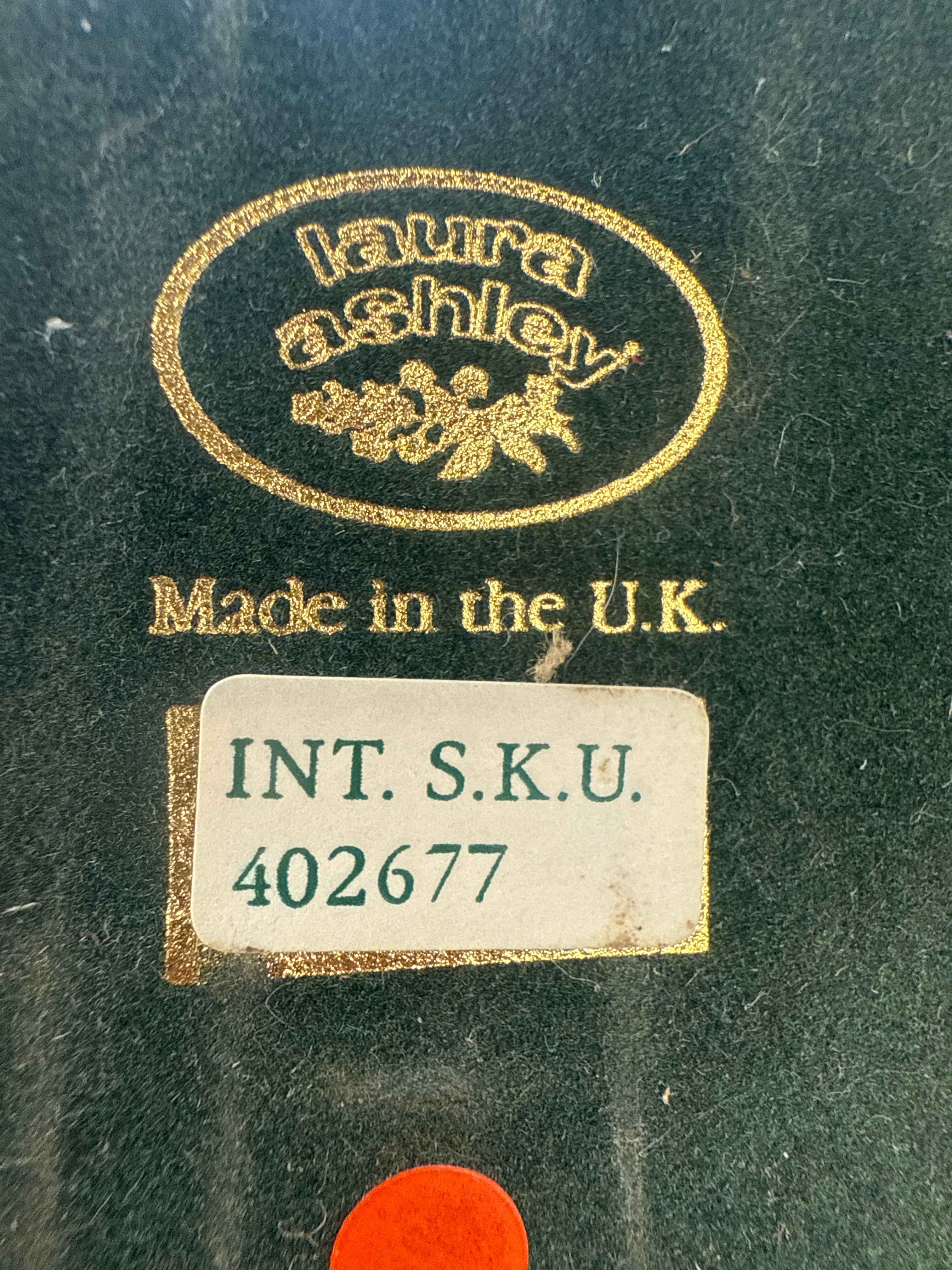A pair of vintage table lamps by Laura Ashley. Each lamp features a dark stained Wood columnar base with a squared, stepped design, accented by a brass-tone metal ring. They are topped with octagonal, flared fabric lampshades in a natural or cream hue. The electrical cords, coiled around the bases, include an in-line switch on one and terminate in UK 3-pin ‘Fused’ plugs. A manufacturer’s label on the base identifies them as ‘Laura Ashley,’ states ‘Made in the U.K.,’ and displays ‘INT. S.K.U. 402677.’
