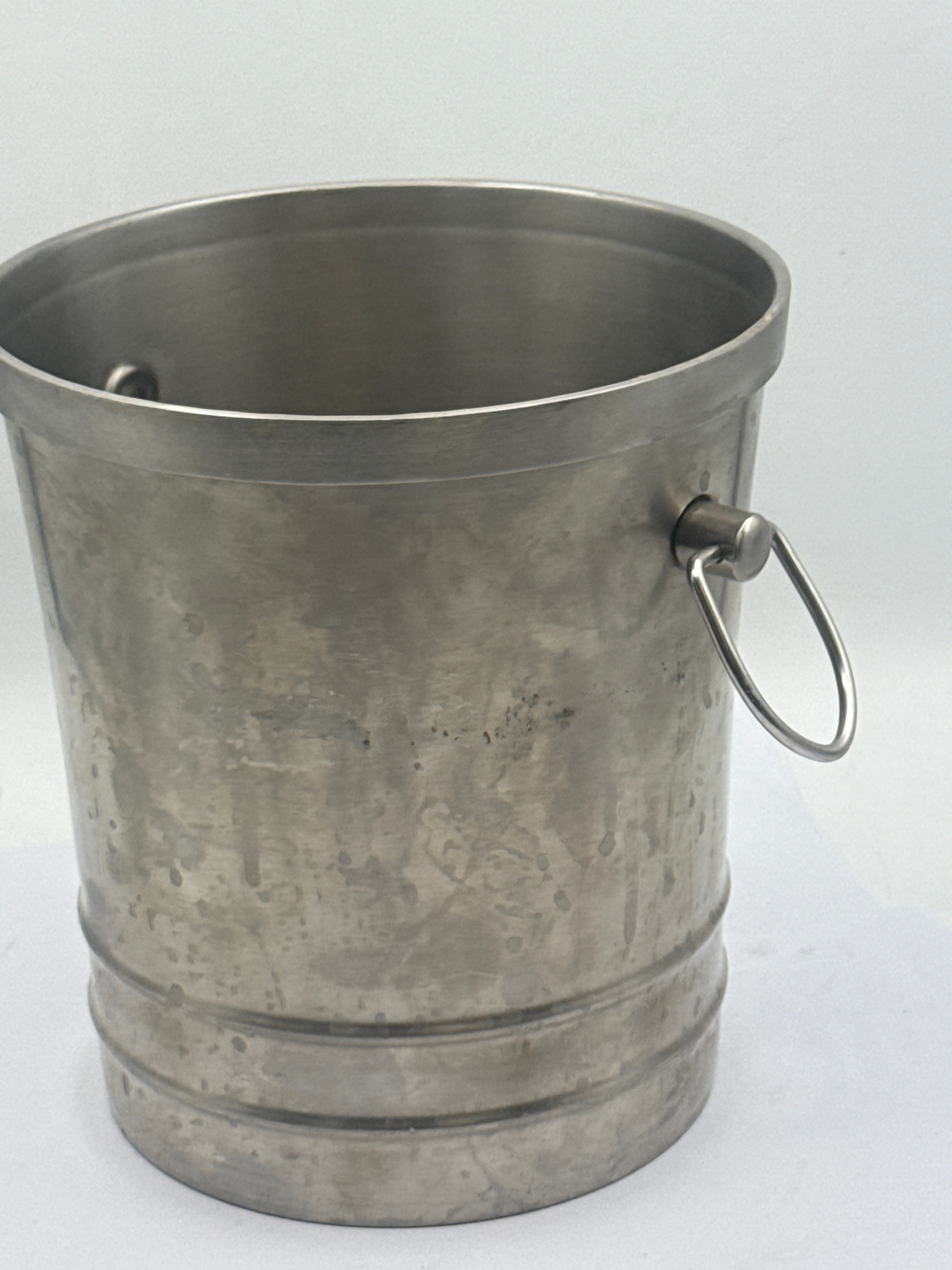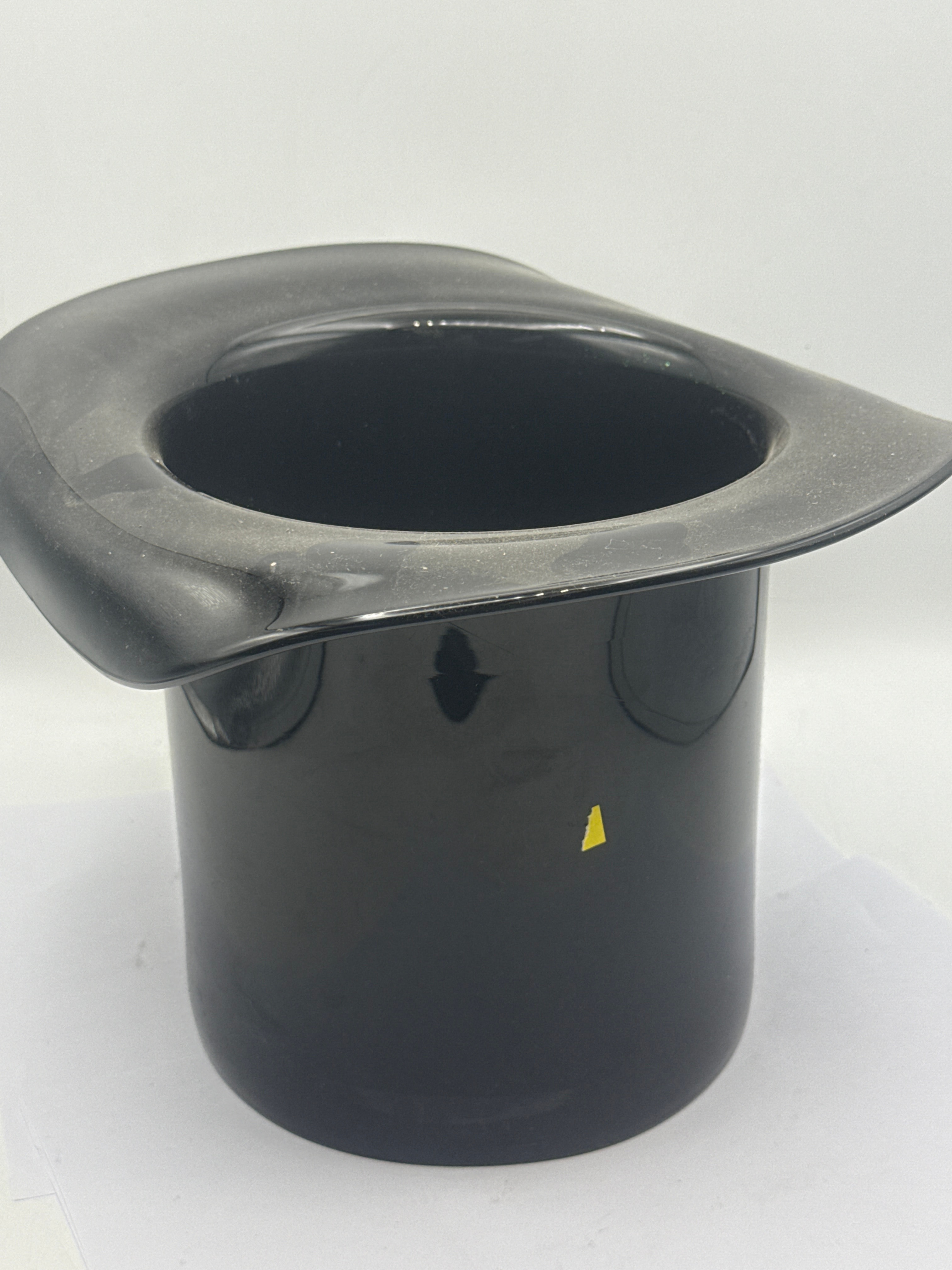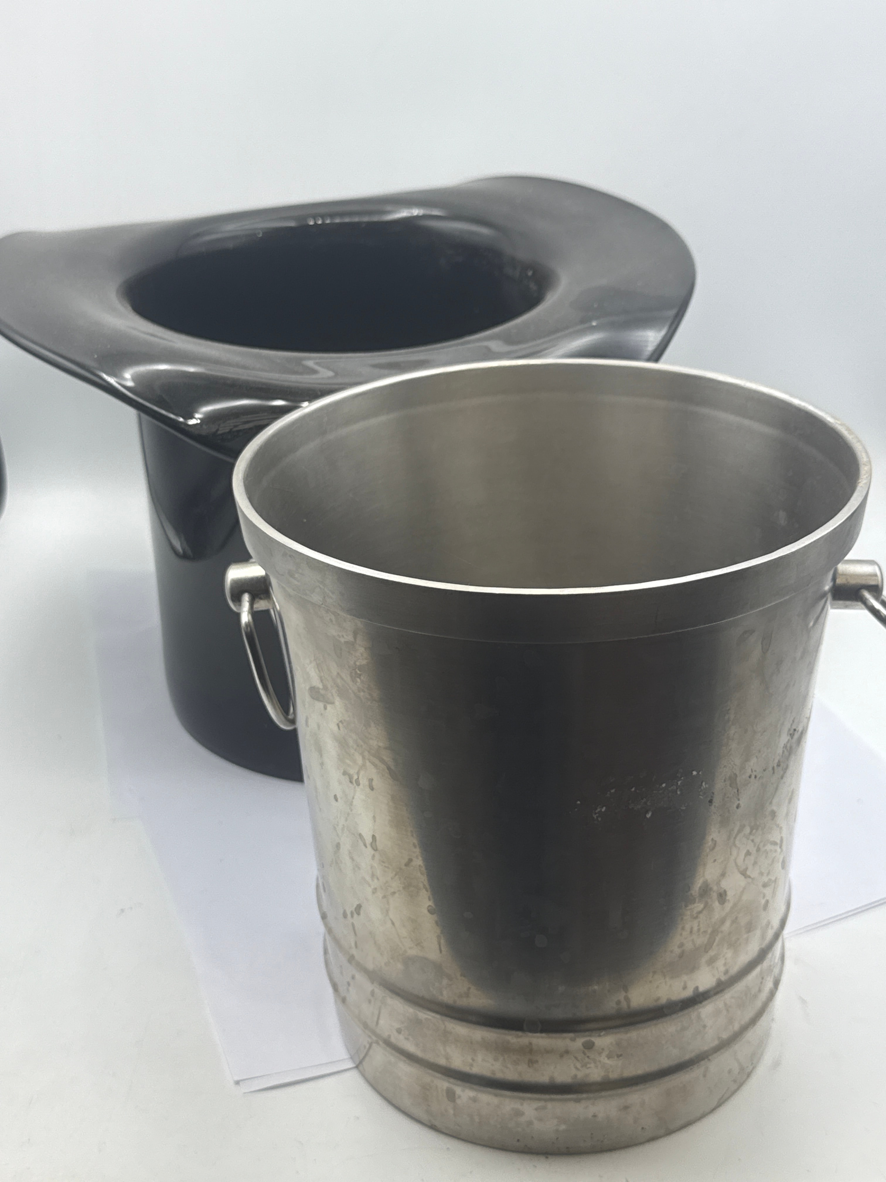 A pair of ice buckets, comprising a contemporary stainless steel ice bucket and a novelty molded plastic top hat ice bucket. The stainless steel bucket features a utilitarian design with two swing handles and horizontal band detailing near the base. Web intelligence suggests similar examples are often described as ‘Mid Century Modern’ or ‘Champagne Bucket’ and are approximately 8 inches tall. The black, glossy molded plastic or synthetic novelty ice bucket is designed in the shape of a top hat.