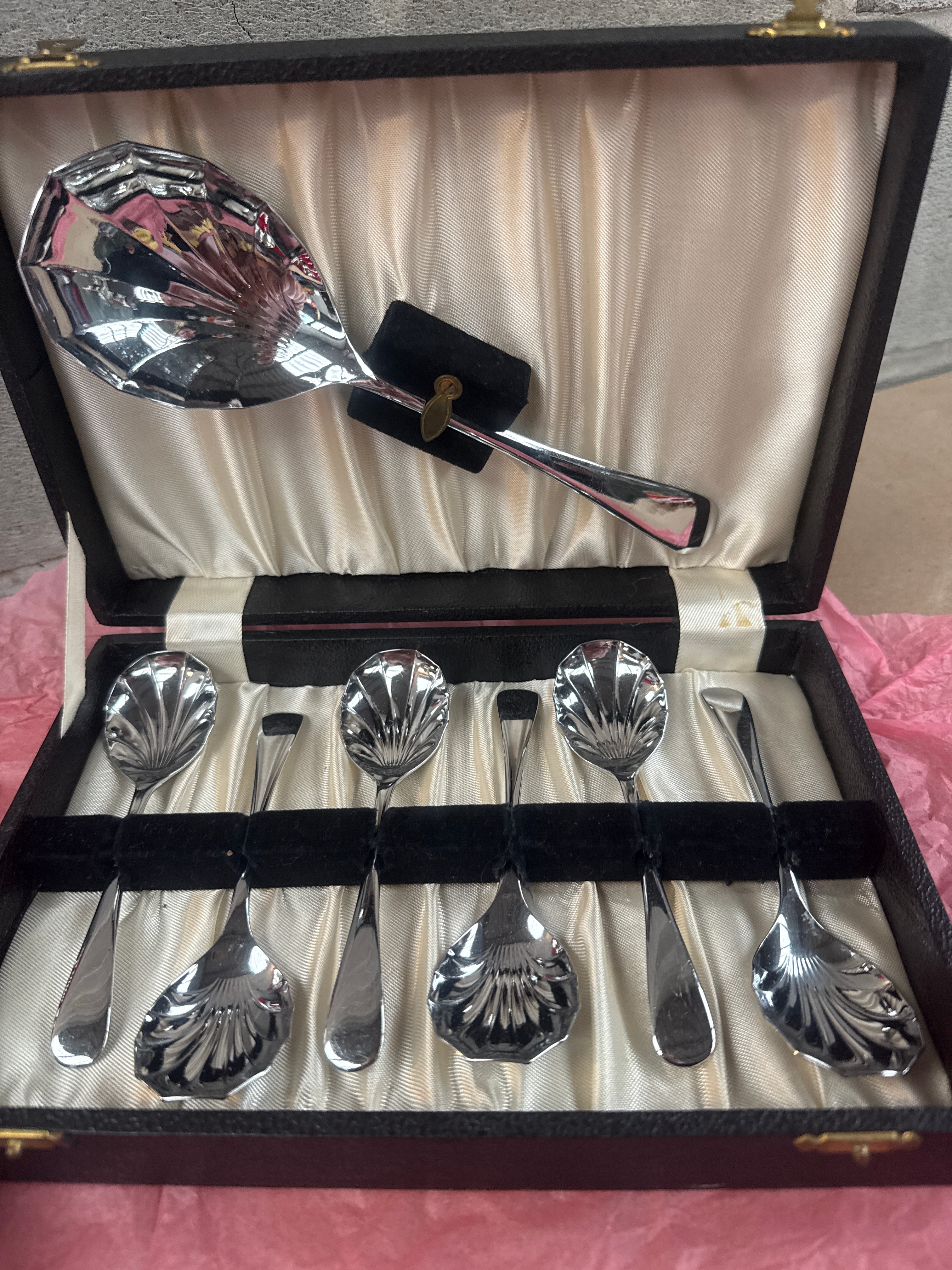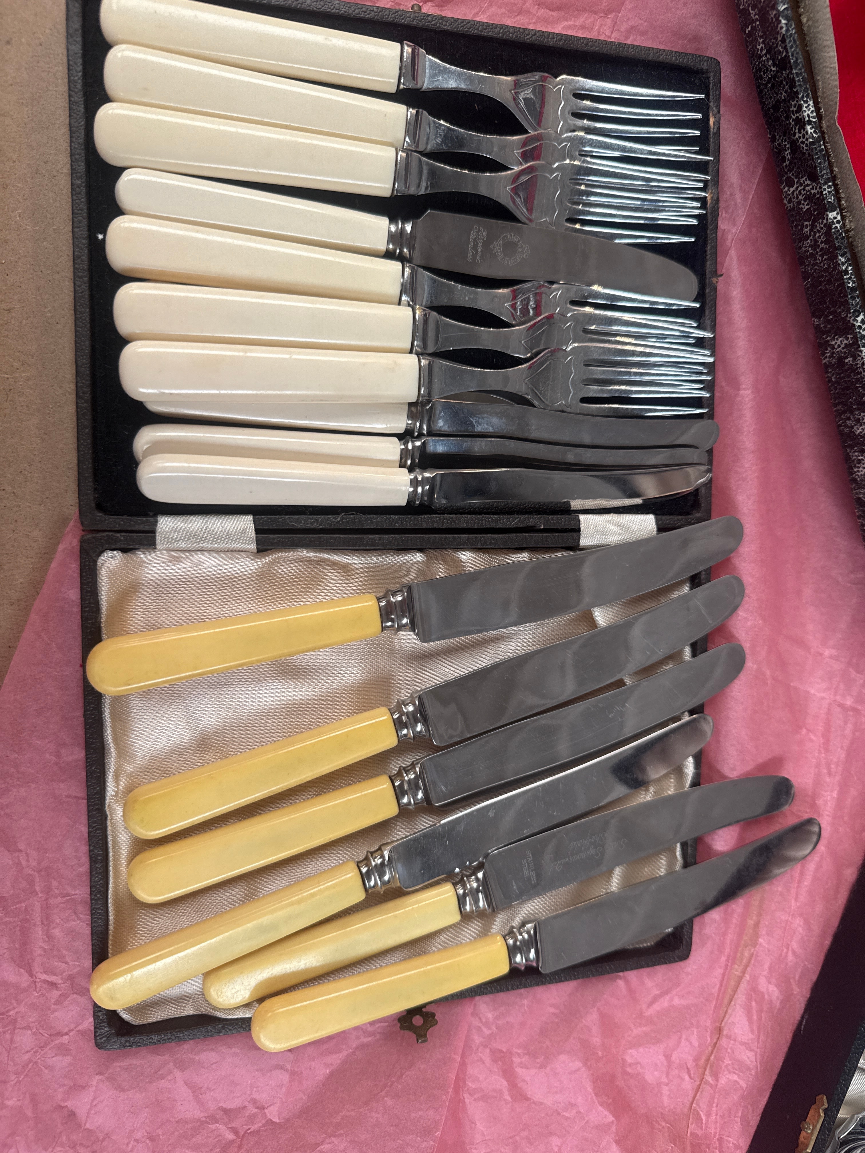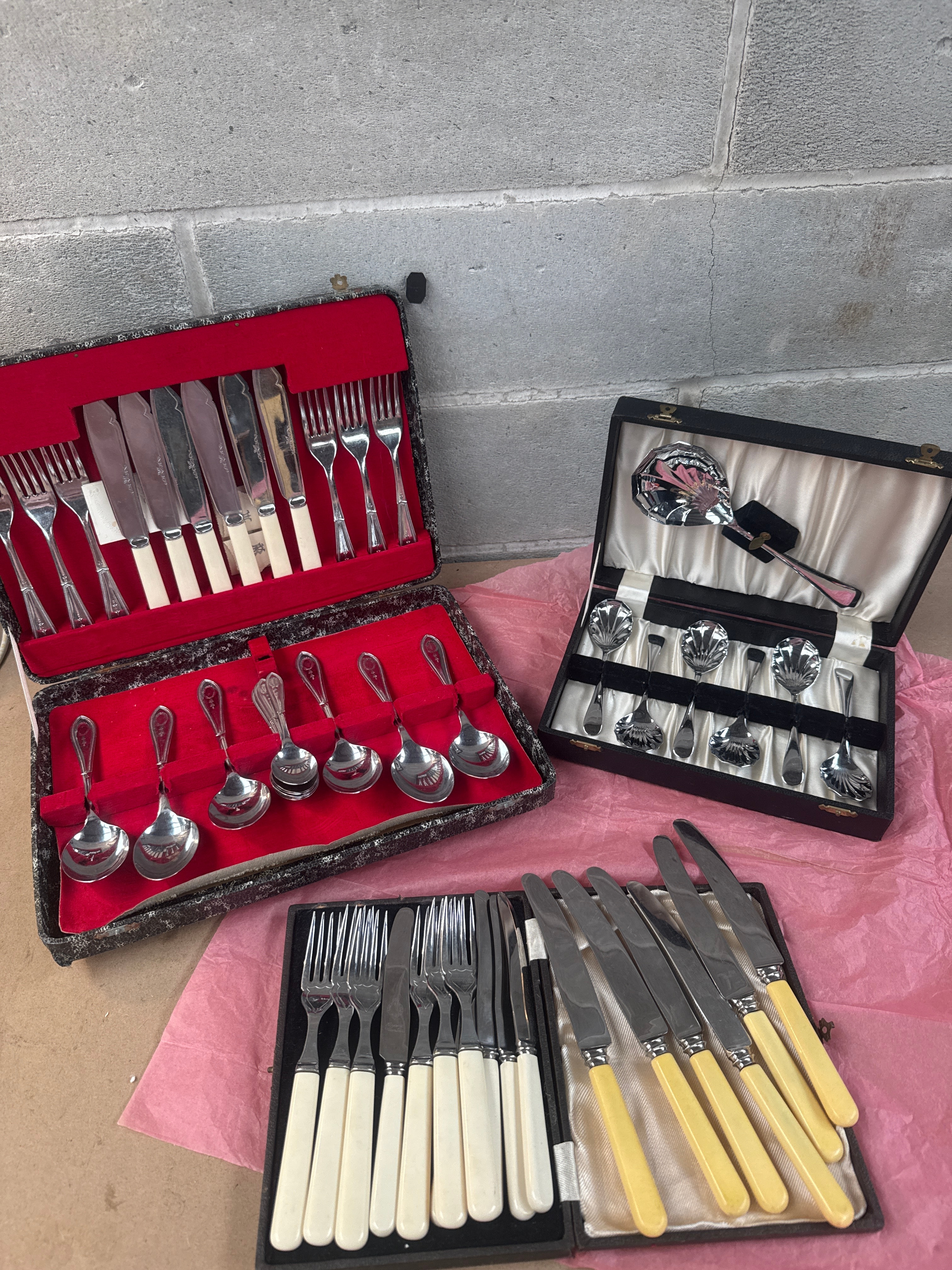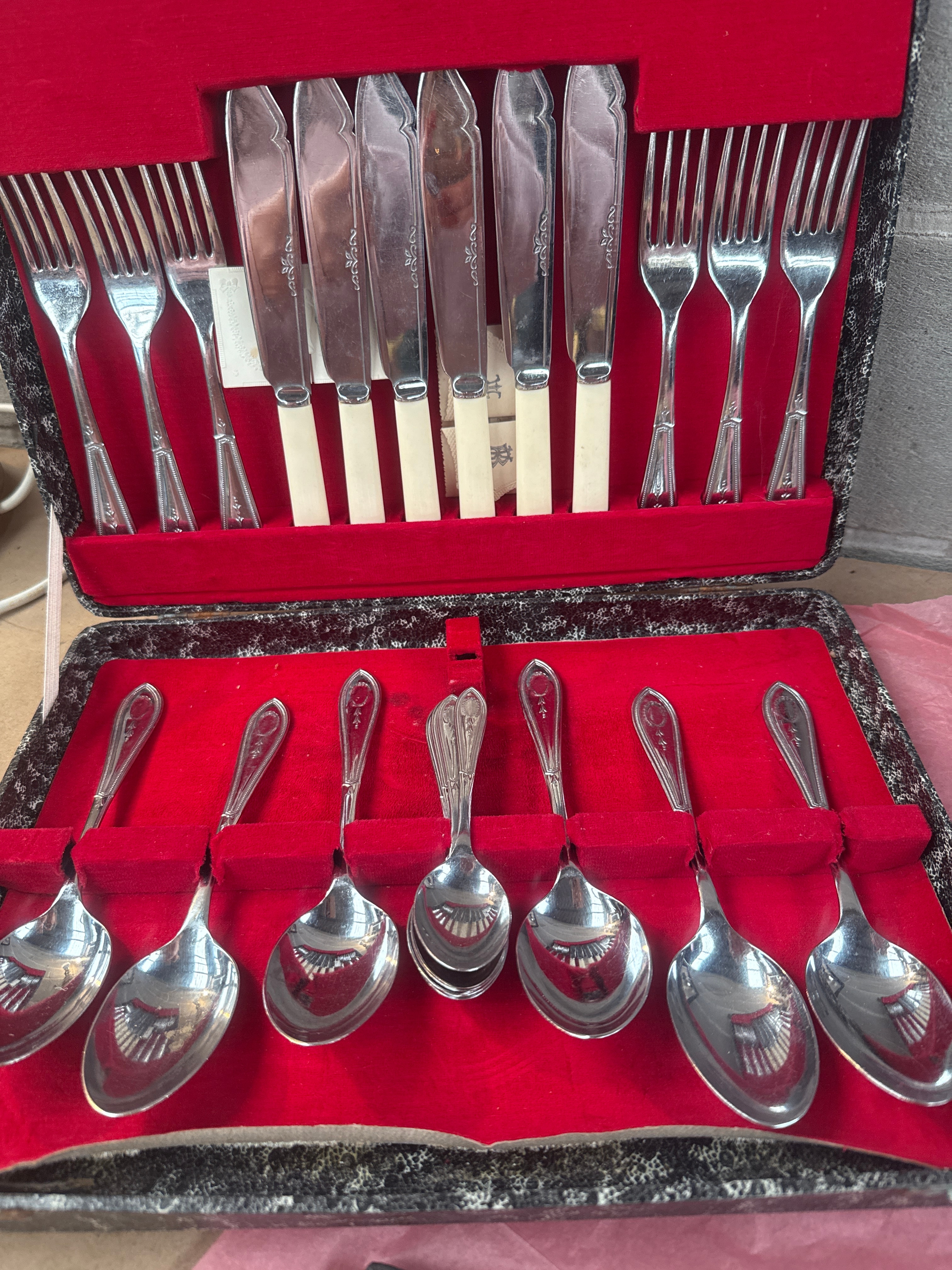 A collection of Tudor Plate Oneida Community Queen Bess flatware. Comprising multiple sets presented in hinged cases and open trays. The flatware is silver-plated, with stainless steel knife blades. One large collection, housed in a black case with a red velvet interior, includes numerous silver-toned metal forks, knives with cream-colored handles, and various spoons of differing sizes. A second, smaller hinged case with a cream satin interior contains a large scalloped serving spoon and several smaller, ornately fluted spoons, also in silver-toned metal. Two additional open trays present groupings of silver-toned forks and knives with yellowish-cream handles. The knife blades are marked ‘STAINLESS’.