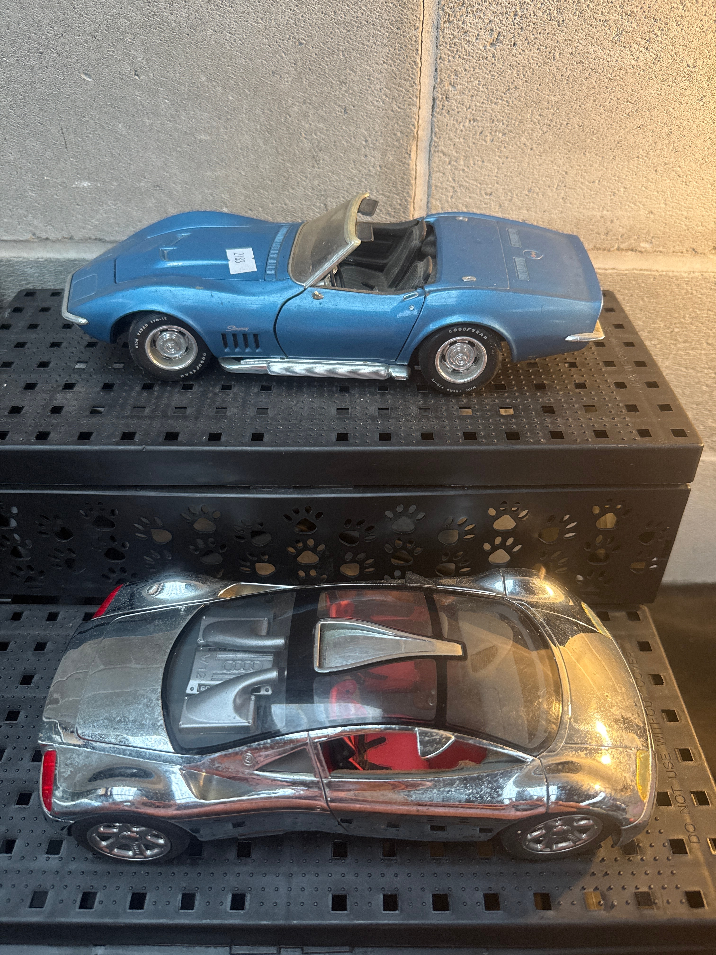 This lot comprises two diecast model cars. The first is a Revell 1:18 1969 Chevrolet Corvette Convertible, finished in blue. It features visible markings including “Stingray,” “427,” “GOODYEAR,” and “WIDE TREAD F70-15” on its tires, along with a “3183” inventory sticker. The second model is a silver-chrome modern coupe, identified as an Audi Avus concept car, displaying “AUDI” and “W12” markings on its engine bay and wheels. Both models are constructed from painted/plated metal and plastic components with rubber tires, and are displayed on black plastic stands.