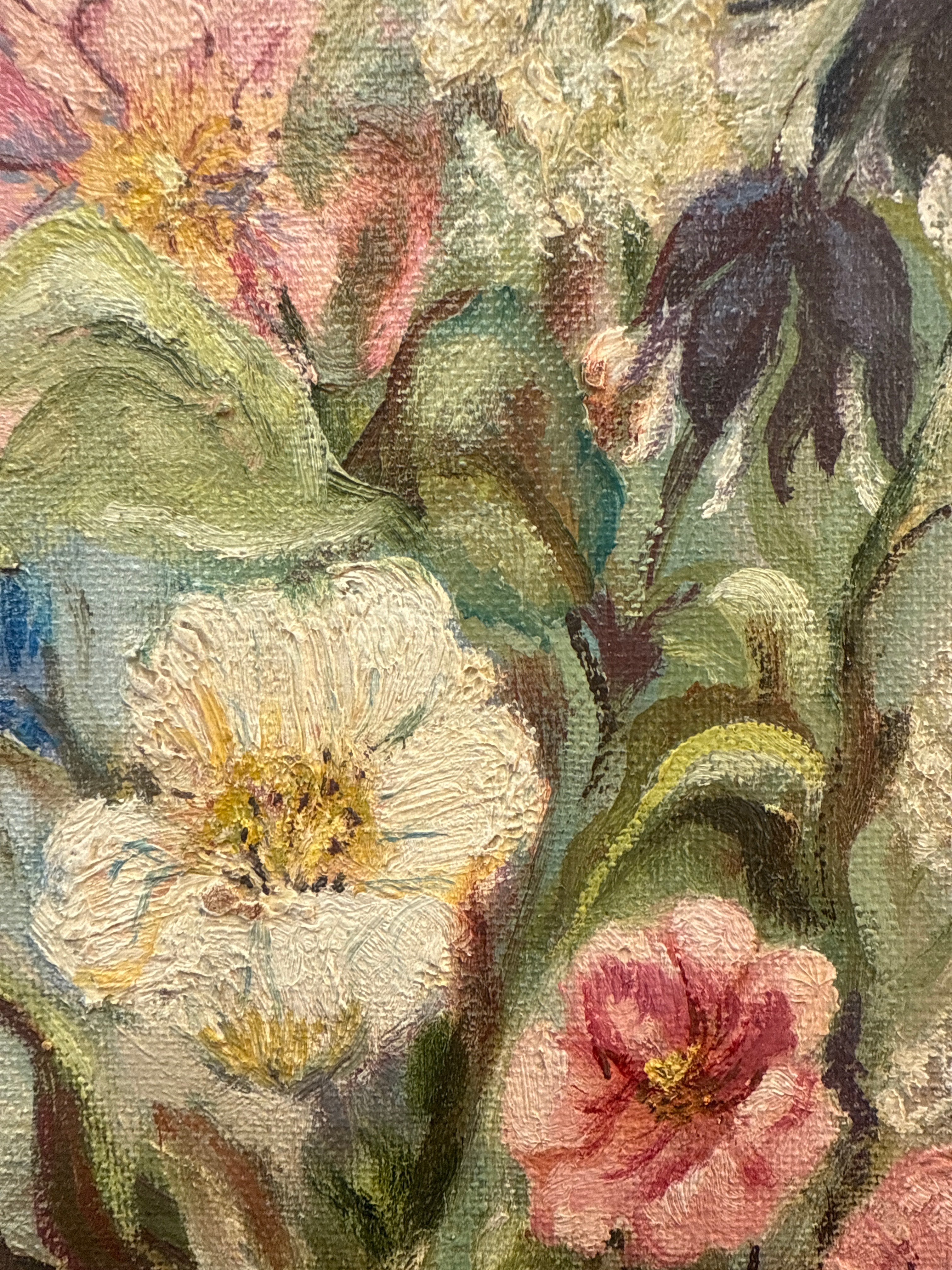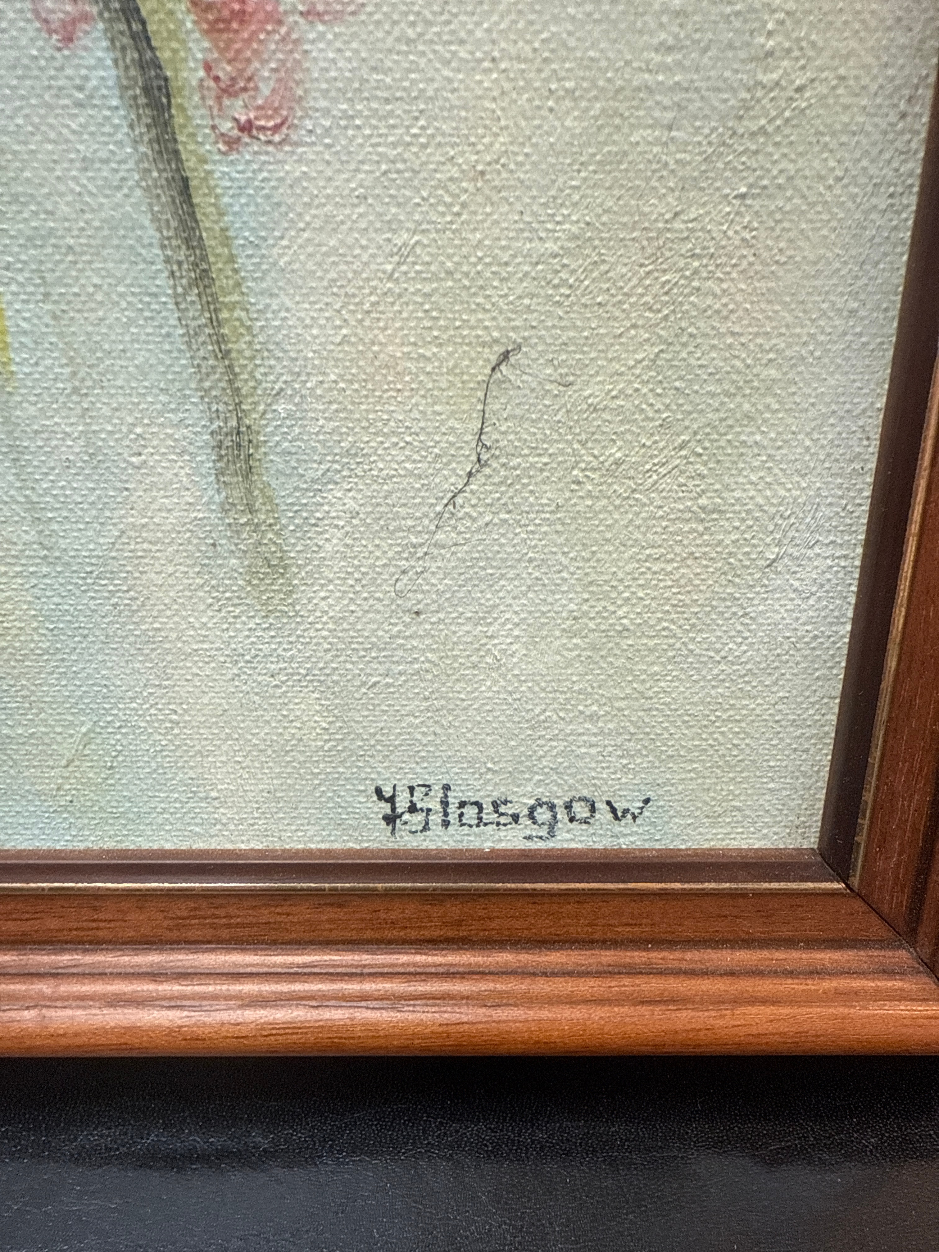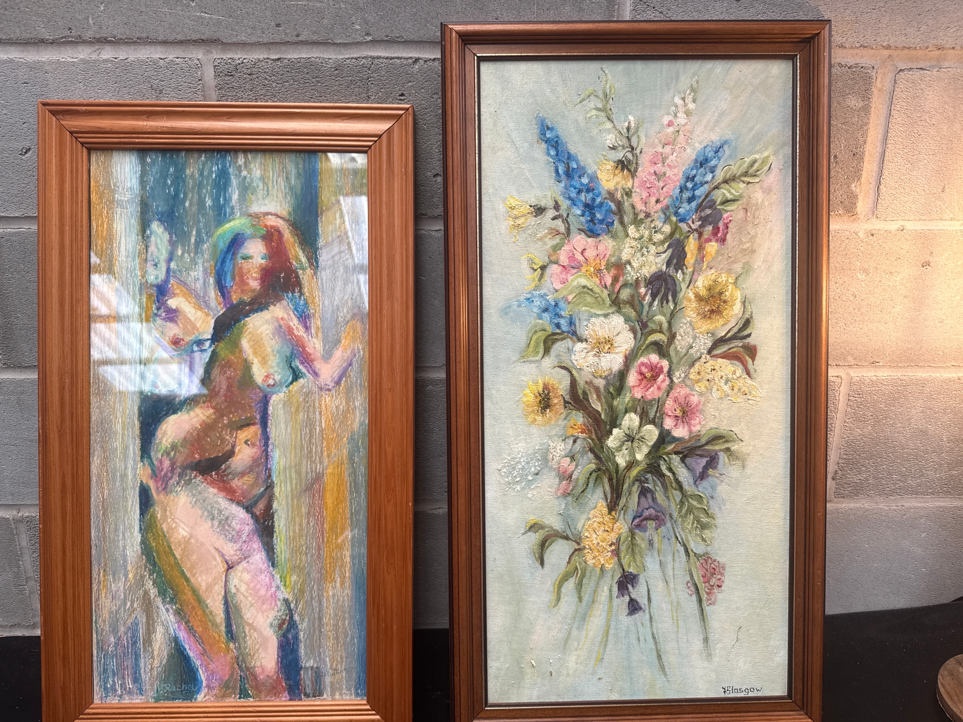 The lot comprises two framed 20th-century artworks. The first artwork, signed “Rachel ’82” in the lower left corner, is an impressionistic-style piece on paper or board depicting a vibrant, partially nude female figure. The second artwork, signed “V. Glasgow” in the lower right, is an oil on canvas painting of a colorful floral bouquet, rendered with noticeable impasto. Both pieces are housed in simple, light-toned wooden frames with visible grain.