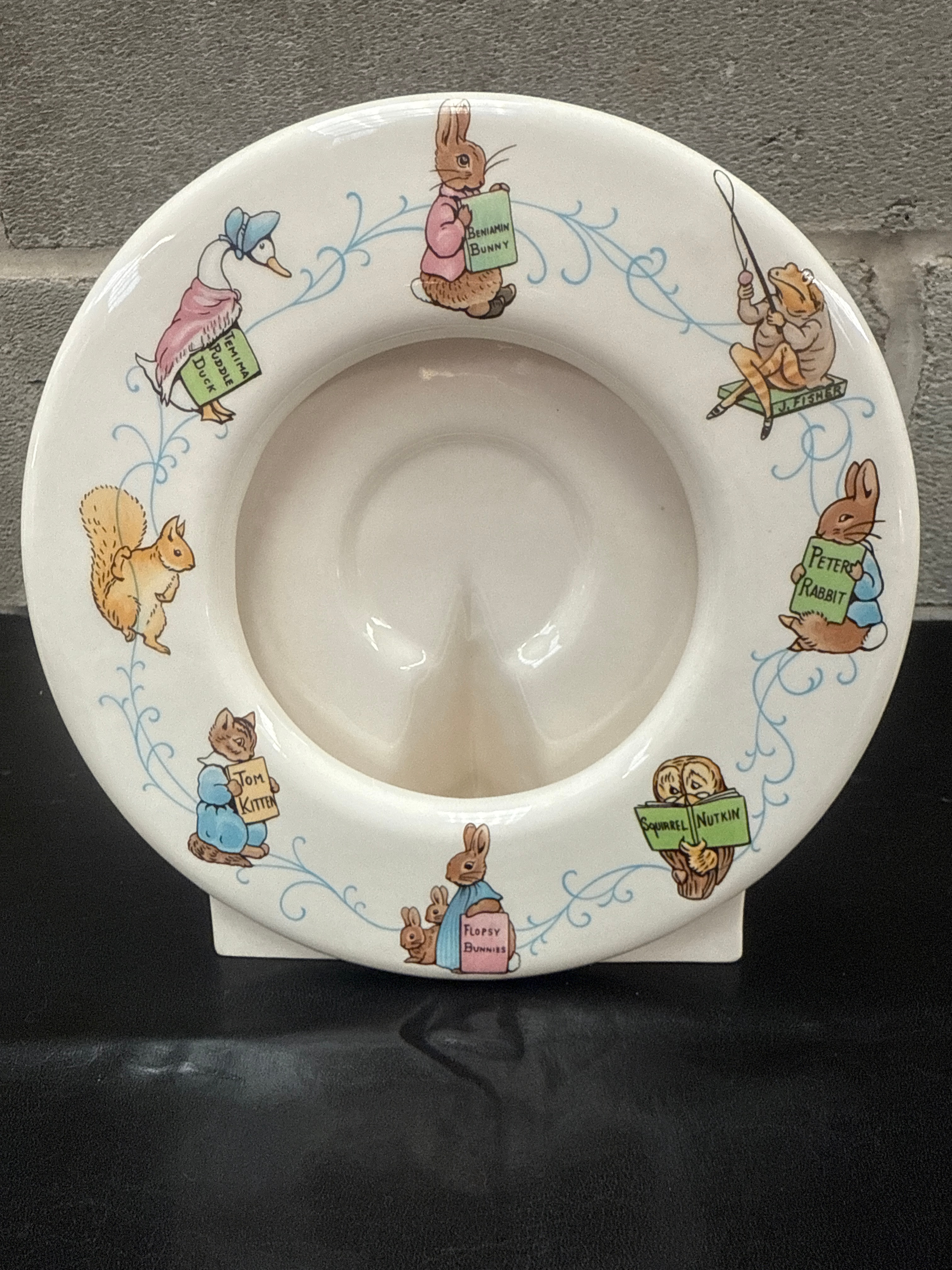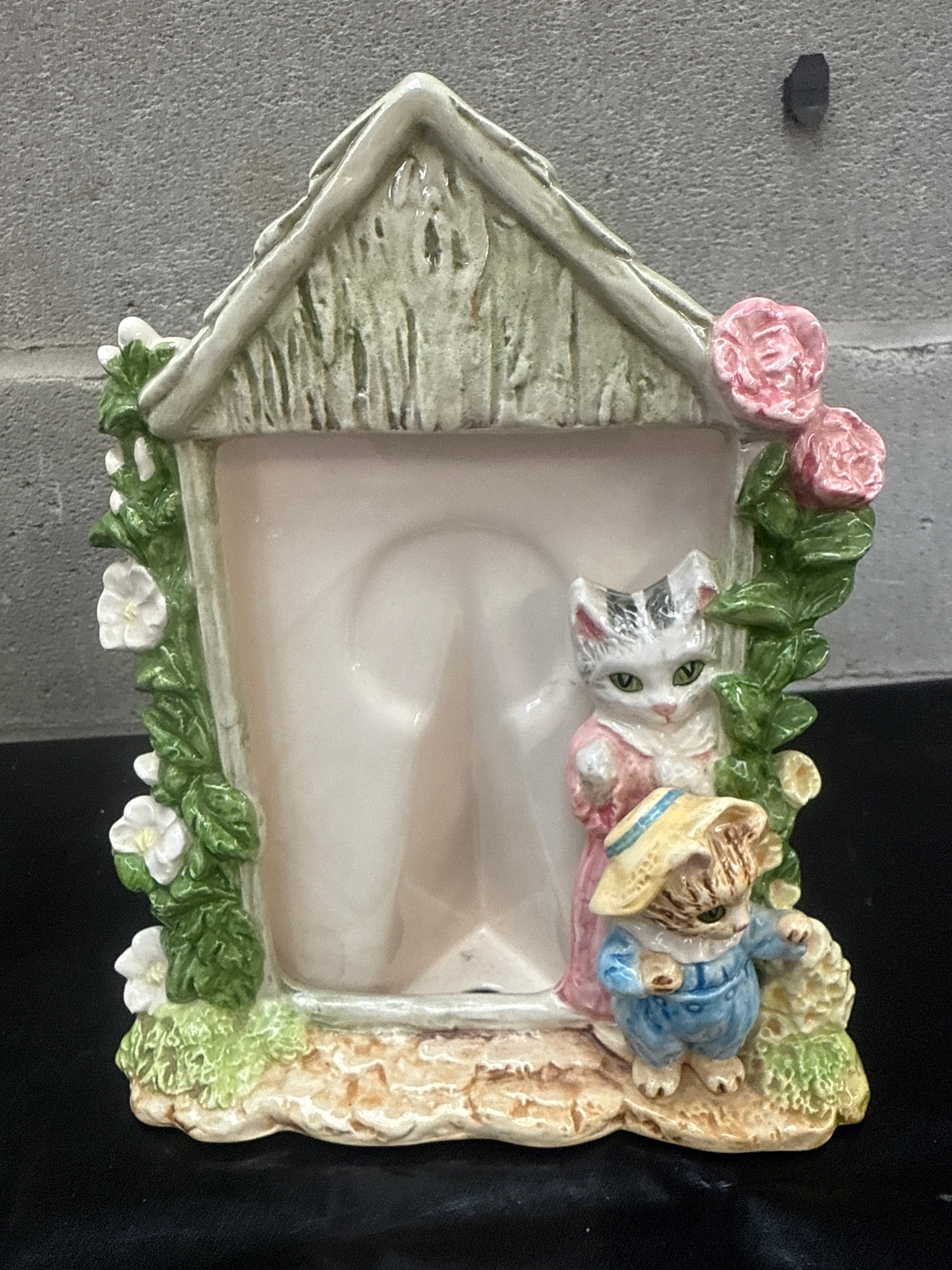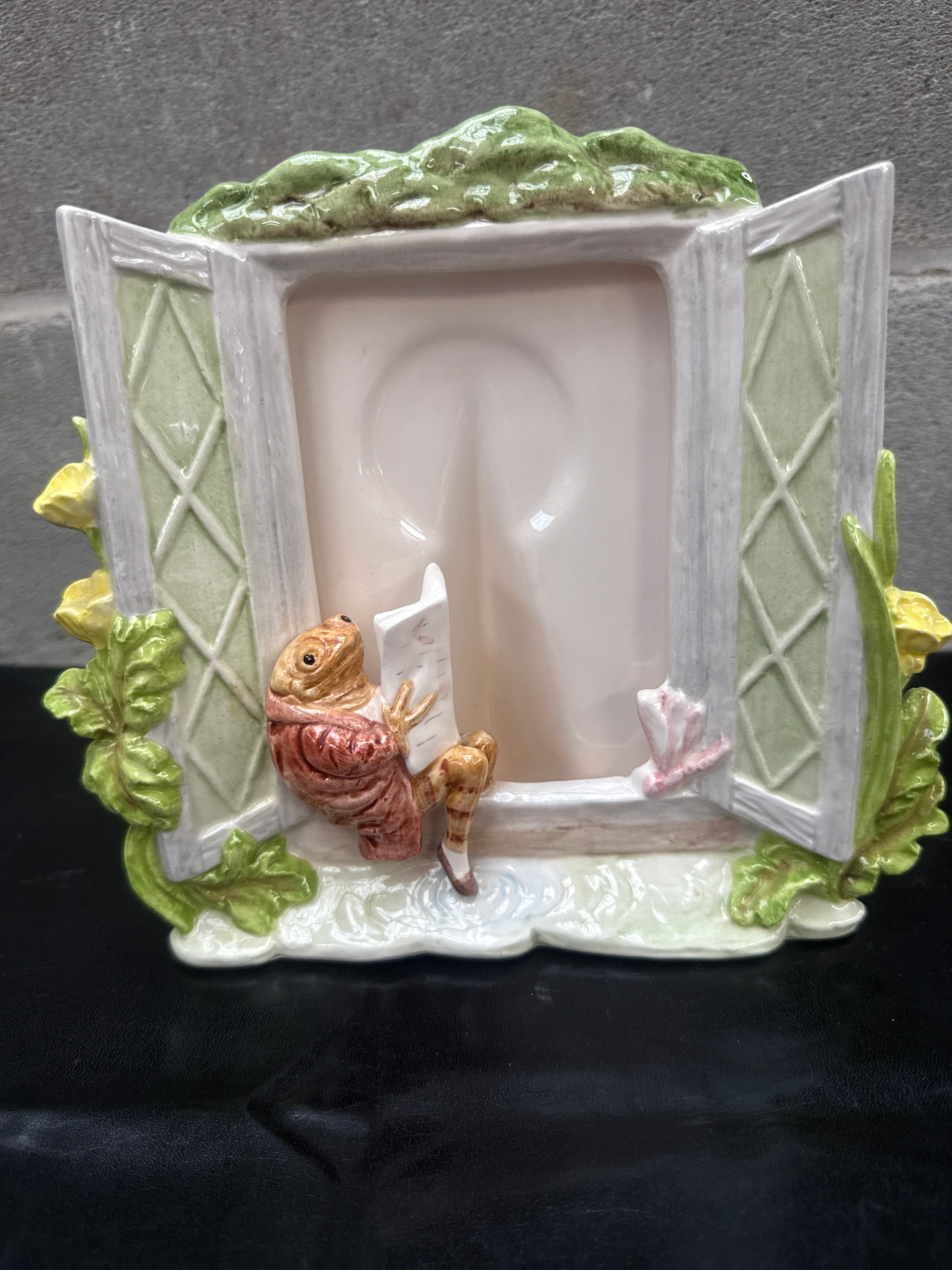 A group of three Beatrix Potter ceramic picture frames by Schmid, dated 1992. Each frame is crafted from glazed ceramic or porcelain, featuring a whimsical, illustrative style centered around characters from Beatrix Potter stories. The first frame is house-shaped, depicting “Tabitha Twitchit & Tom Kitten” with floral accents. The reverse bears the markings “Beatrix Potter ‘Tabitha Twitchit & Tom Kitten’ ©1992 F.W. & Co., Licensed by Copyrights New York, London,” and a “Schmid MALAYSIA” sticker. The second frame is round, encircled by eight distinct Beatrix Potter characters, including “Jemima Puddle-Duck,” “Benjamin Bunny,” “Mr. Jeremy Fisher,” “Peter Rabbit,” “Squirrel Nutkin,” “Tom Kitten,” and “Flopsy Bunnies,” each identified by accompanying text. The third frame is window-shaped, featuring “Mr. Jeremy Fisher” reading a book on a windowsill, adorned with foliage and yellow flowers.
