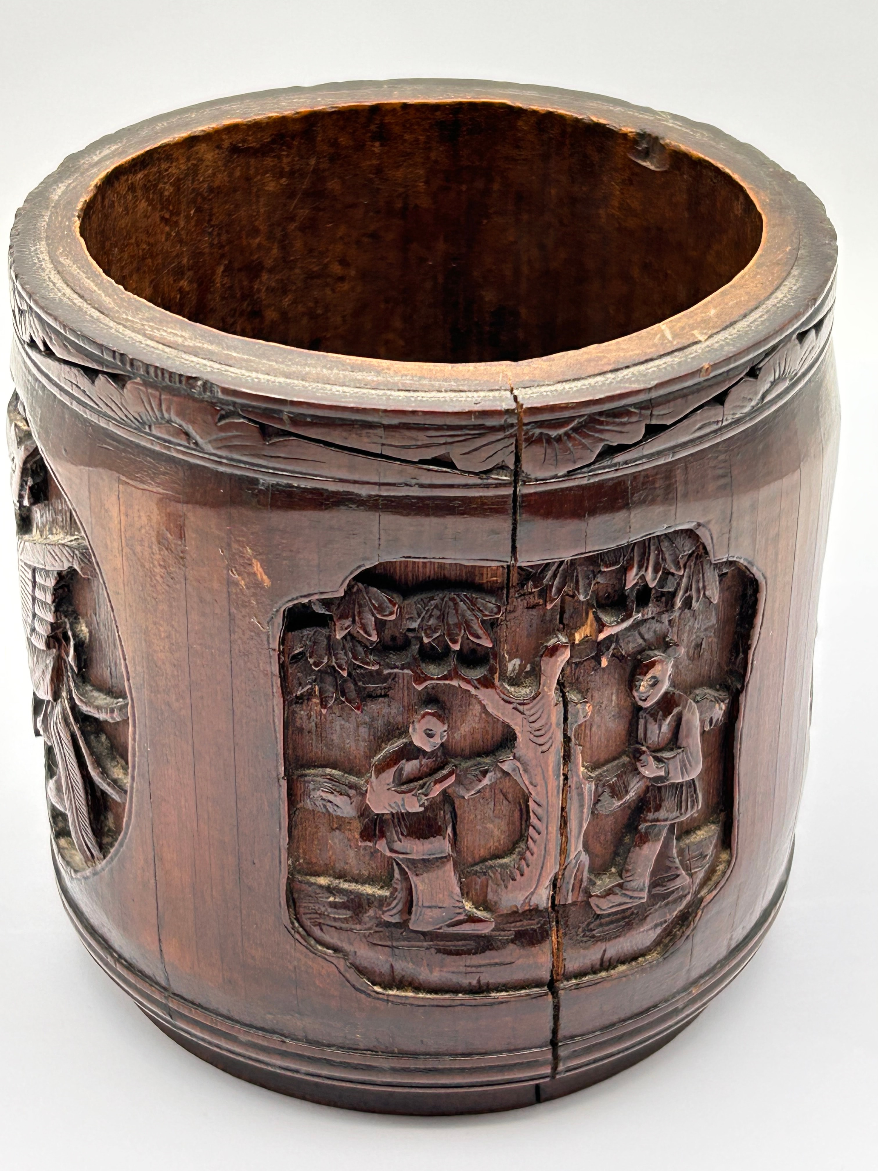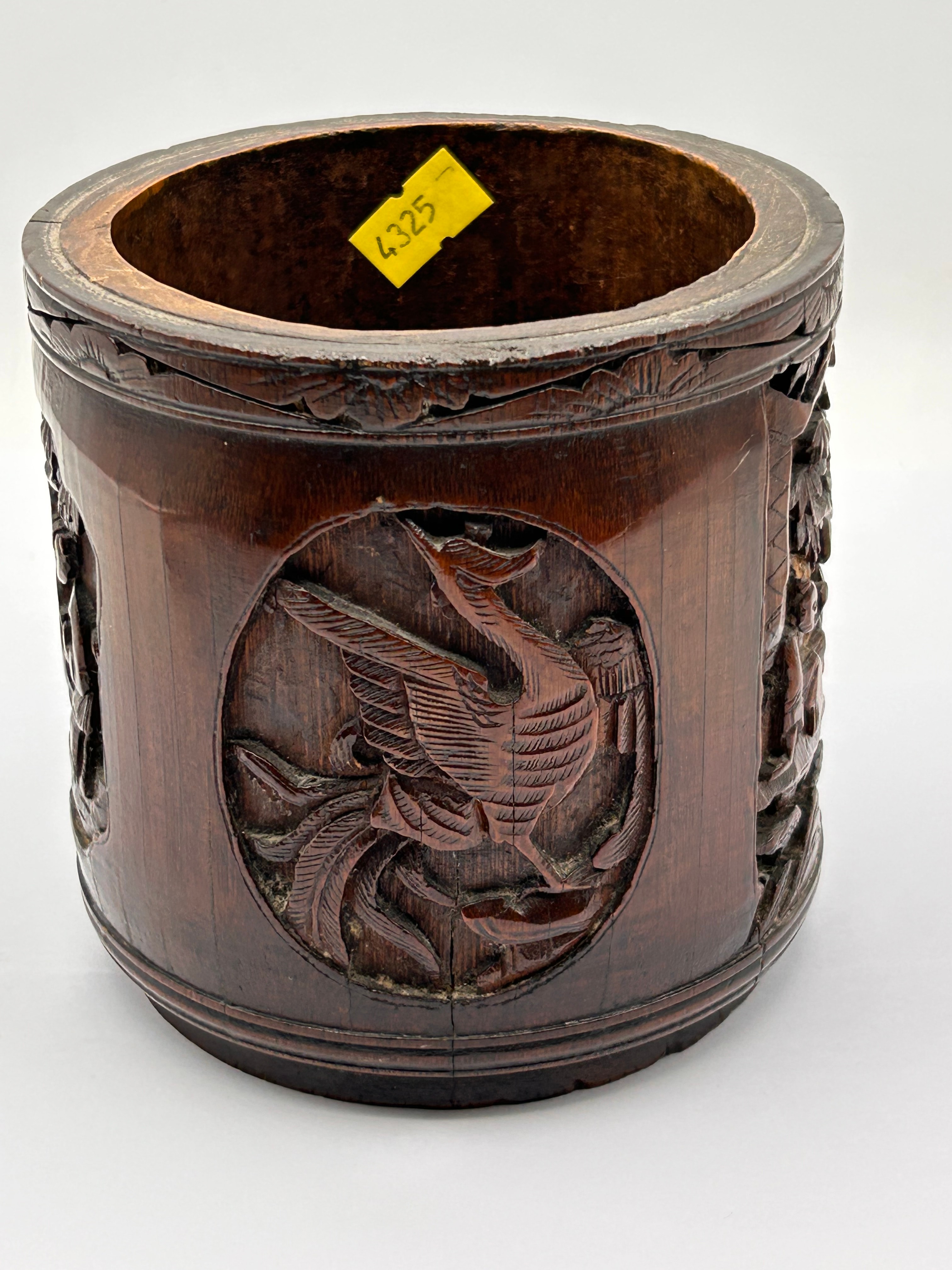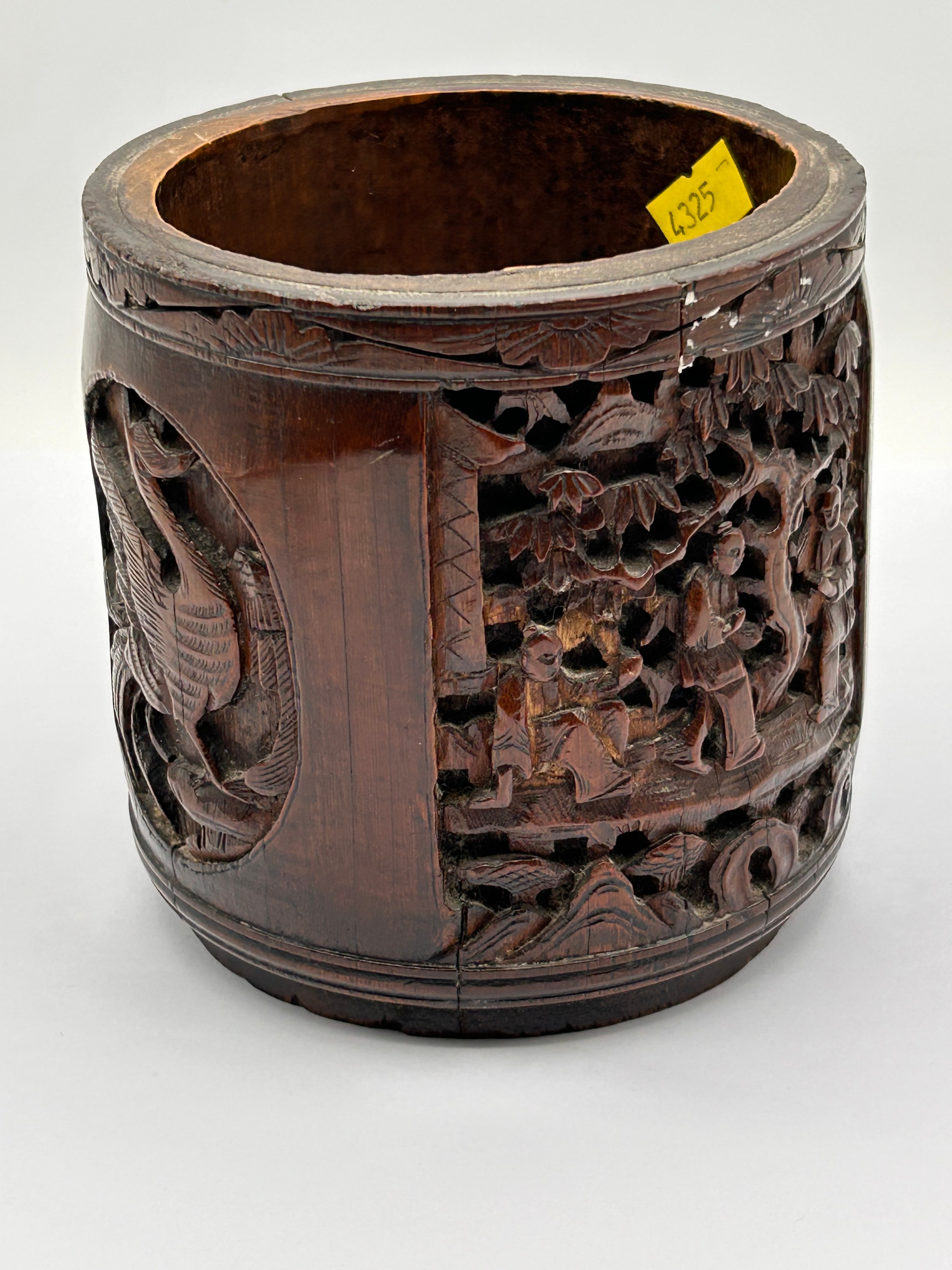 A Chinese Carved Bamboo Brush Pot (Bitong), Qing Dynasty. The cylindrical container is crafted from dark, reddish-brown bamboo, extensively carved in high relief with a continuous decorative scheme. The carving depicts figures in traditional attire within a landscape setting, alongside stylized birds, including a phoenix, and various floral and foliate motifs. The interior bears a yellow sticker with the number ‘4325’.