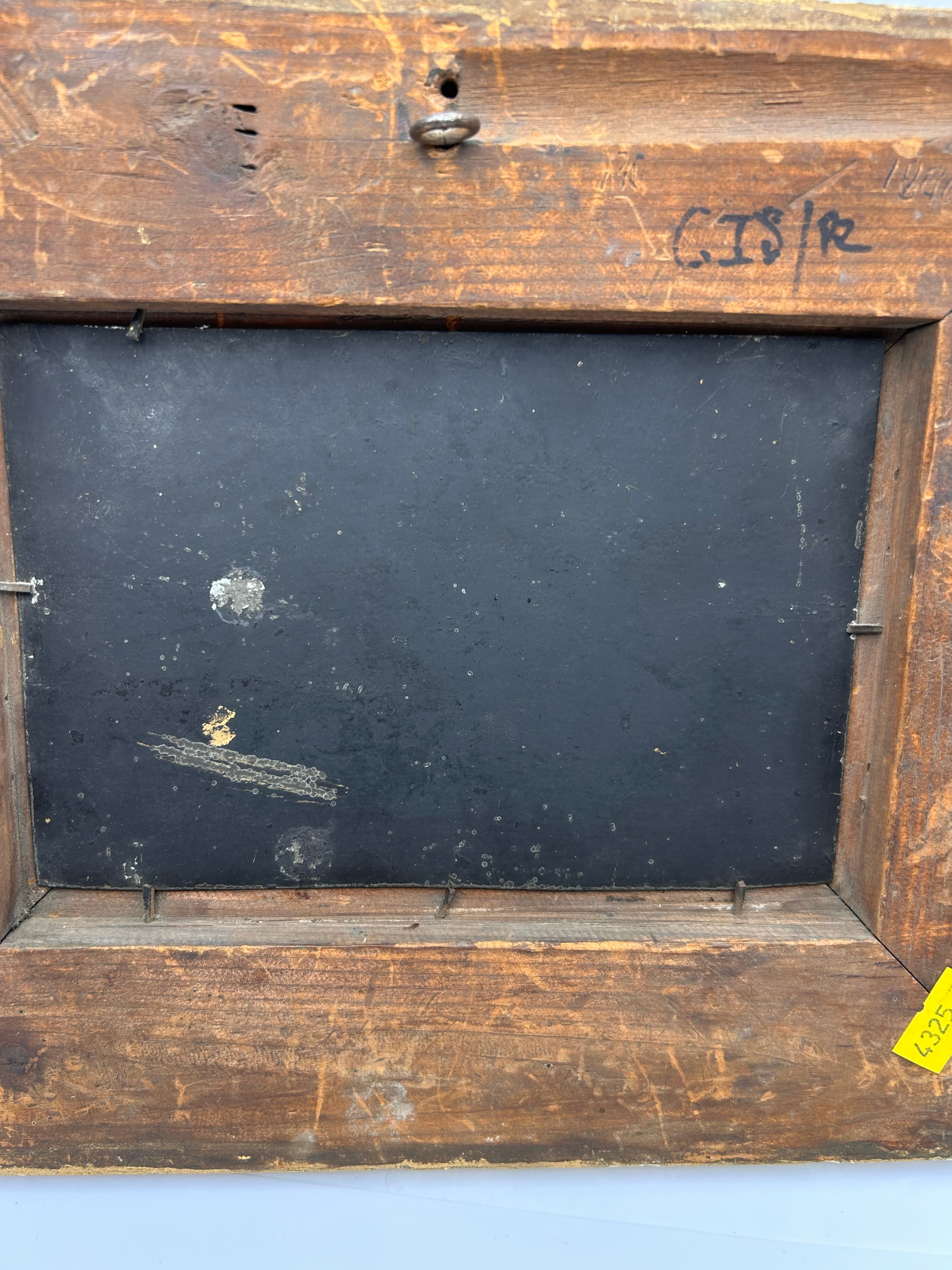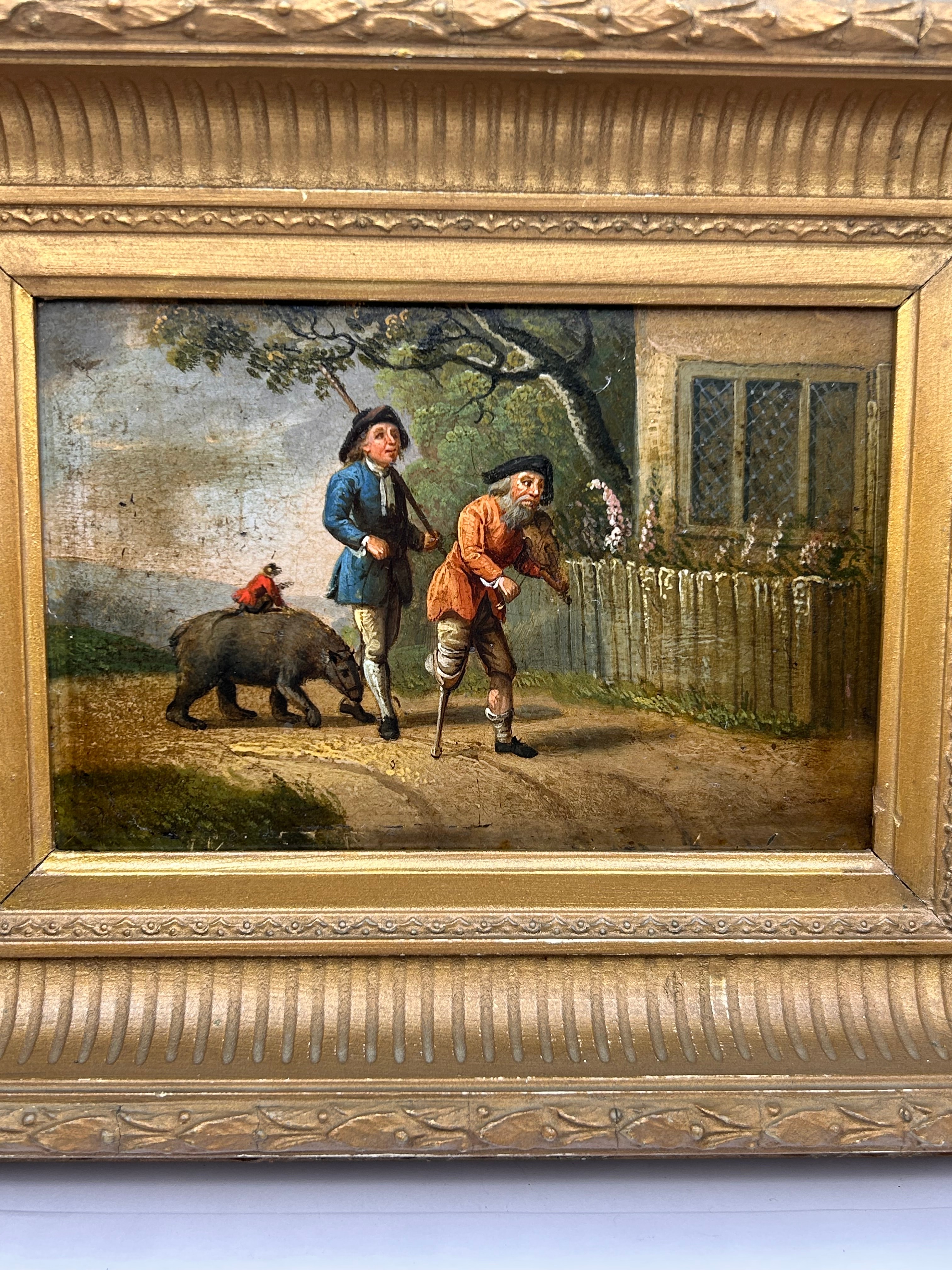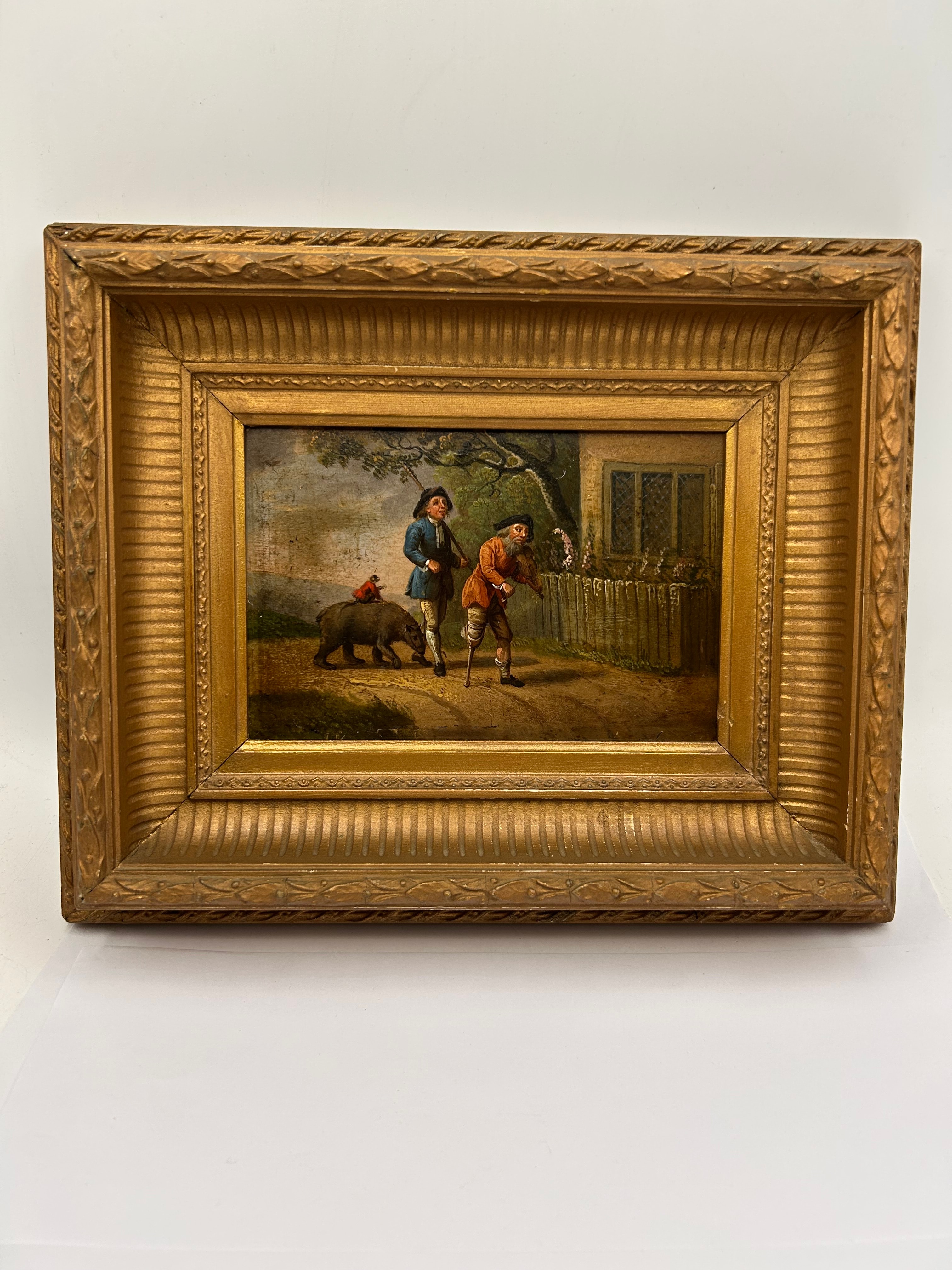A 19th Century Flemish School oil painting on copper panel, depicting a European genre scene. The artwork portrays two male figures, one with a crutch, accompanying a wild boar carrying a small red animal, set before a house and fence. The painting is housed within a carved and gilded wooden frame. The reverse reveals a wooden frame with a dark backing board, a metal eyehook, and handwritten markings “CIS/R” in black marker and a yellow sticker numbered “1325”.