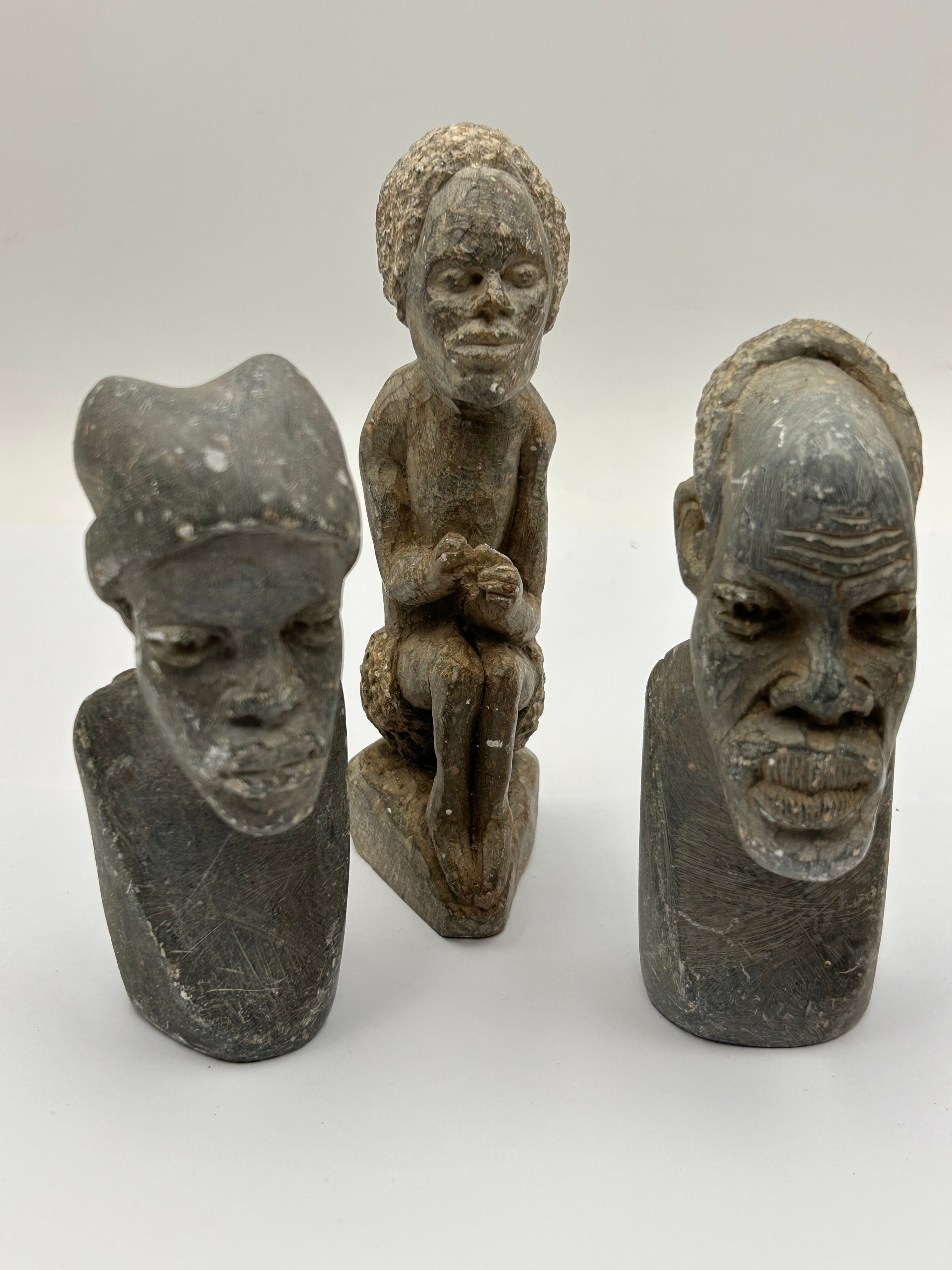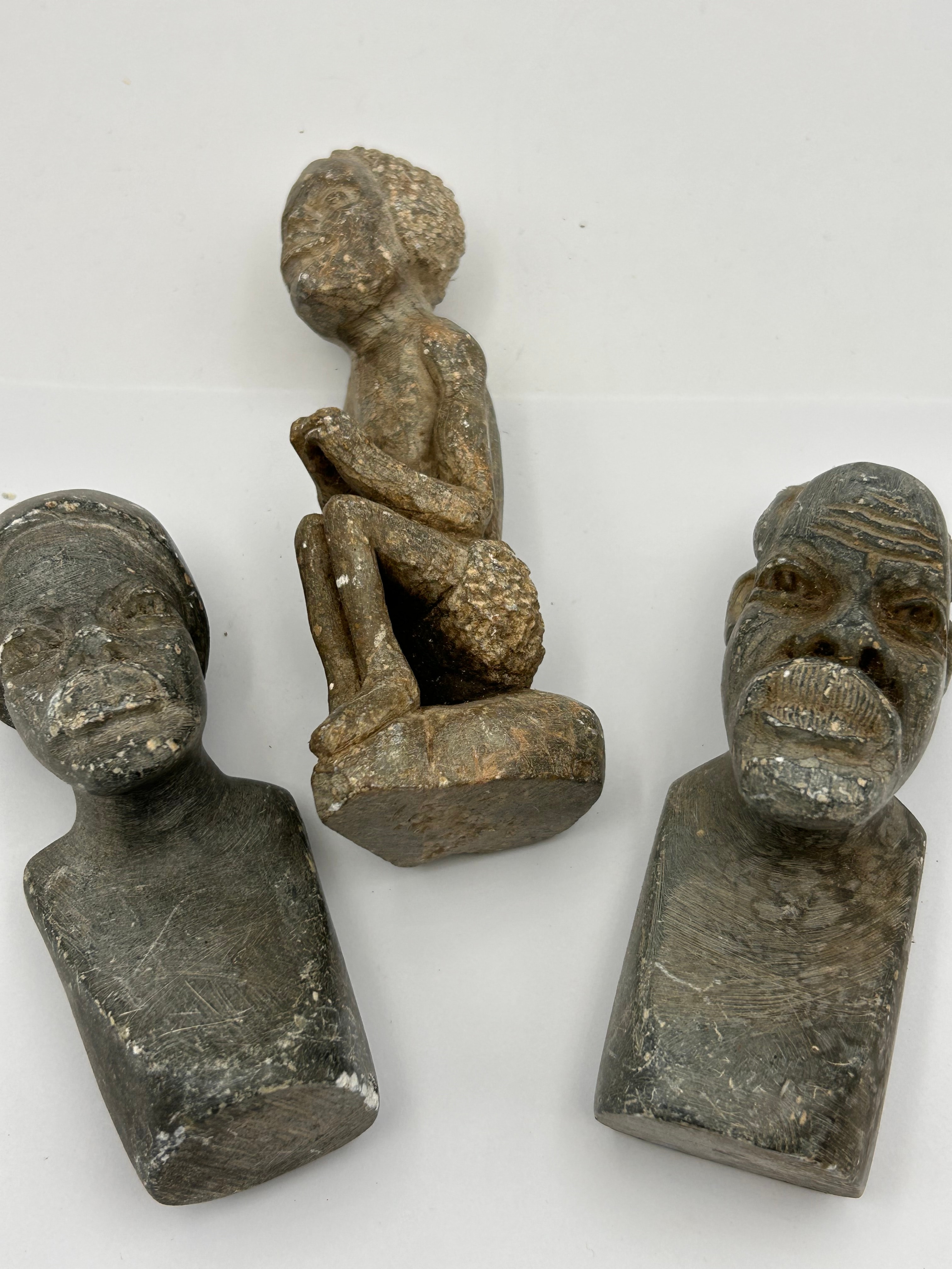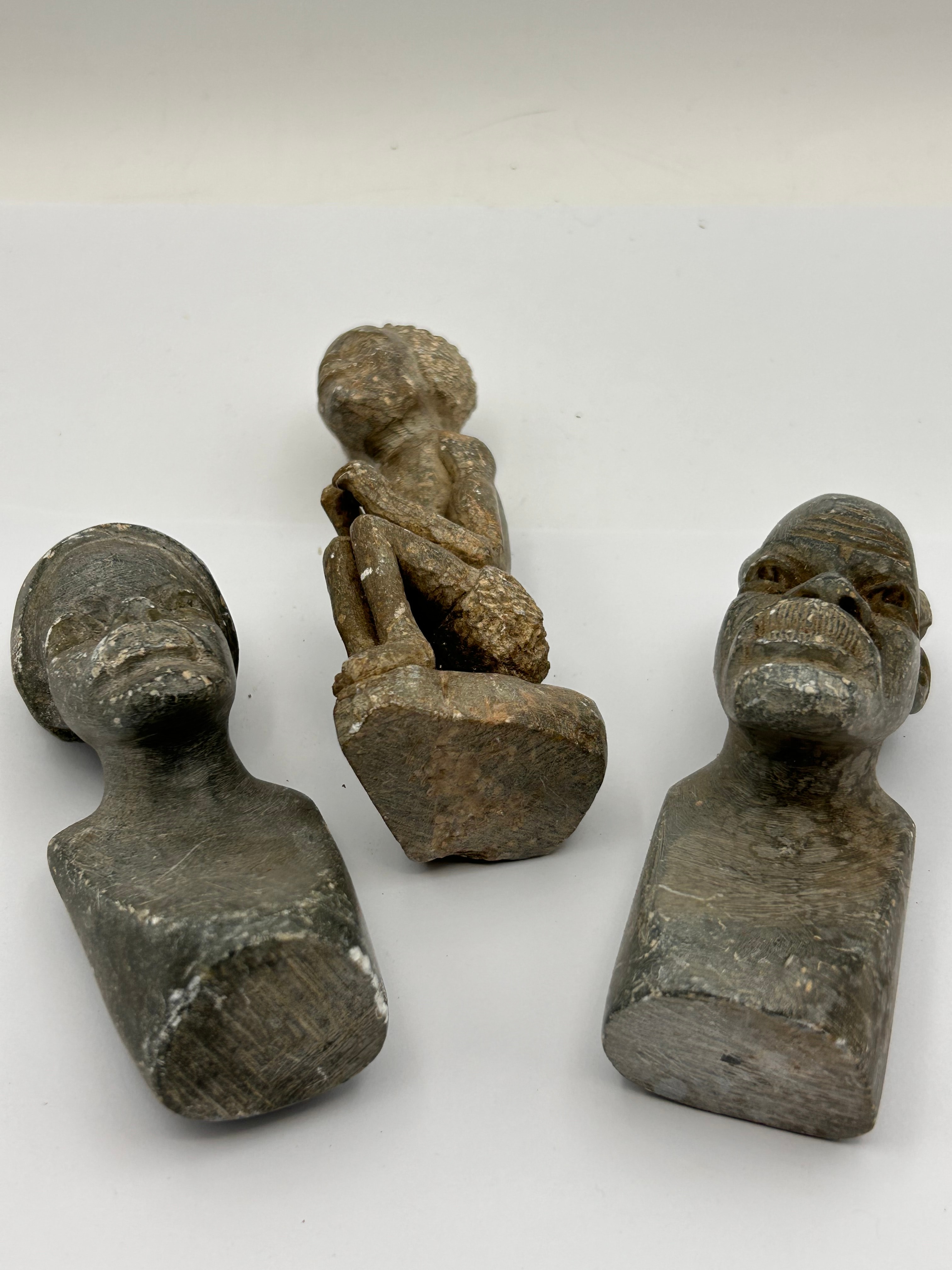 Three African Bakongo Ntadi stone figures. This lot comprises two busts and one full-body seated figure. The two busts are rendered in dark grey stone, depicting male heads with distinct facial hair and textured head details; one appears to wear a head covering. The central figure, carved from a lighter brownish-grey stone, shows a seated male form with textured hair and hands clasped, resting on an integral plinth. All pieces exhibit a rustic, ethnographic carving style with visible tool marks and a textured finish. No visible text or markings are present on any of the items.