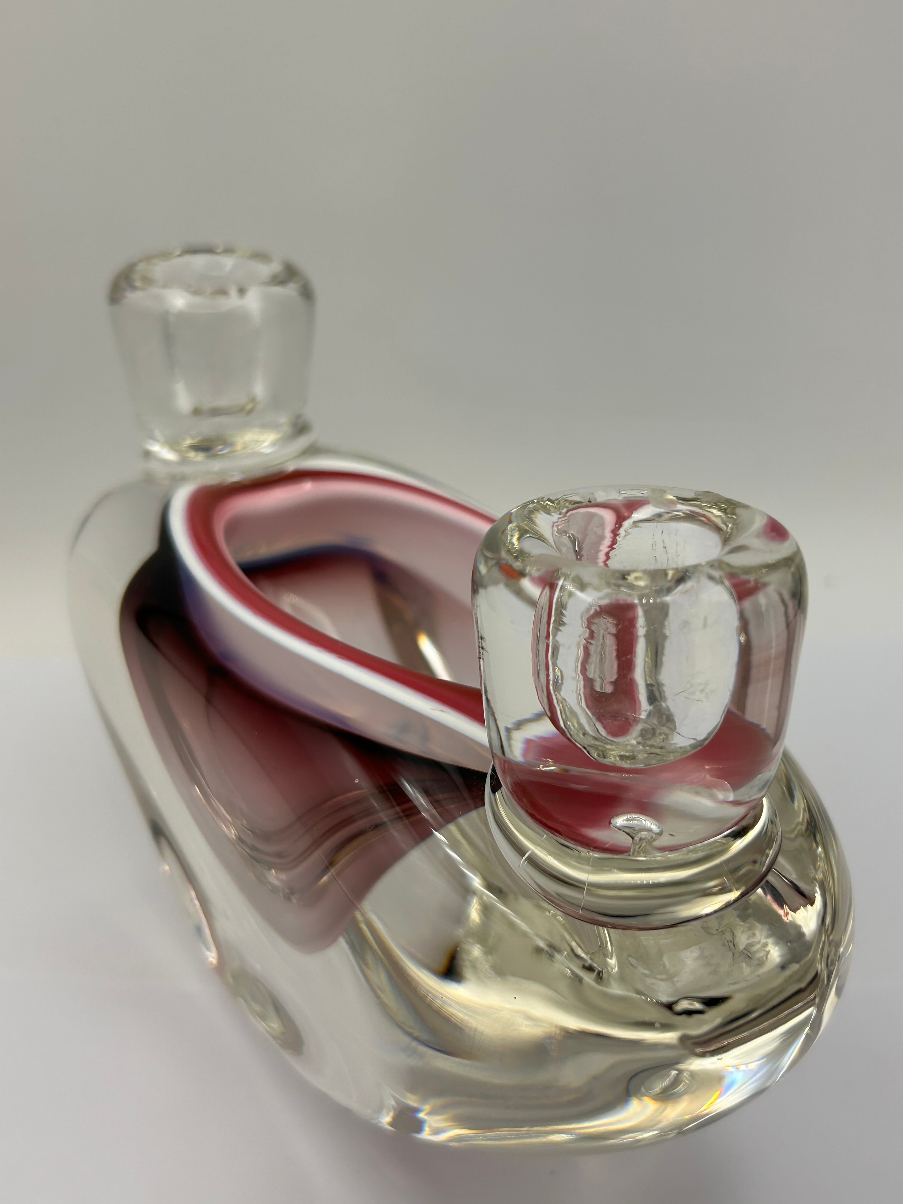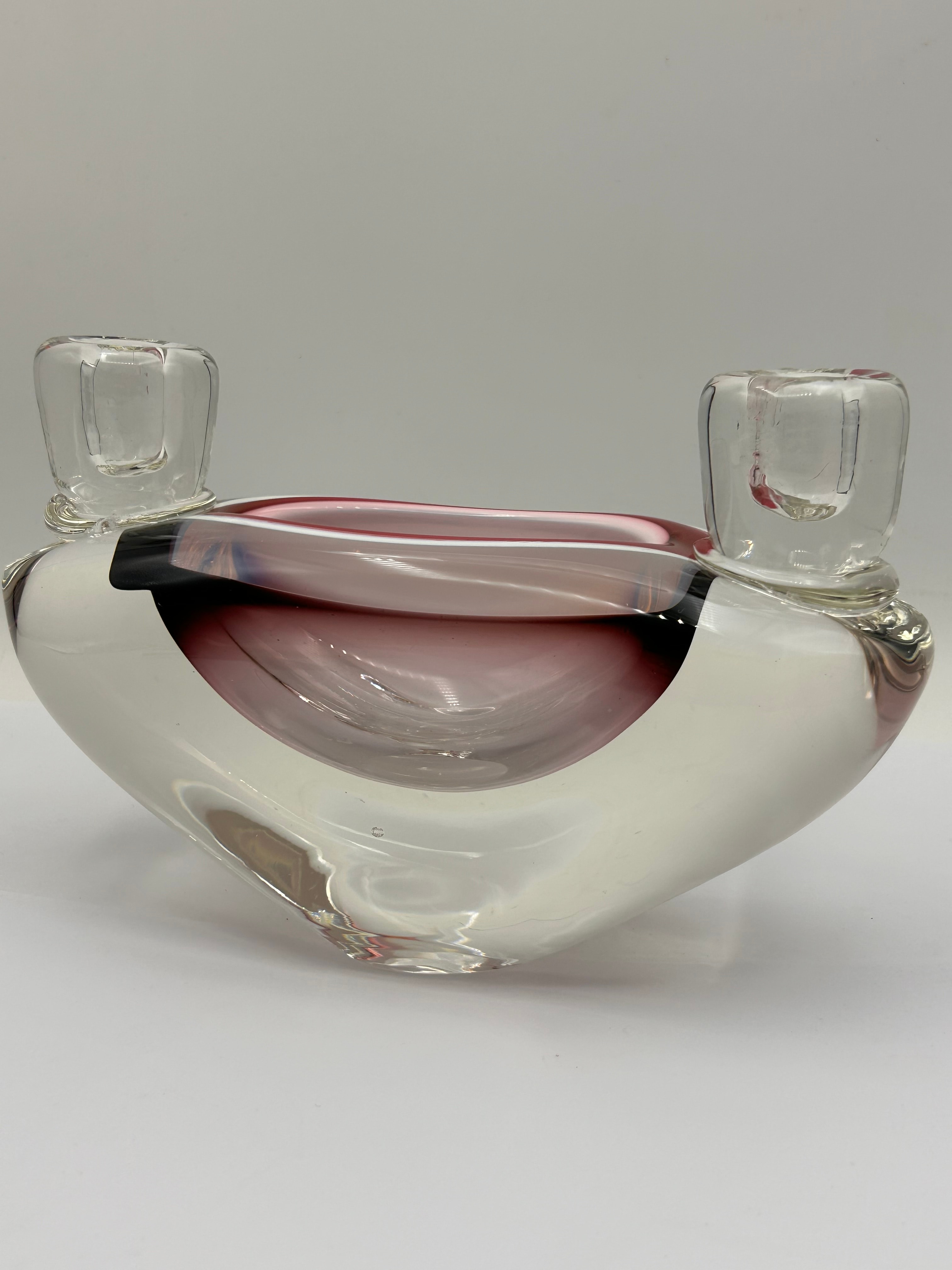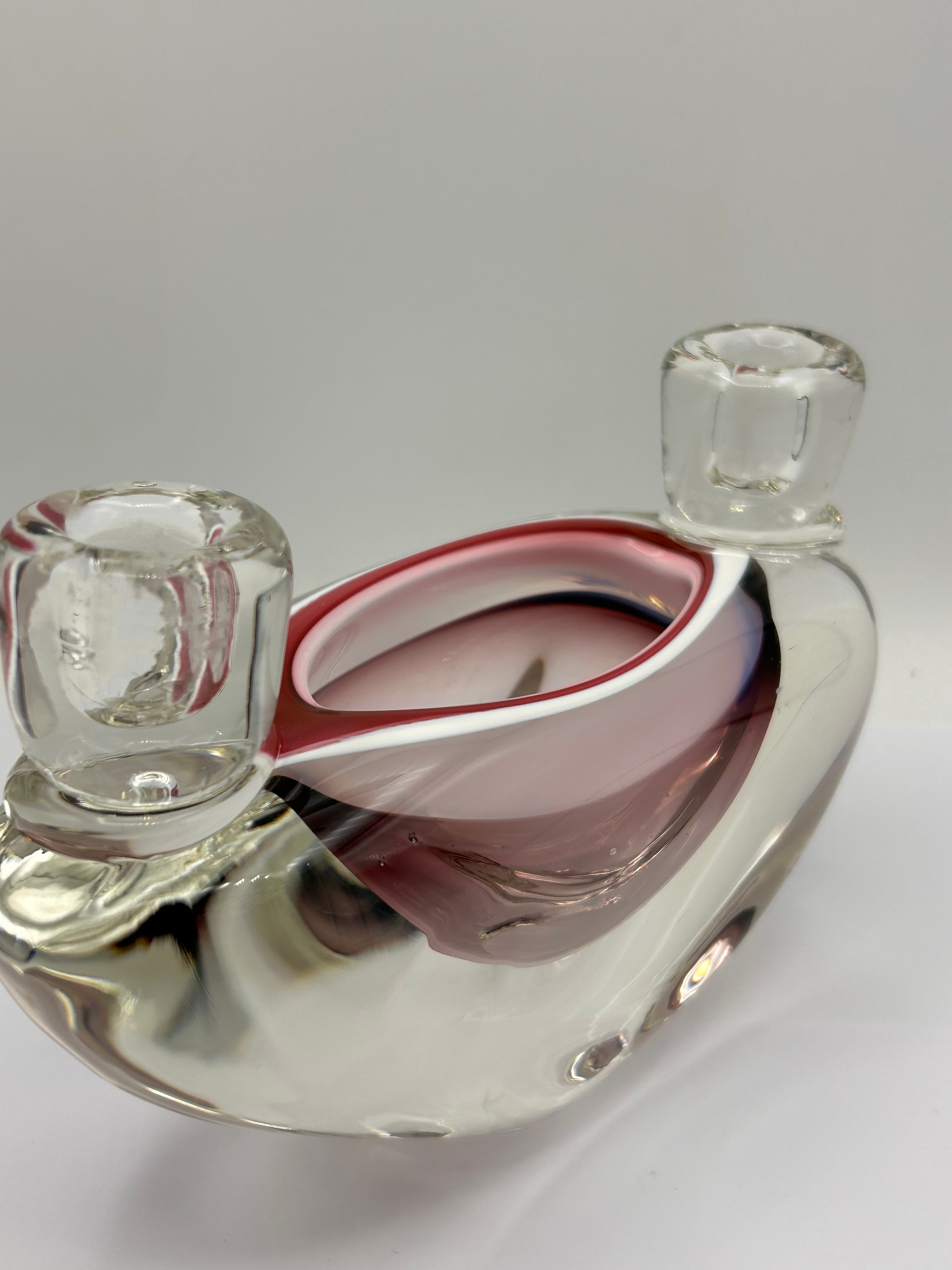 An art glass candelabra / centerpiece attributed to Jaroslav Beránek for Skrdlovice, circa 1960s. This sculptural, Modernist glass object features a heavy, clear glass body with an elongated, organic form. Internal decoration consists of swirling layers of opaque white, light pink/mauve, dark reddish-purple, and black glass. Two integrated, clear glass receptacles for candles are positioned at either end. Lacking any discernible manufacturer’s marks or text.