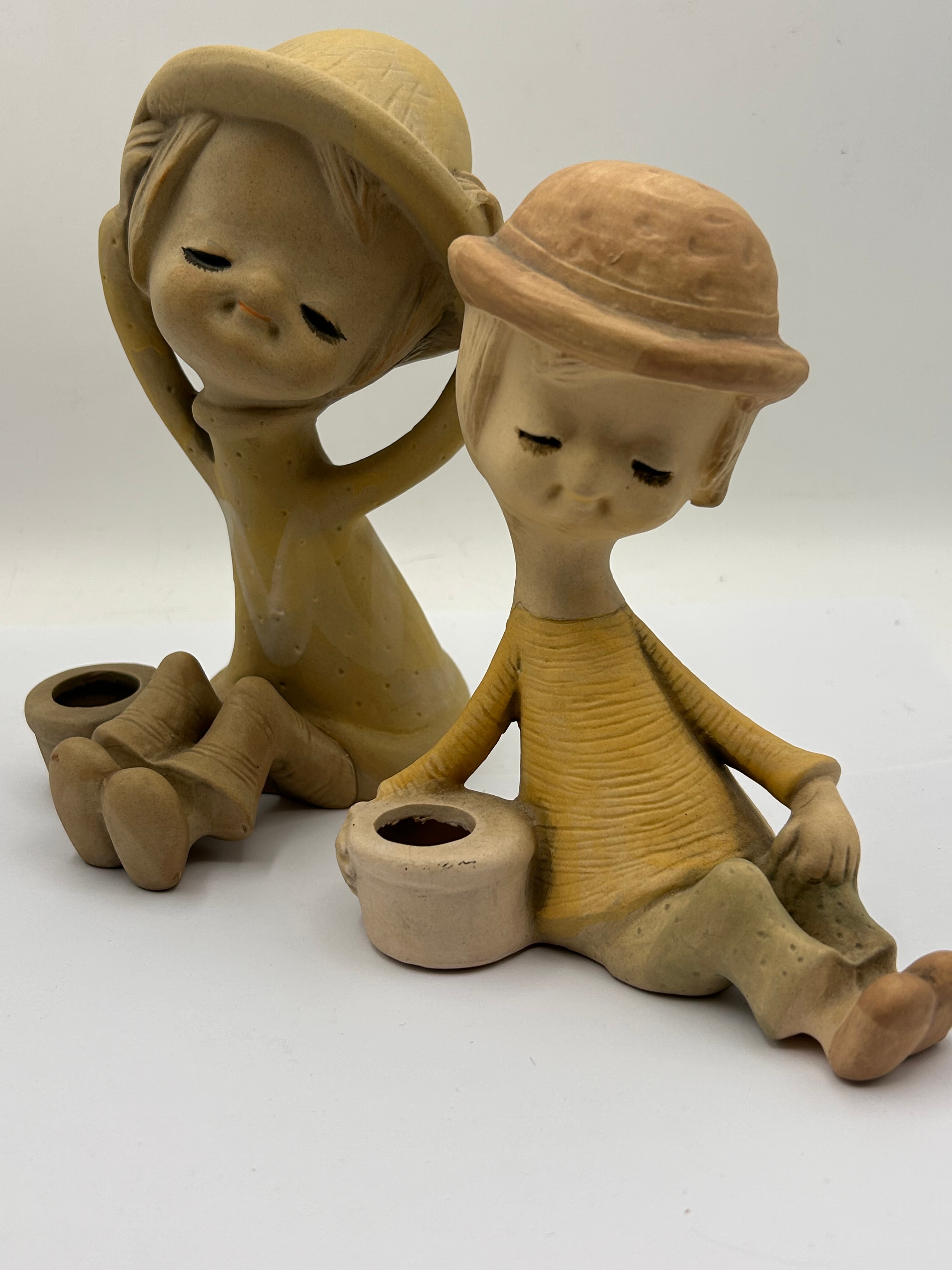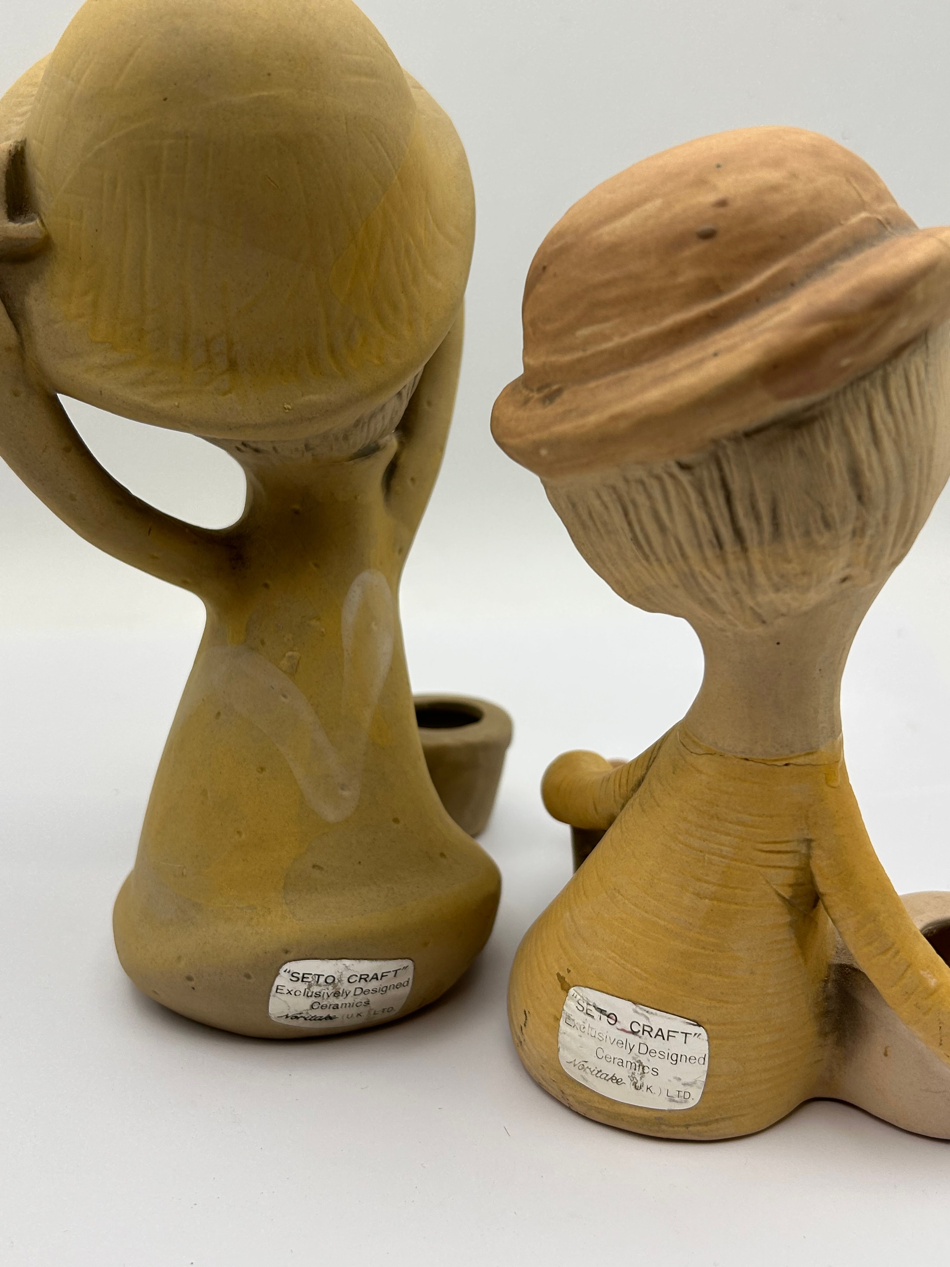 A pair of UCTCI Japan Poppet figurines, mid-20th century stylized ceramic figures, likely functioning as candle holders, crafted from unglazed or matte-glazed bisque ware in earthy tones. The whimsical figures depict children with minimalist features and closed eyes; one stands with hands behind its head, while the other is seated with a small cylindrical holder. Both pieces bear identical white rectangular labels on their backs, marked “SETO-CRAFT” Exclusively Designed Ceramics for A. B. Vesterlid UK LTD.