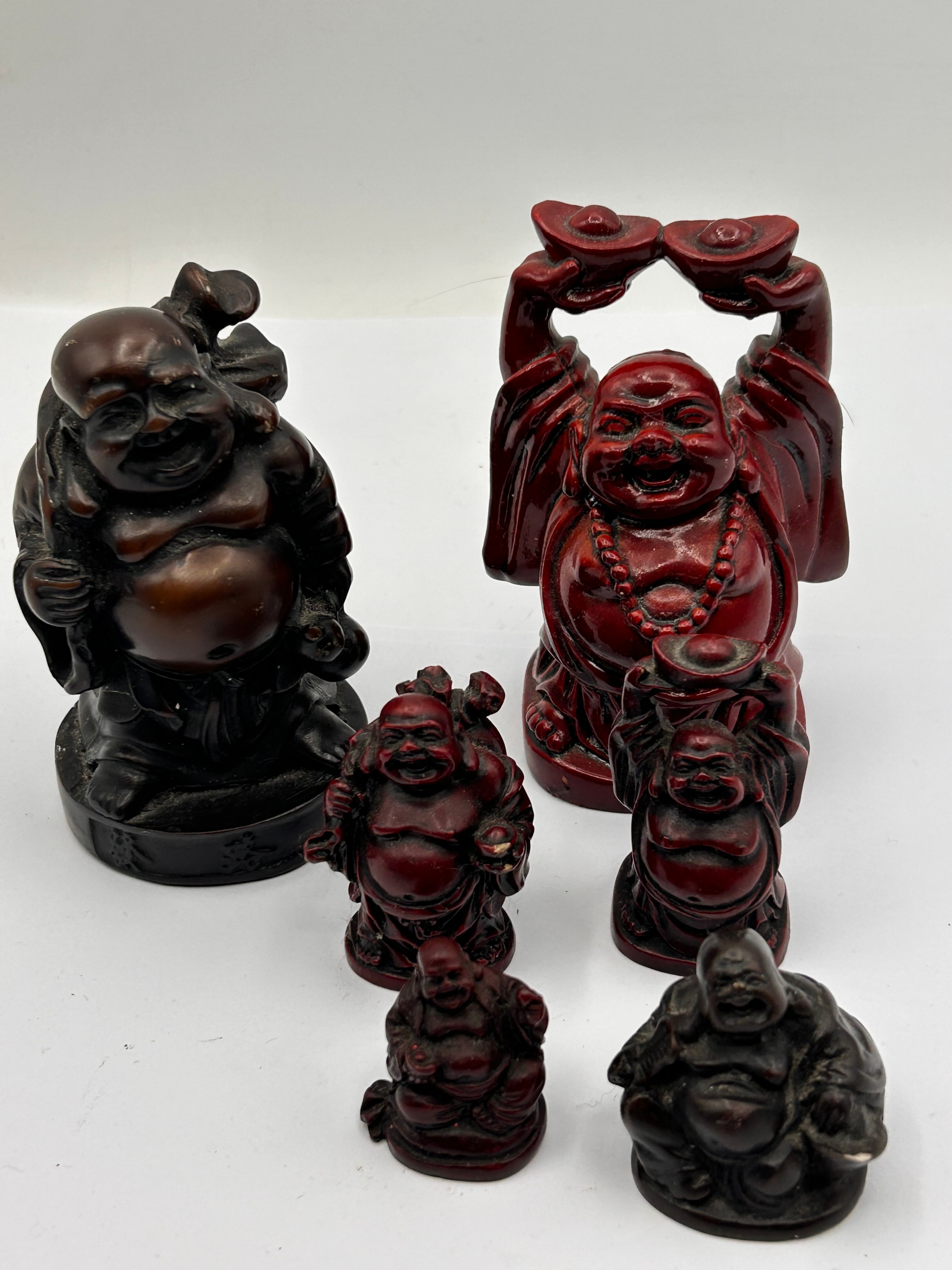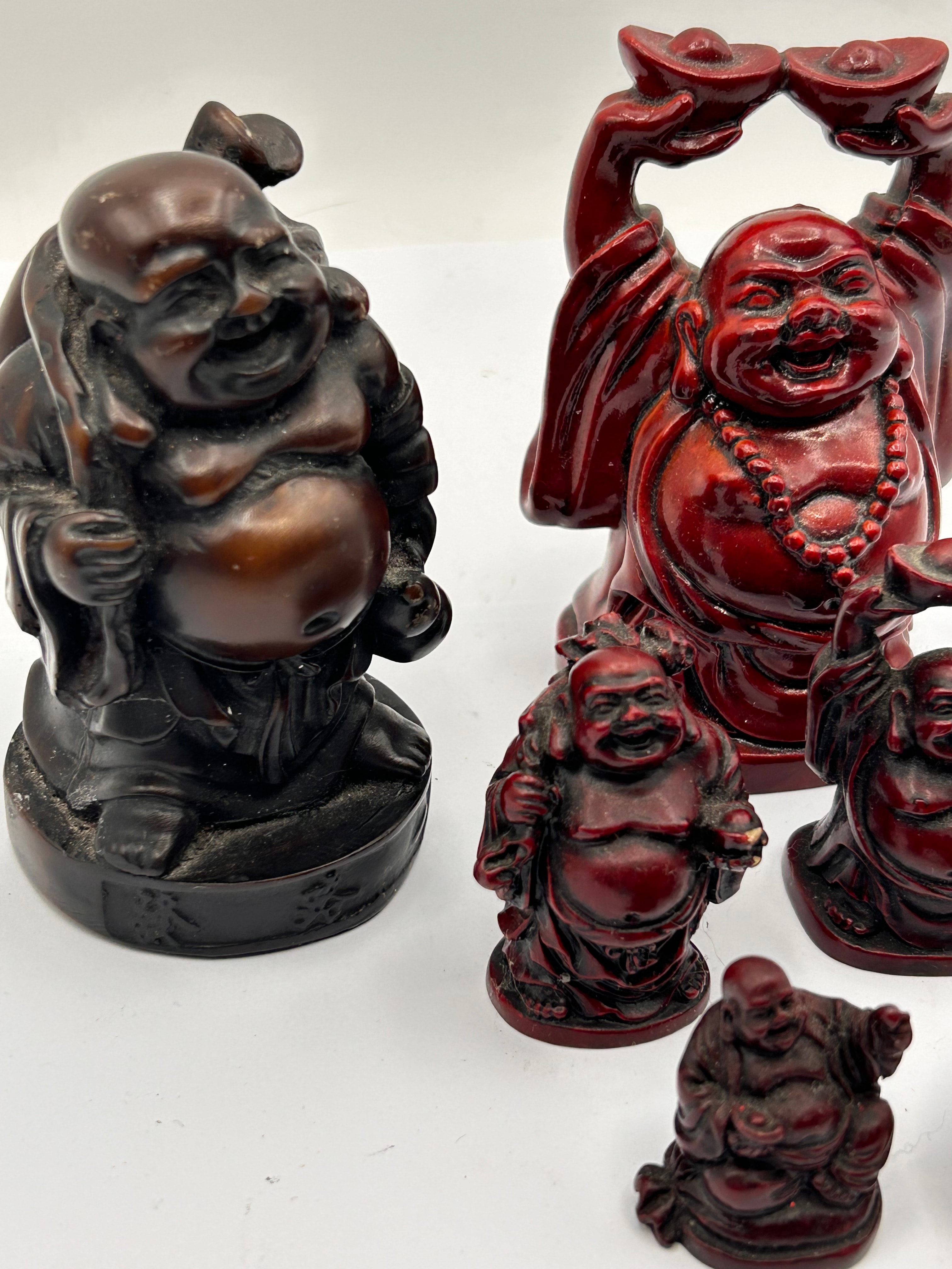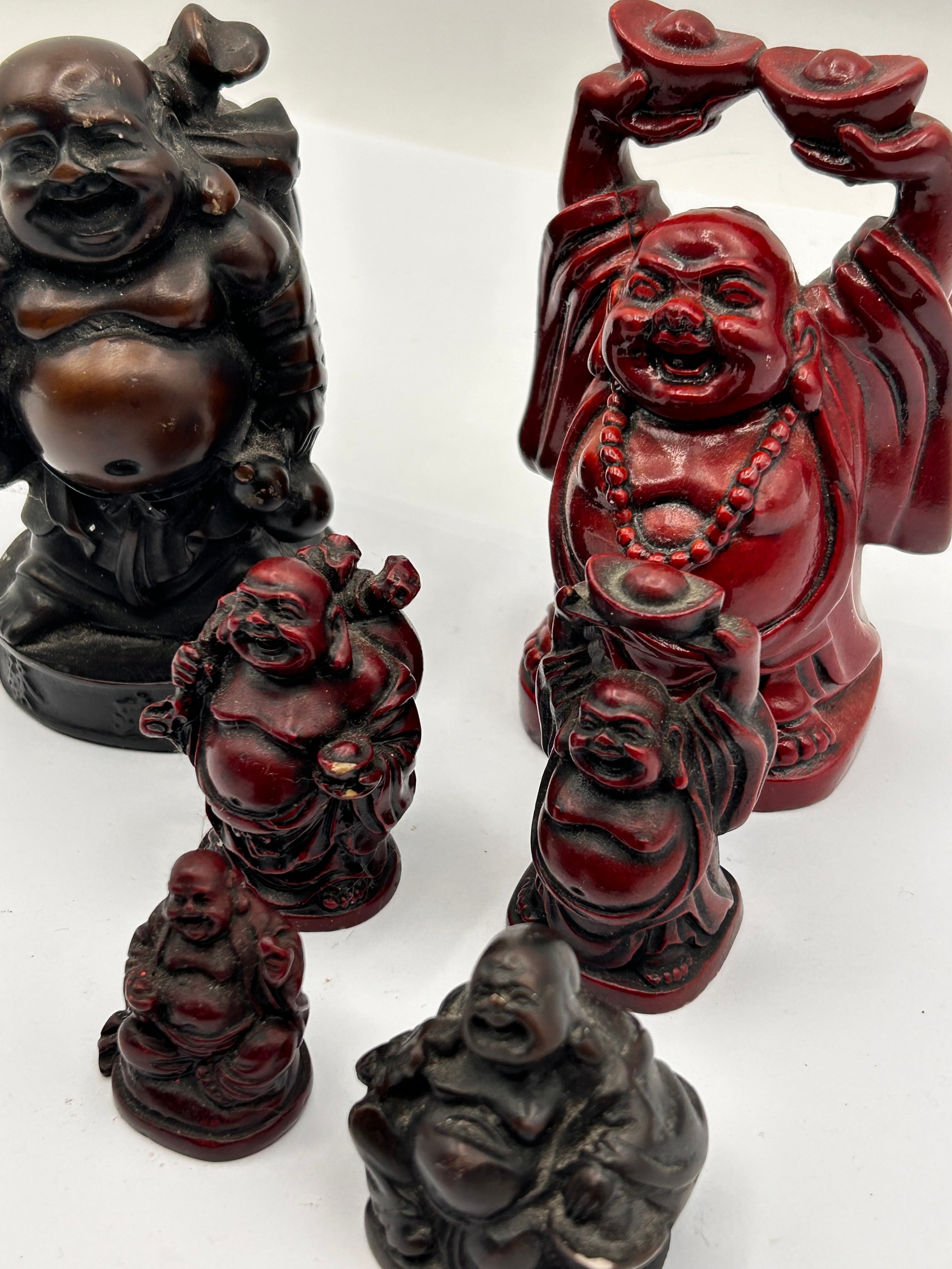 A set of six polychrome resin figurines, depicting the iconic stout, smiling figure commonly known as the Laughing Buddha or Hotei. The collection comprises one larger dark brown figure, likely resin or composite, with embossed stylized characters or decorative patterns around its circular base. The remaining five figures are crafted from a glossy, deep red resin or similar molded plastic; the largest red figure holds two ingots aloft, while another holds a single ingot. All pieces vary in size and are consistent with contemporary decorative items.