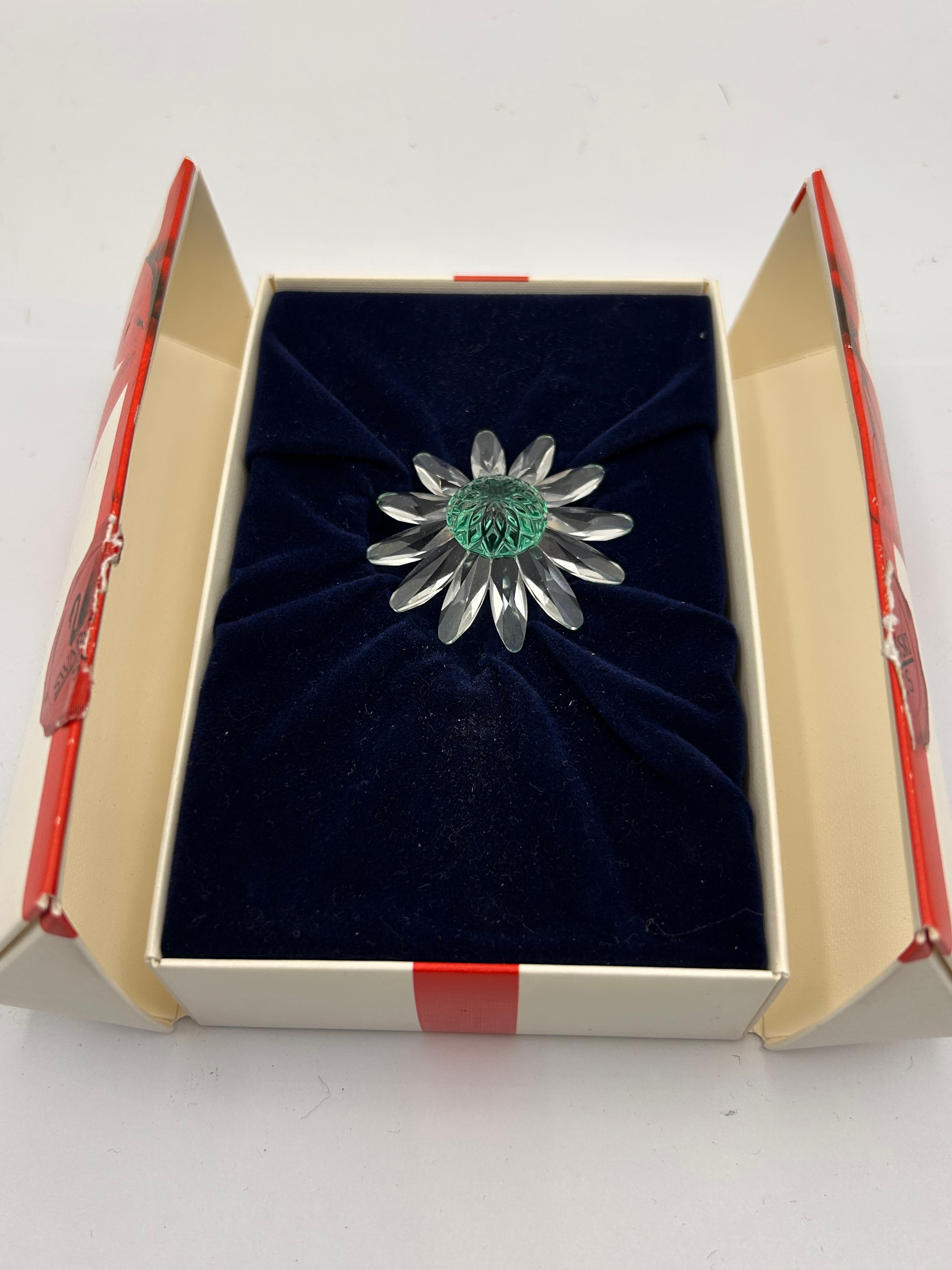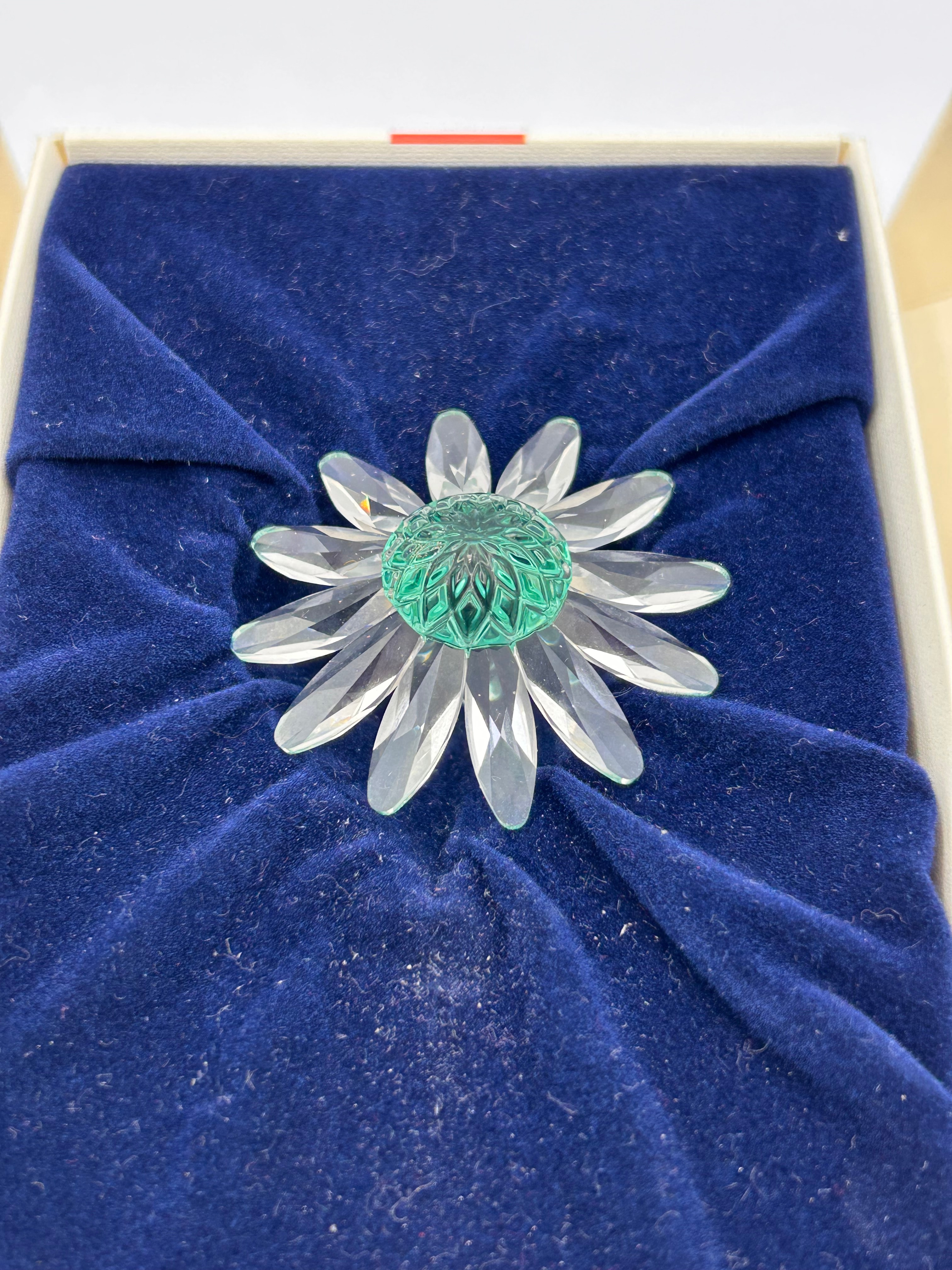 A Swarovski Crystal Marguerite Daisy Flower, model number 227537, originally issued in 2001 as part of the SCS (Swarovski Crystal Society) renewal gift. The item features multiple clear, faceted crystal petals arranged around a central, rounded, faceted teal-green crystal element, forming a daisy-like design. It is presented within its original open, rectangular white gift box with a navy blue velvet interior lining.