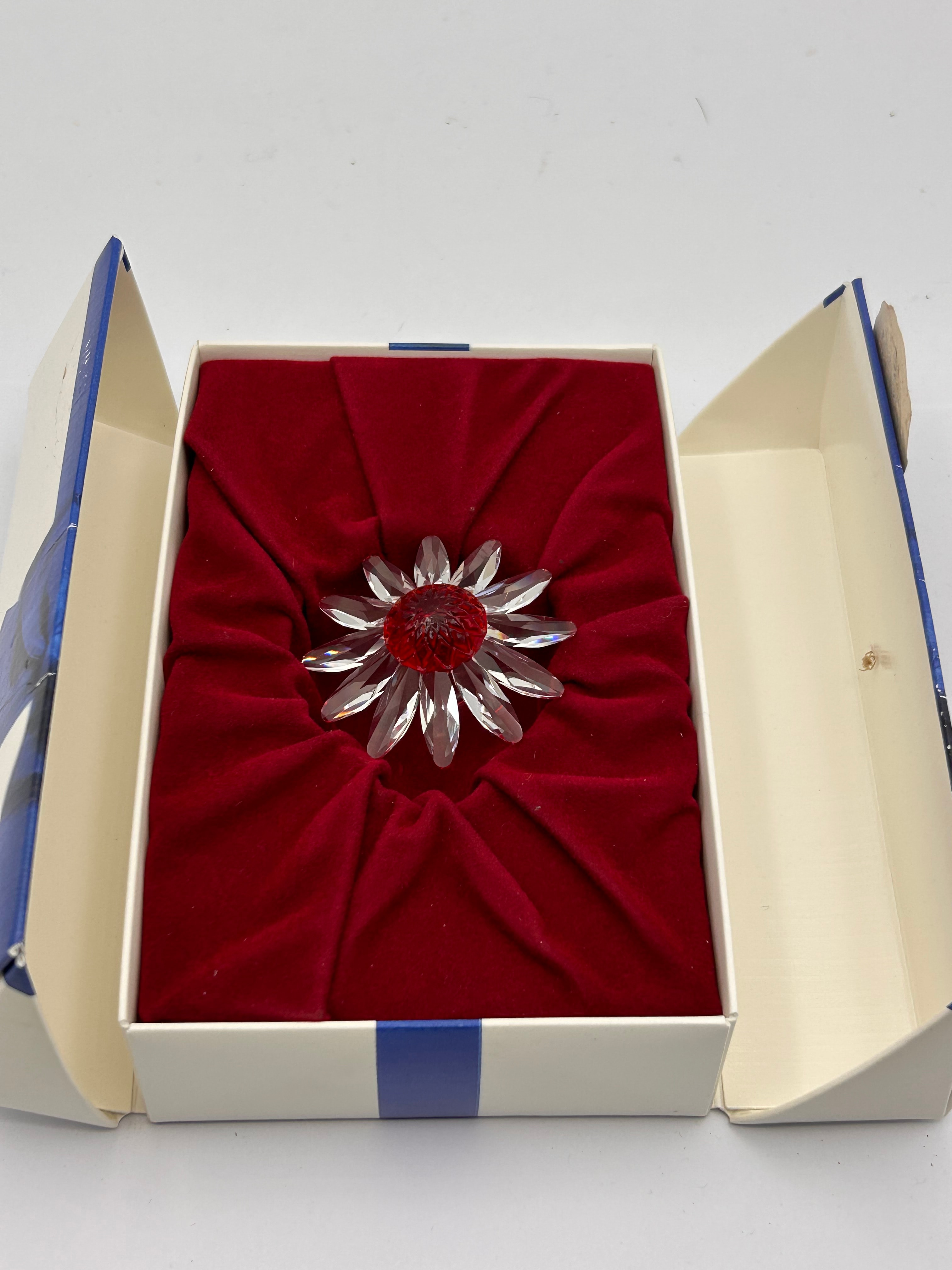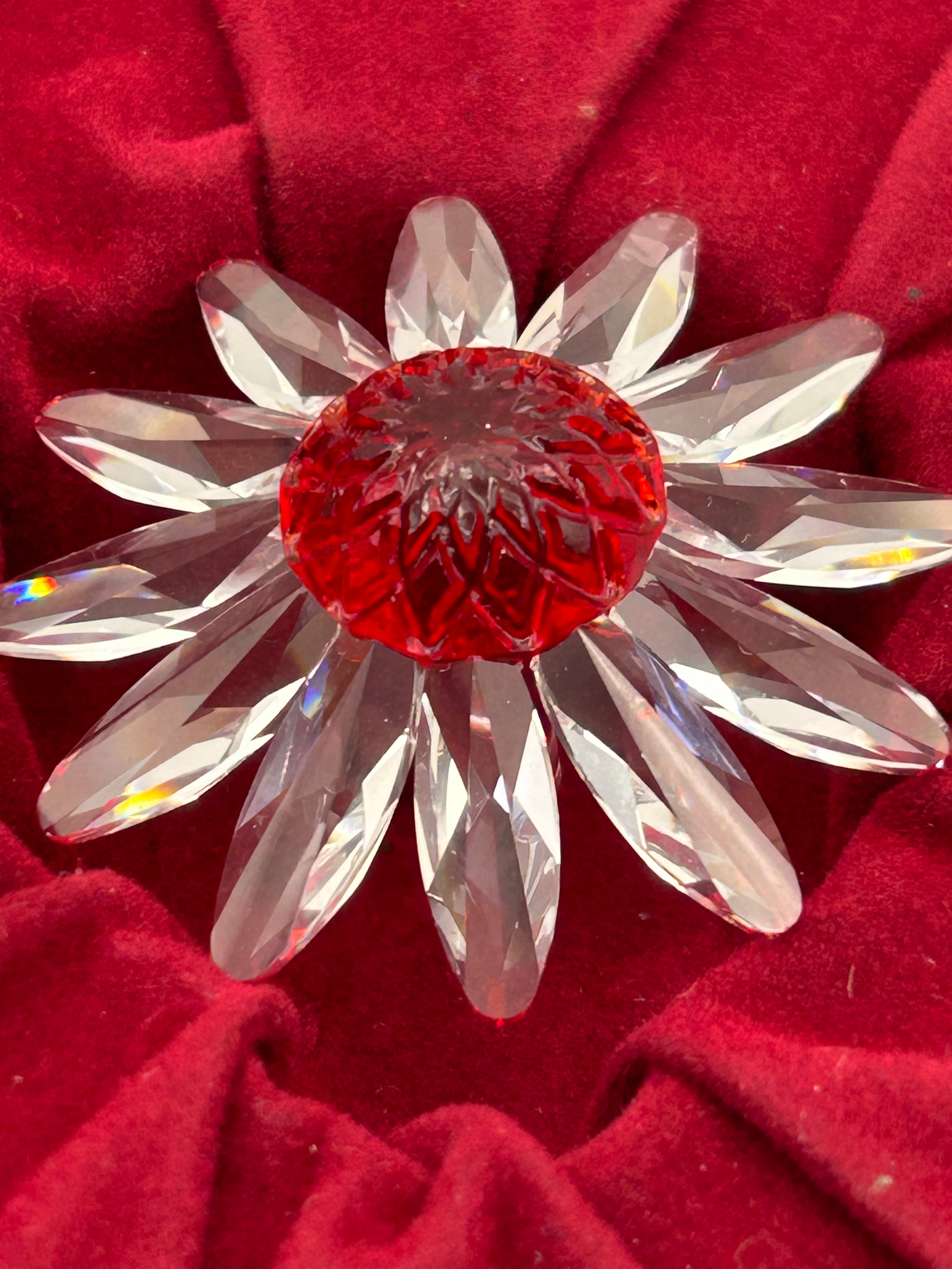A Swarovski Red Marguerite Flower, model 252371, often associated with the 2000 SCS (Swarovski Crystal Society) Renewal Gift. This modern decorative faceted flower is crafted from clear and red crystal, featuring multiple clear, pointed petals radiating from a central round, deeply faceted red element. It is presented in a fitted white cardboard box with a blue accent stripe and a plush red velvet interior lining. No discernable manufacturer markings or text are visible on either the item or its packaging.
