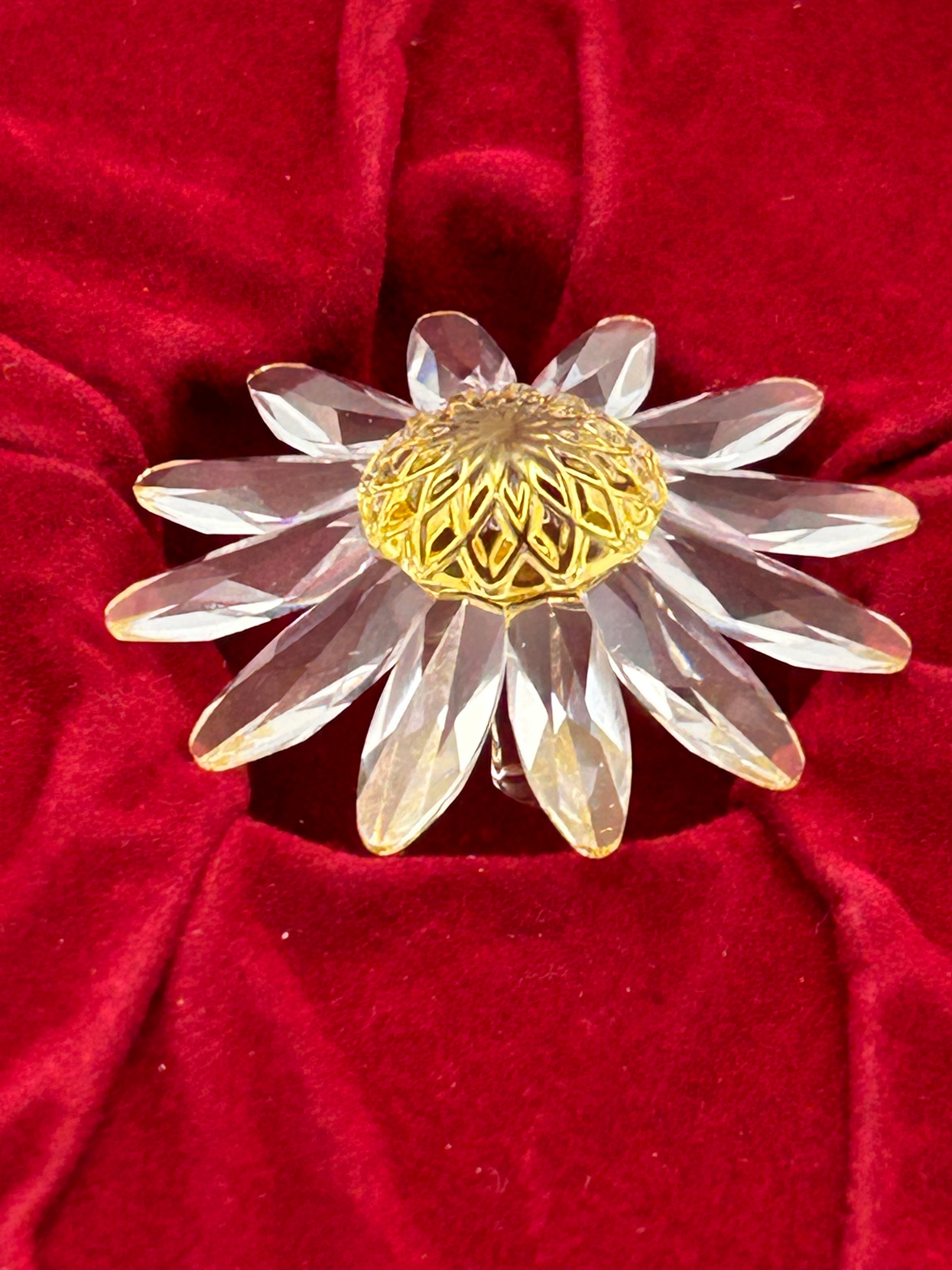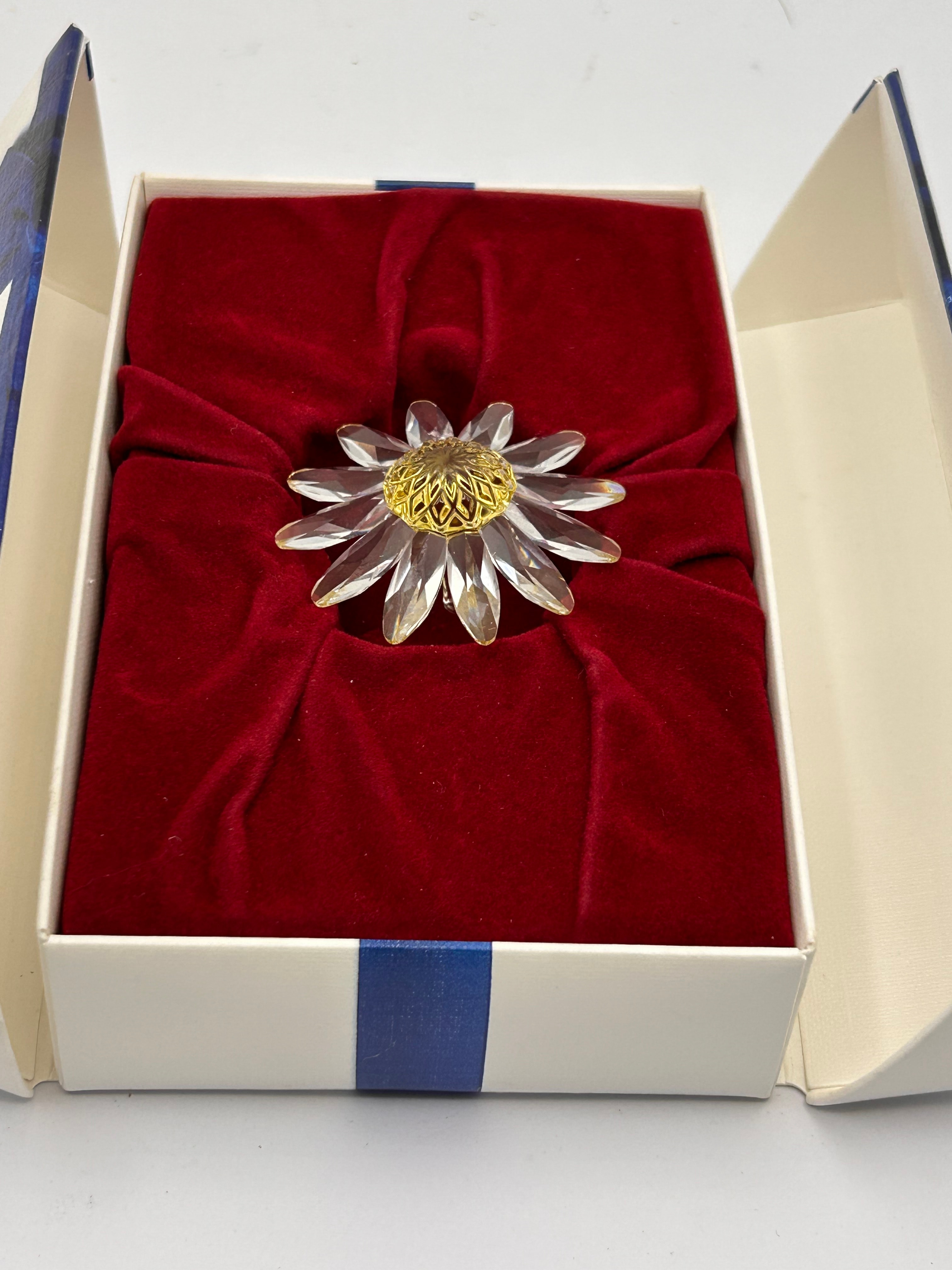 A Swarovski Crystal ‘Yellow Marguerite Daisy’ flower figurine. The piece features clear, faceted crystal petals and a gold-toned metal central disc with an intricate openwork design. It is presented in its original white cardboard gift box with a blue stripe detail and a fitted, pleated red velvet-like lining. No visible maker’s marks or inscriptions are apparent on the item or visible packaging.