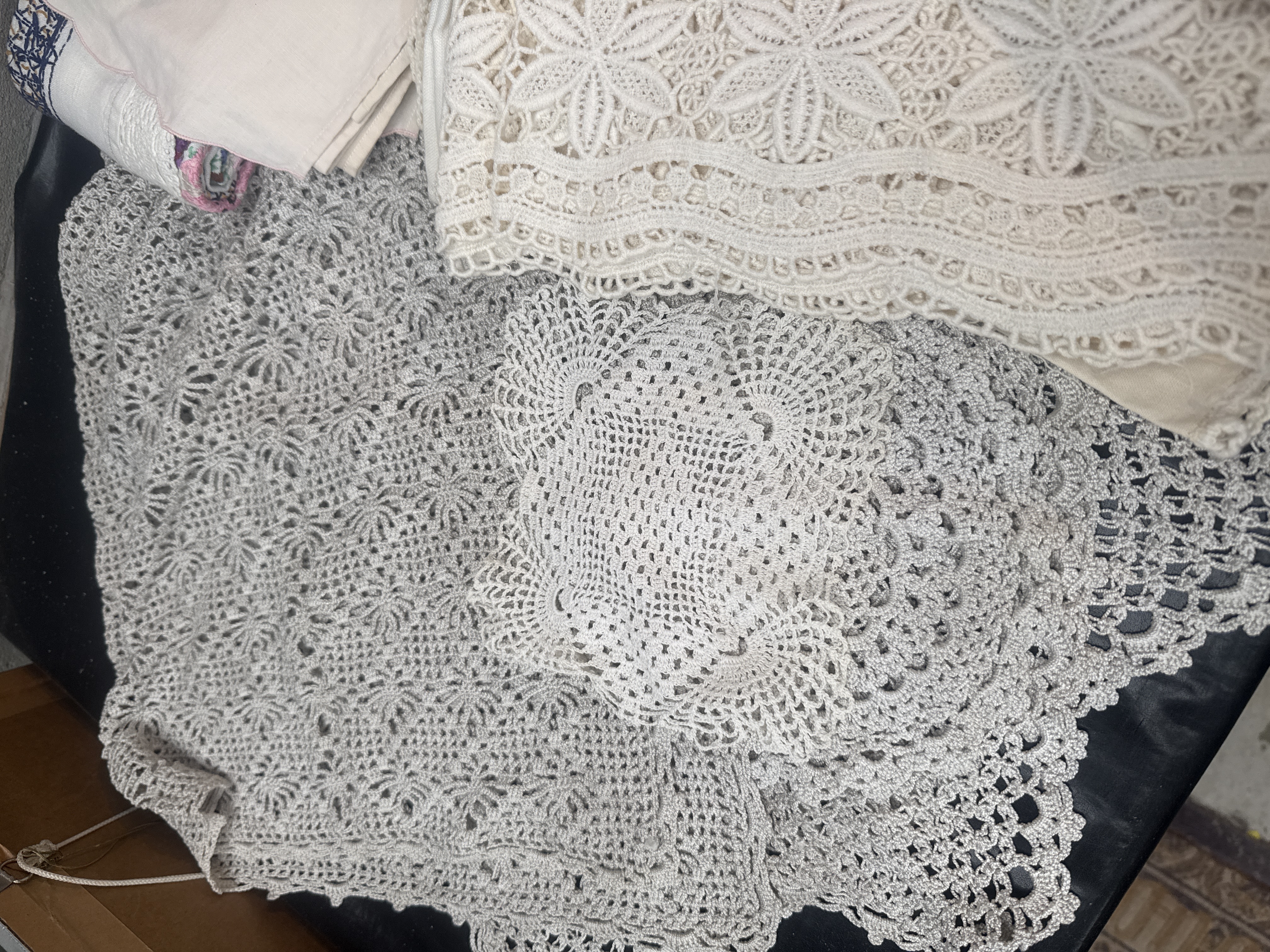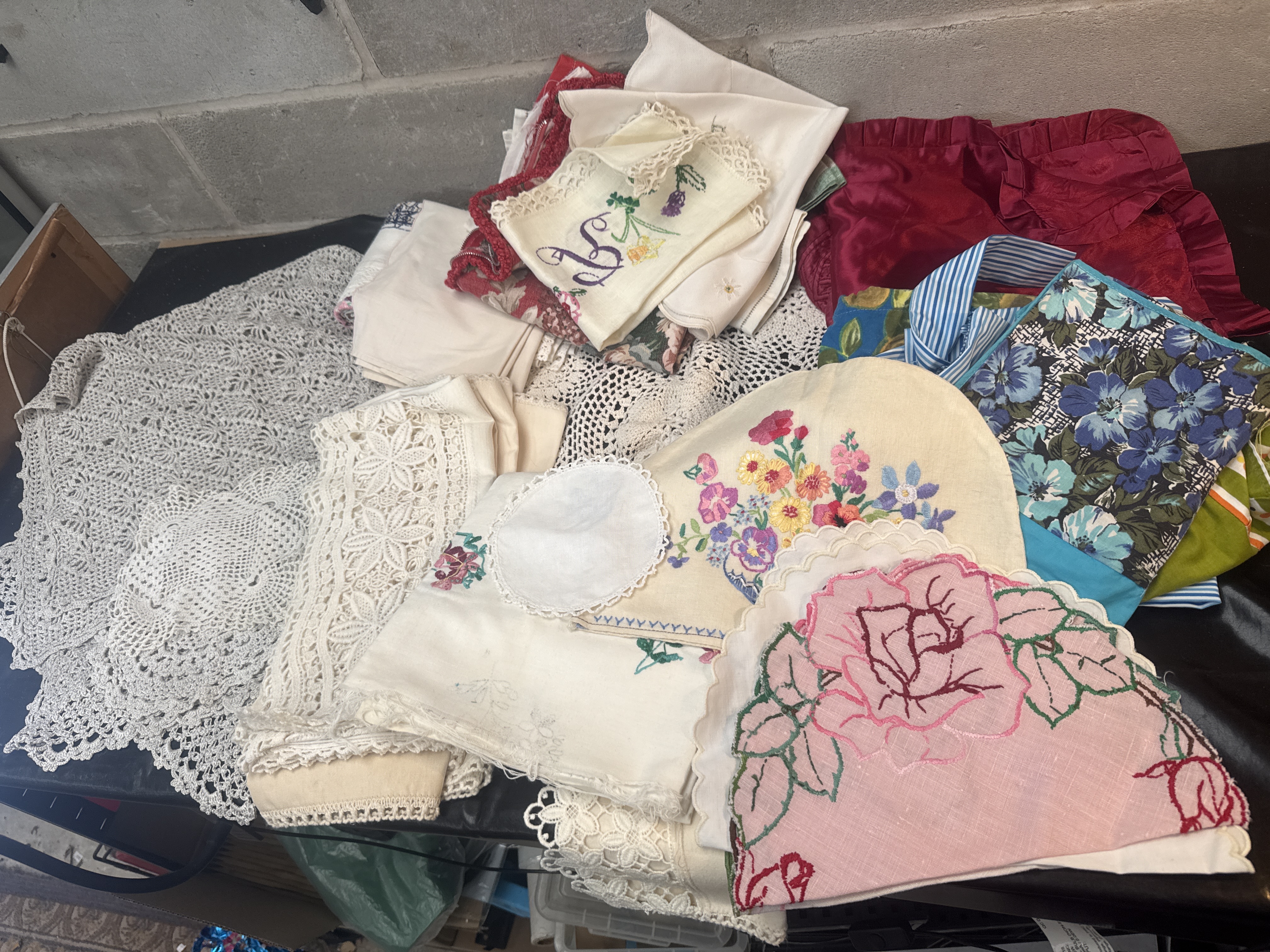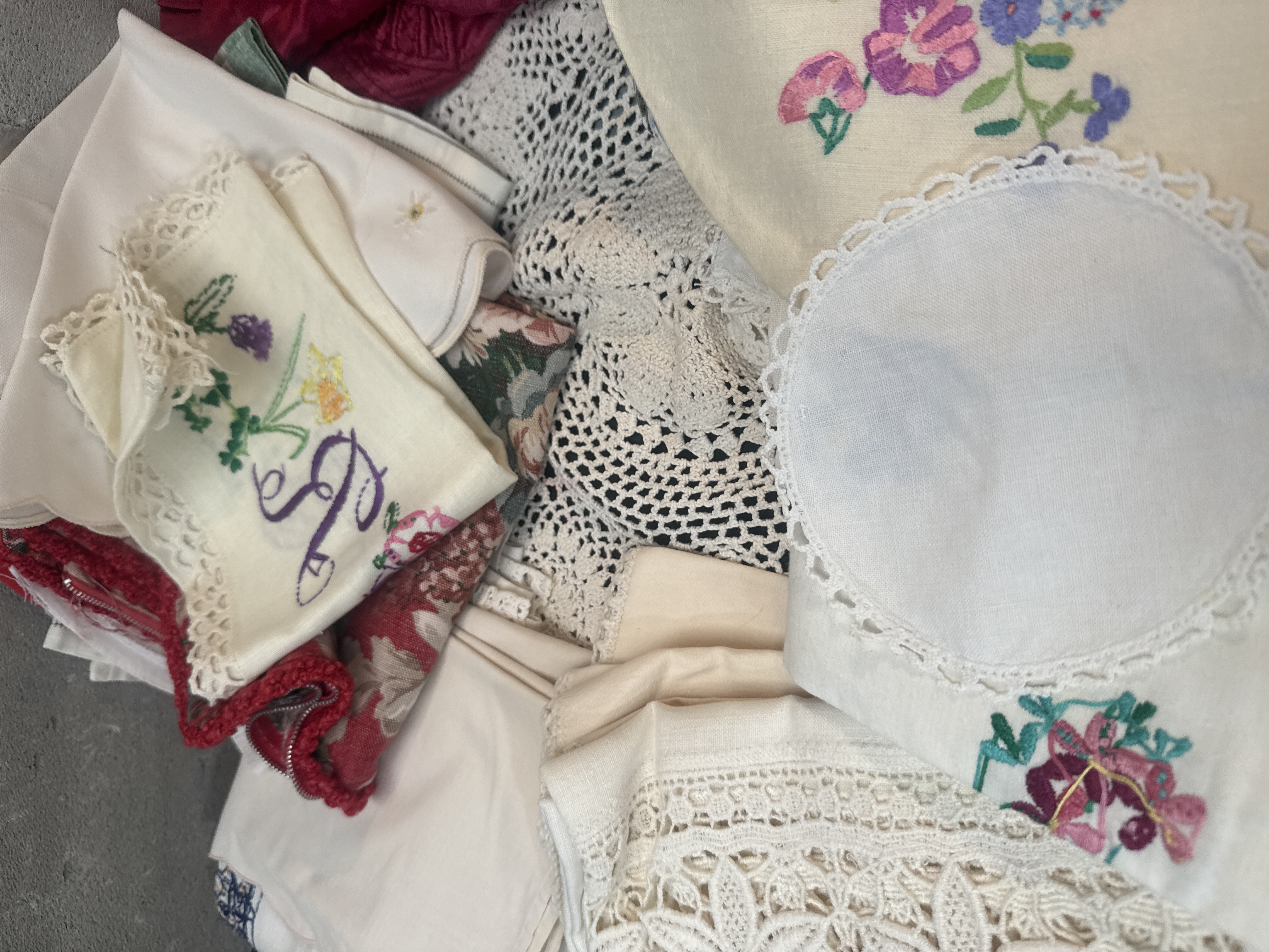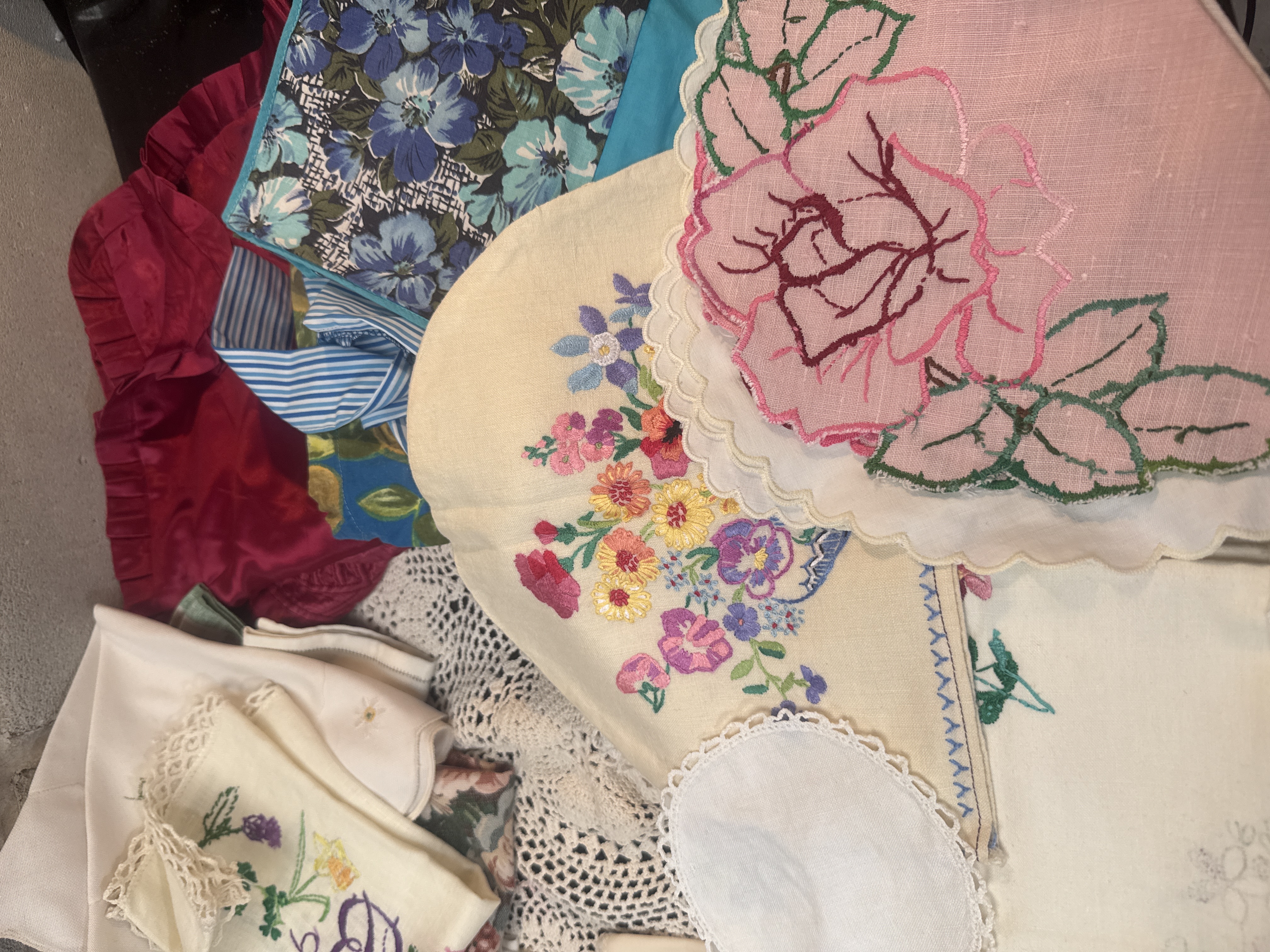 A collection of numerous white and off-white assorted linens, including embroidered handkerchiefs and doilies with colorful floral designs, lace trim, and fabric remnants in red, blue floral, and blue striped patterns.