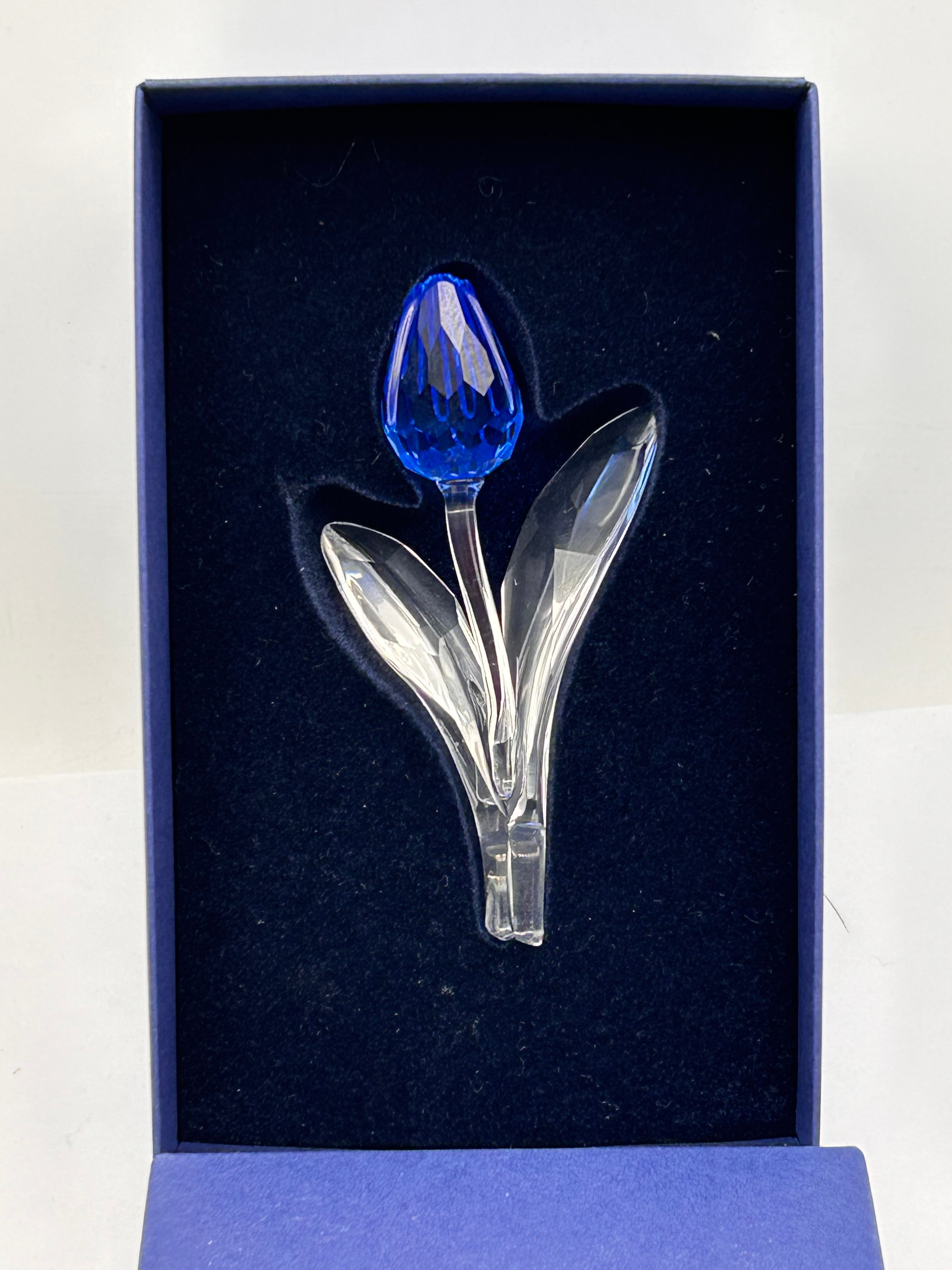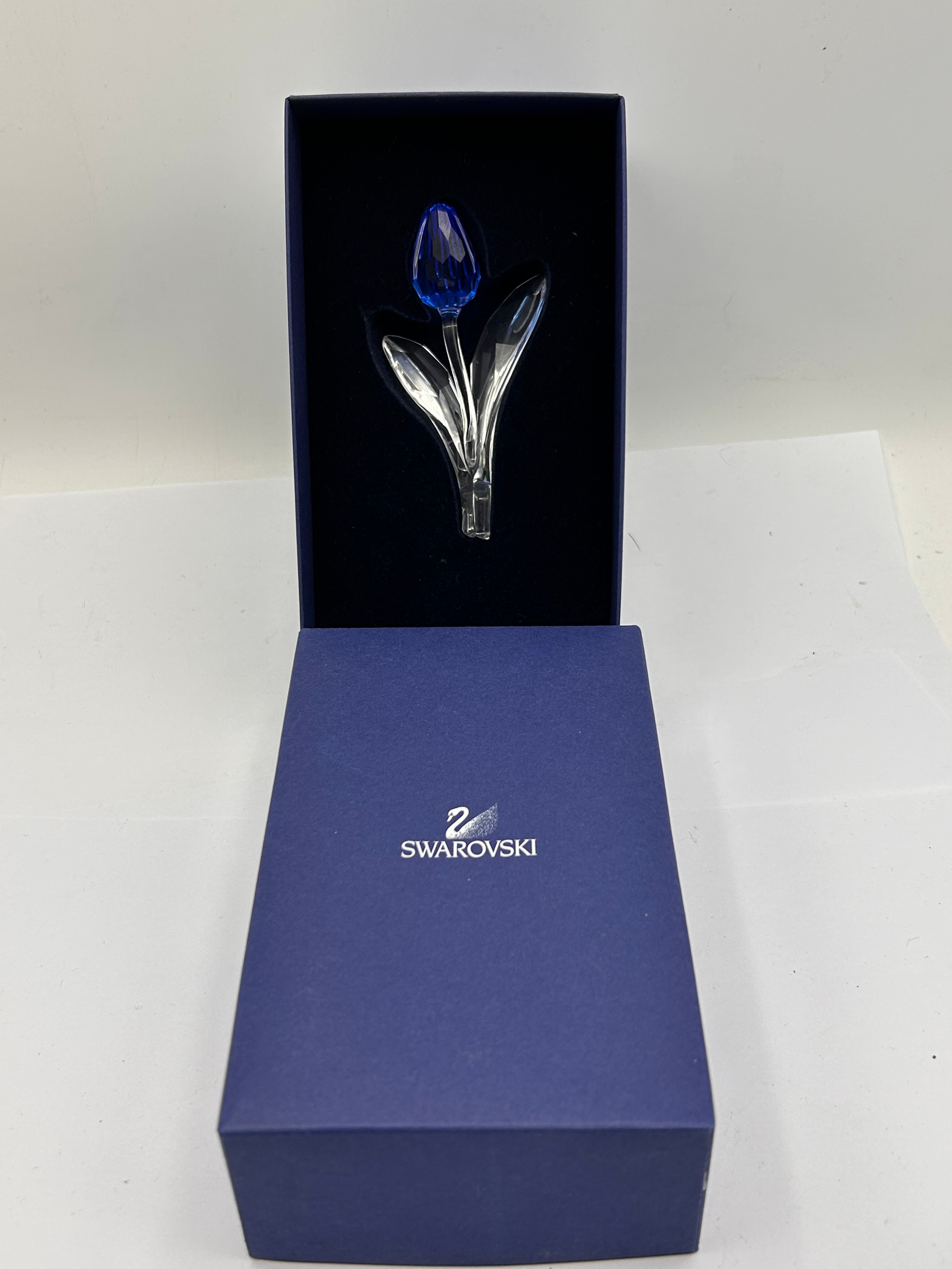 A Swarovski Crystal SCS Blue Tulip figurine, depicting a stylized tulip, featuring a deep blue faceted bloom atop a clear faceted stem and leaves. It is presented within its original dark blue hinged box, lined with a velvet-like material molded to securely hold the piece. The box lid prominently displays the ‘SWAROVSKI’ brand name and its iconic swan logo in silver text.