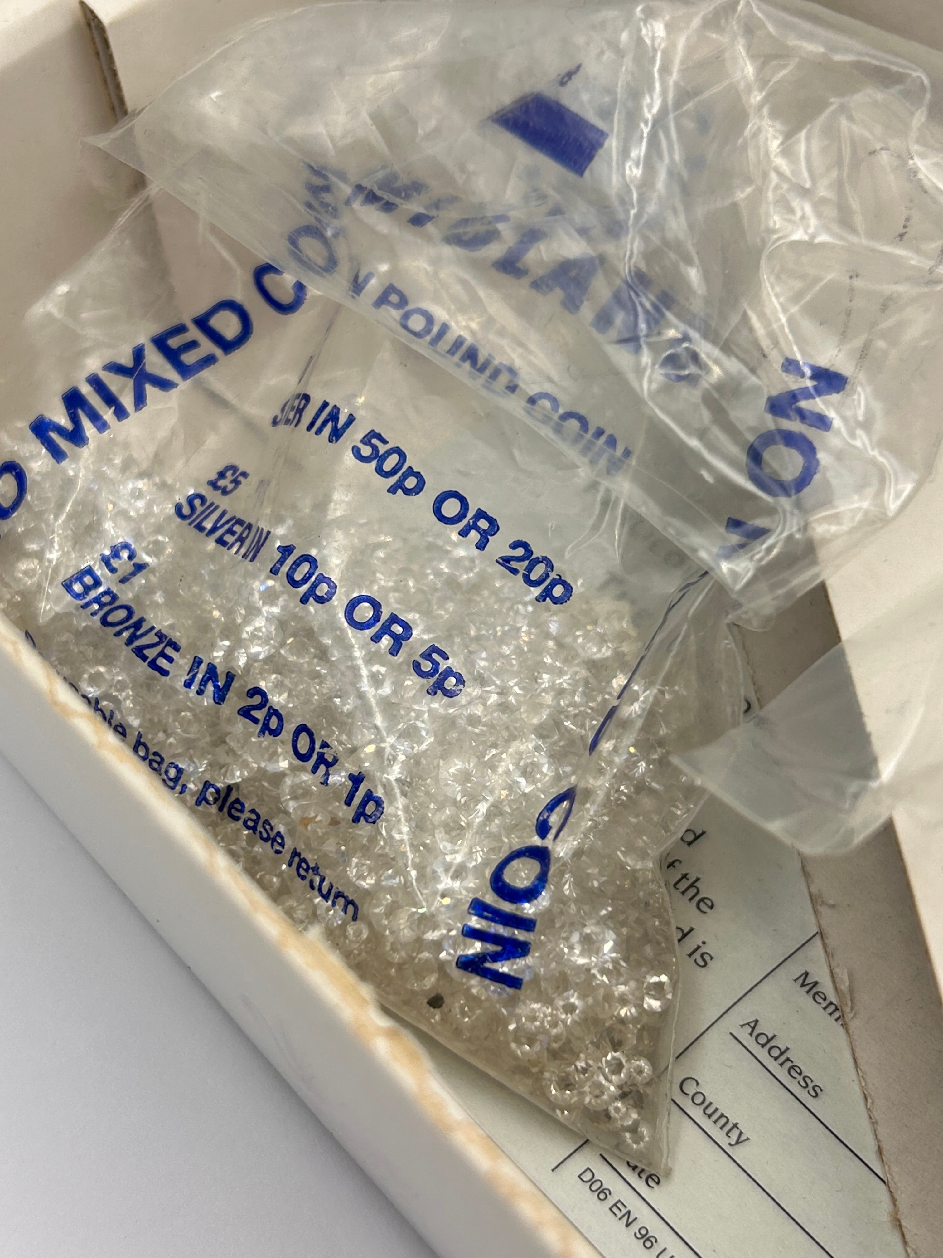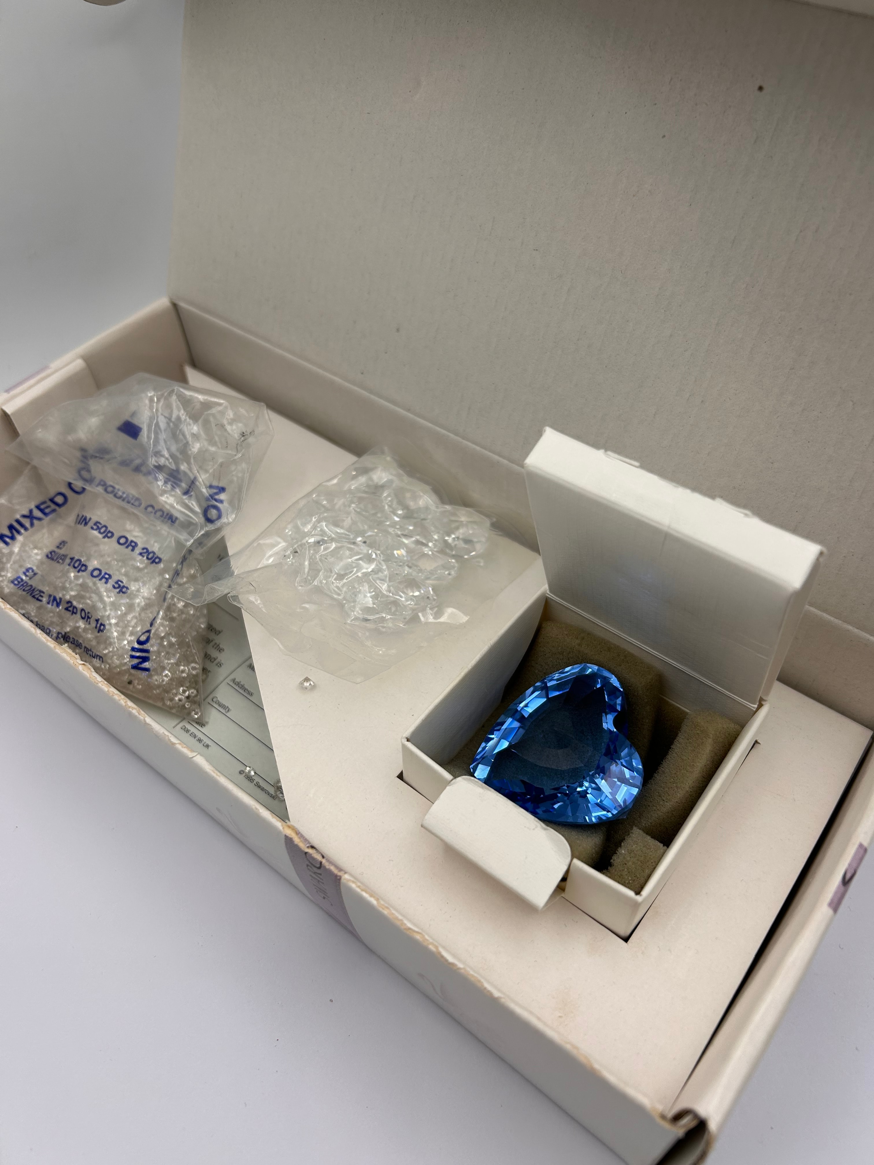 A faceted, heart-shaped object of translucent blue crystal, identified through web intelligence as a Swarovski Crystal Blue Heart Paperweight. It is housed within a smaller, fitted white box with a dark brown insert. The item is presented within an open, plain cardboard outer box. Accompanying the paperweight are a clear plastic bag filled with numerous small, clear, bead-like tokens, explicitly labeled in blue text as “MIXED COIN,” “POUND COIN,” “IN 50p OR 20p,” “SILVER IN 10p OR 5p,” and “BRONZE IN 2p OR 1p,” with a partial instruction “le bag, please return.” A second, seemingly empty clear plastic bag is also present, alongside partially visible paperwork indicating fields such as “Mem,” “Address,” and “County.” The overall presentation suggests a commercial product, possibly a game or educational kit related to currency, with the blue heart serving as a decorative or thematic component.