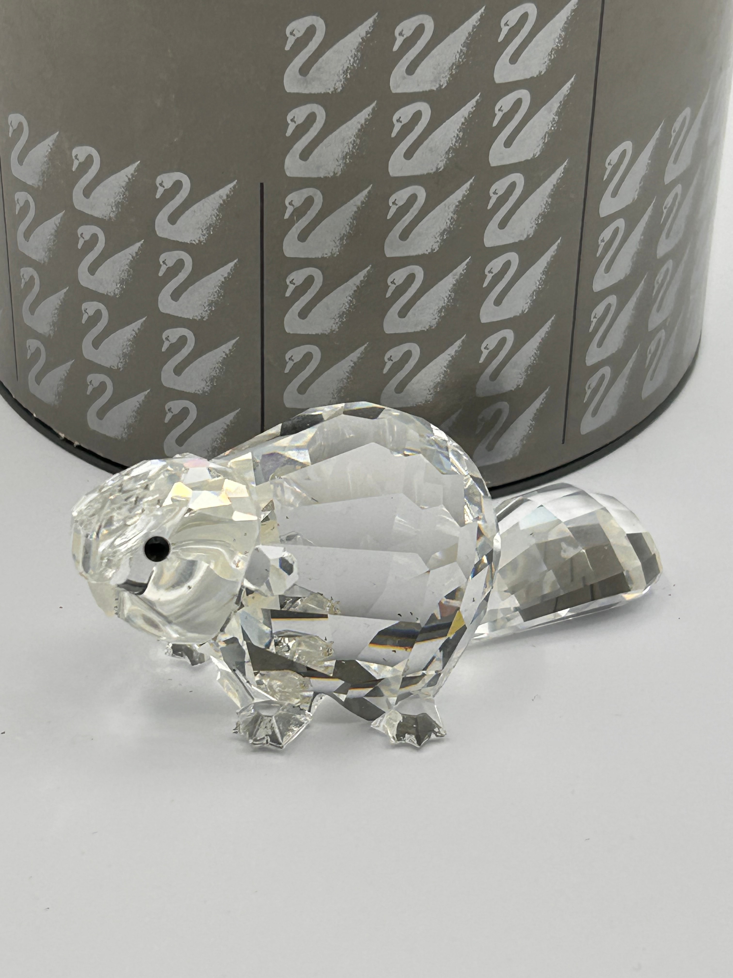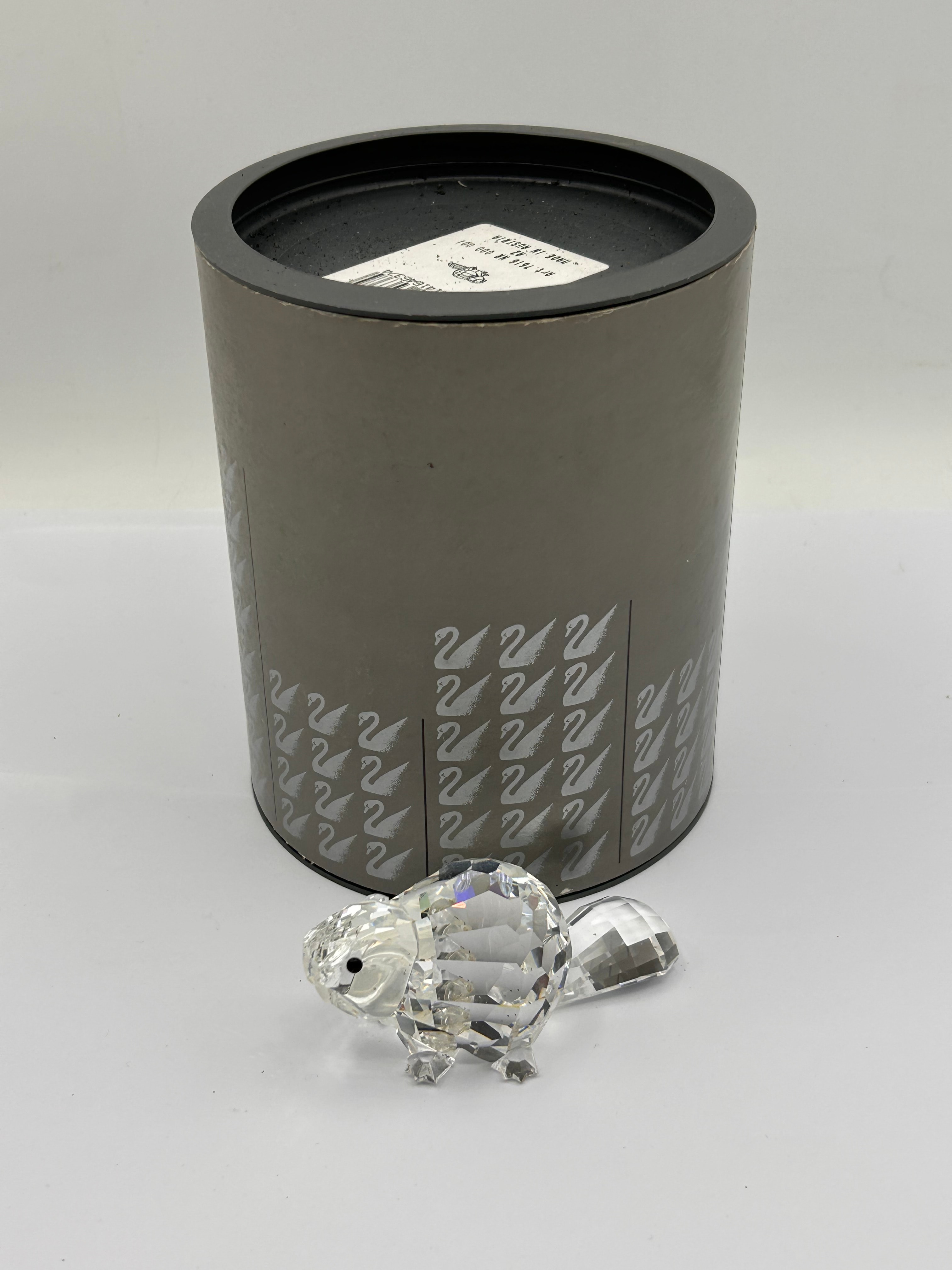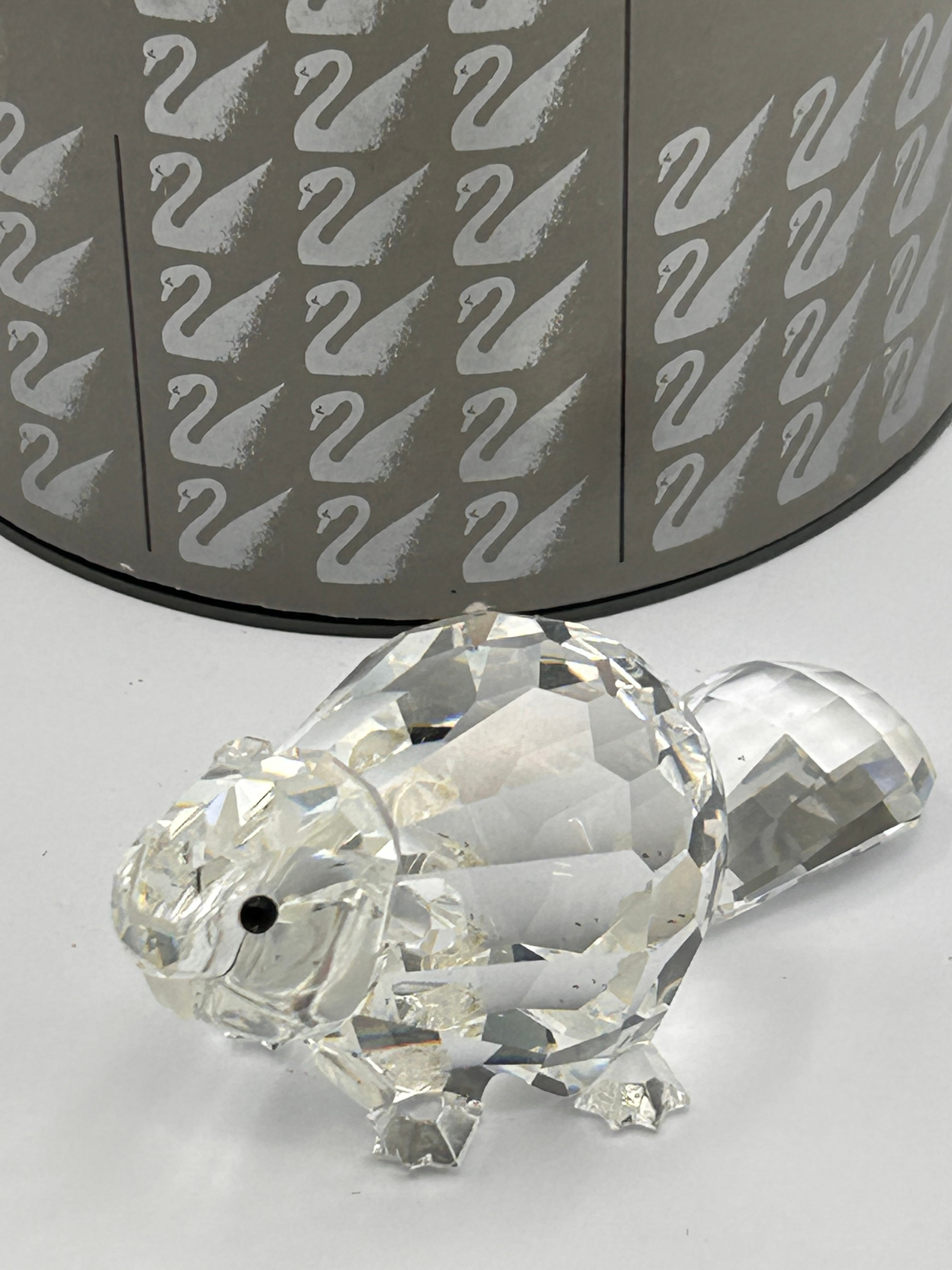 A Swarovski crystal ‘Beaver’ figurine, model number 7666 NR 124 000, dated 1994. This faceted clear crystal figurine depicts a beaver, identifiable by its distinctive body shape, small paws, and paddle-like tail, with applied black dot eyes. It is accompanied by its original grey-brown cylindrical cardboard presentation box, which features a repeating pattern of white swan logos.