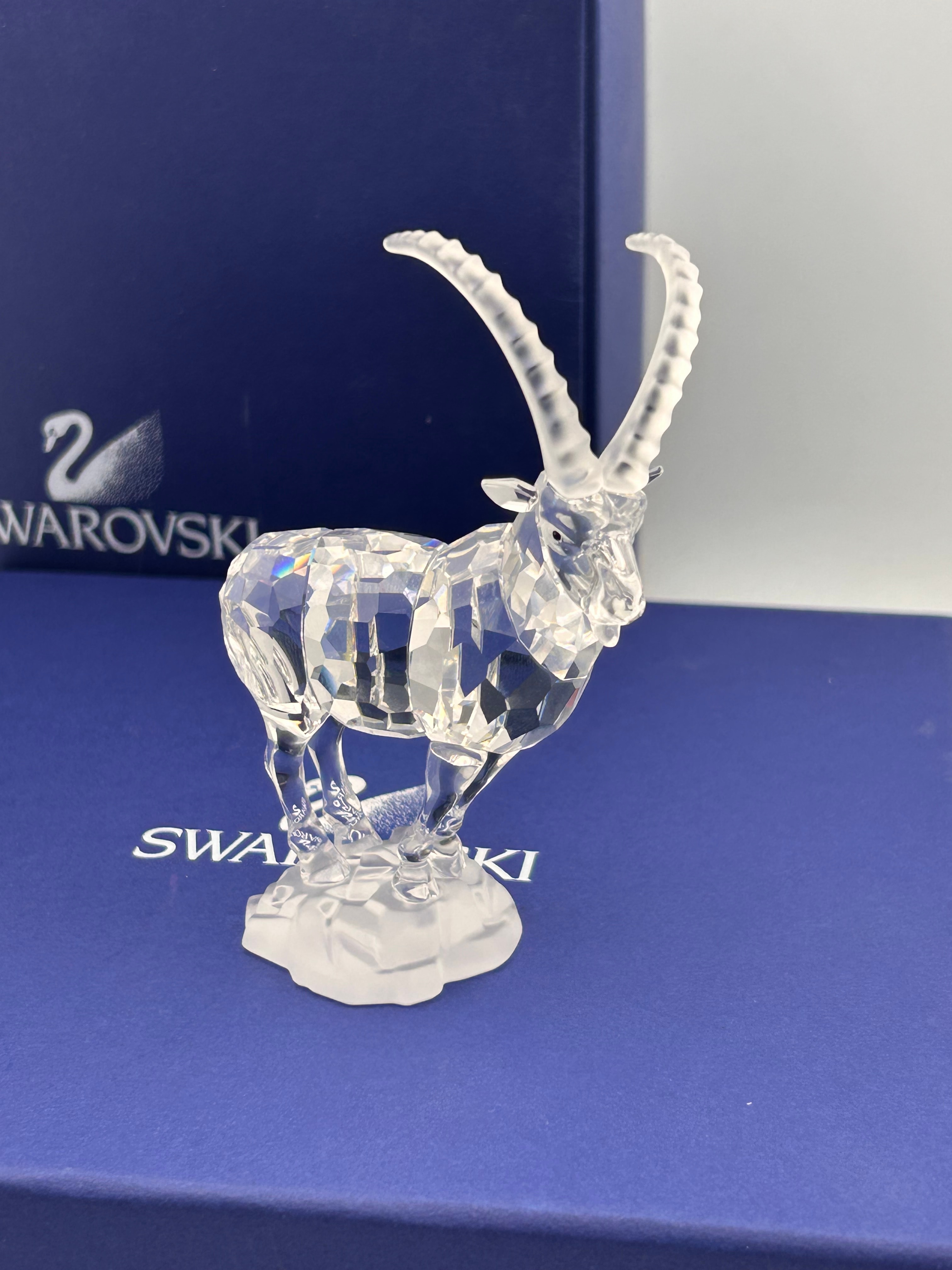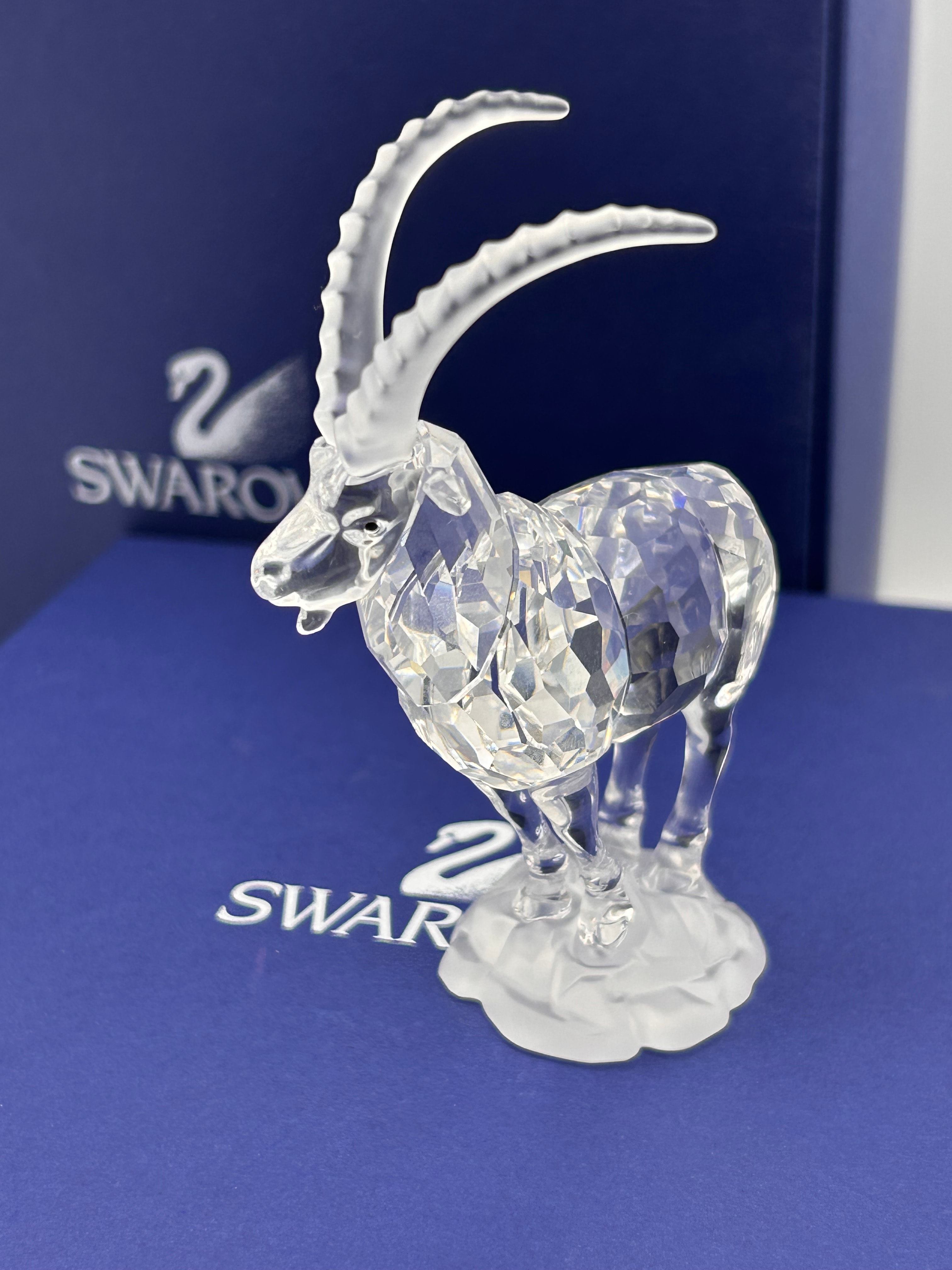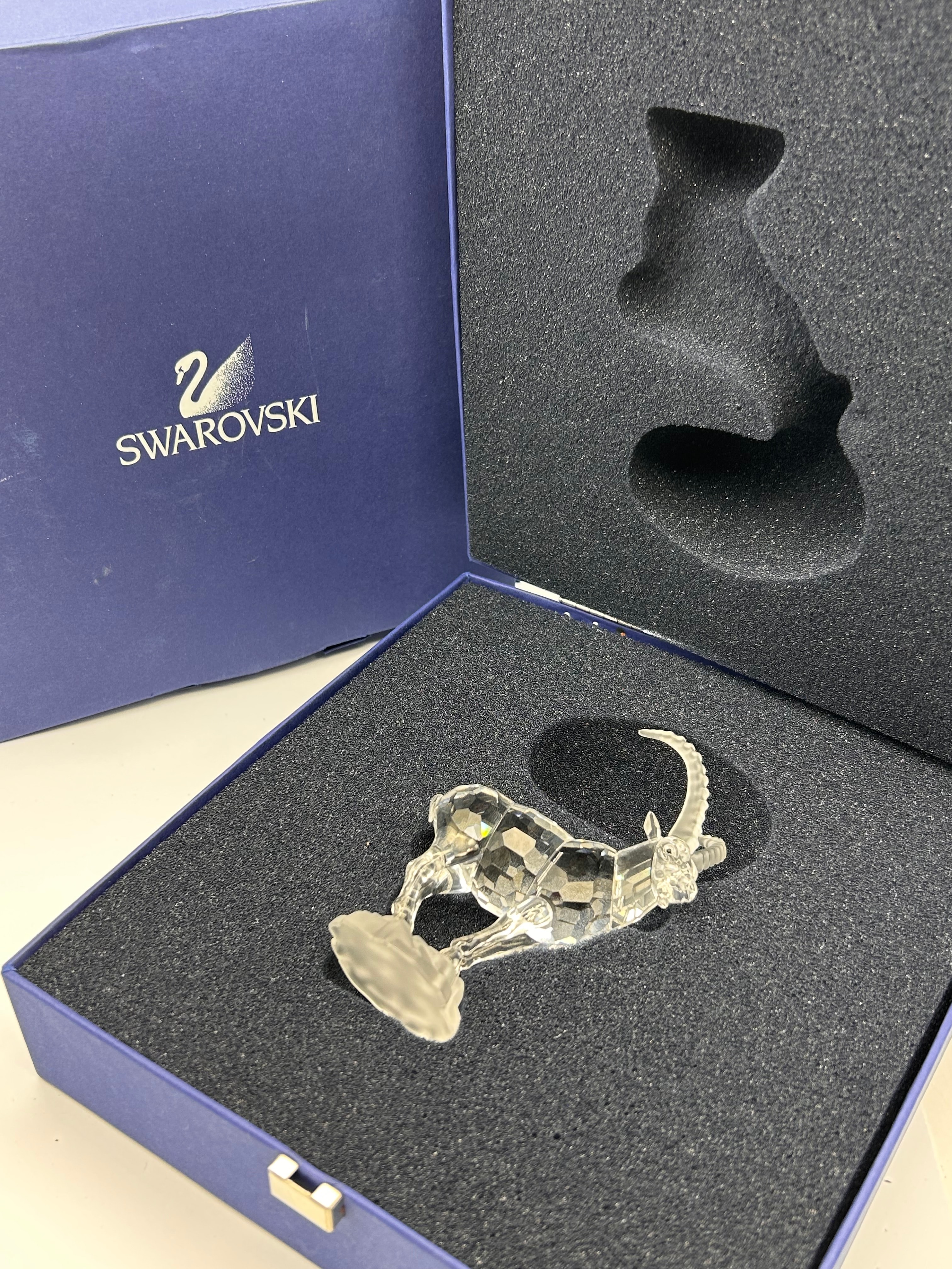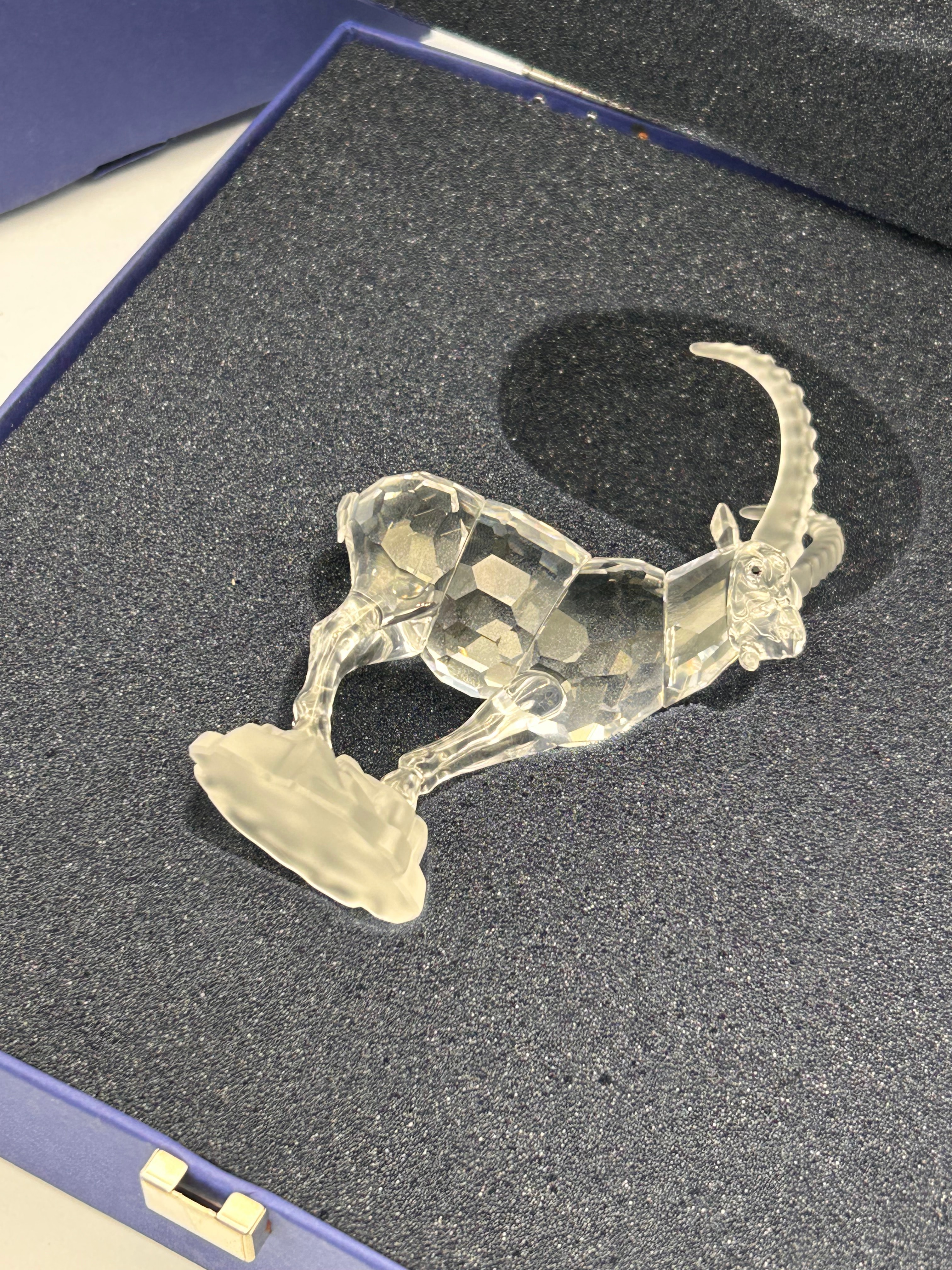 A Swarovski Crystal Ibex figurine, model 275439. Crafted from faceted clear and frosted crystal, depicting an ibex or mountain goat standing on a textured, frosted base. The figurine features geometric cuts and frosted details on the horns and base. It is presented in its original dark blue hinged box, which prominently features the “Swarovski” brand name and swan logo on the lid and interior, with a custom-fitted foam insert.