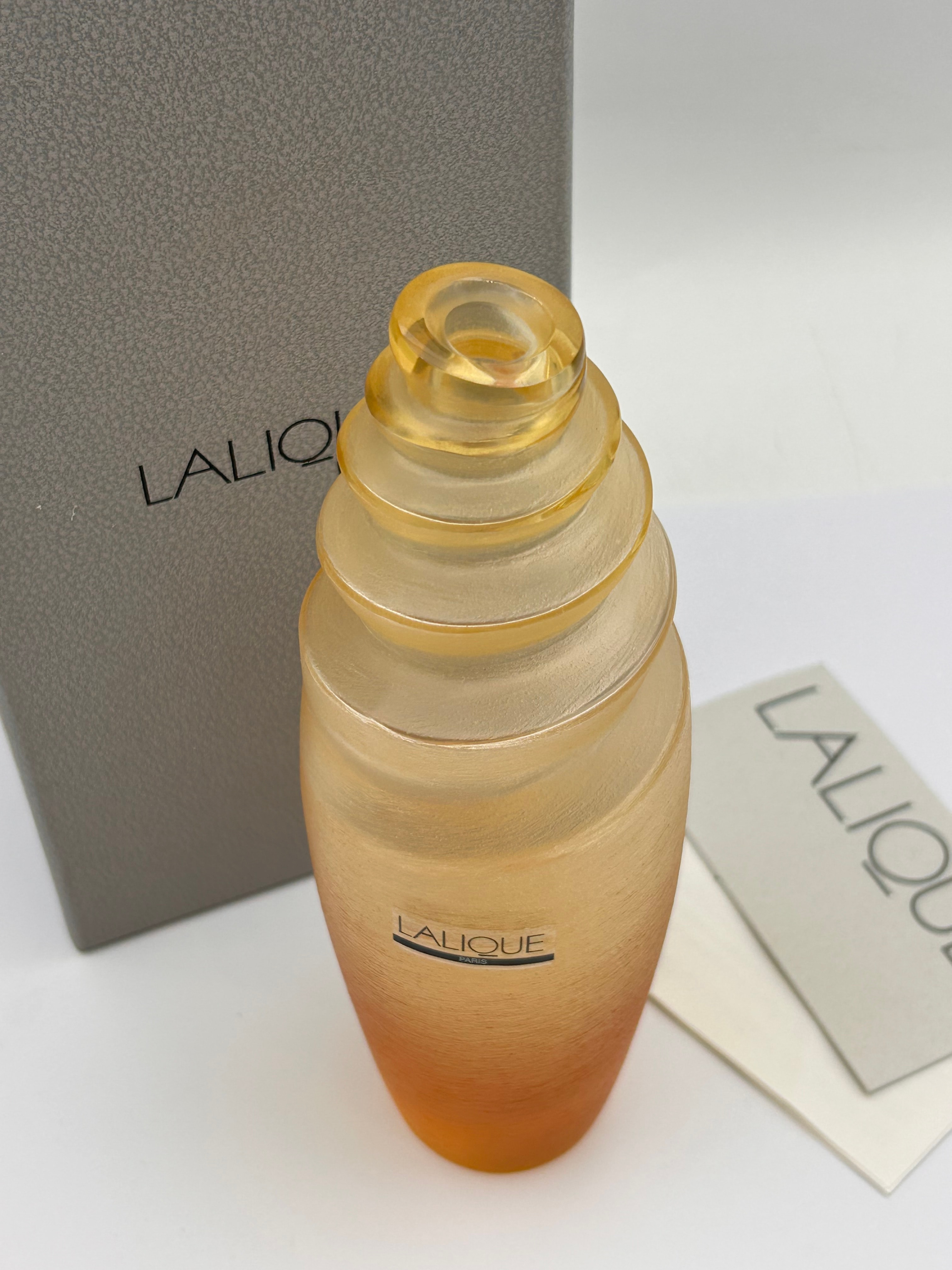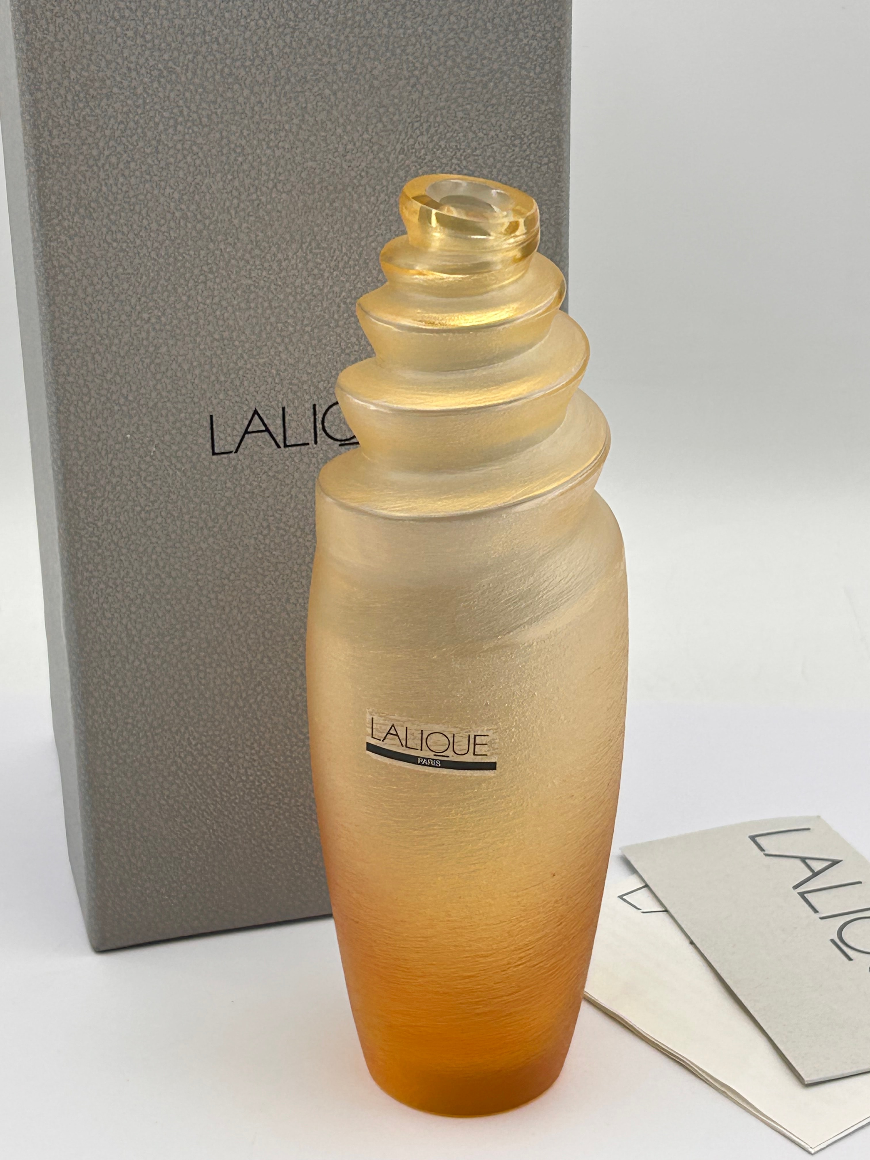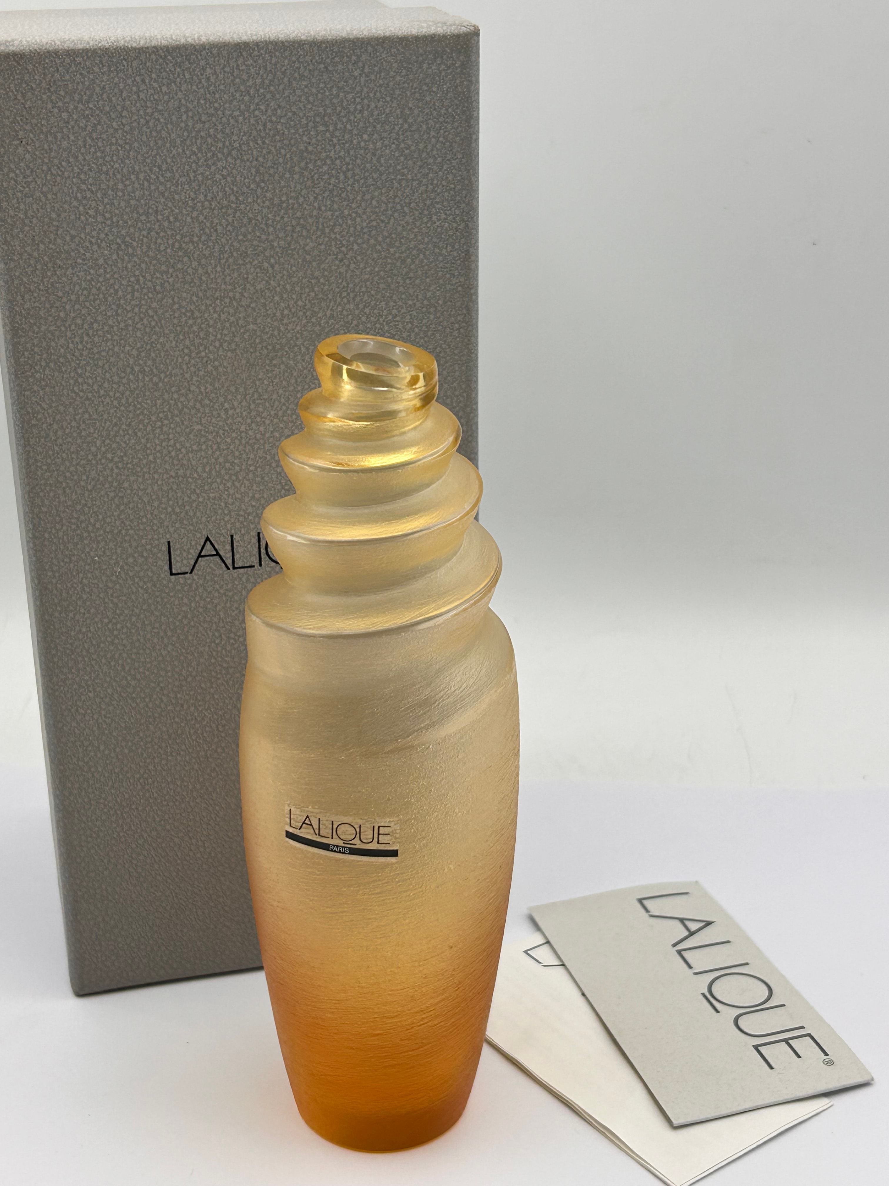 A Lalique ‘Cebu Nacre’ amber vase, featuring a frosted or satin-finished surface with an amber to orange gradient color. The upper body is designed with a distinctive spiraling, stacked form, culminating in the vase’s mouth. A prominent black label on the body reads “LALIQUE PARIS.” The vase is accompanied by a partially visible grey textured box and a small white card, both bearing the “LALIQUE” branding.