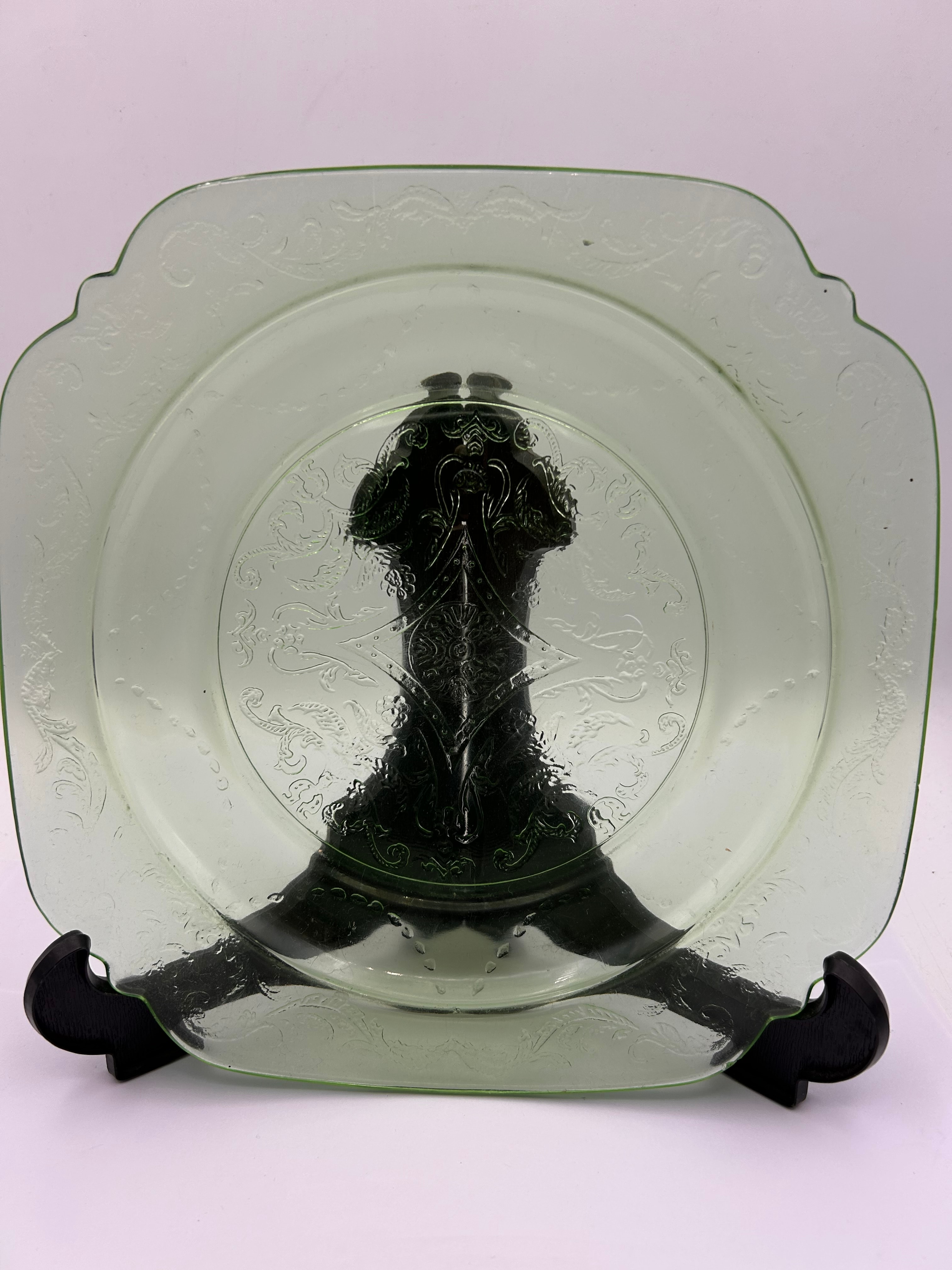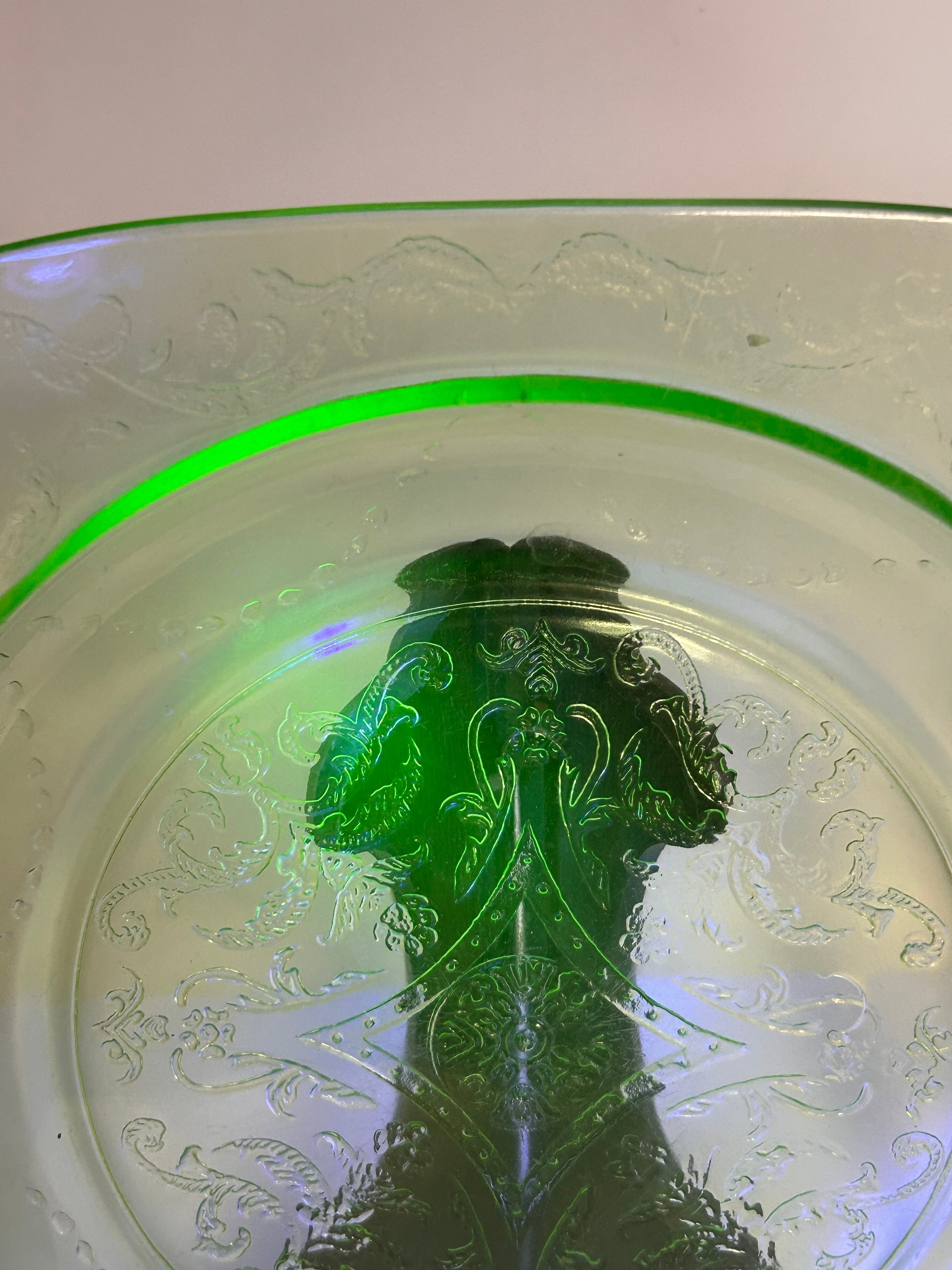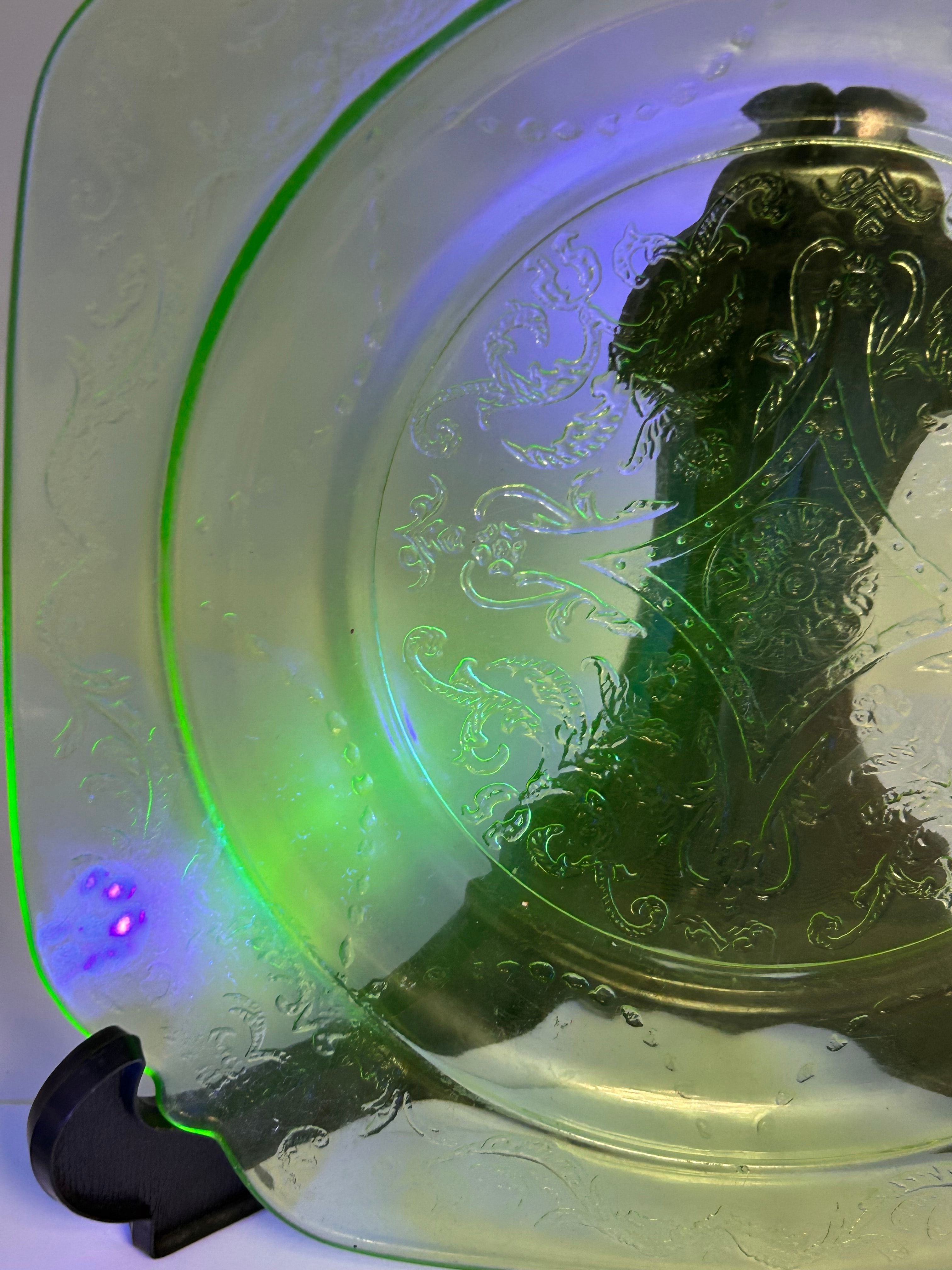An Anchor Hocking Princess pattern plate, crafted from translucent green depression glass. The shallow, square-rimmed plate features an elaborate pressed or molded design comprising scrolling foliage, floral motifs, and dotted borders, consistent with early to mid-20th century decorative pressed glass. Under ultraviolet light, the glass exhibits a strong, vibrant green fluorescence, indicating the presence of uranium. No manufacturer’s marks or text are visible.