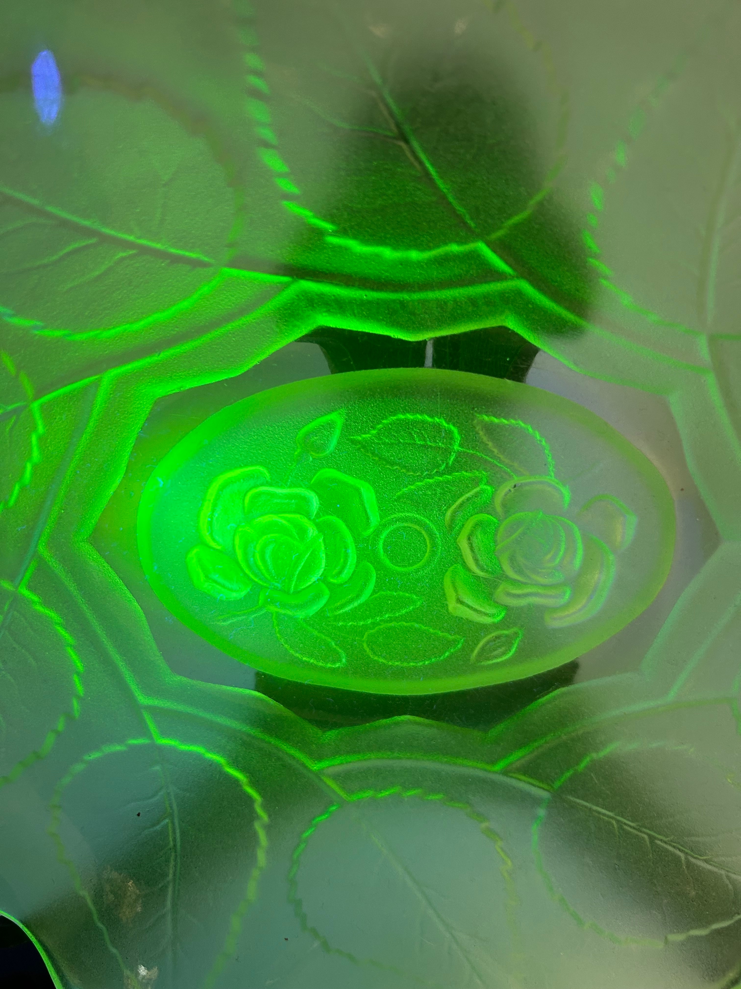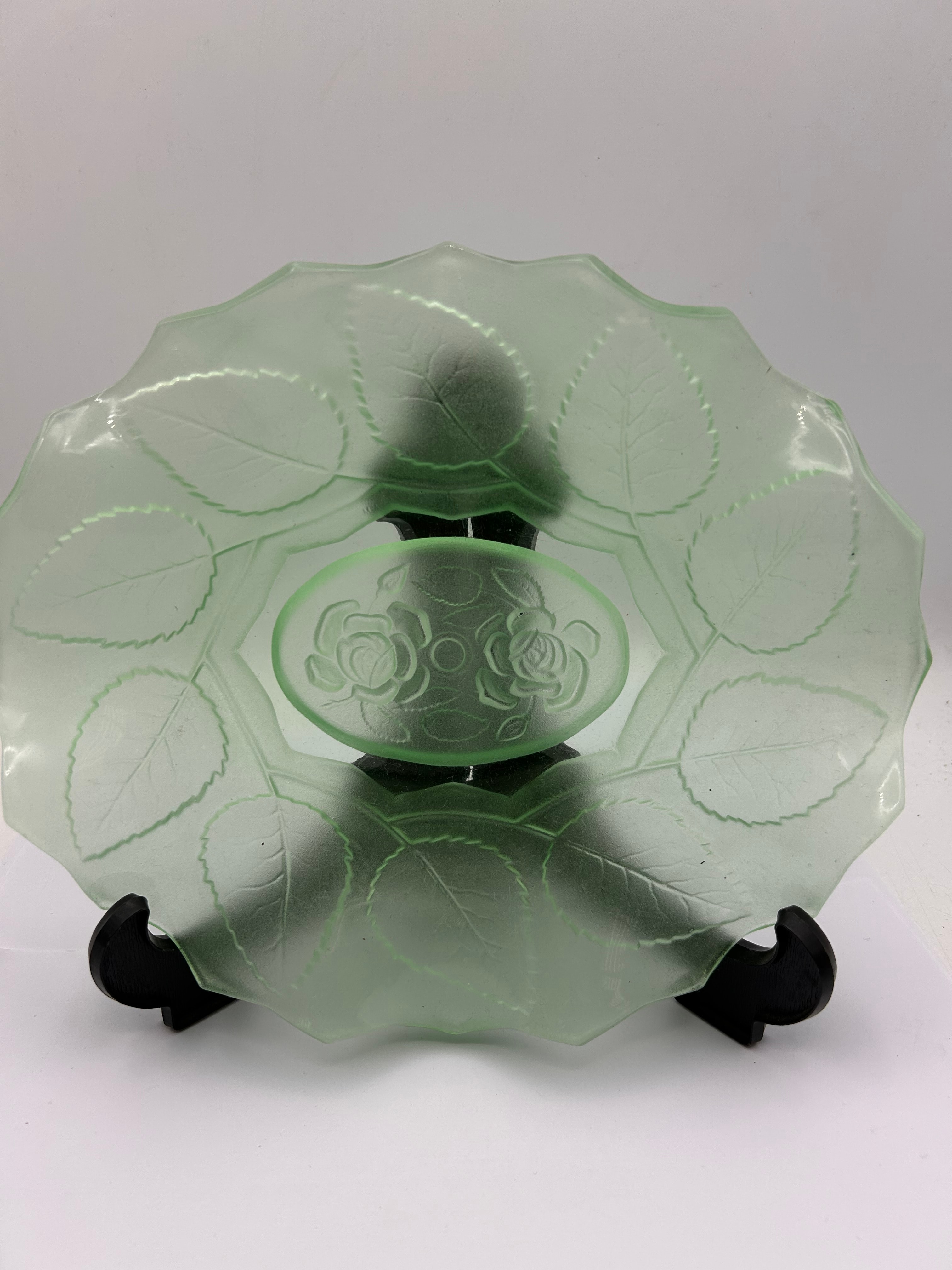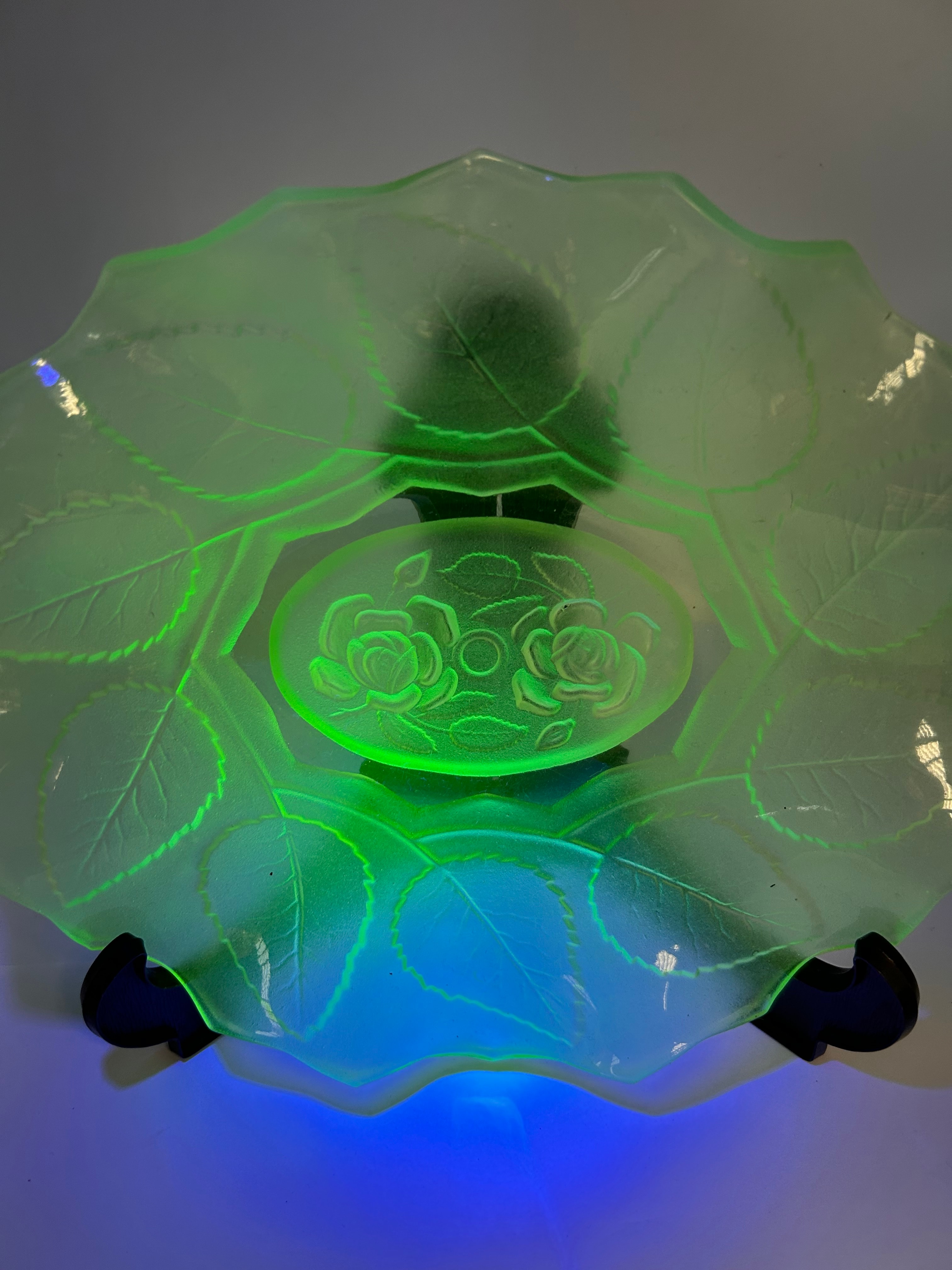 A Bagley ‘Frosted Rose & Leaf’ Uranium Glass Plate. Crafted from translucent pale green uranium glass, confirmed by its intense green fluorescence under UV light. The molded glass features a scalloped rim and a design primarily in raised relief, exhibiting a frosted finish on these textured areas. The central element is an oval medallion showcasing two stylized roses flanked by a small dot, surrounded by a border of overlapping leaves with visible venation. The style suggests an Art Deco period aesthetic, likely from the 1920s to 1940s. No visible manufacturer’s marks or textual engravings are apparent.