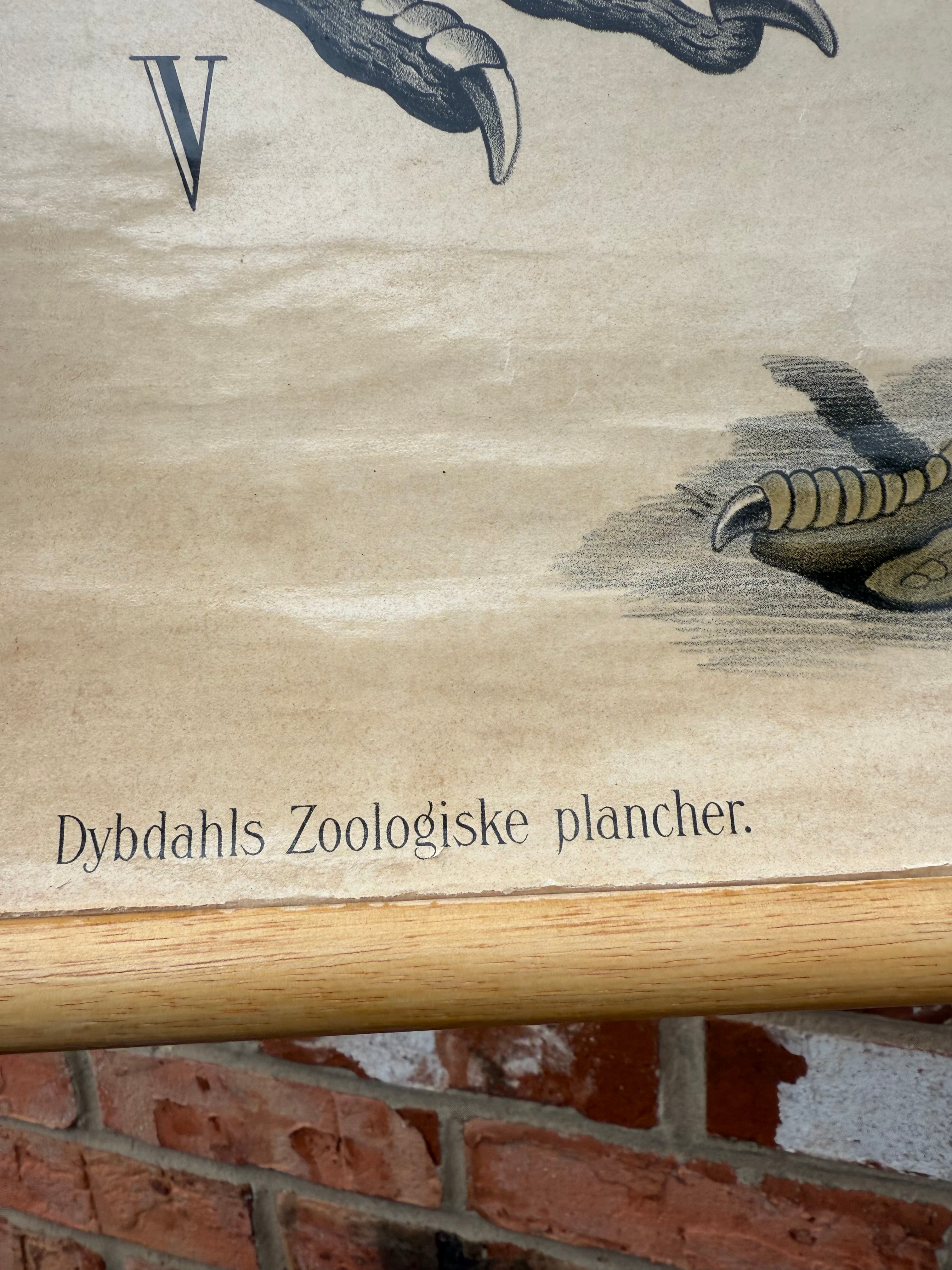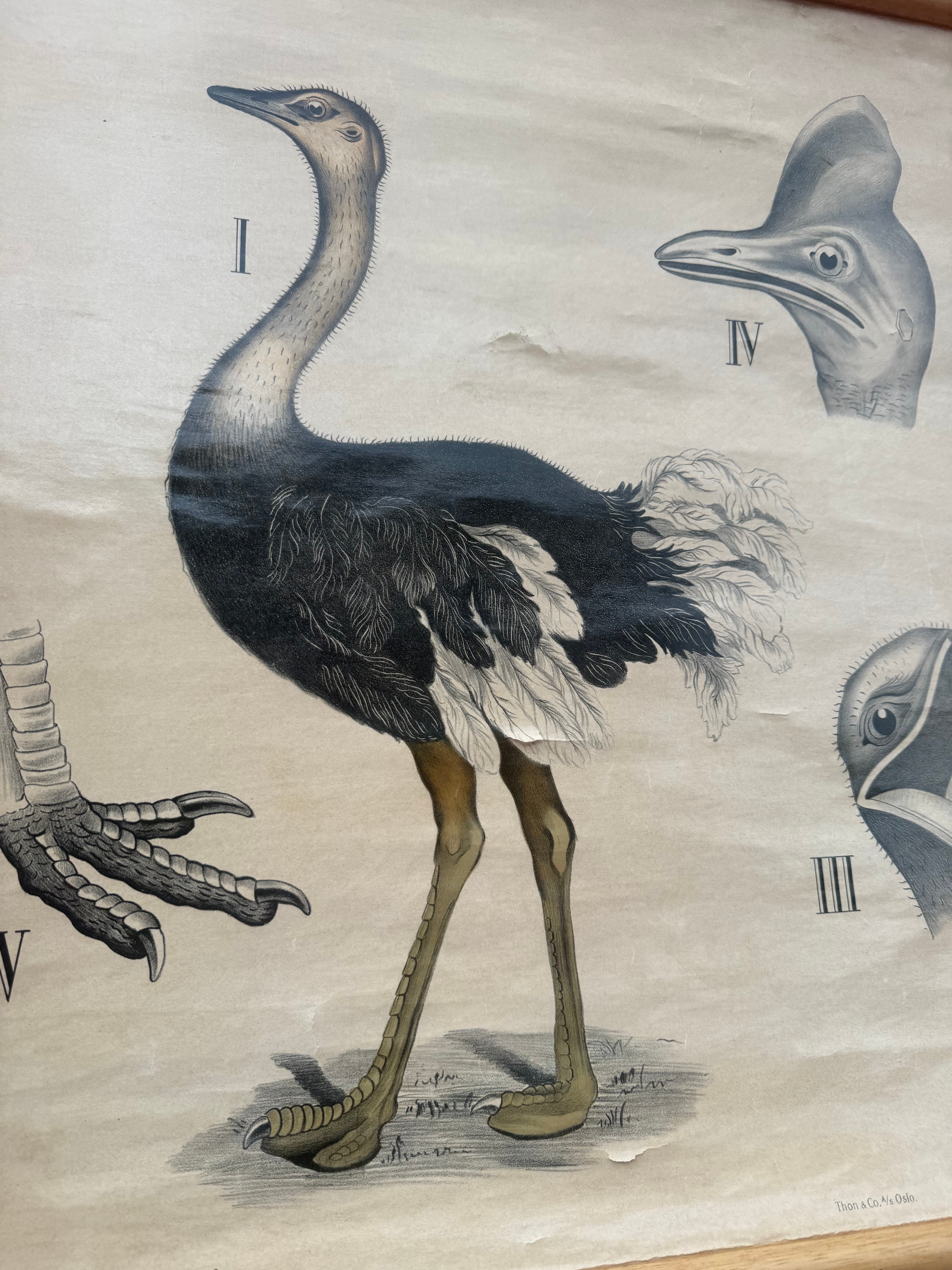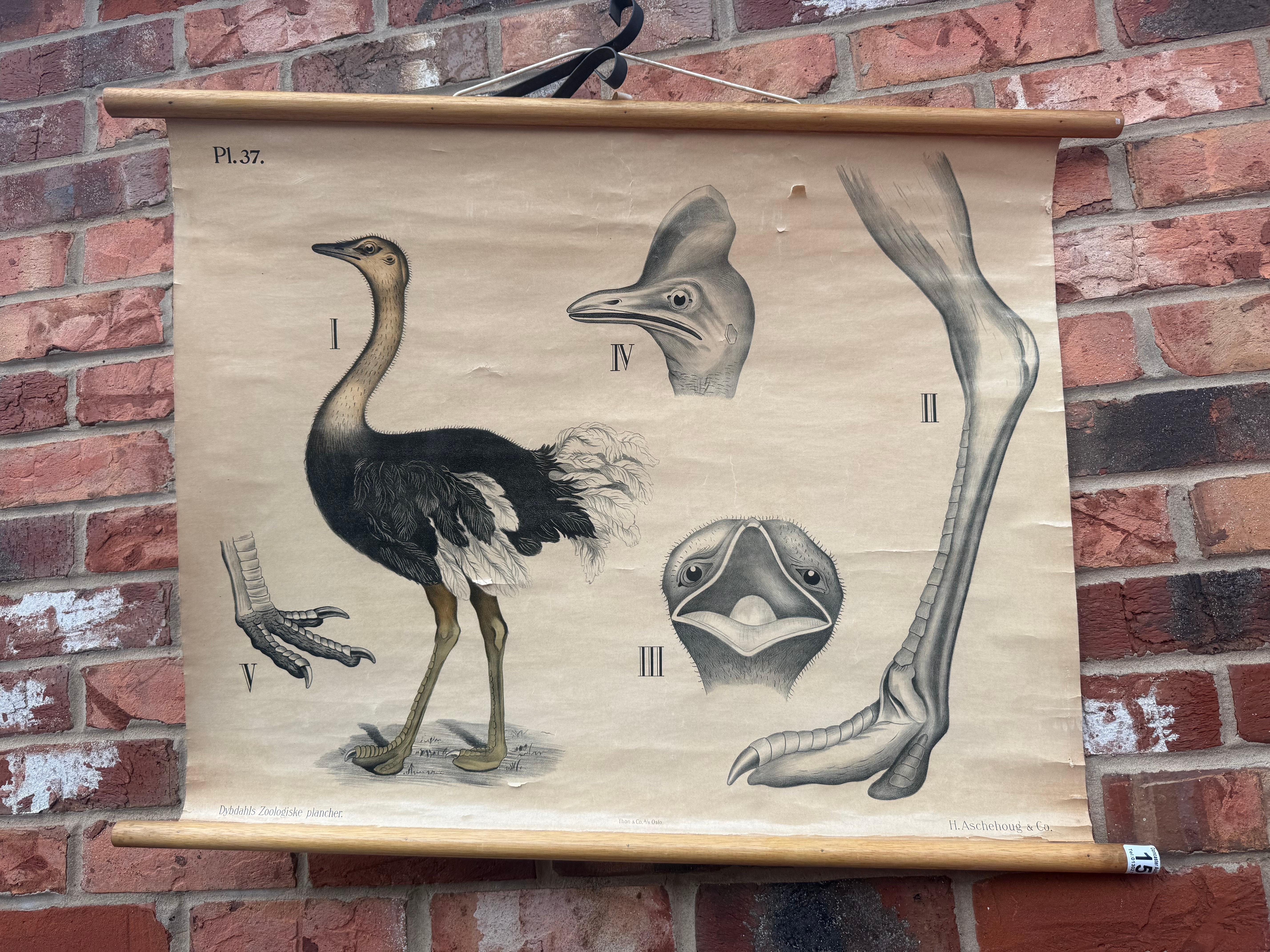 A single late 19th/early 20th century educational zoological wall chart, titled ‘Dybdahls Zoologiske plancher’ and published by H. Aschehoug & Co., with a smaller mark for Thon & Co.s Odén. This chart, designated Pl. 37, depicts an ostrich with detailed scientific illustrations, including a full body view (I) and various anatomical sections such as its leg (II), head with open beak (III), another head view (IV), and foot (V). The item is composed of canvas mounted between two wooden dowels at the top and bottom, with a string attached for hanging, typical of didactic materials from the period.