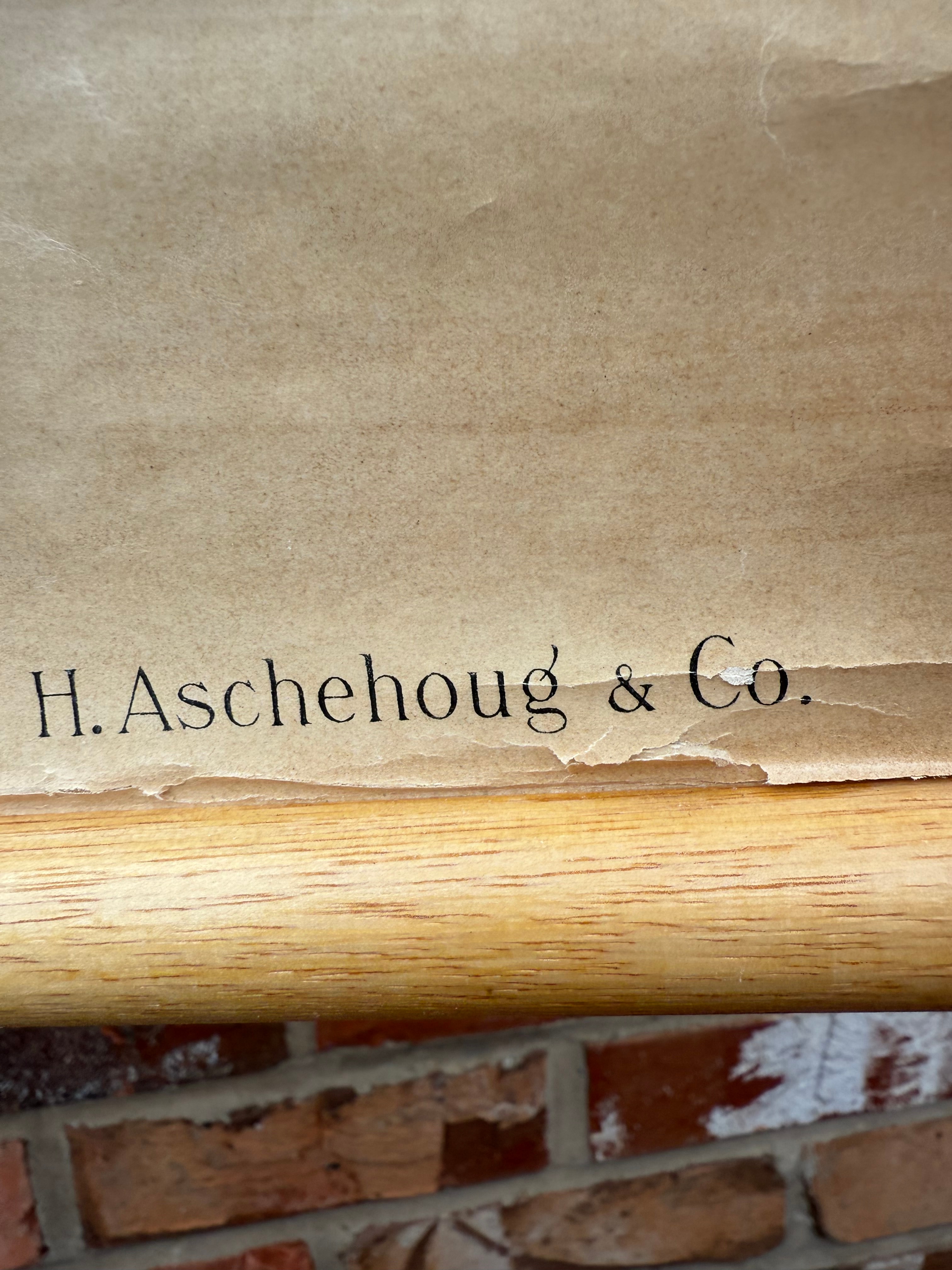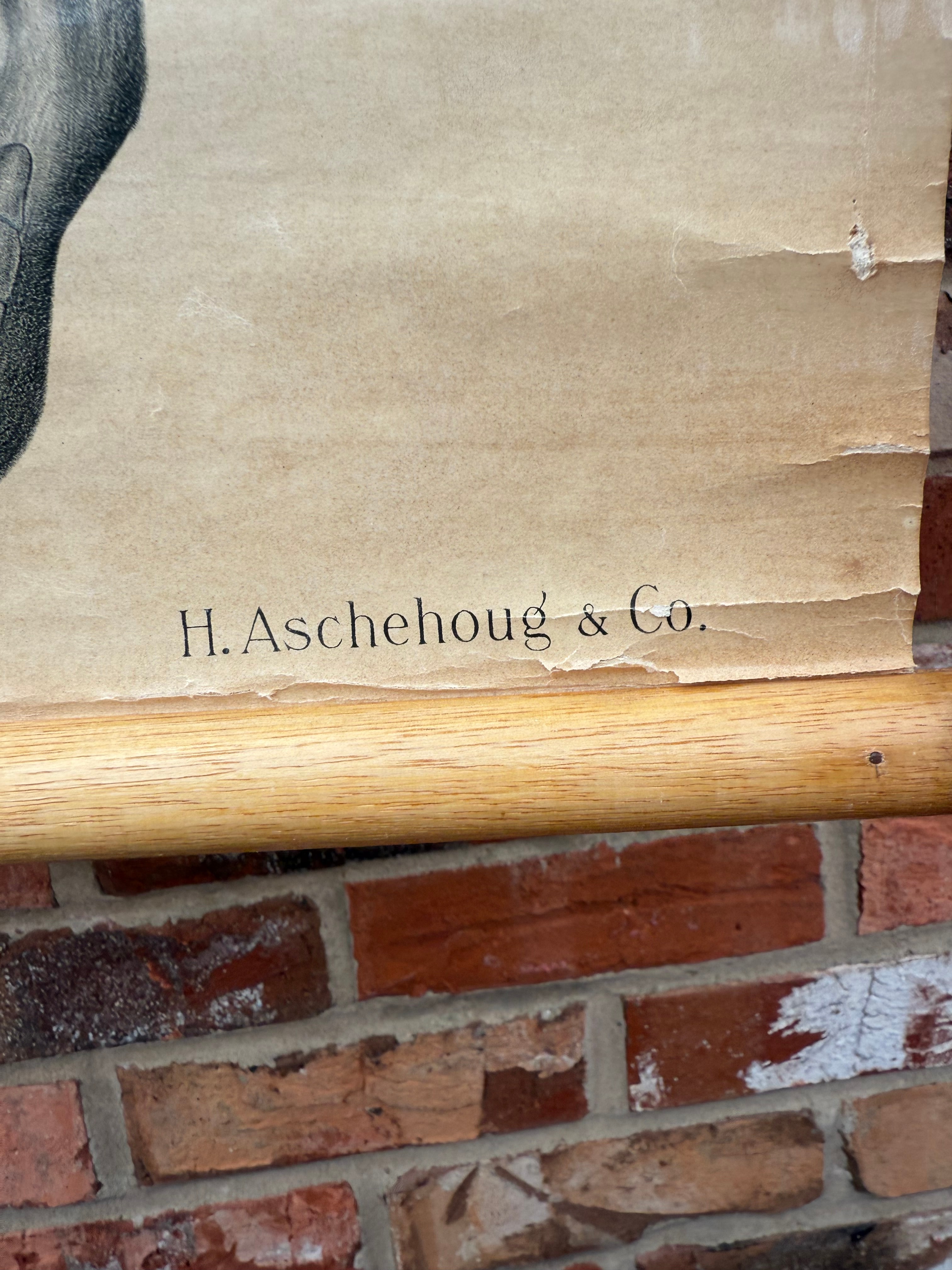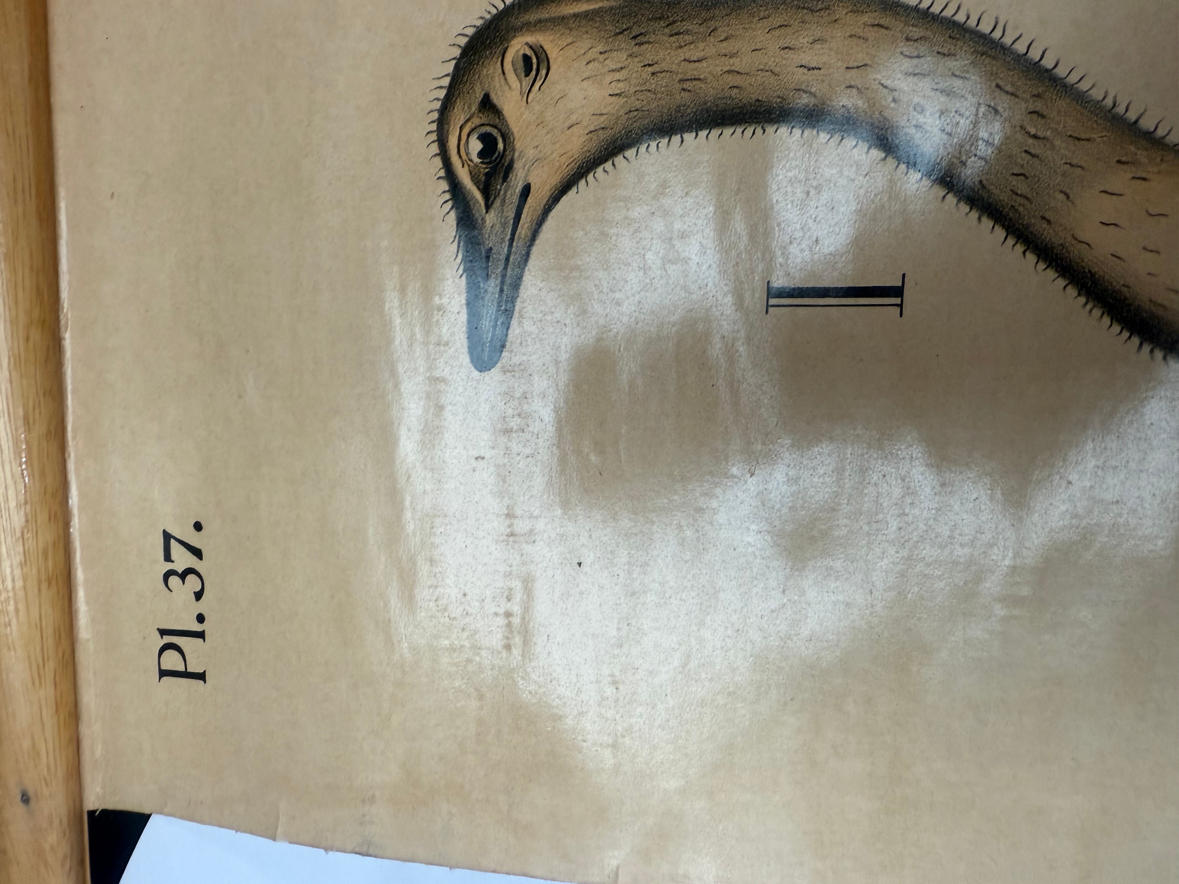 A single late 19th/early 20th century educational zoological wall chart, titled ‘Dybdahls Zoologiske plancher’ and published by H. Aschehoug & Co., with a smaller mark for Thon & Co.s Odén. This chart, designated Pl. 37, depicts an ostrich with detailed scientific illustrations, including a full body view (I) and various anatomical sections such as its leg (II), head with open beak (III), another head view (IV), and foot (V). The item is composed of canvas mounted between two wooden dowels at the top and bottom, with a string attached for hanging, typical of didactic materials from the period.