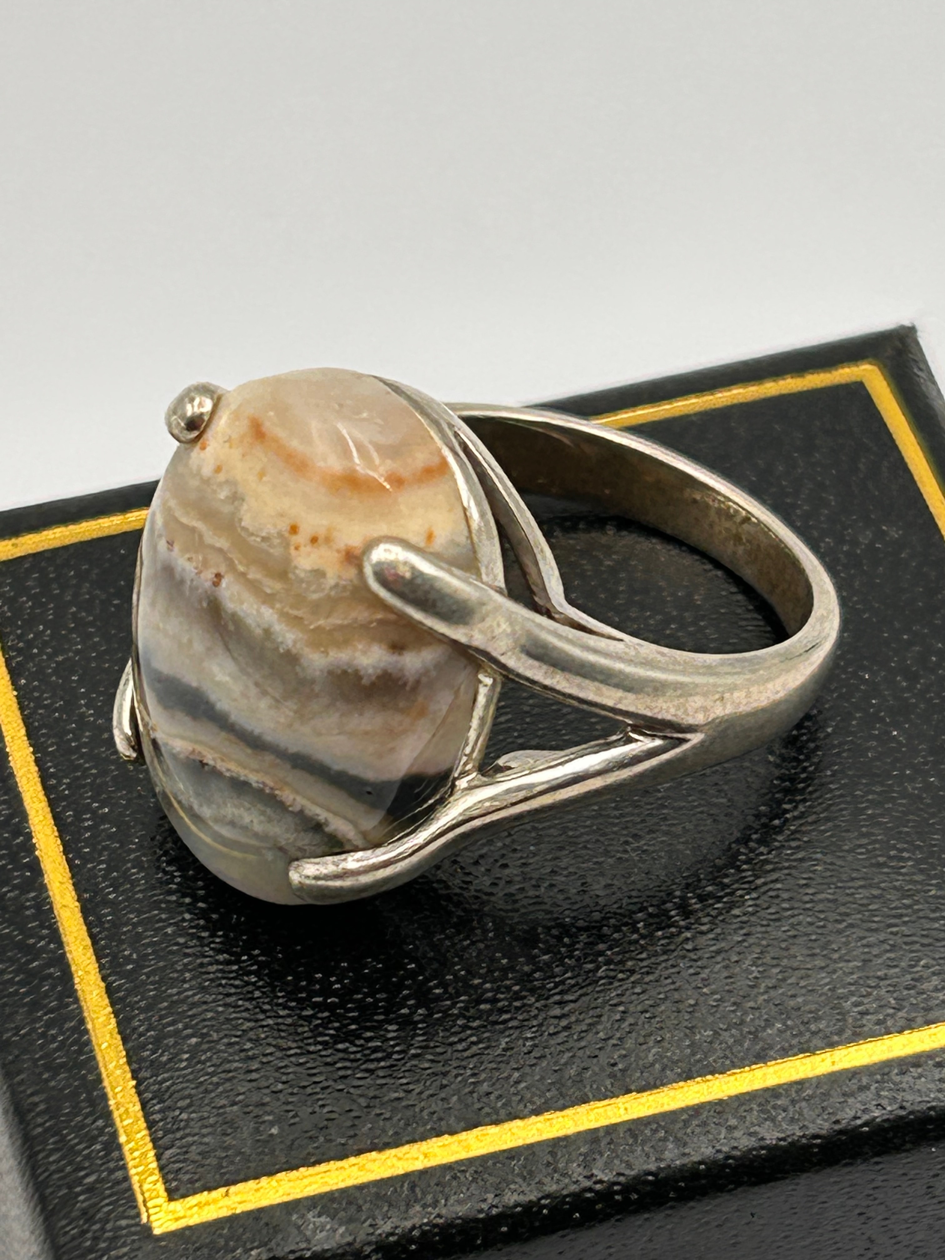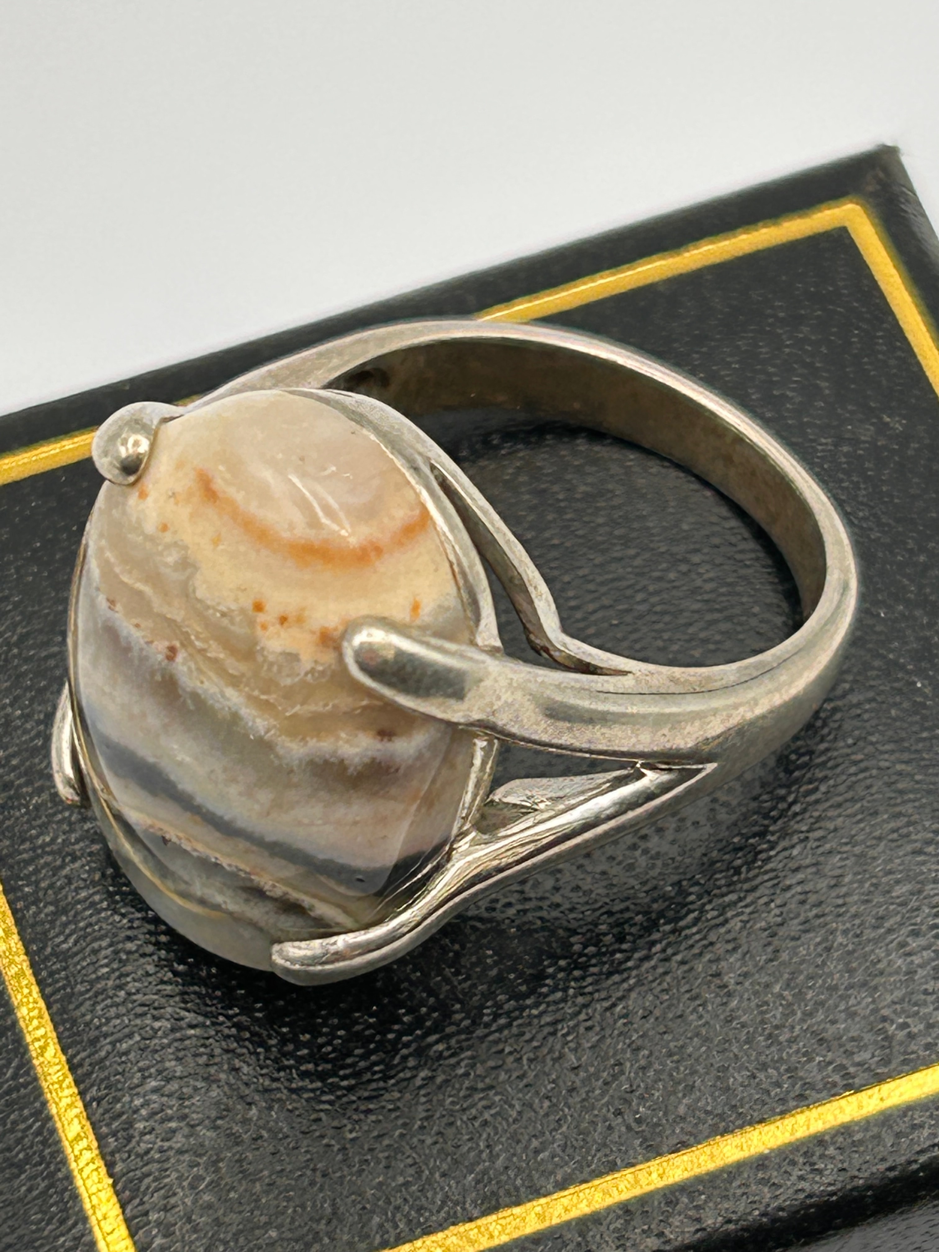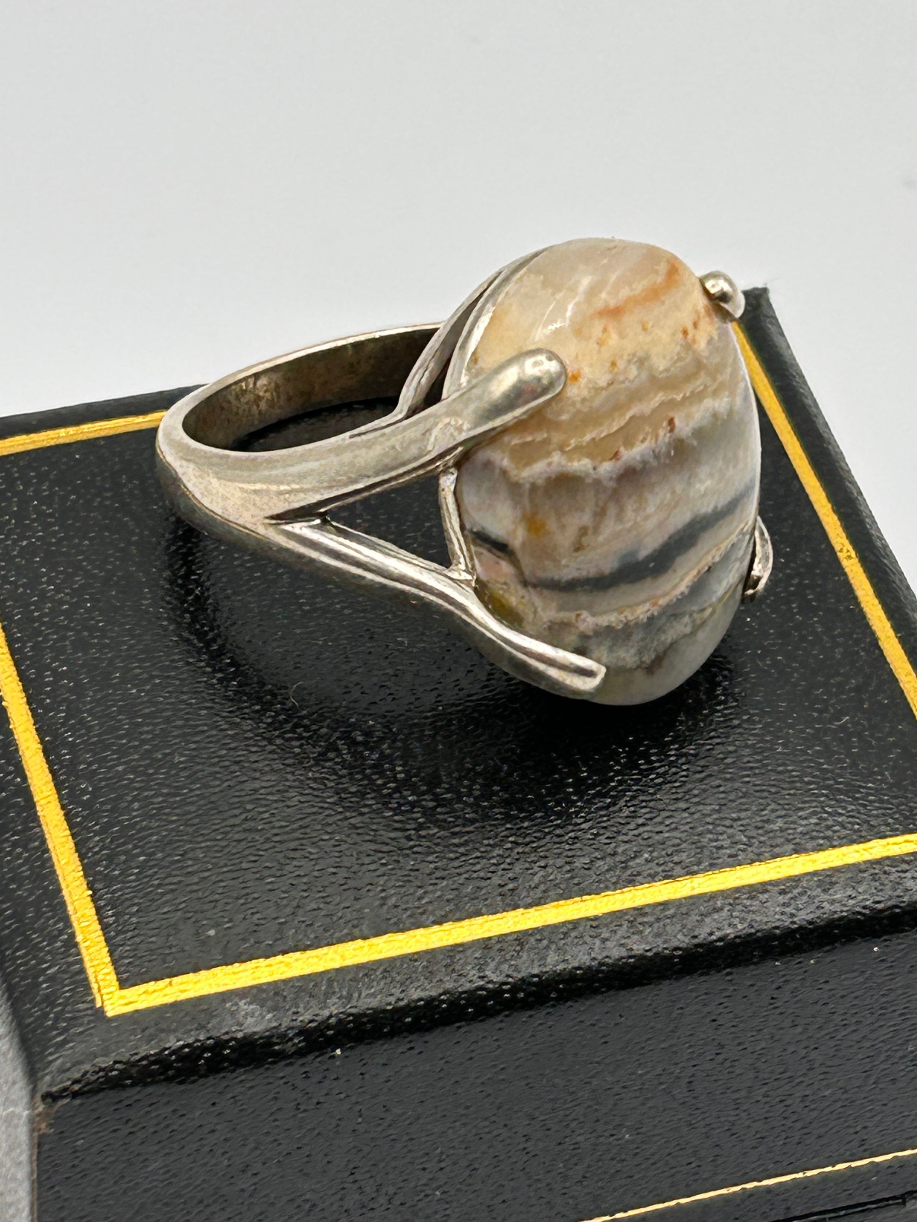 A vintage statement ring featuring a large, oval, cabochon-cut banded mammoth tooth stone. The stone exhibits prominent natural banding in various shades of cream, light brown, orange-brown, grey, and dark grey. It is securely set within an open-back, split-shank setting crafted from sterling silver, presenting a modernist or contemporary design. No discernible hallmarks, maker’s marks, or text are visible on the exterior of the band.