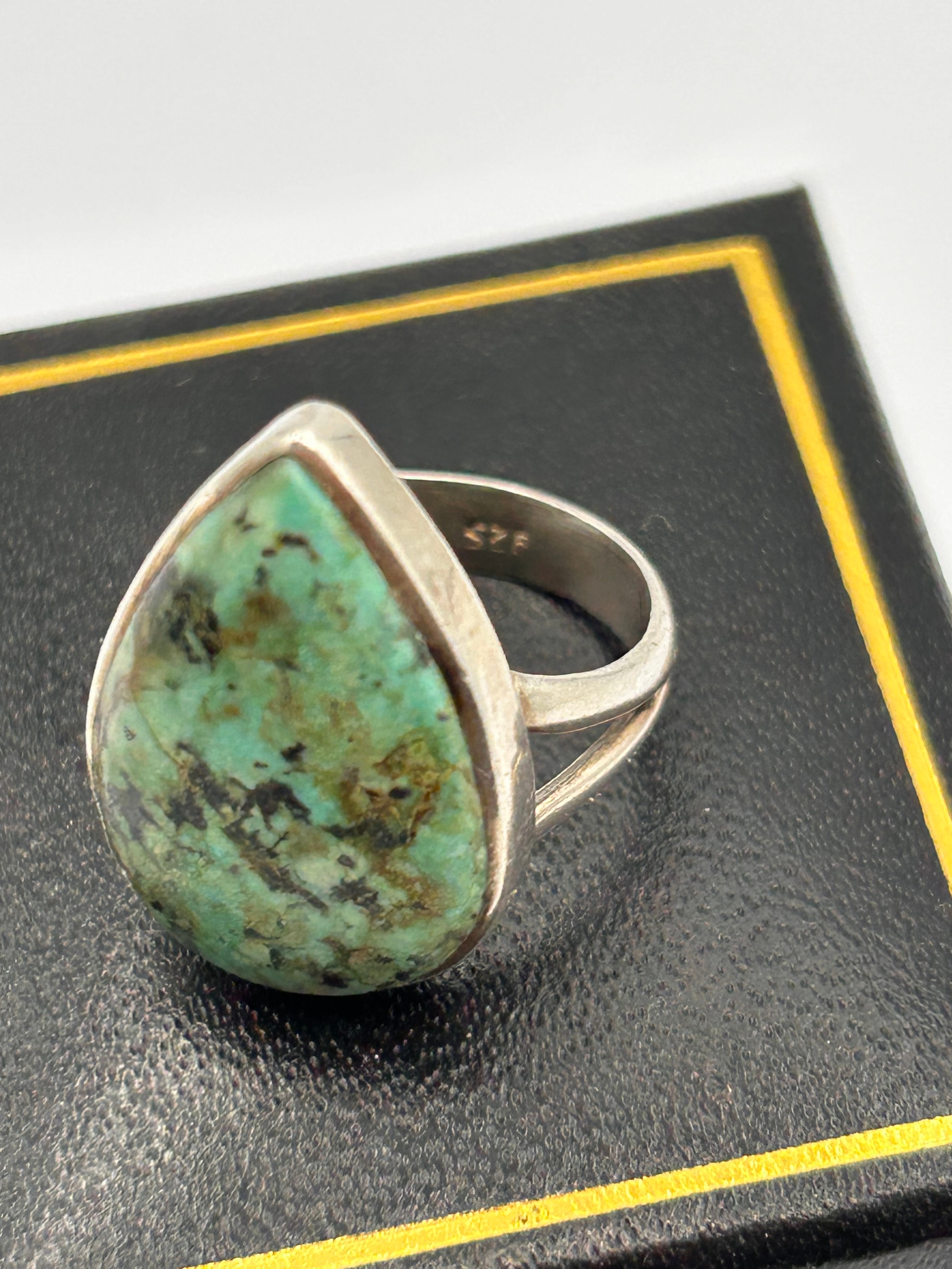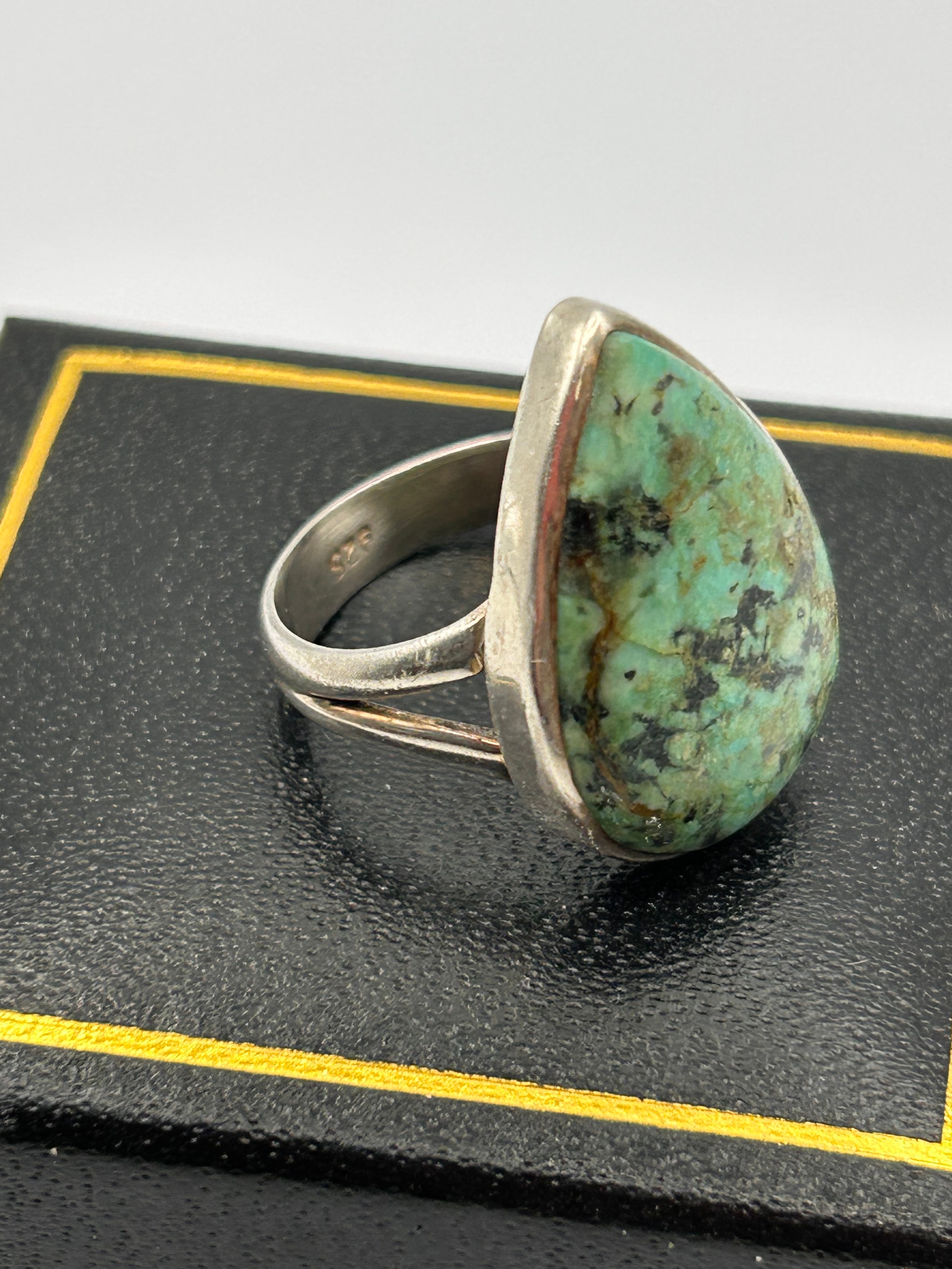 A Navajo men’s sterling silver ring featuring a natural turquoise cabochon. The ring features a large, polished teardrop or pear-shaped cabochon stone exhibiting vibrant blue-green hues with prominent dark brown to black matrix veining. It is set in a plain, full bezel with a modernist-style split shank. The interior of the band is stamped ‘925’, indicating sterling silver.