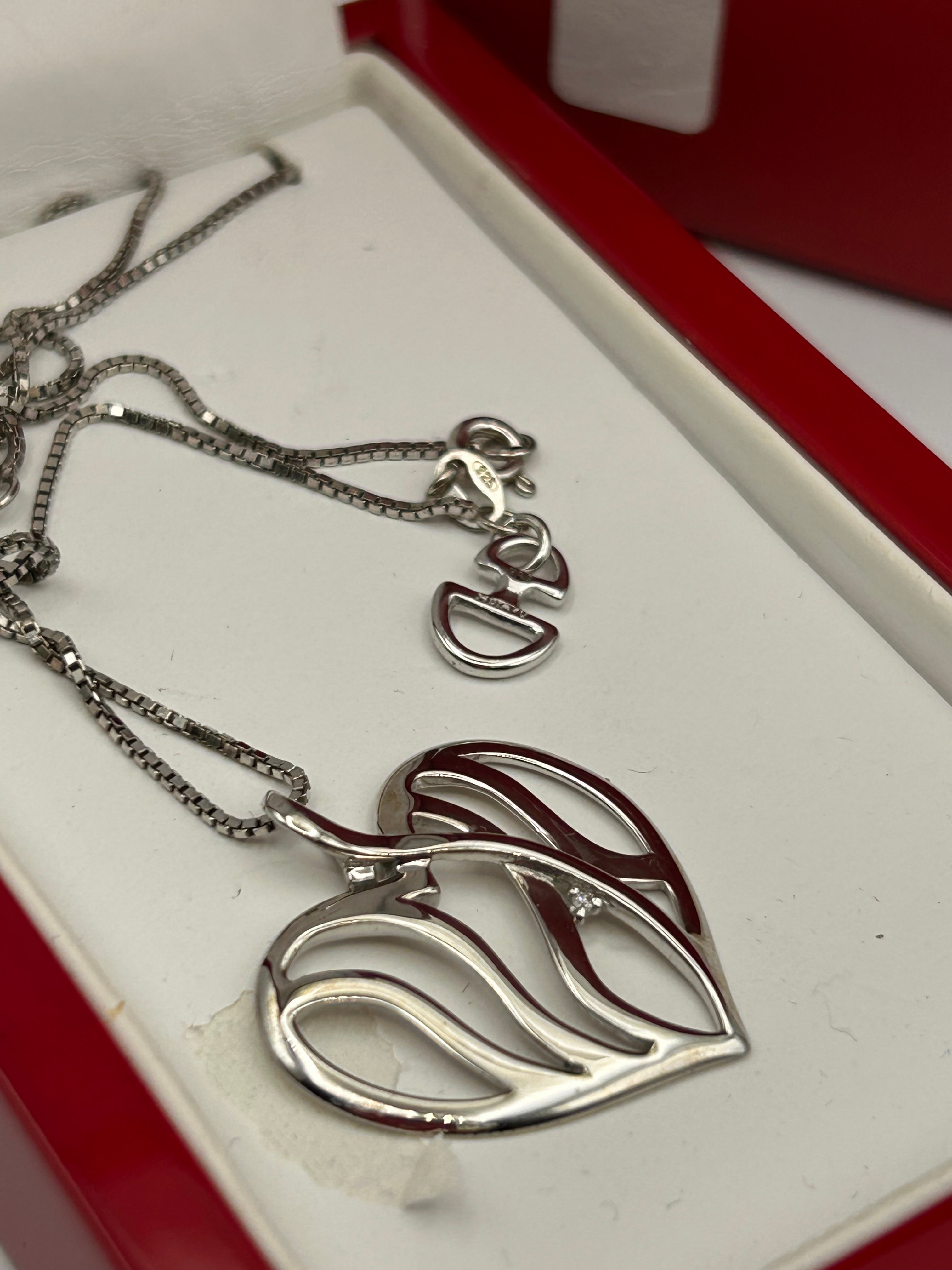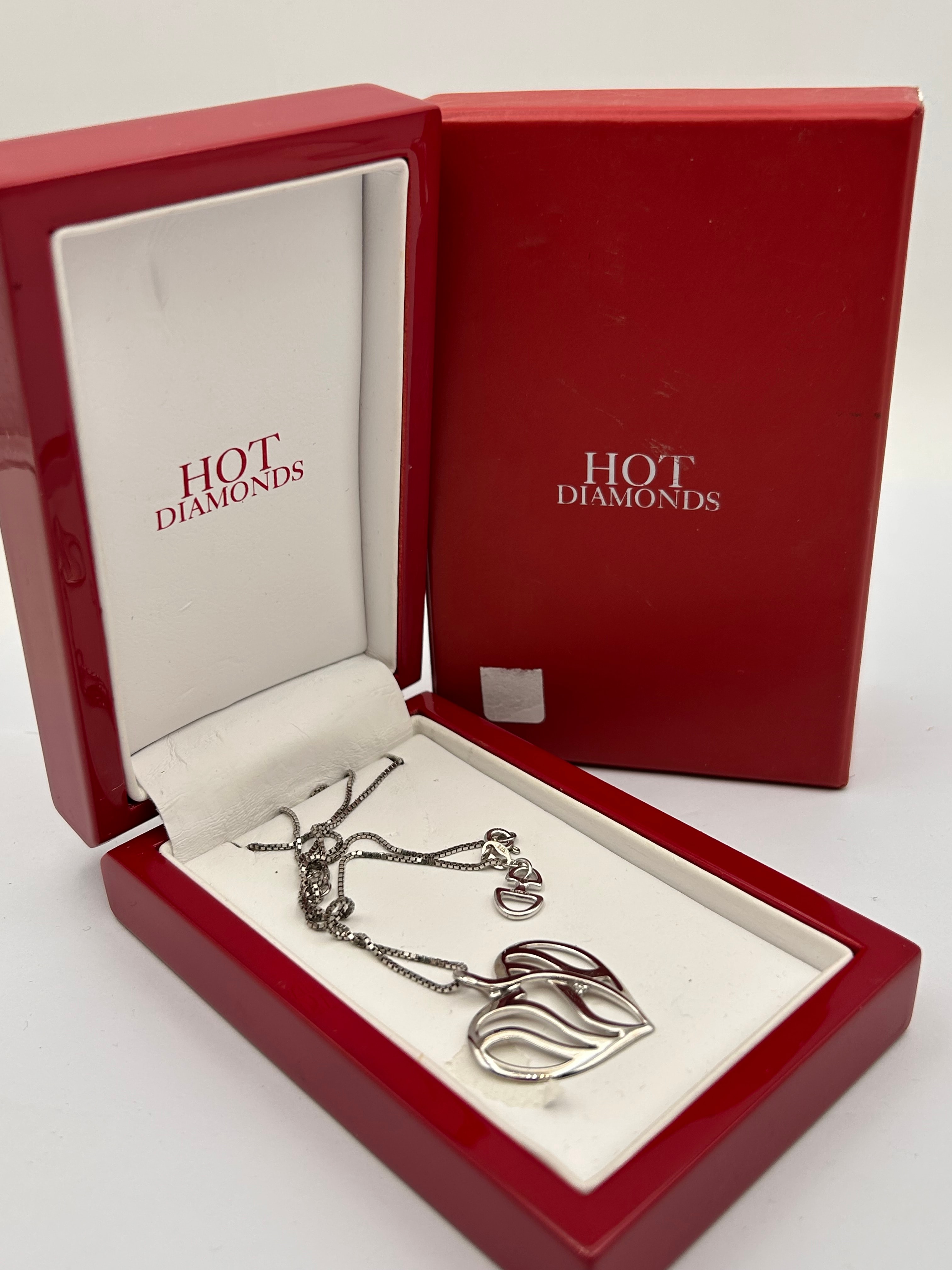 A Hot Diamonds sterling silver necklace, featuring an openwork heart-shaped pendant set with a single small, clear stone. The pendant is suspended from a box chain, with a ‘925’ mark visible on the clasp, indicating sterling silver. The necklace is presented in its original red presentation box, which has a white interior lining and the ‘HOT DIAMONDS’ brand name in red text on both the exterior lid and the interior lining.