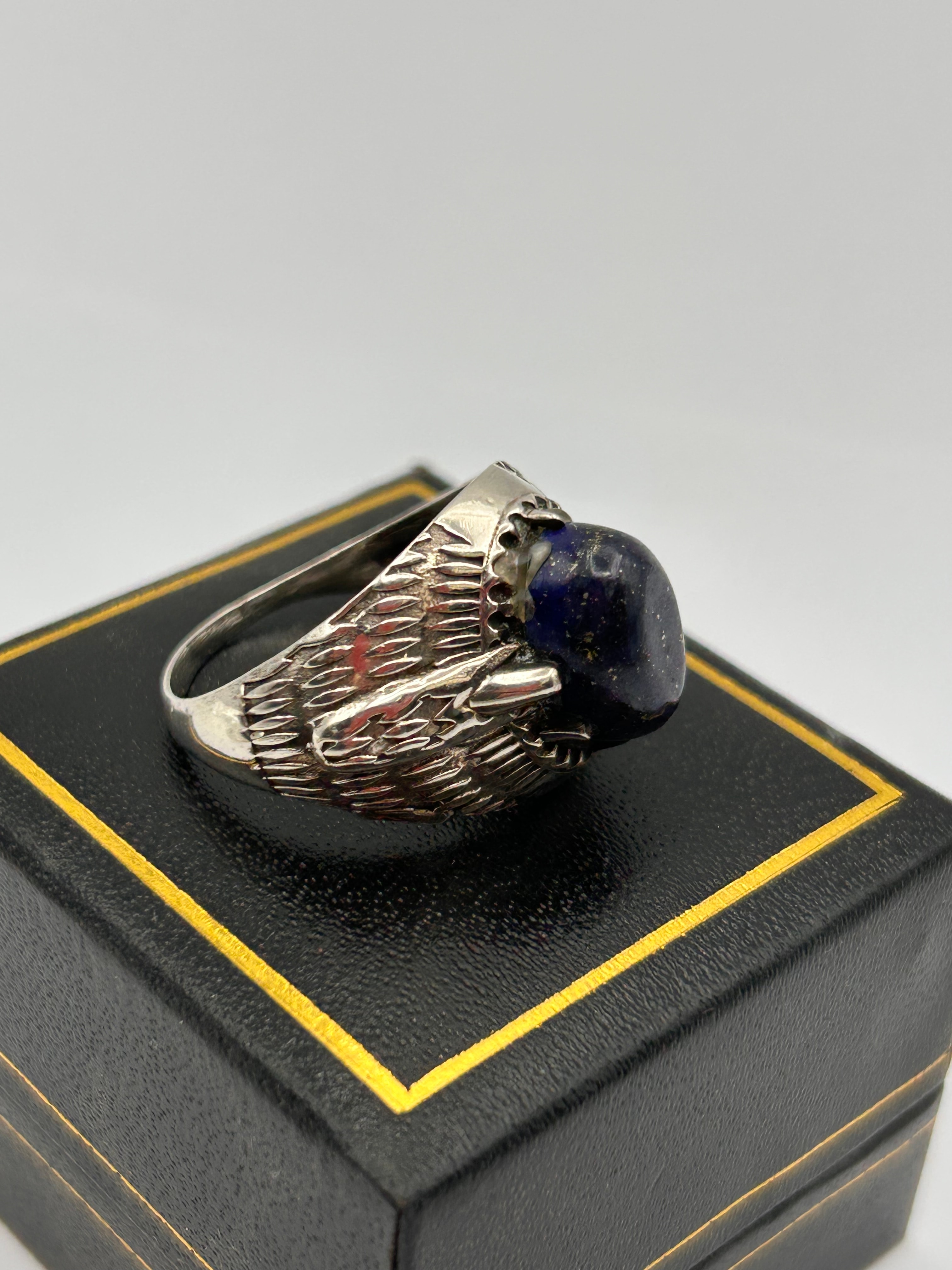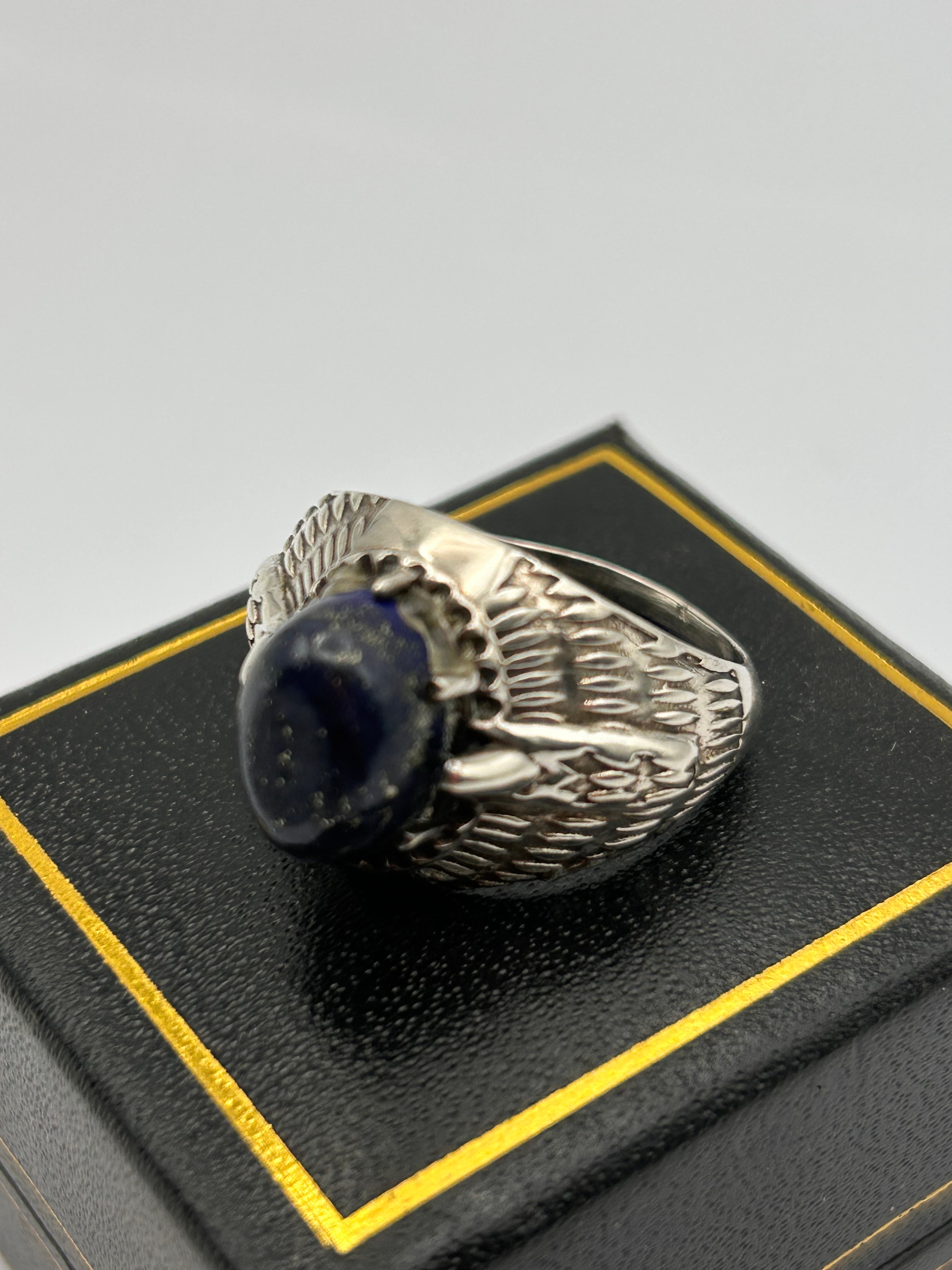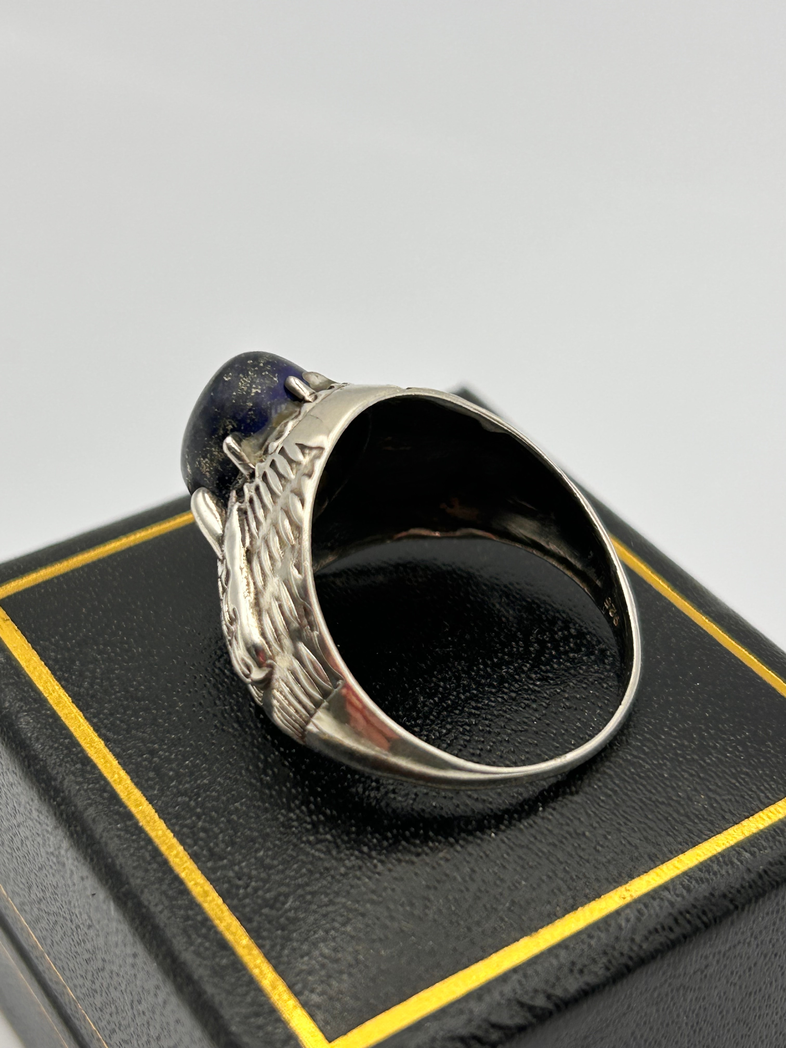 A Sterling Silver Natural Afghani Lapis Lazuli Eagle Mans Ring. This finger ring features a prominent oval cabochon-cut stone of deep blue color with visible golden flecks, consistent with Lapis Lazuli. The stone is set within a cast or carved design depicting an eagle’s head, with textured shoulders extending down the band. The ring is marked “925” on the interior of the band, indicating sterling silver.