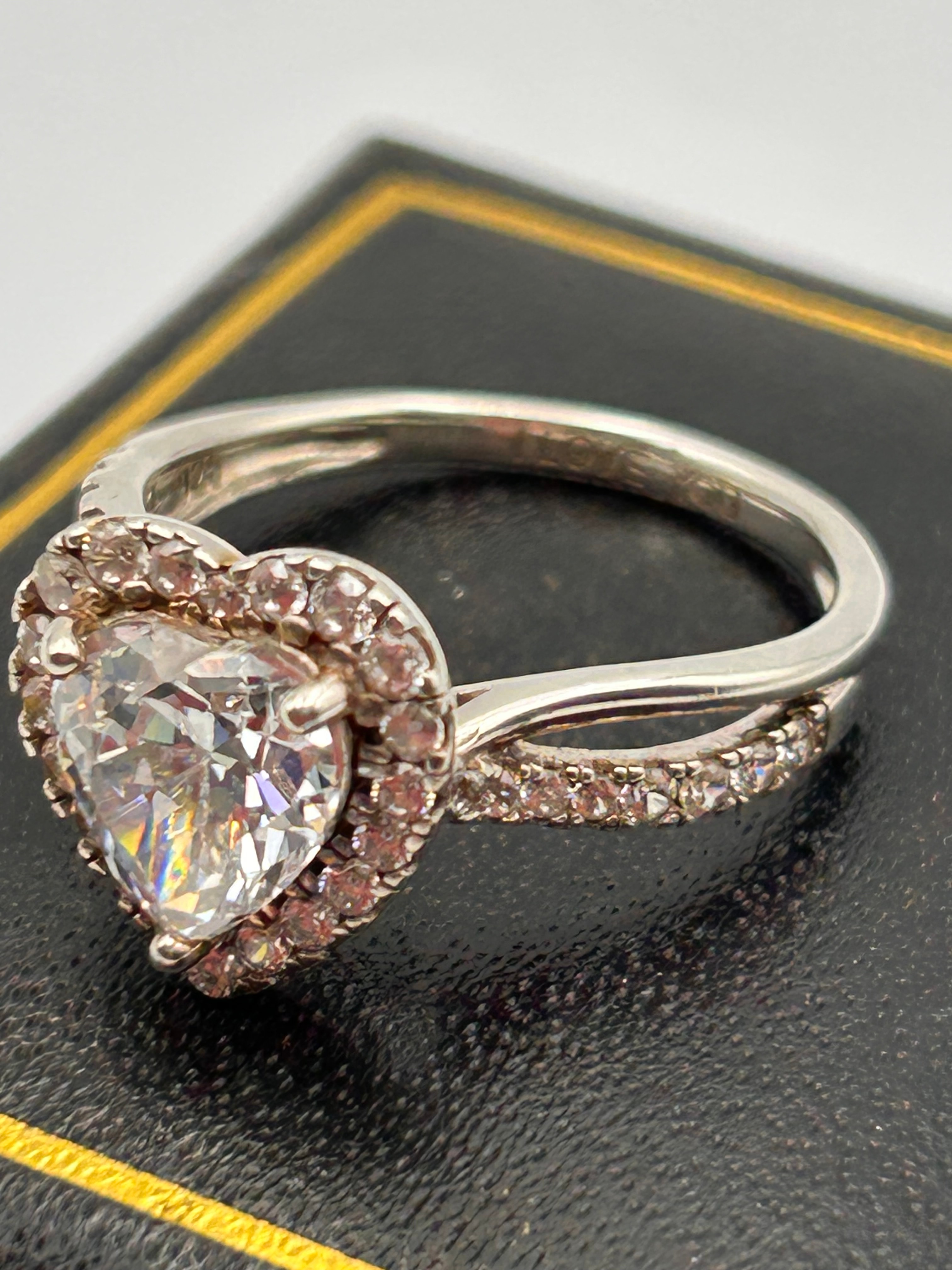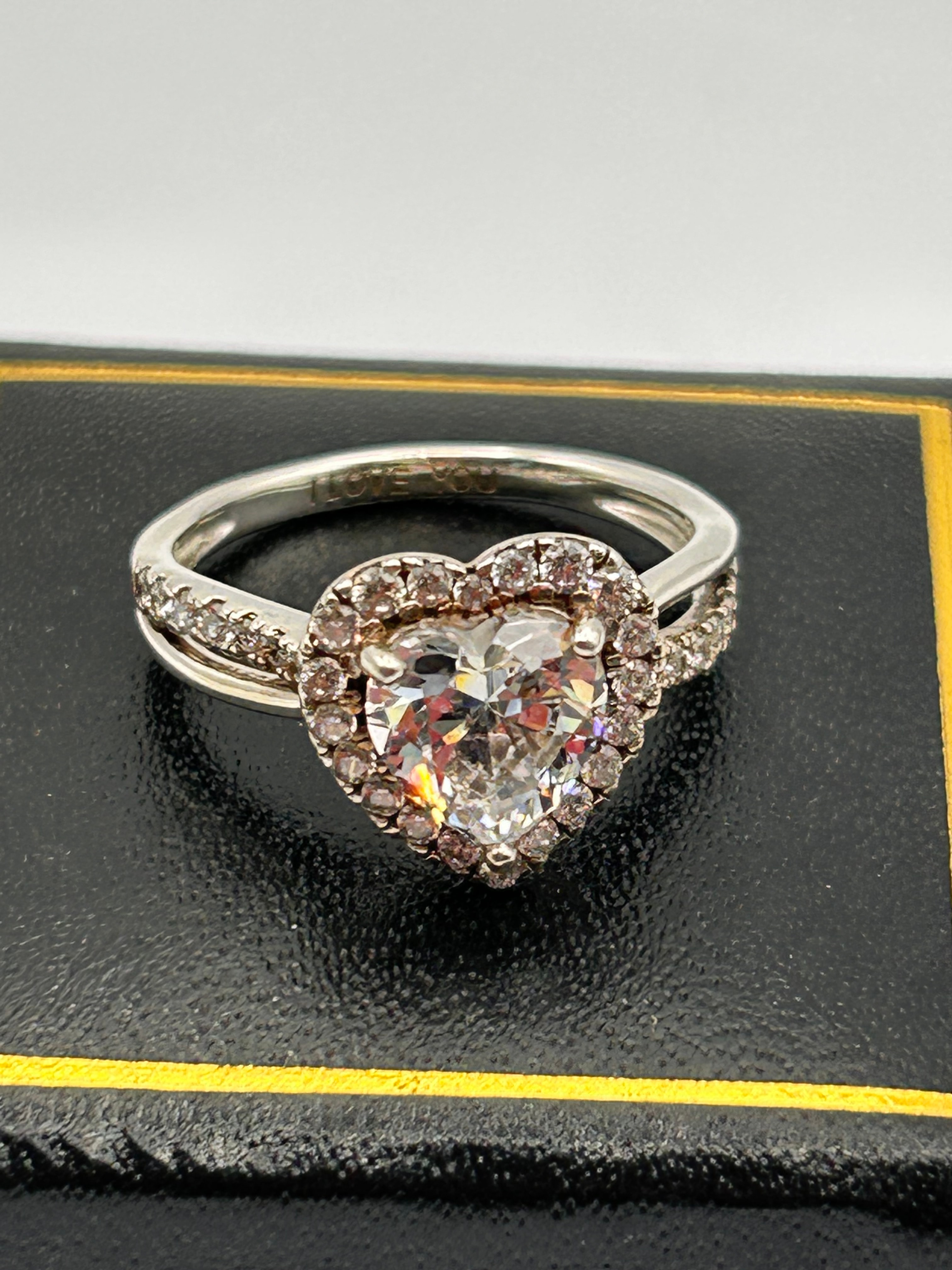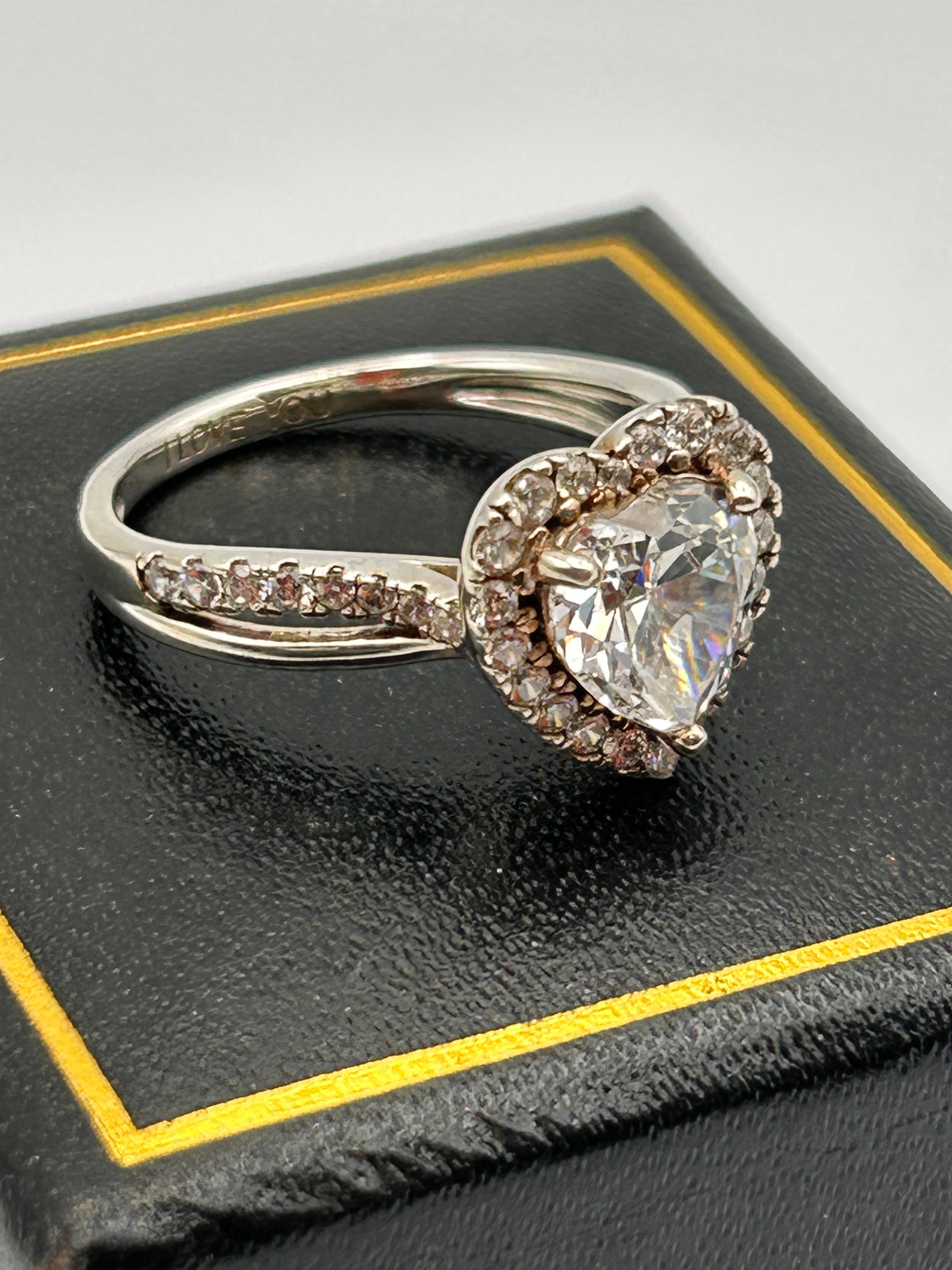 A HeartsAndYou 2ct Heart Cut Moissanite Halo Ring. This contemporary-style ring is crafted from a silver-toned metal, featuring a prominent heart-shaped, faceted clear moissanite as its central element. The main stone is encircled by a halo of smaller, round-cut accent stones, with additional accent stones set along the shoulders of the split-shank band. The inscription “I LOVE YOU” is visibly engraved on the interior surface of the band.
