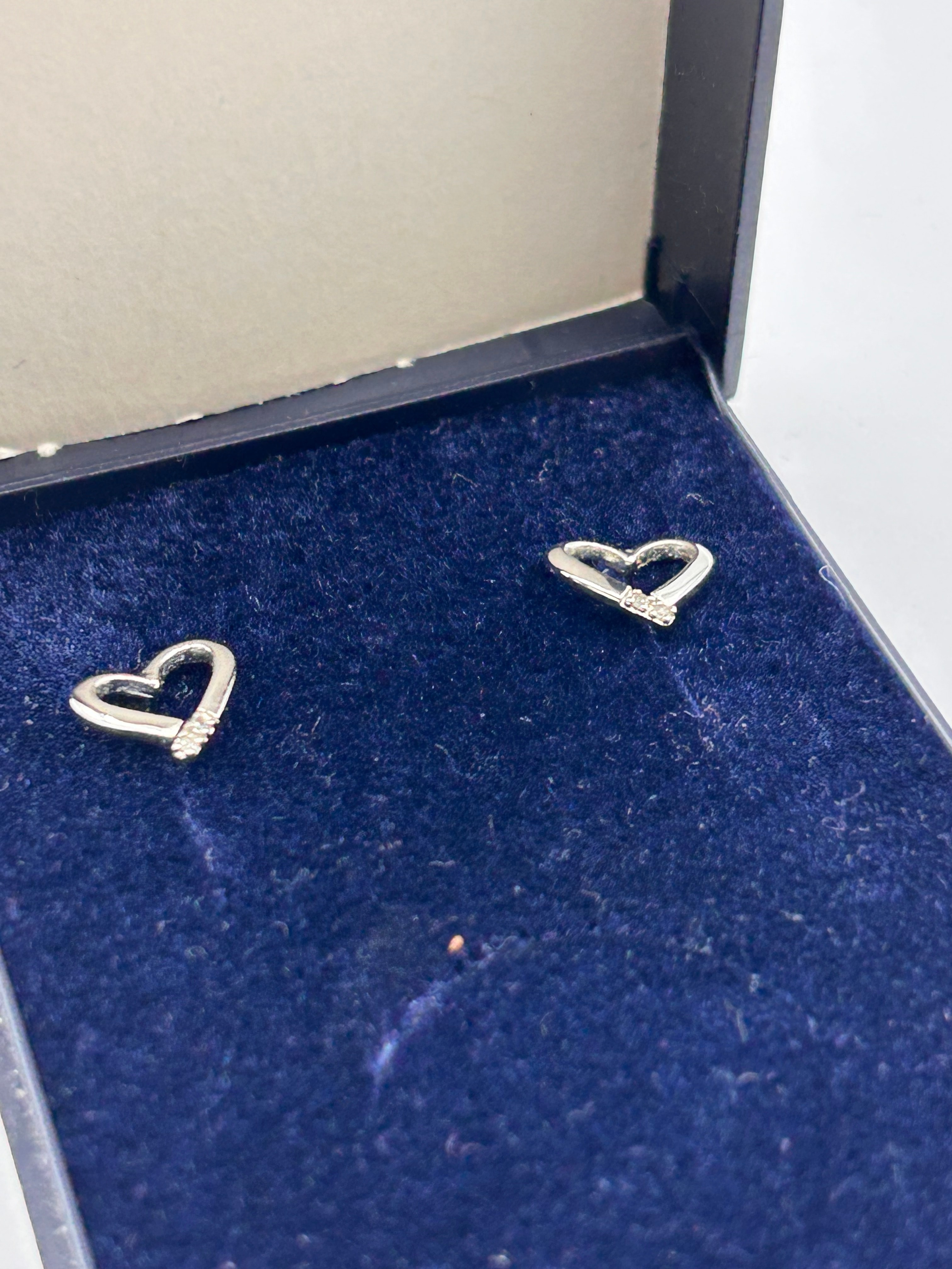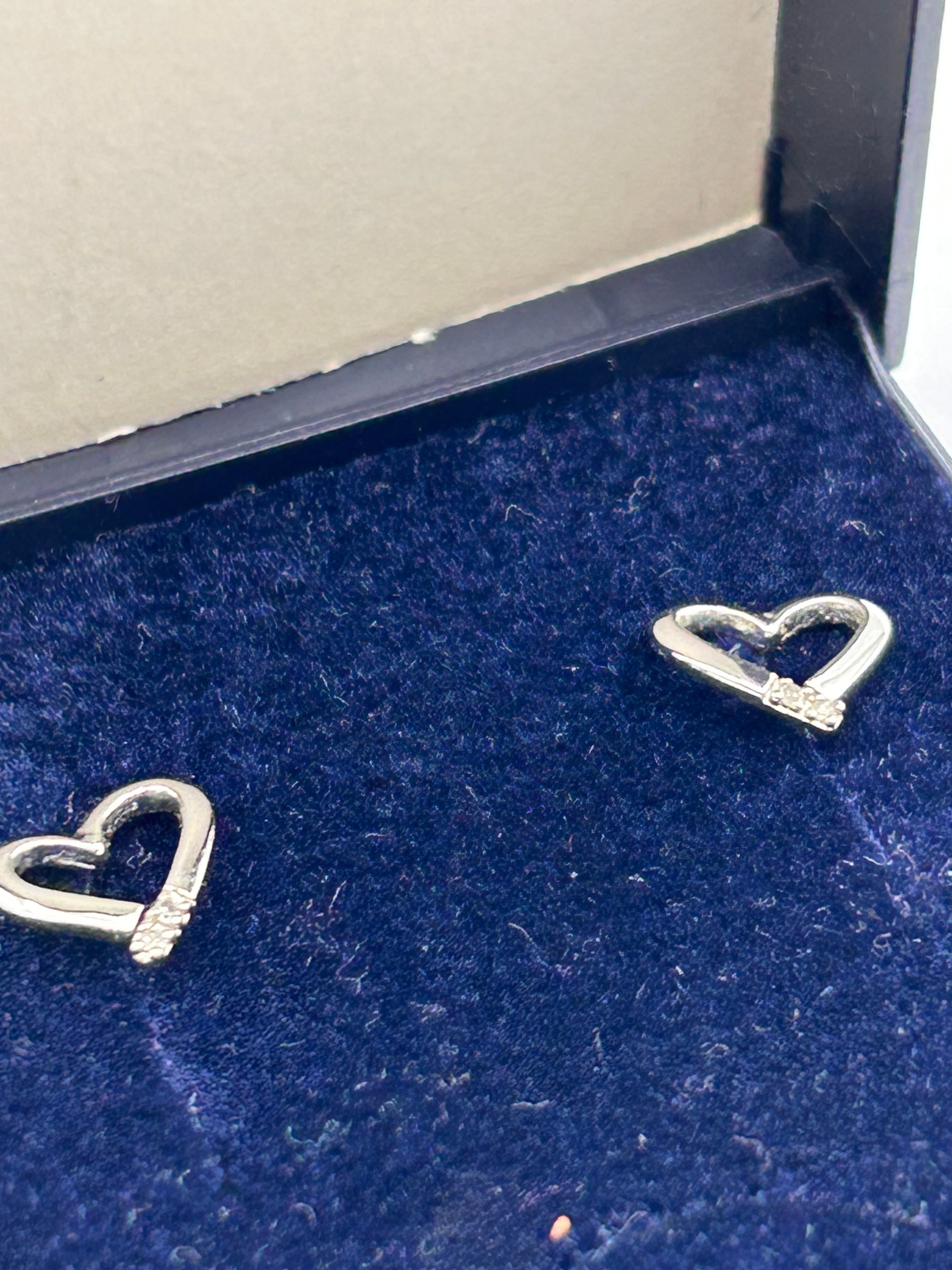 A pair of sterling silver diamond heart stud earrings. Each small, silver-toned heart features an open-outline design with a cluster of clear, faceted stones set into one side. The items are presented in a blue velvet-lined box.