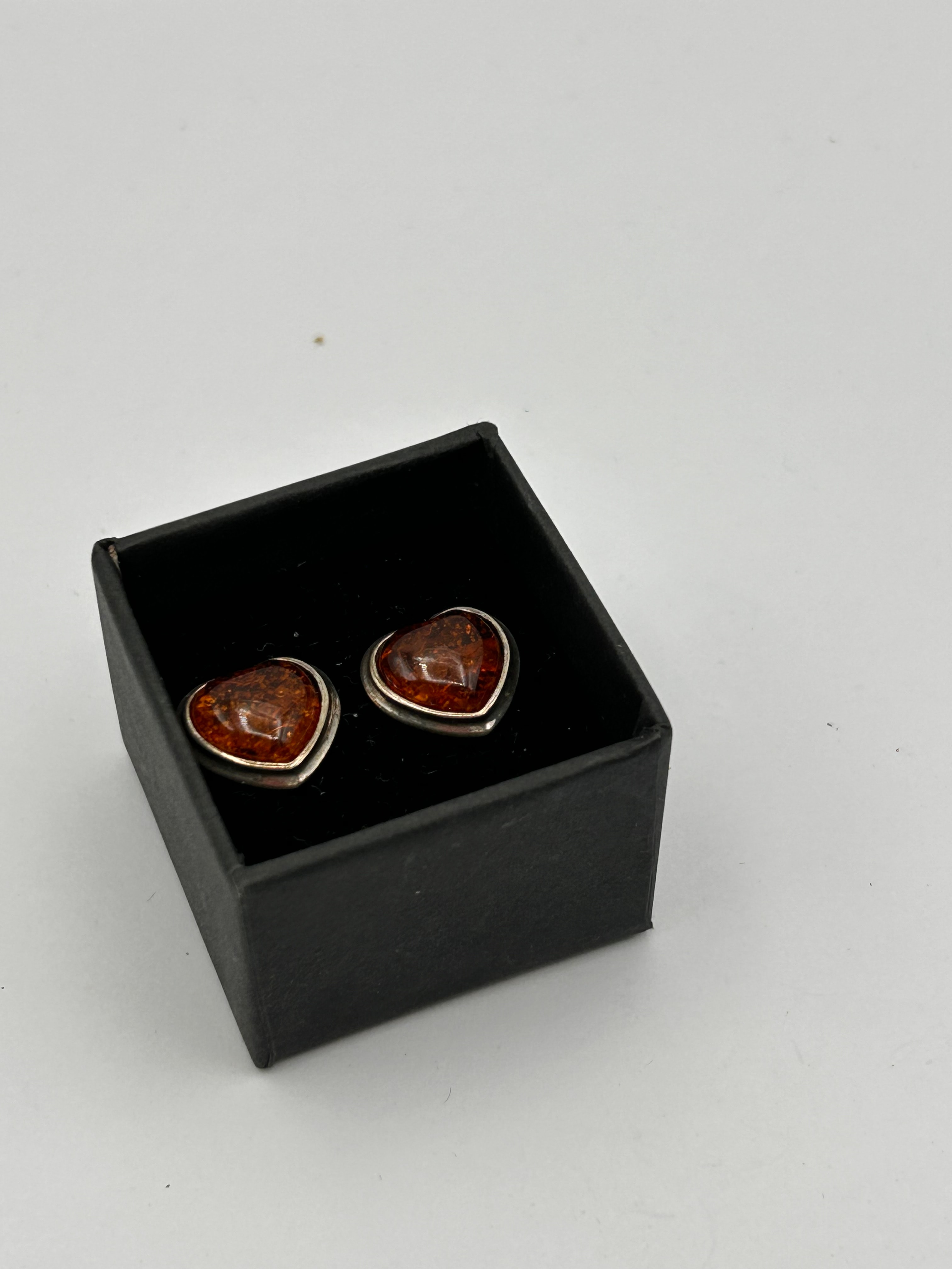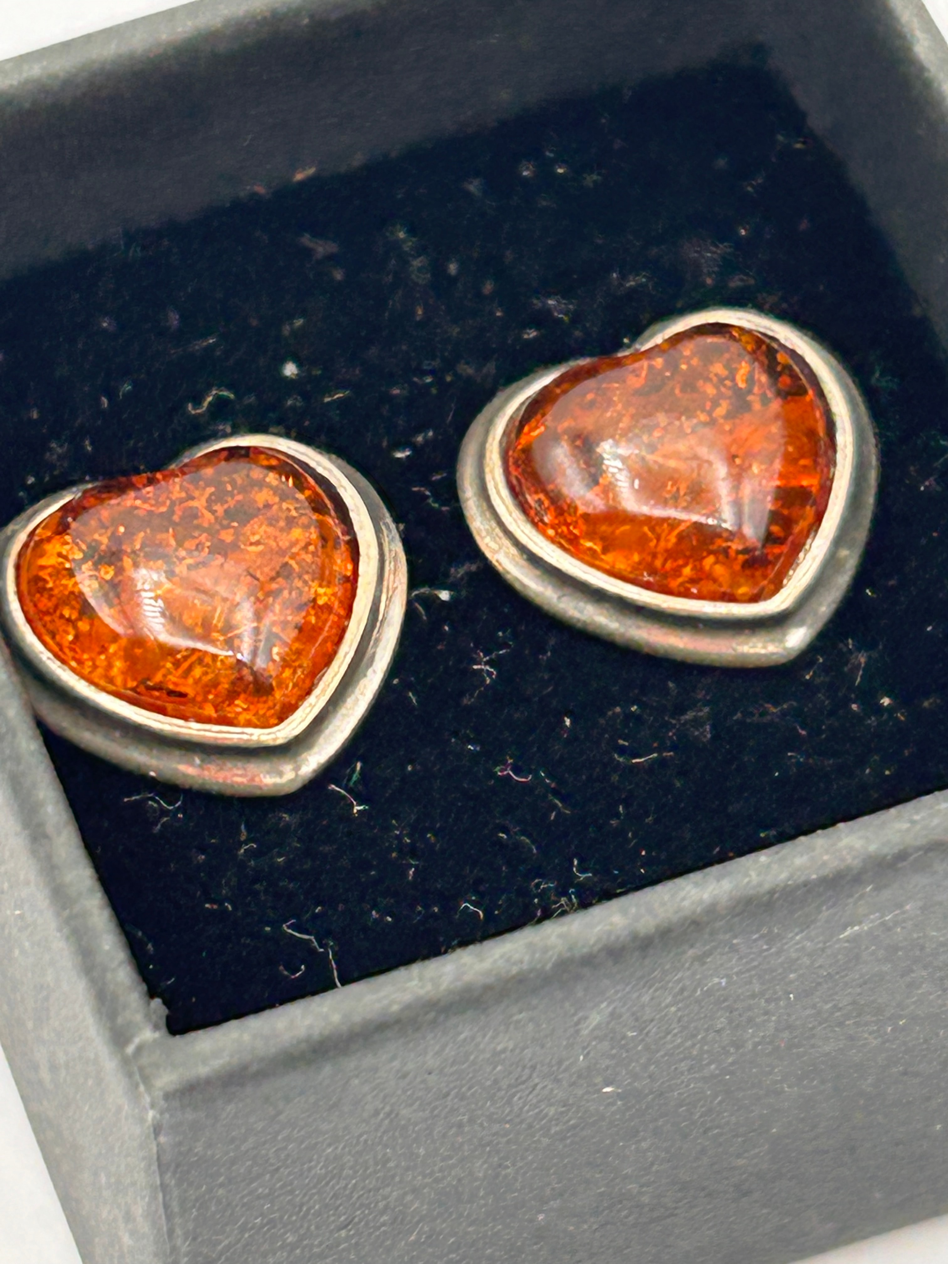 A pair of sterling silver and Baltic amber heart stud earrings. Each earring features a domed, cabochon-cut heart-shaped stone of translucent orangey-brown Baltic amber, displaying visible internal inclusions. The amber is set within a plain bezel of sterling silver.