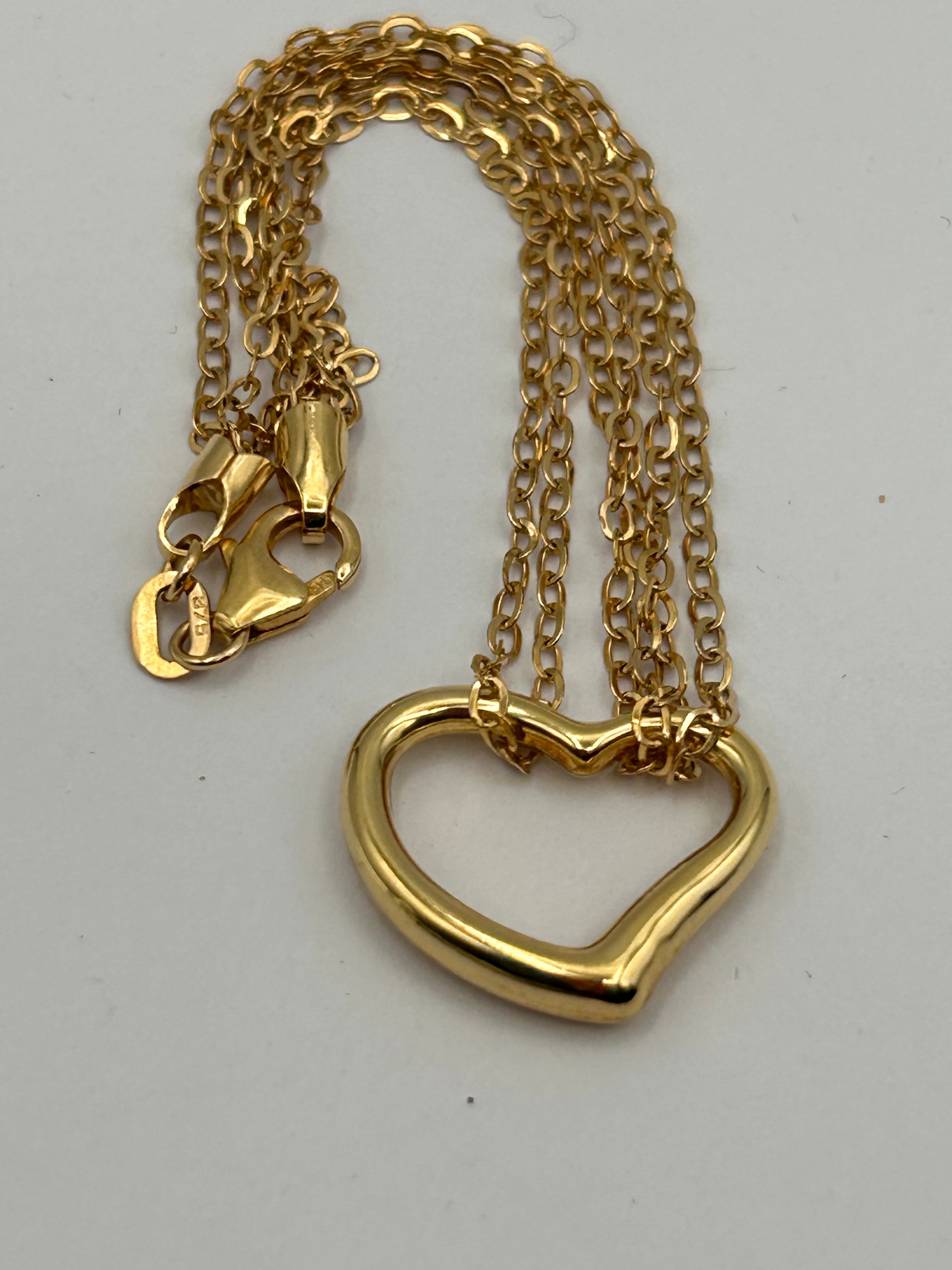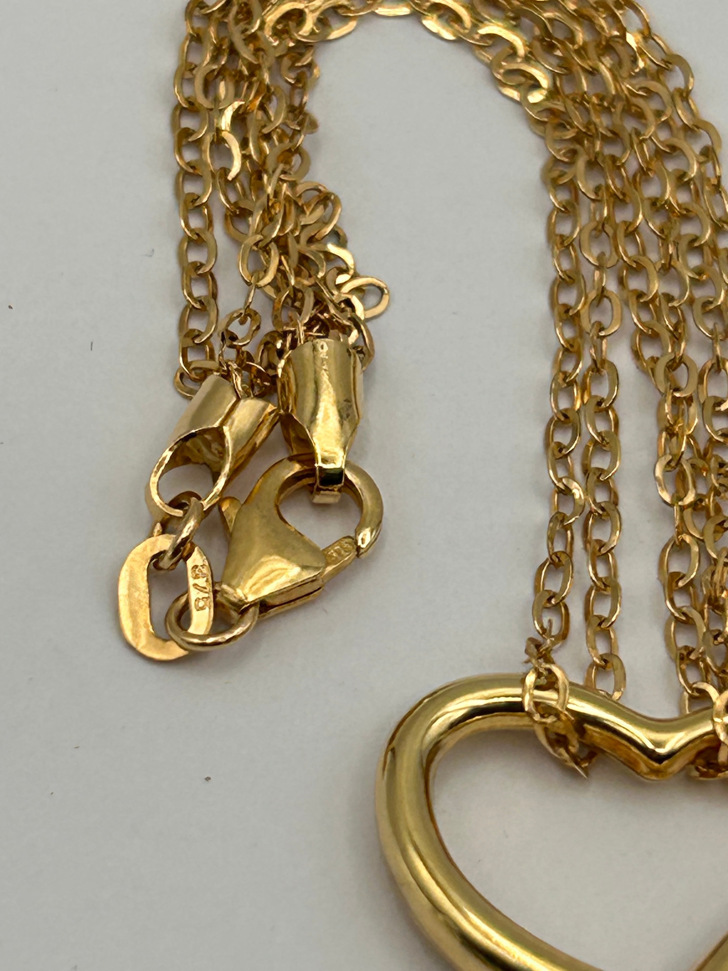 A 9ct yellow gold bracelet featuring a polished, open-heart pendant suspended from a fine link chain. The necklace presents in a classic, minimalist style.Weight: 1.7g