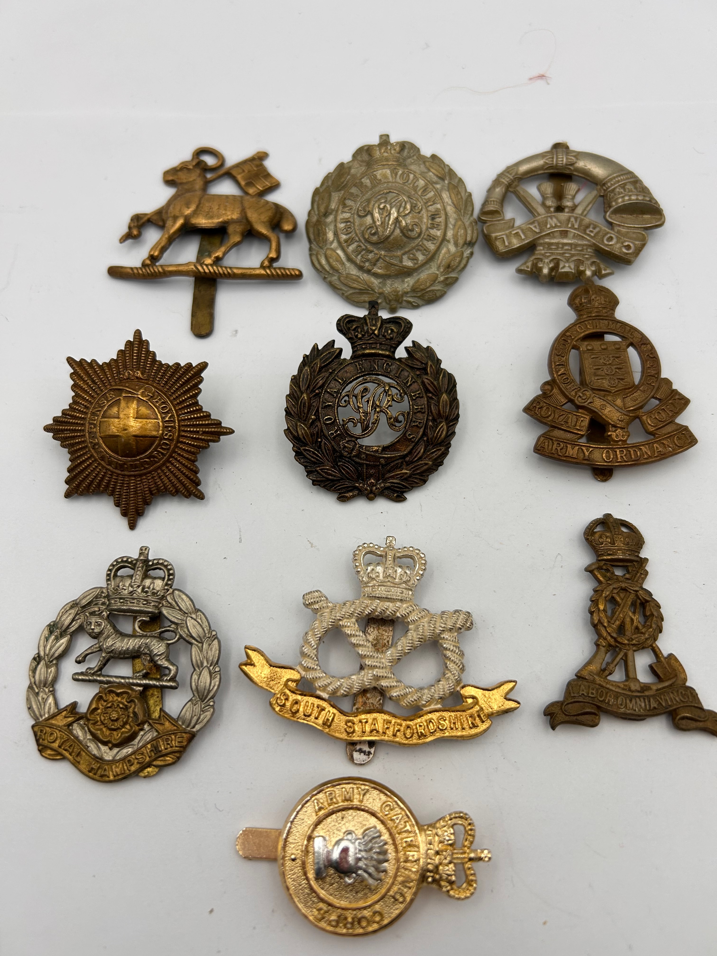A collection of ten British military cap badges or insignia, predominantly from the 20th century. These items display traditional heraldic designs and are crafted from various metals, including brass, bronze-toned alloys, silver-toned alloys, and some bi-metal constructions. Visible markings identify several specific units or corps, such as “ROYAL ENGINEERS” (with a “GR” monogram for George Rex), “ROYAL ARMY ORDNANCE CORPS”, “ROYAL HAMPSHIRE”, “SOUTH STAFFORDSHIRE”, “ARMY CATERING CORPS”, “CORNWALL”, and “VOLUNTEERS” (with an “ER” monogram for Edward Rex/Elizabeth Regina). Two badges also feature Latin mottos: “HONI SOIT QUI MAL Y PENSE” and “LABOR OMNIA VINCIT”.