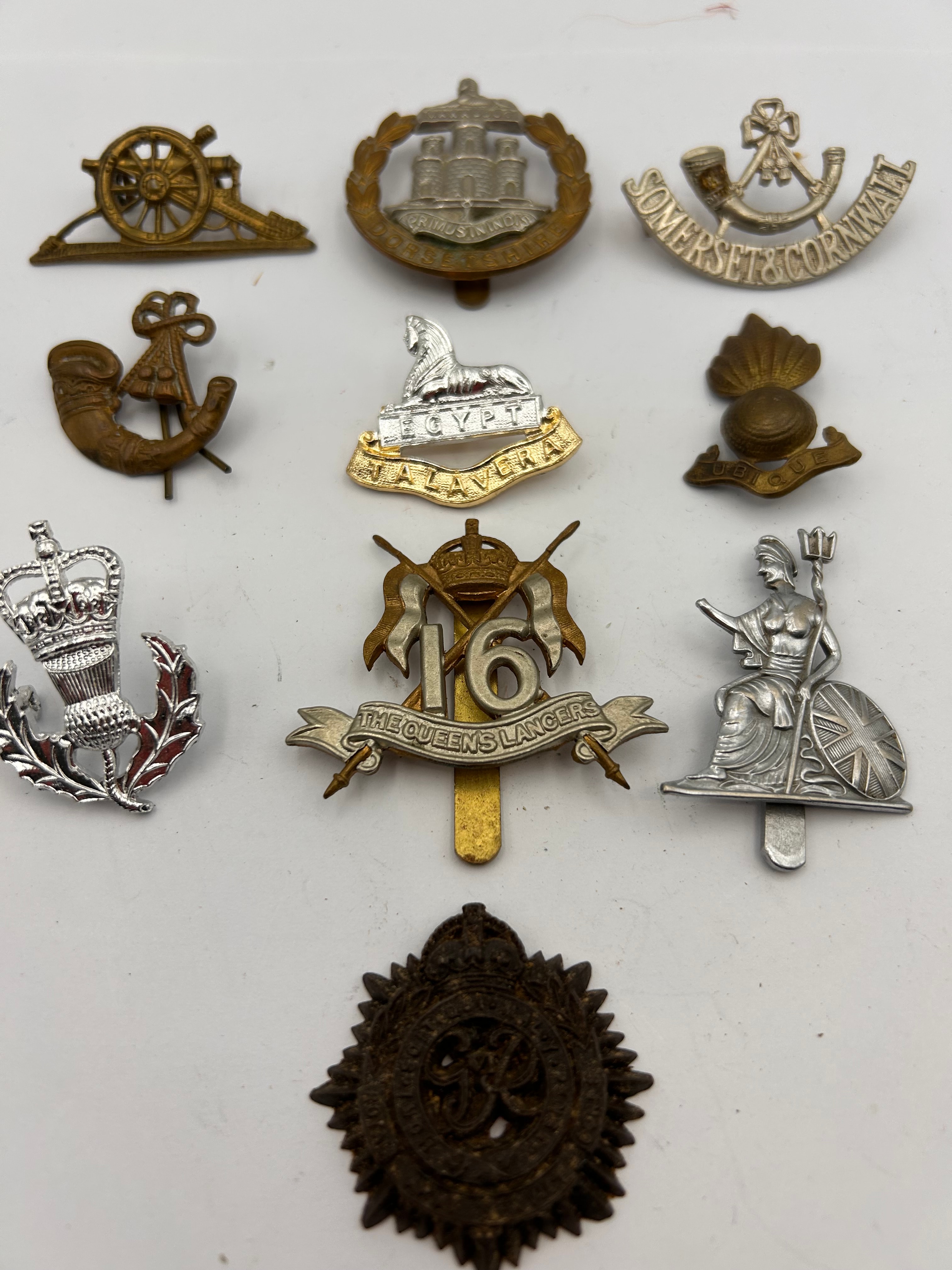 A collection of ten British military regimental badges, including a 16th The Queen’s Lancers cap badge. The badges are likely cap or collar badges, exhibiting various designs and bi-metallic constructions in brass, white metal, and silvered finishes. Motifs include a cannon, a castle with text “PRIMUS IN INDIS” (First in India) and “DORSETSHIRE,” hunting horns with “SOMERSET & CORNWALL,” a bugle, a sphinx over “EGYPT” and “MALAVERA,” a grenade with “UBIQUE” (Everywhere), a crowned thistle, a crown over “16” and “THE QUEEN’S LANCERS,” and a depiction of Britannia with a Union Jack shield. A central circular badge features a “GR” monogram, possibly for the Royal Sussex Regiment.