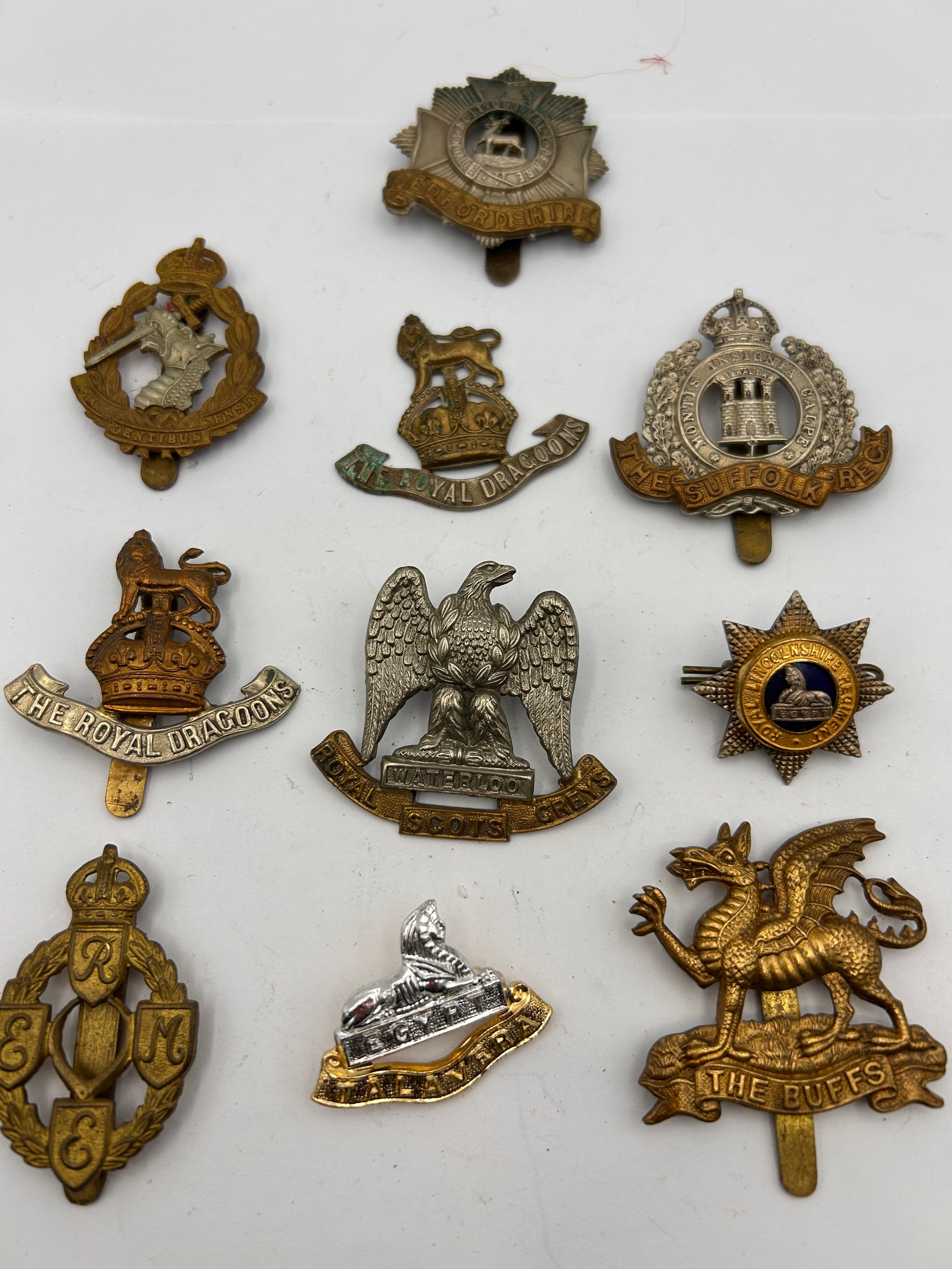 A collection of ten British military cap badges, dating from the early to mid-20th century. The badges are primarily of brass and white metal construction, with one example incorporating blue enamel. The collection includes insignia for various regiments, such as a ‘BEDFORDSHIRE’ badge featuring a stag and partial ‘HONI SOIT QUI MAL Y PENSE’ motto; ‘THE ROYAL DRAGOONS’ with a crowned lion; ‘THE SUFFOLK REGt’ displaying a castle with ‘INSIGNIA MONTIS CALPE’ and ‘GIBRALTAR’; a ‘ROYAL GREYS’ and ‘SCOTS’ badge with ‘WATERLOO’ surrounding an eagle, identified through web intelligence as a Royal Scots Greys WW1 Waterloo cap badge; a ‘ROYAL LINCOLNSHIRE REGIMENT’ badge with a sphinx and ‘EGYPT’ and blue enamel; a crowned dragon badge for ‘THE BUFFS’; a griffin-like crest with a partial ‘DENTIBUS’ motto; a sphinx badge with ‘EGYPT’ and ‘TALAVERA’; and a crowned badge featuring the initials ‘R M E E’ within wreaths.