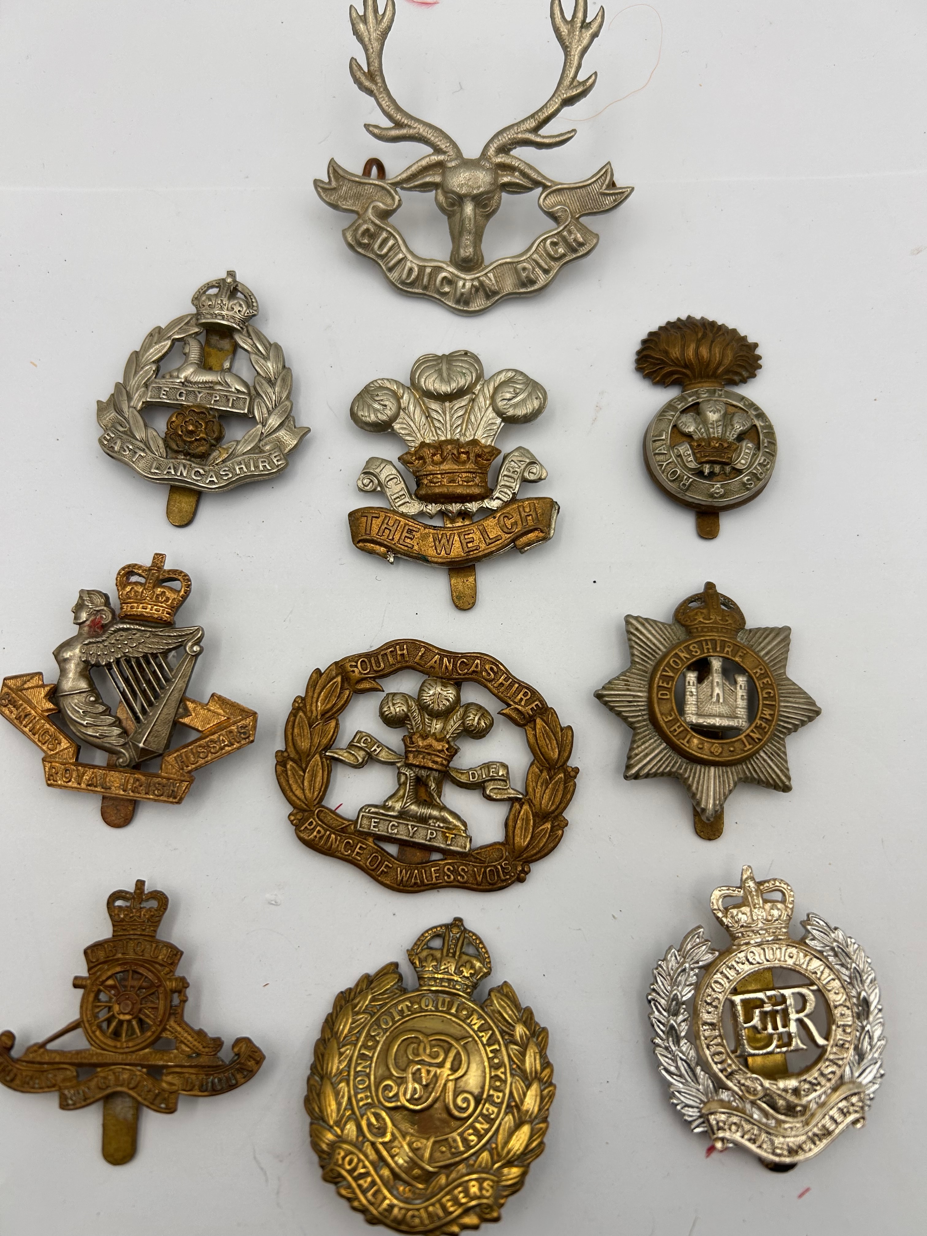 A collection of ten distinct British military cap badges, predominantly crafted from bi-metal alloys of brass/bronze and white metal. The group includes a “South Lancashire Regiment Prince of Wales Volunteers” badge, featuring the Prince of Wales’s feathers and “ICH DIEN” motto, which is consistent with market consensus. Further examples include an “EAST LANCASHIRE” Regiment badge with an “EGYPT” honour, “THE WELCH” badge also incorporating the Prince of Wales’s feathers and “ICH DIEN” motto, and an “8 KINGS ROYAL IRISH HUSSARS” badge depicting a harp. Also present are a stag’s head badge inscribed “CUIDICH’N RIGH” (Aid the King), “THE DEVONSHIRE REGIMENT” with a castle, and a cannon motif with the Latin mottos “UBIQUE” (Everywhere) and “QUO FAS ET GLORIA DUCUNT” (Where right and glory lead). Two “ROYAL ENGINEERS” badges are included, distinguished by “GR” (George Rex) and “ER” (Elizabeth Regina) monograms, both encircled by “HONI SOIT QUI MAL Y PENSE” (Shame on him who thinks evil of it).
