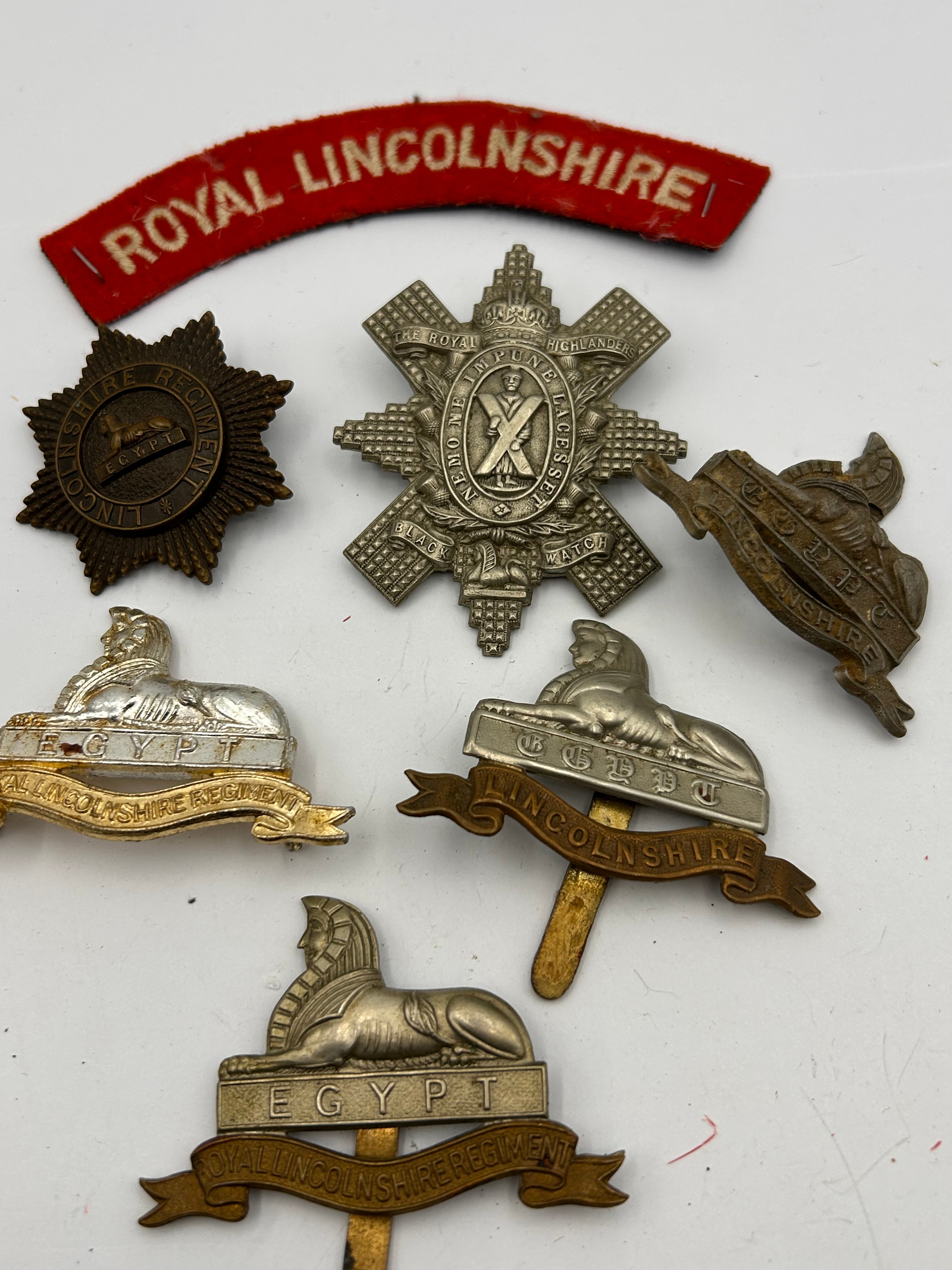 This lot comprises seven items of historical military regimental insignia: a red fabric shoulder title and six assorted metal badges. The fabric patch features “ROYAL LINCOLNSHIRE” embroidered in cream. The metal badges are predominantly made from brass, bronze, and silver-toned metal, with several being bi-metallic. Designs include a dark bronze starburst badge with a central sphinx marked “LINCOLNSHIRE REGIMENT” and “EGYPT”, and a larger silver-toned starburst badge featuring a central figure on an “X” surrounded by an oval with the Latin motto “NEMO ME IMPUNE LACESSIT” (No one provokes me with impunity), and banners reading “THE ROYAL HIGHLANDERS” and “BLACK WATCH”. The remaining five badges are cap badges, all featuring a sphinx design. Three are bi-metallic with a silver-toned sphinx and a gold-toned scroll, marked “EGYPT” on the plinth and either “ROYAL LINCOLNSHIRE REGIMENT” or “LINCOLNSHIRE” on the scroll. Two mono-metallic bronze-toned sphinx badges are also present, with one clearly displaying “LINCOLNSHIRE” on its scroll.